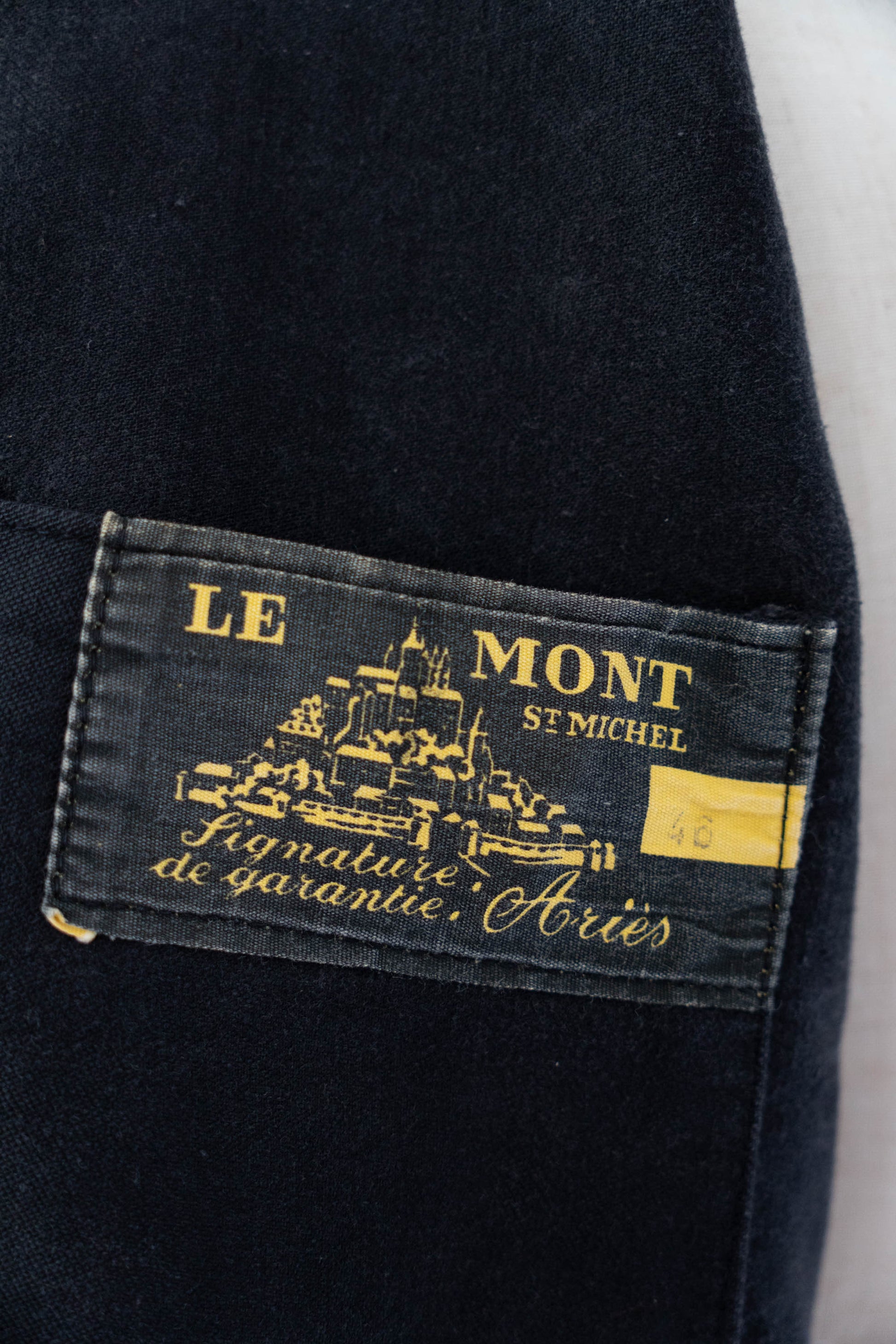 - Le Mont St Michel, die wohl führende Marke für Vintage-Arbeitskleidung in Frankreich, blickt auf eine lange Geschichte zurück, die bis zu ihrer Gründung im Jahr 1913 in Pont-l'Évêque in der Nähe der Abtei Mont Saint-Michel in der Normandie reicht. Das Unternehmen begann als kleine Familienwerkstatt, die Arbeitskleidung herstellte, und erfreute sich in den 1920er und 1930er Jahren großer Beliebtheit bei lokalen Handwerkern und Bauern. Um sein Geschäft auszuweiten, betrieb es aktiv Werbekampagnen und entwickelte sich zu einer repräsentativen Marke für Westfrankreich. Die Arbeitskleidung von Le Mont Saint Michel, bei der Haltbarkeit und Funktionalität im Vordergrund standen, setzte eigene Qualitätsstandards. Je nach Verwendungszweck – für landwirtschaftliche Arbeiten, Bergbau, Jagd oder Schulkinderbekleidung – unterschied es streng zwischen der Verwendung von Taschen, Nähten und Nieten. Dank ihres soliden Rufs sind Artikel von Le Mont Saint Michel auf dem Vintage-Markt nach wie vor sehr begehrt. Ursprünglich als französische Arbeitskleidung weit verbreitet, zeichnet sich Moleskin – benannt nach dem englischen Wort „mole“ (Maulwurf) – durch eine glatte, pelzartige Textur und einen Glanz aus, der durch das Aufrichten der Florfasern auf beiden Seiten erzielt wird. In den 1920er und 1930er Jahren war er zu einem festen Bestandteil der lokalen Handwerker und Bauern geworden, wurde wegen seiner Haltbarkeit und Funktionalität hoch geschätzt und entwickelte sich zu einer repräsentativen Arbeitsbekleidungsmarke im Westen Frankreichs.