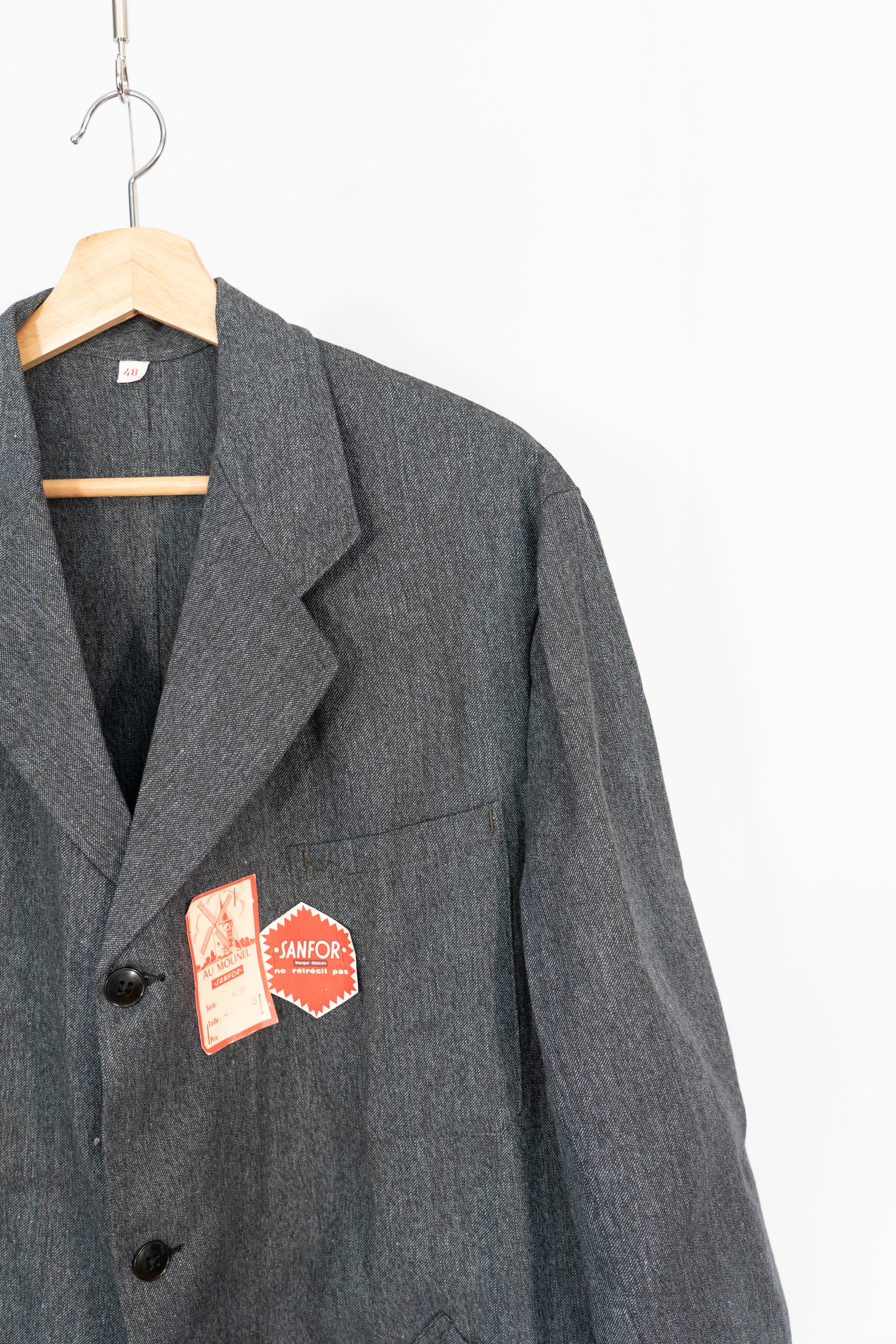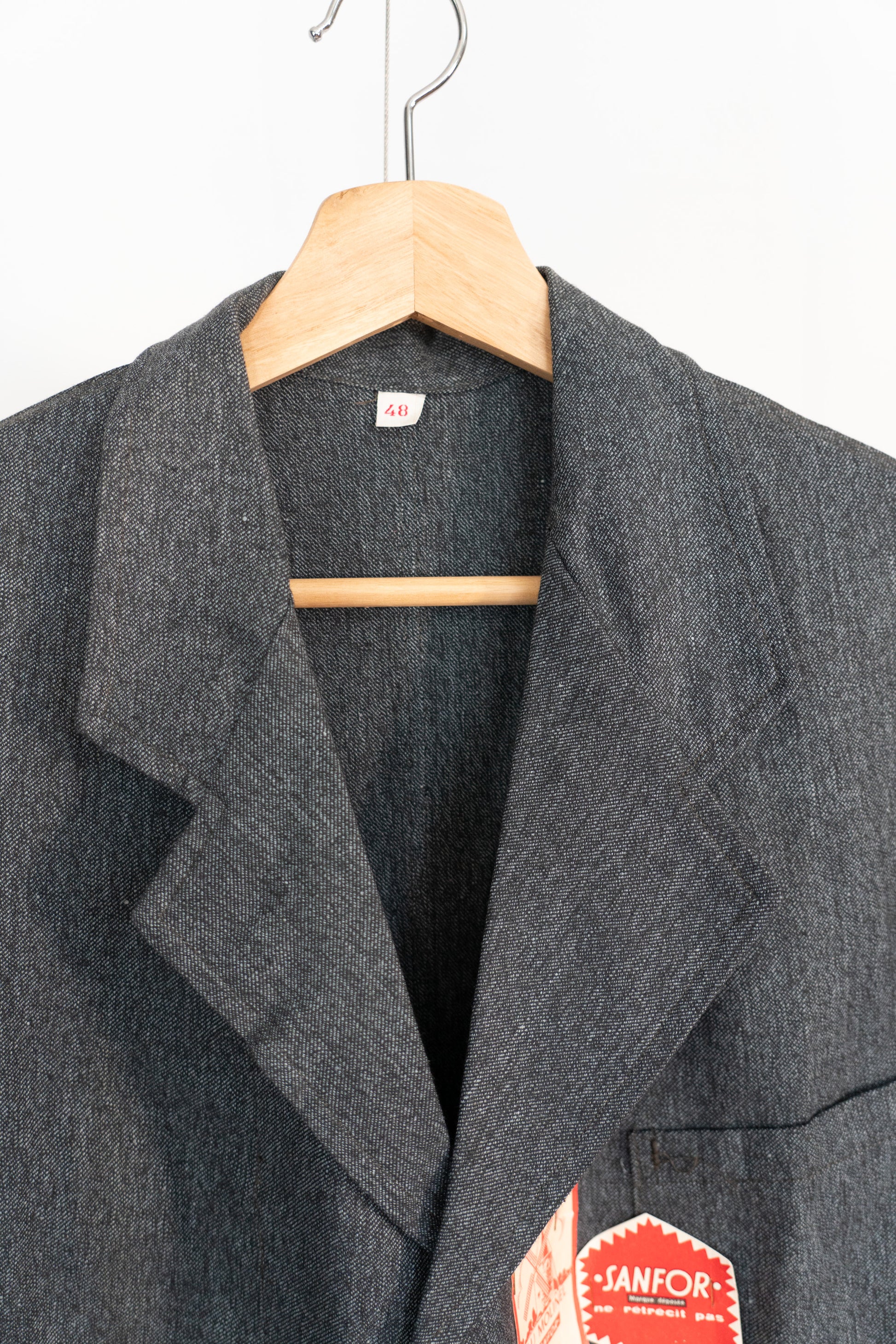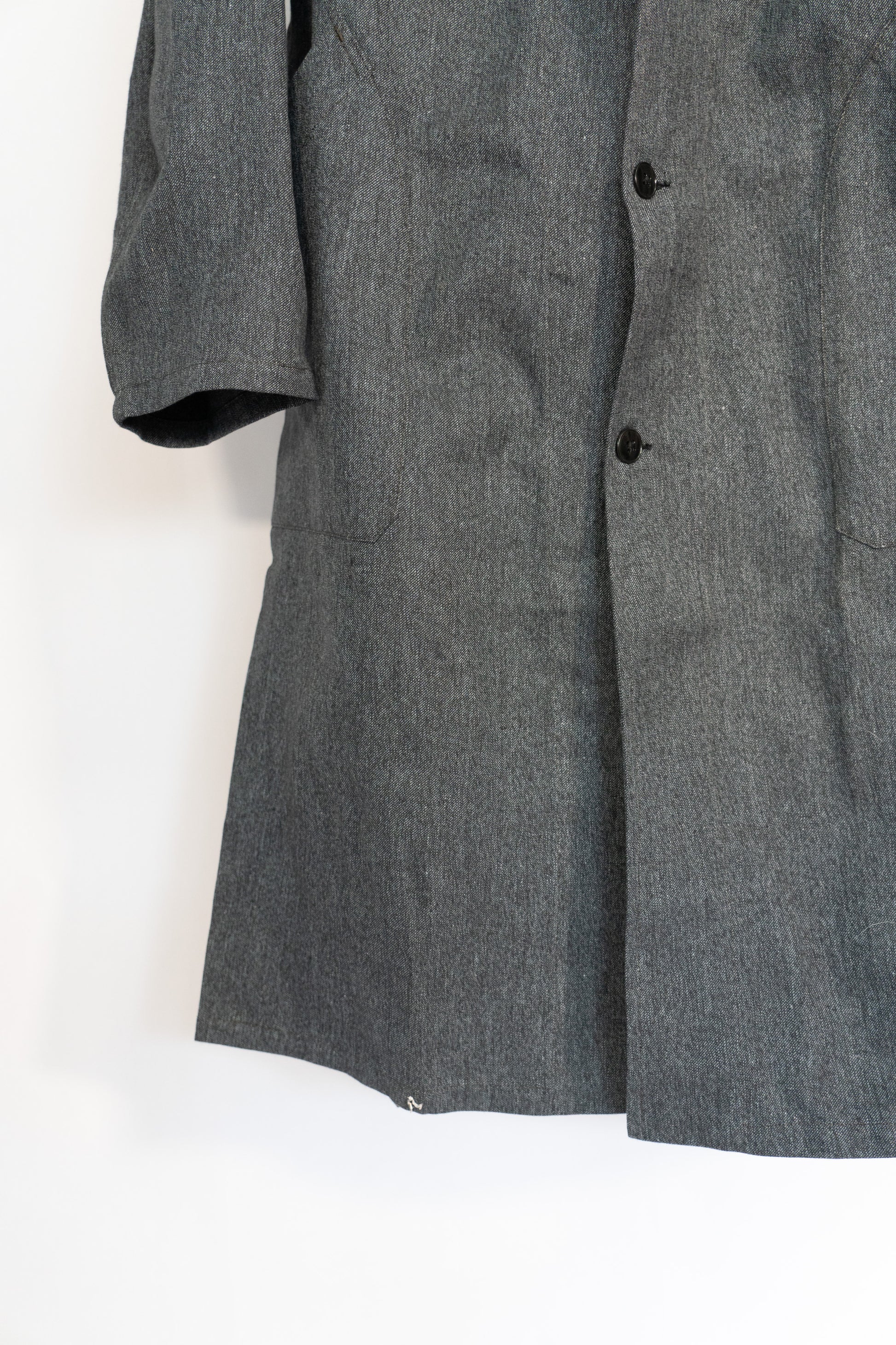 Obwohl es sich um Arbeitskleidung handelt, ist seine Konstruktion alles andere als einfach. Das Vorderteil ist großzügig geschnitten, um den Körper zu umhüllen, und die Ärmel bestehen aus zwei separaten Teilen. Im Vergleich zu moderner Arbeitskleidung ist die Anzahl der Produktionsschritte deutlich höher. Dadurch entsteht eine dreidimensionale Struktur, die beim Tragen eine bemerkenswert elegante und schmeichelhafte Silhouette ergibt. Im Gegensatz zu amerikanischer Arbeitskleidung, bei der die Massenproduktion im Vordergrund steht, wurde bei diesem Mantel der Schwerpunkt auf Ästhetik gelegt. Es ist ein Kleidungsstück, das durch und durch von französischer Sensibilität geprägt ist.