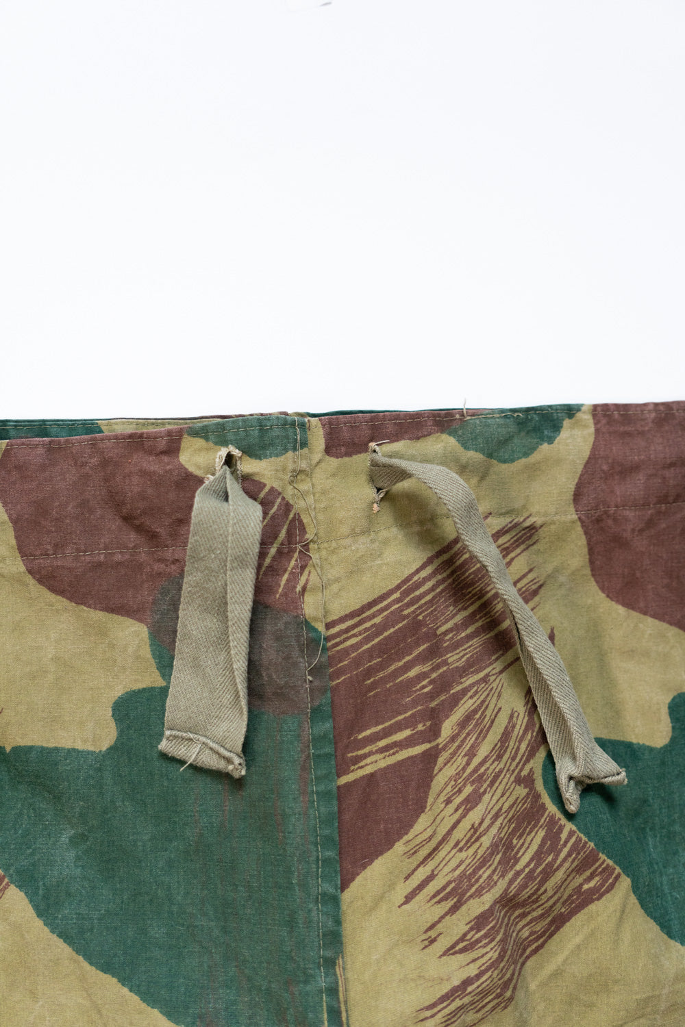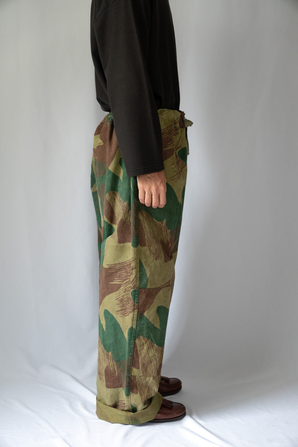 Dies sind belgische Armee-Überhosen mit Pinselstrich-Tarnmuster, hergestellt im Jahr 1955.