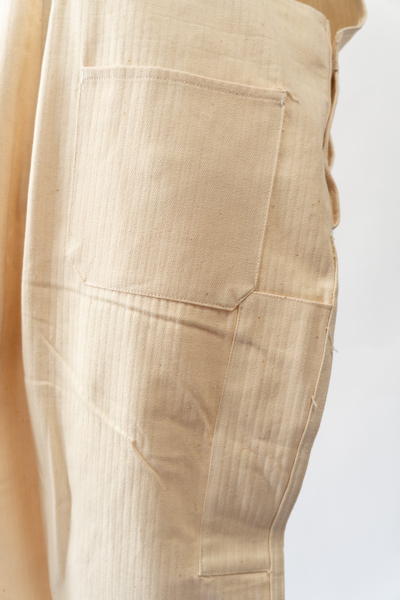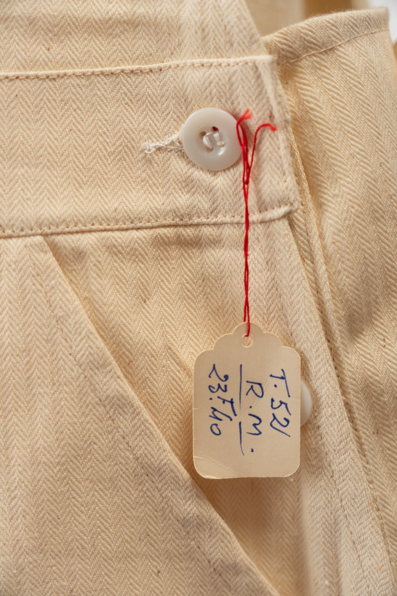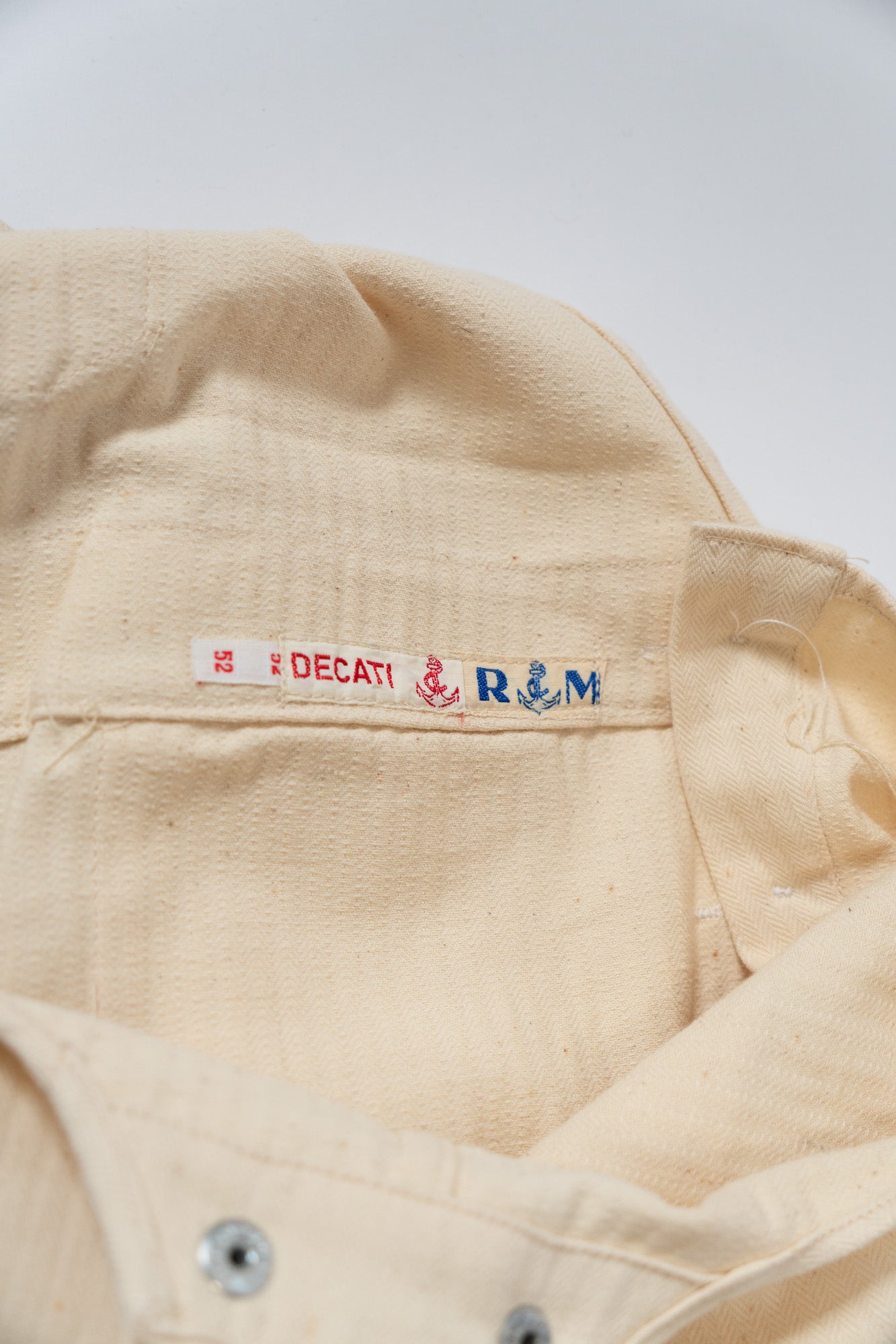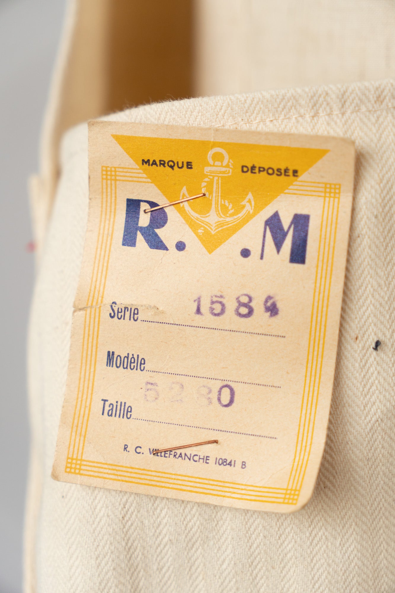Dies sind naturfarbene Latzhosen, die Mitte der 1950er Jahre von der französischen Marine (Marine Nationale) für Arbeiten an Bord von Schiffen ausgegeben wurden. Mit einem Papieretikett mit dem Ankerzeichen „R.M” und einem Stoffetikett „DECATI” versehen, handelt es sich bei diesem seltenen, unbenutzten Artikel um ein Deadstock-Stück mit originalen Blinkern.