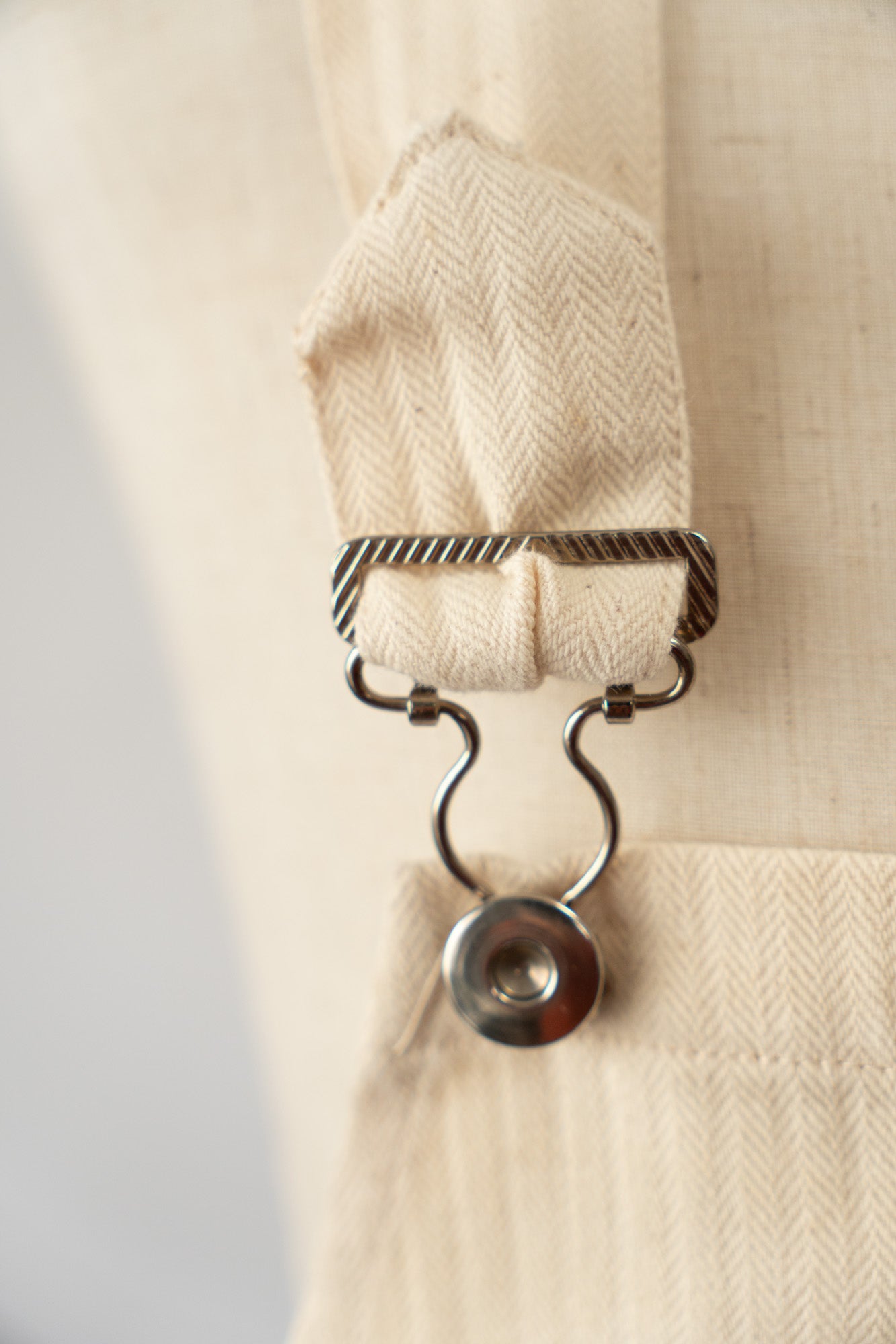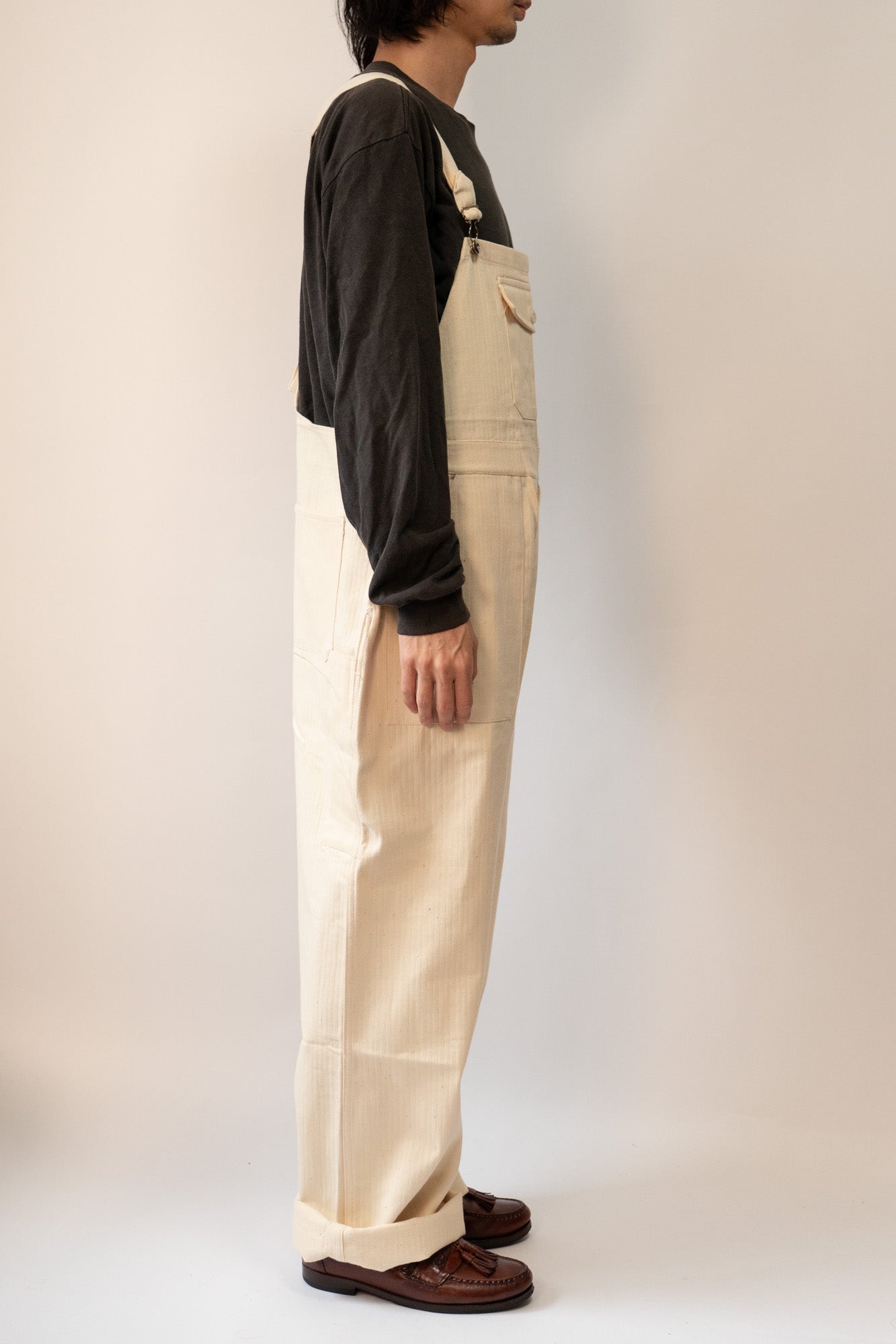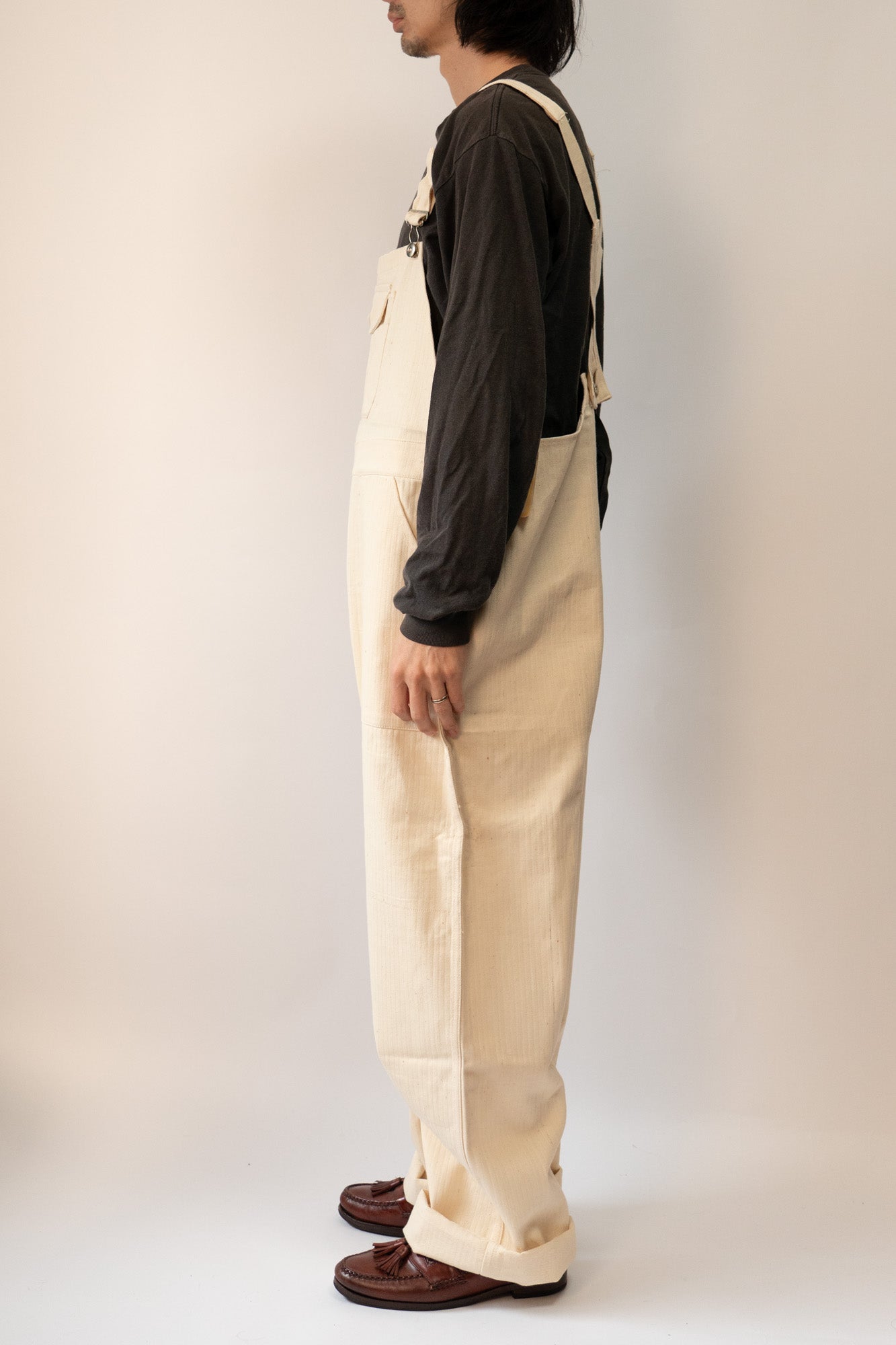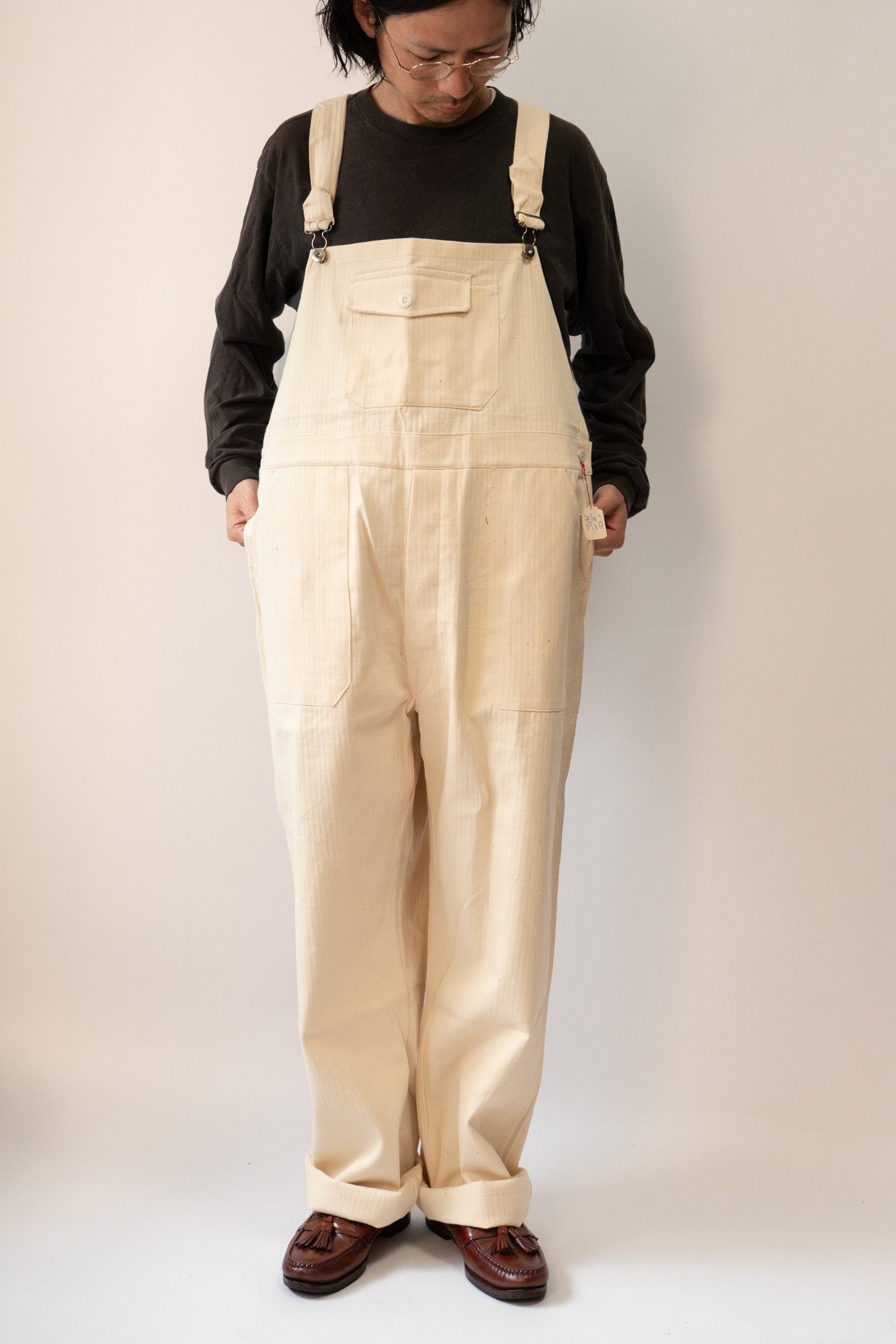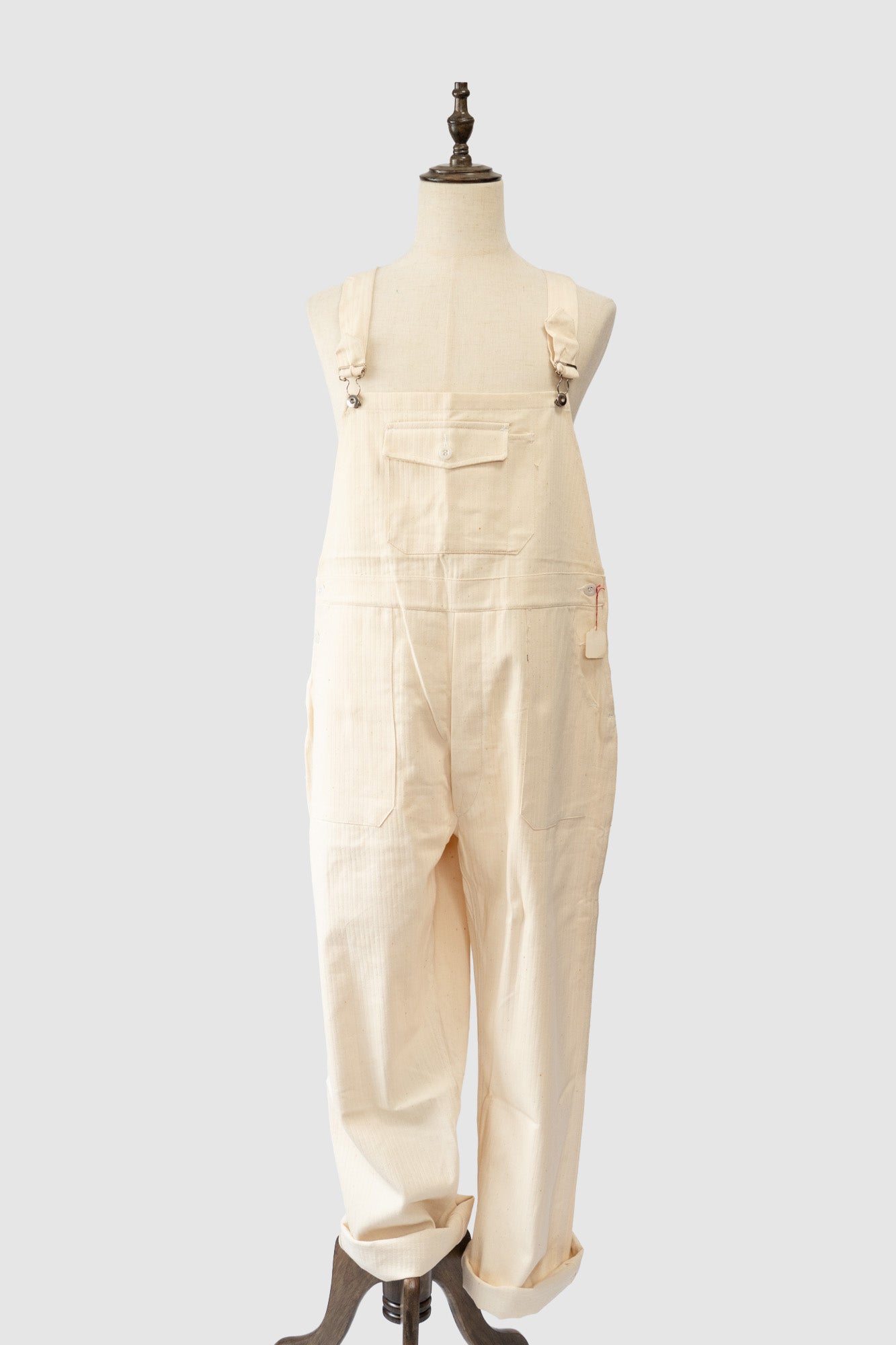 Dies sind naturfarbene Latzhosen, die Mitte der 1950er Jahre von der französischen Marine (Marine Nationale) für Arbeiten an Bord von Schiffen ausgegeben wurden. Mit einem Papieretikett mit dem Ankerzeichen „R.M” und einem Stoffetikett „DECATI” versehen, handelt es sich bei diesem seltenen, unbenutzten Artikel um ein Deadstock-Stück mit originalen Blinkern.