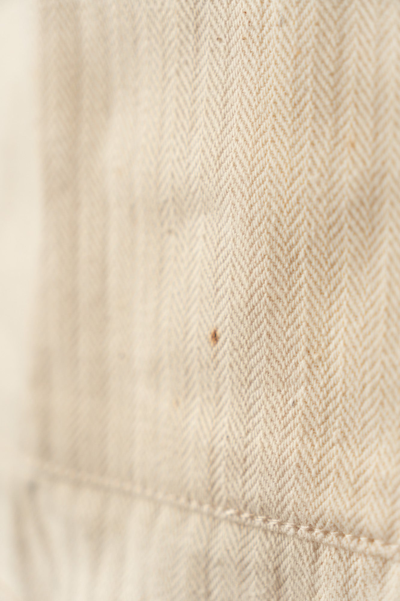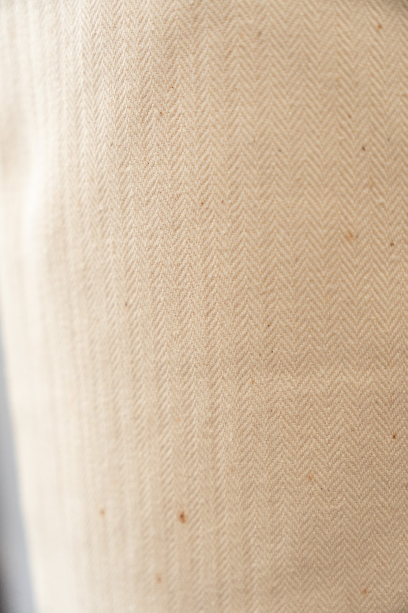Der Stoff ist ein aufgerauter Fischgrät-Twill. Er bietet die Weichheit von Baumwolle und ist gleichzeitig strapazierfähiger als herkömmliche Twill-Gewebe. Sein Reiz liegt in der Kombination aus rustikaler Textur und elegantem Fischgrätmuster. Als Workwear-Stoff ist er nicht übermäßig schwer und somit ein vielseitiges Material, das für alle Jahreszeiten geeignet ist.