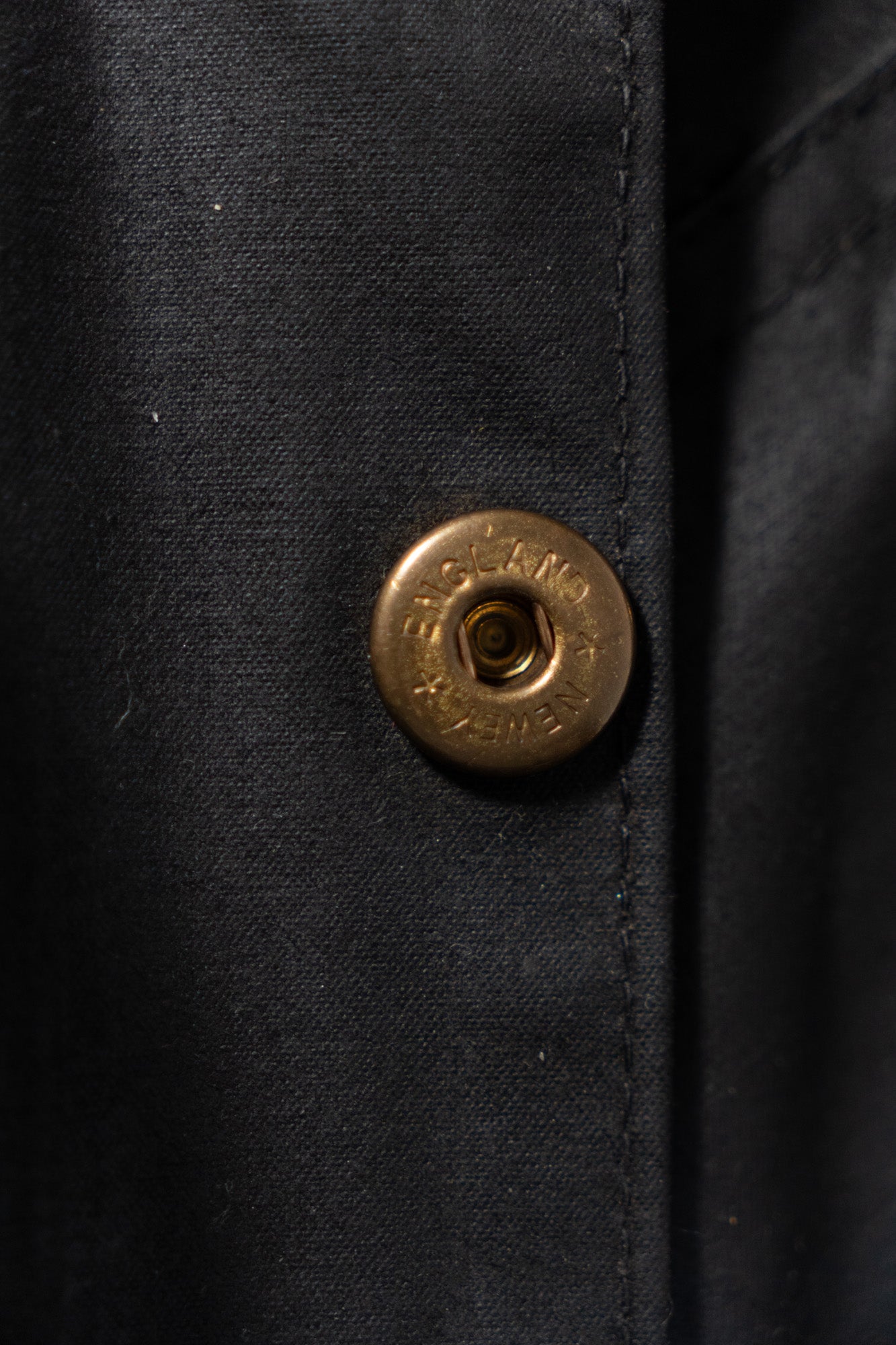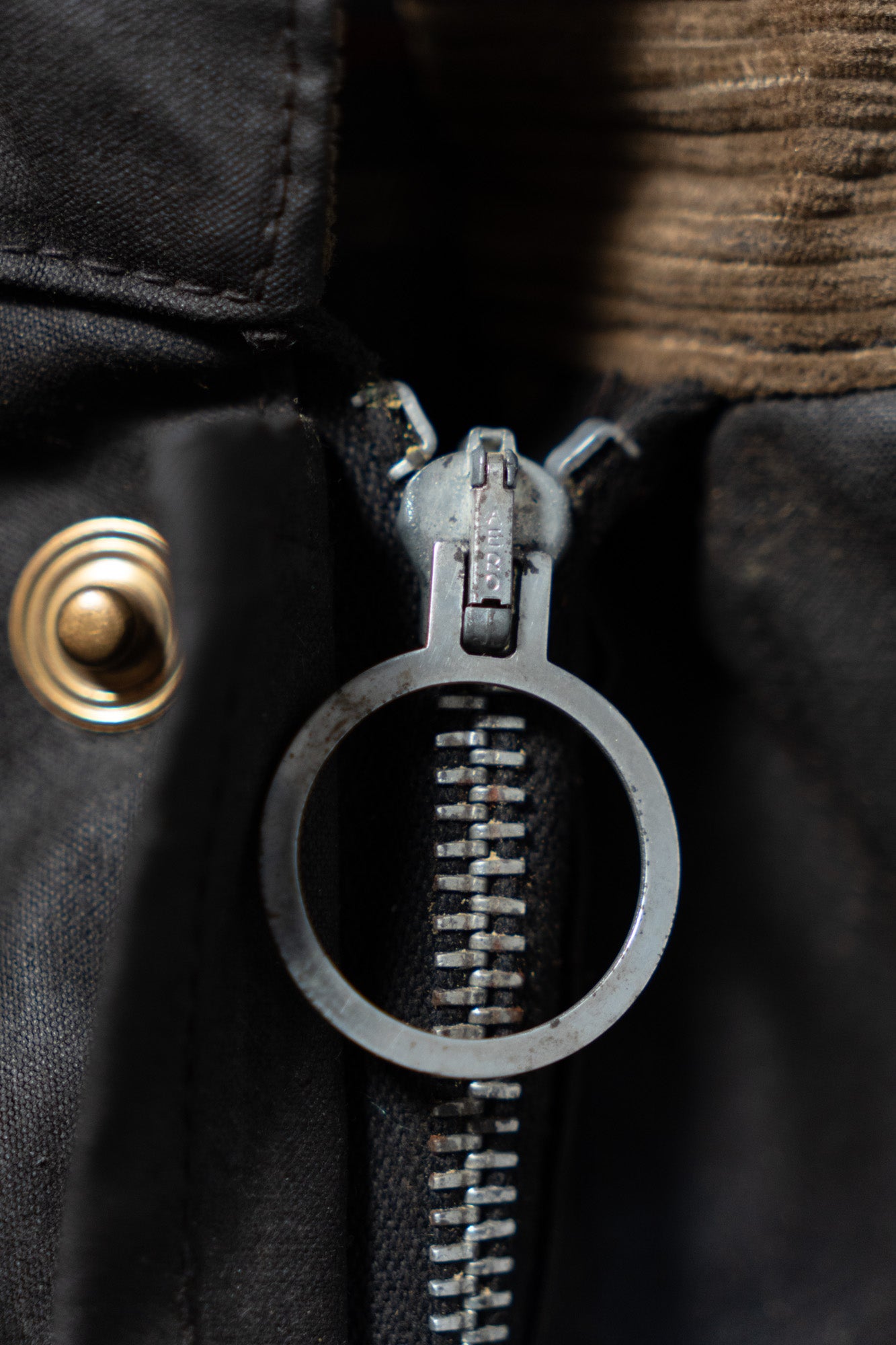 Der Stoff ist gewachste Baumwolle. Diese für diese Zeit charakteristische lederähnliche Textur bietet die einzigartige Materialqualität von Vintage-Barbour und besitzt eine Tiefe, die bei aktuellen Modellen nicht zu erreichen ist. Häufige Probleme bei Vintage-Barbour, wie Risse oder Beschädigungen am Kragen oder Futter, sind hier nicht vorhanden. In Anbetracht seines Alters ist es in einem außergewöhnlich guten, neuwertigen Zustand. Der oft fehlende Gürtel ist vorhanden, nur die Taillenschlaufe an der Seite des Körpers fehlt. Der Reißverschluss ist ein AERO-Reißverschluss, der nur bei älteren Modellen verwendet wurde. Es fehlen keine Zähne am Reißverschluss. Die Knöpfe sind unmarkierte Newey-Knöpfe, die für Barbour aus dieser Zeit charakteristisch sind. Der Gummizug in der Hose ist intakt und nicht ausgeleiert.