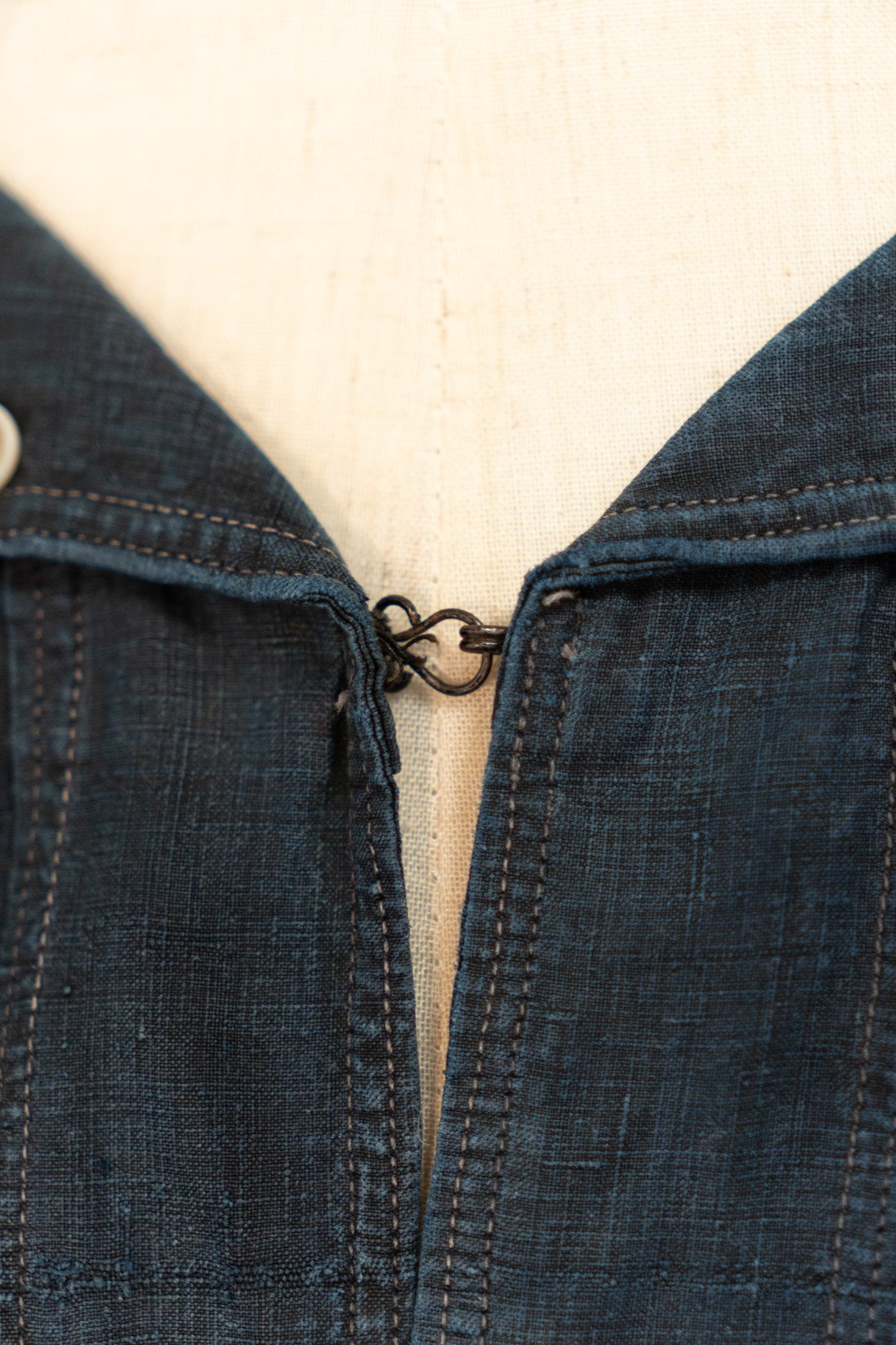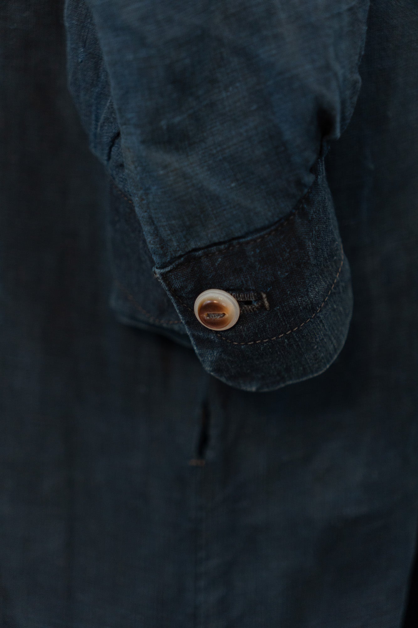 Alle originalen Perlmuttknöpfe sind noch intakt. Obwohl es sich um Arbeitskleidung handelt, besitzt sie eine bemerkenswerte Raffinesse, und allein die Präsenz dieses Kleidungsstücks vermittelt einen bedeutenden Wert.