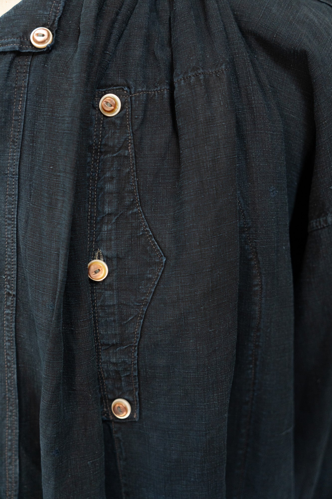 Der Biyod-Kittel wurde im 19. und frühen 20. Jahrhundert von Schneidern oder Familien im ländlichen Frankreich handgefertigt. Da jedes Kleidungsstück individuell auf die Körperform und den Verwendungszweck des Trägers zugeschnitten war und nicht in Massenproduktion hergestellt wurde, liegt der Charme des Biyod in seinen einzigartigen Details – die Platzierung der Falten, die Positionierung der Taschen und die Spezifikationen der Knöpfe variieren von Stück zu Stück. Damals war indigoblaues Leinen extrem teuer, daher wurden die Kleidungsstücke während ihrer langen Lebensdauer geflickt und individuell angepasst. Viele erhaltene Exemplare tragen Spuren dieser Geschichte. Mit seinem Charme als Unikat ist es wahrhaftig der König der französischen Vintage-Mode.