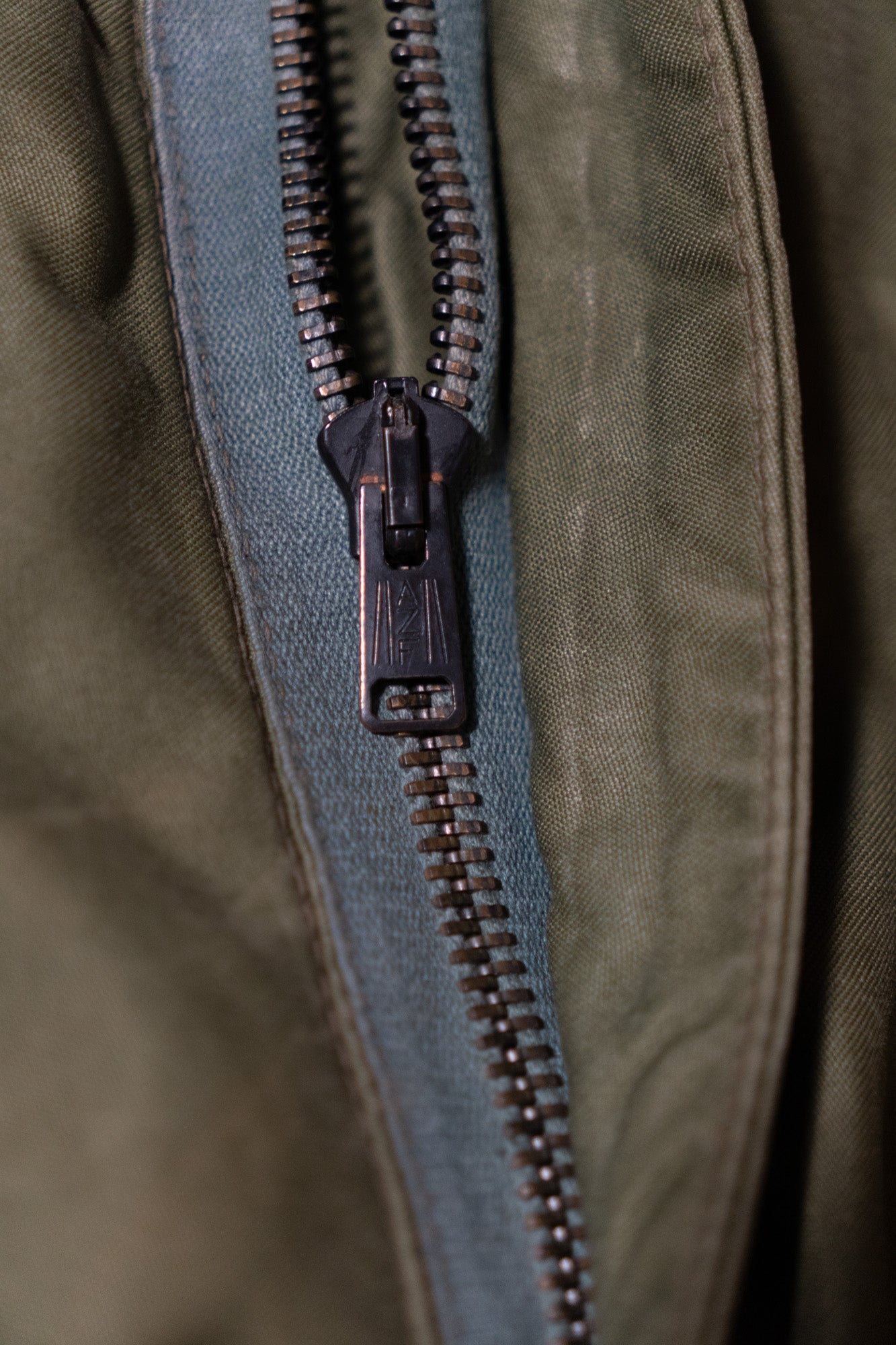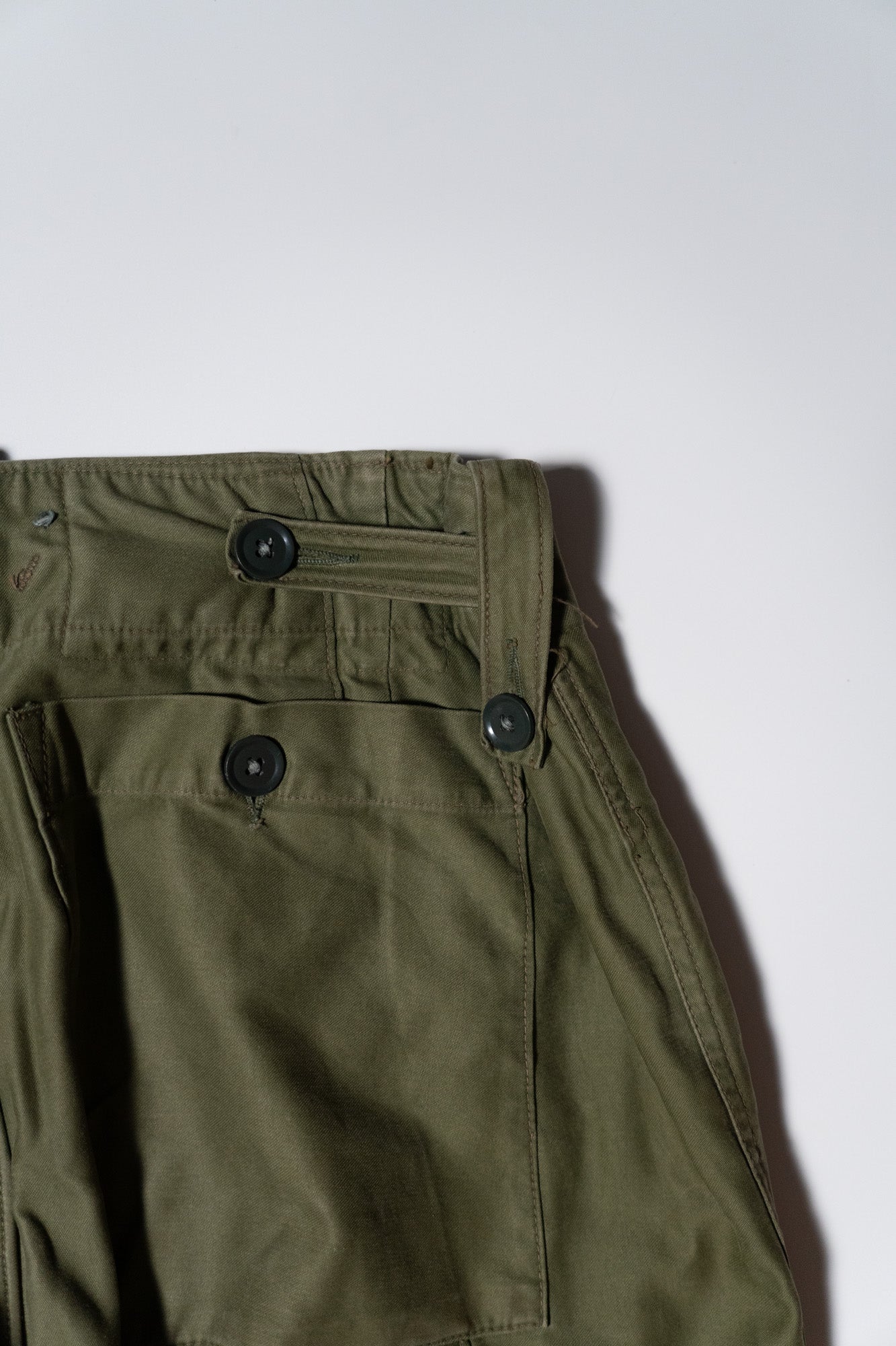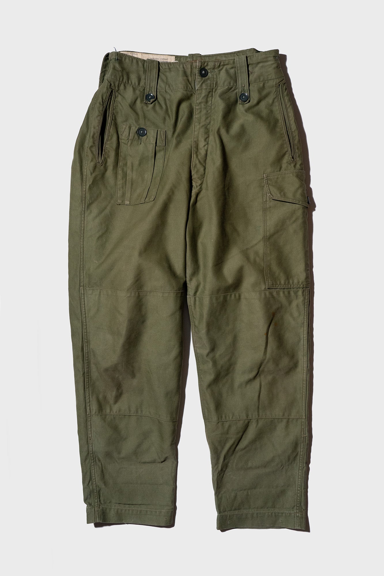 Die tropische Kampfuniform, die 1943 von der britischen Armee eingeführt wurde. Diese Hose wurde aus Baumwolle hergestellt und behielt die Grundstruktur der ursprünglichen Kampfuniform aus Wolle bei. Es gab zwei Farben: Khaki für den Einsatz im Mittelmeerraum und Grün für das Personal der britischen Armee und der Royal Air Force, das im Fernen Osten diente. Später, im Jahr 1944, begann die USA, die britische Armee mit grünen Versionen zu beliefern. Zu diesem Zeitpunkt wurden alle Materialien in den USA hergestellt, der Stoff wurde zu Fischgräten-Twill geändert und der Name wurde in „Jungle Fatigue” geändert. Bei diesem speziellen Exemplar handelt es sich um eine Kampfhose, die 1960 hergestellt wurde, das ursprüngliche Design beibehielt und von der britischen Armee ausgegeben wurde.