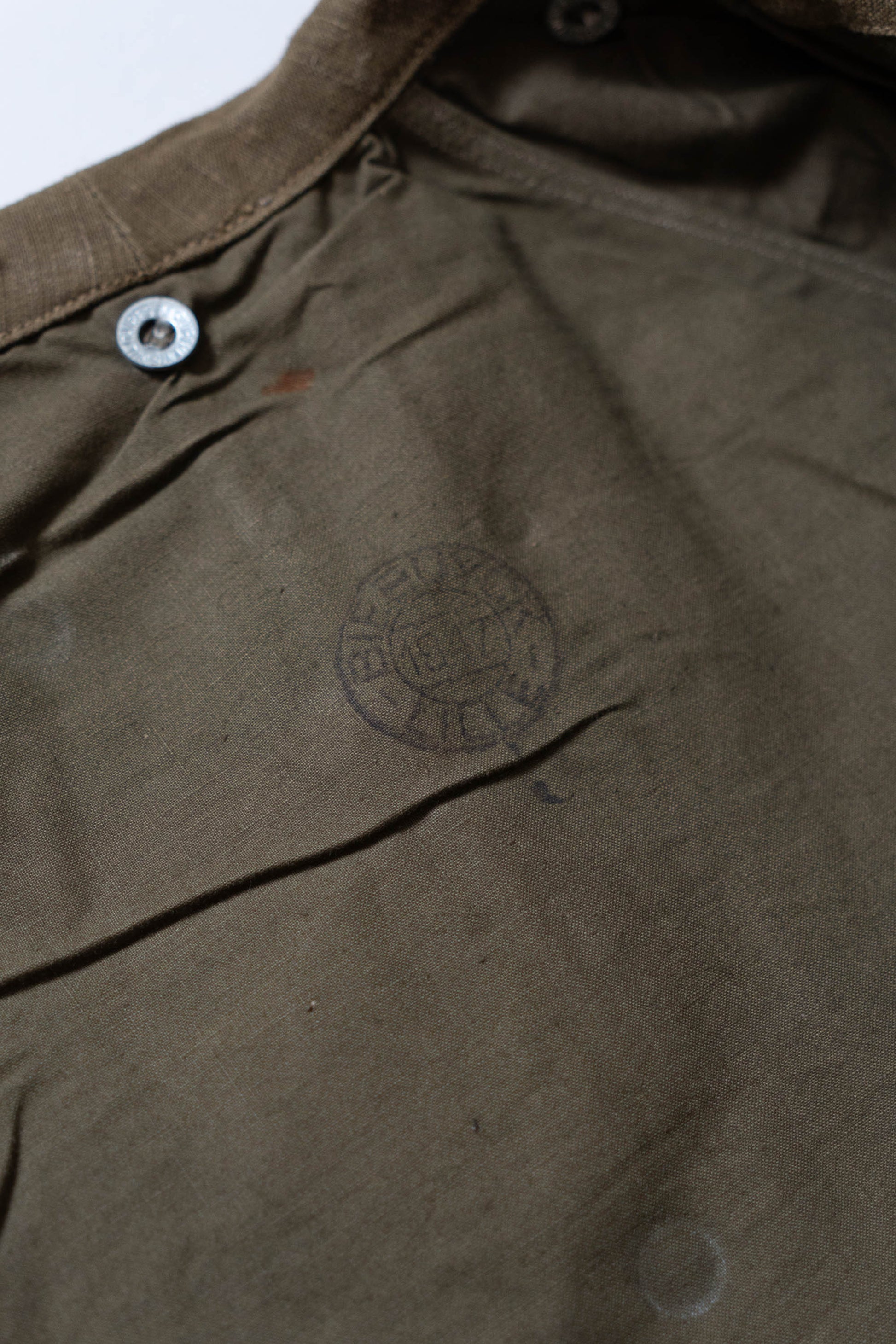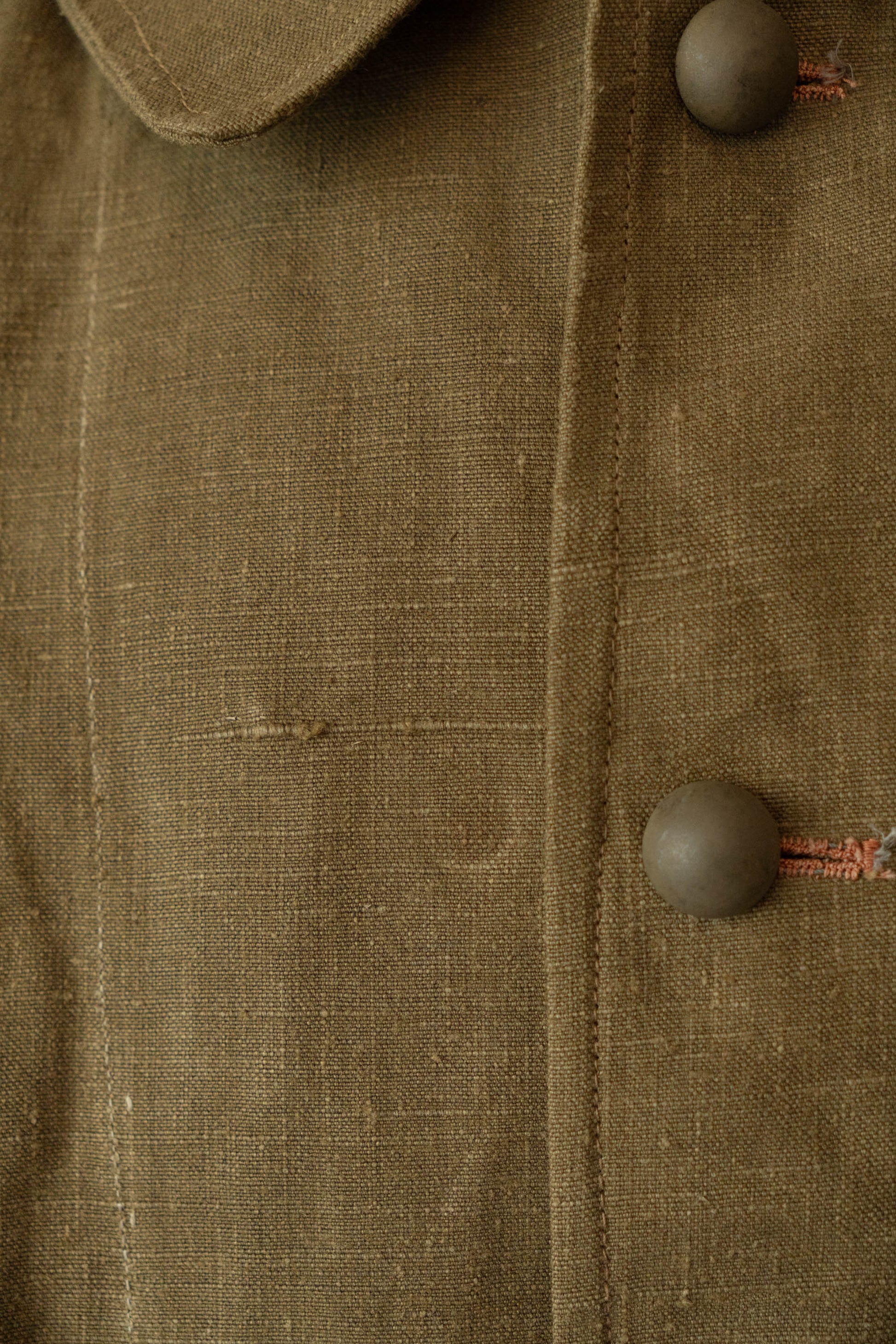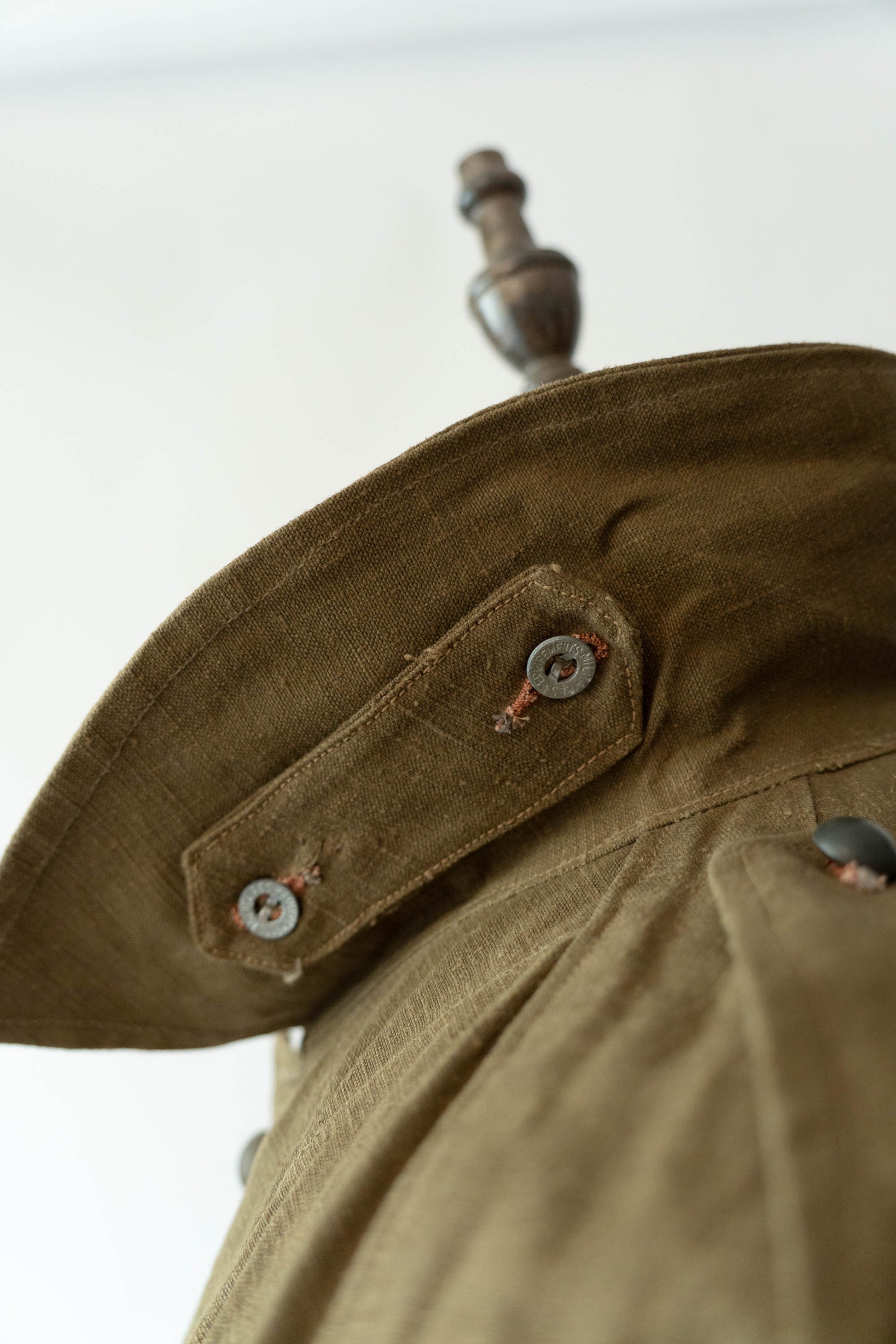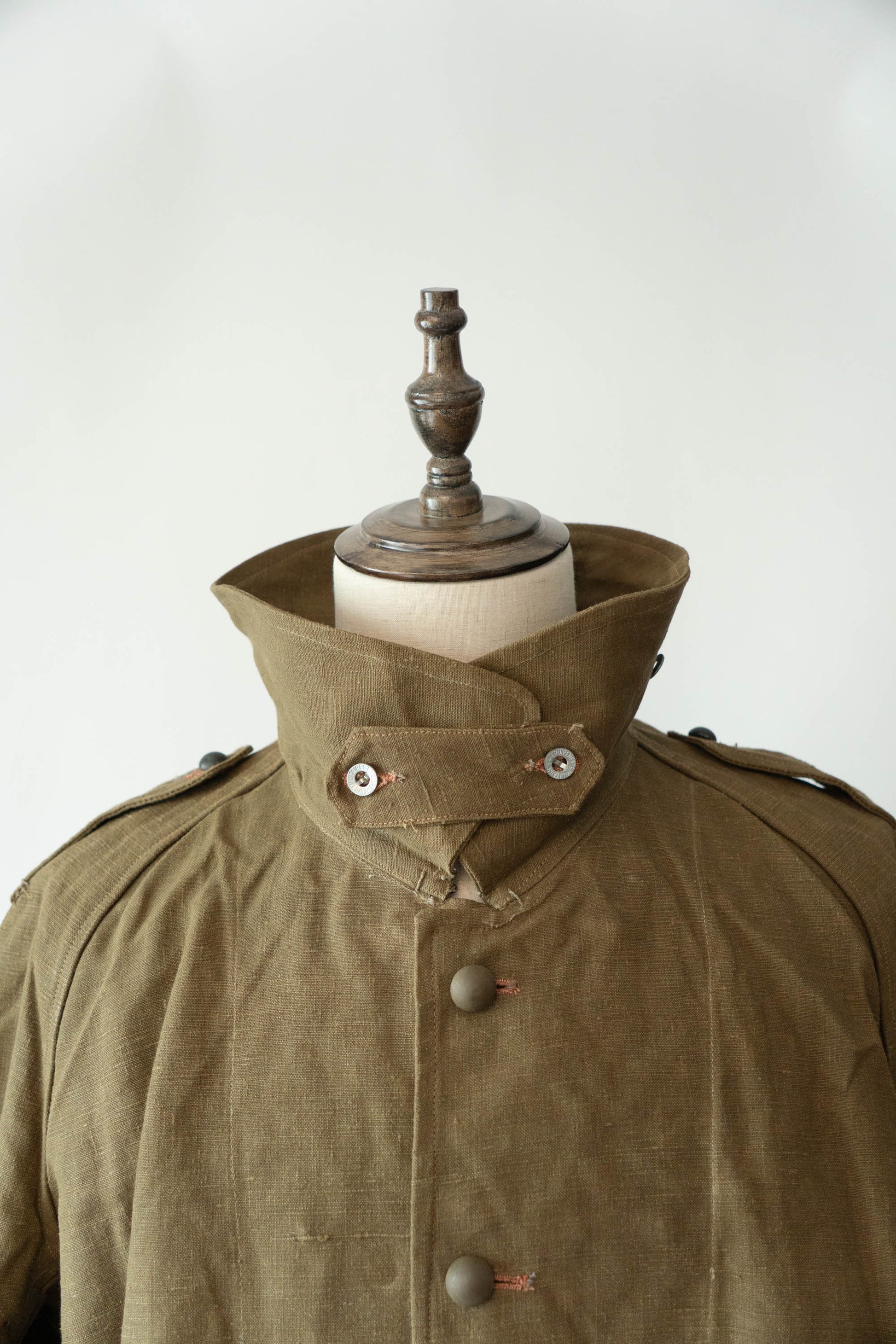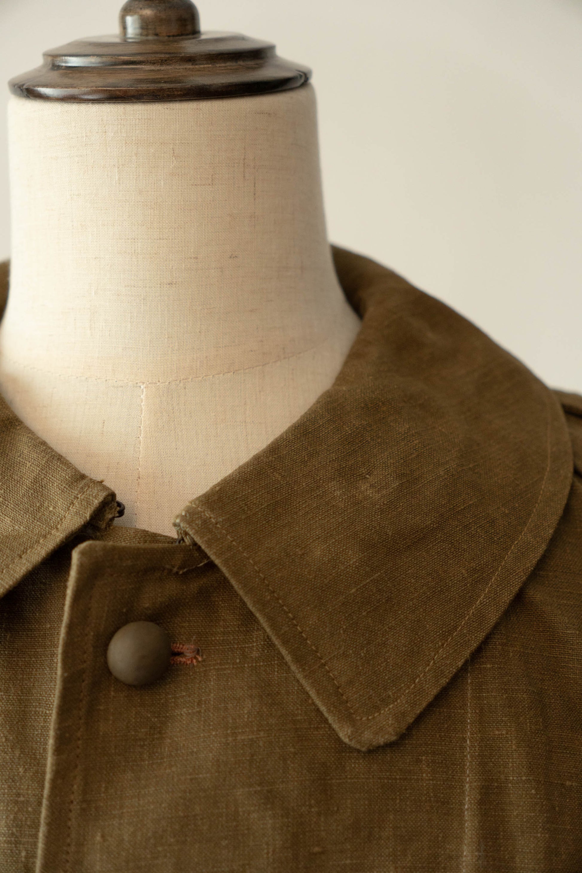 Obwohl er in der Anfangsphase des Zweiten Weltkriegs in Dünkirchen getragen wurde, handelte es sich bei dieser Leinen-Canvas-Ausführung um eine sehr limitierte Variante, die für den Einsatz in heißen, feuchten Klimazonen vorgesehen war. Selbst im Vergleich zum Baumwollmodell ist er auf dem Markt äußerst selten zu finden, und sein einzigartig schwingender Stoff macht ihn zu einem unwiderstehlichen Meisterwerk für Liebhaber europäischer Vintage-Mode.