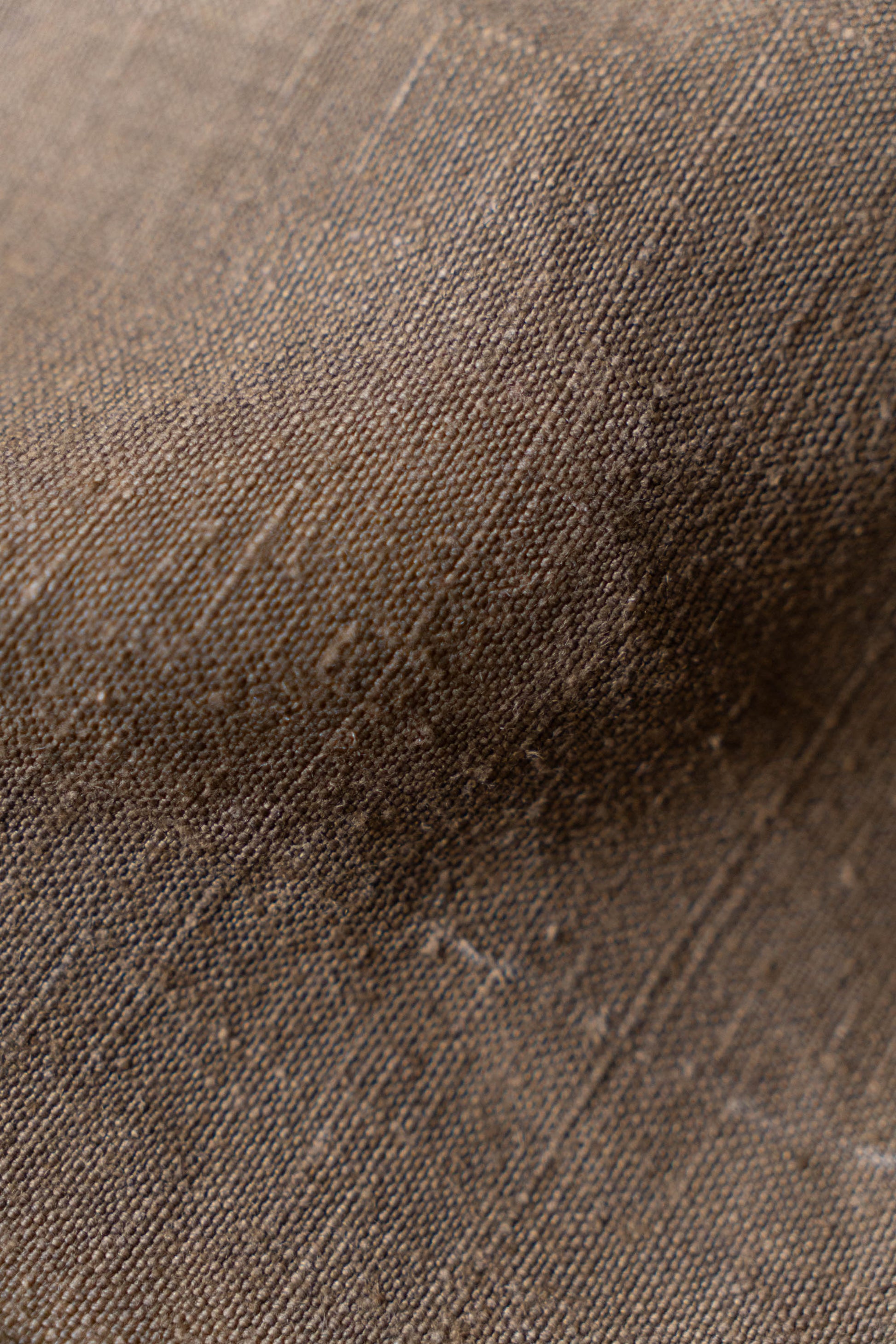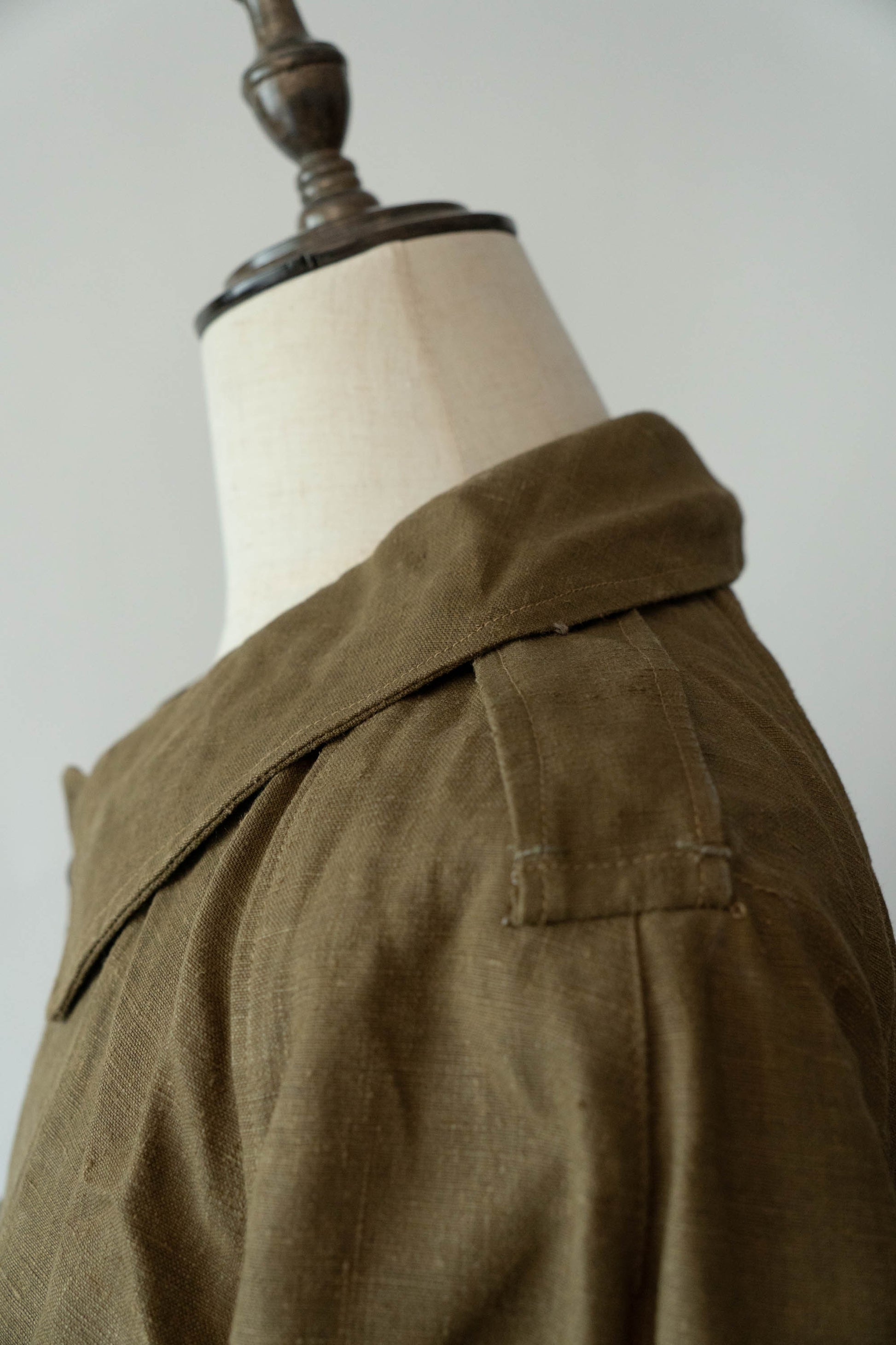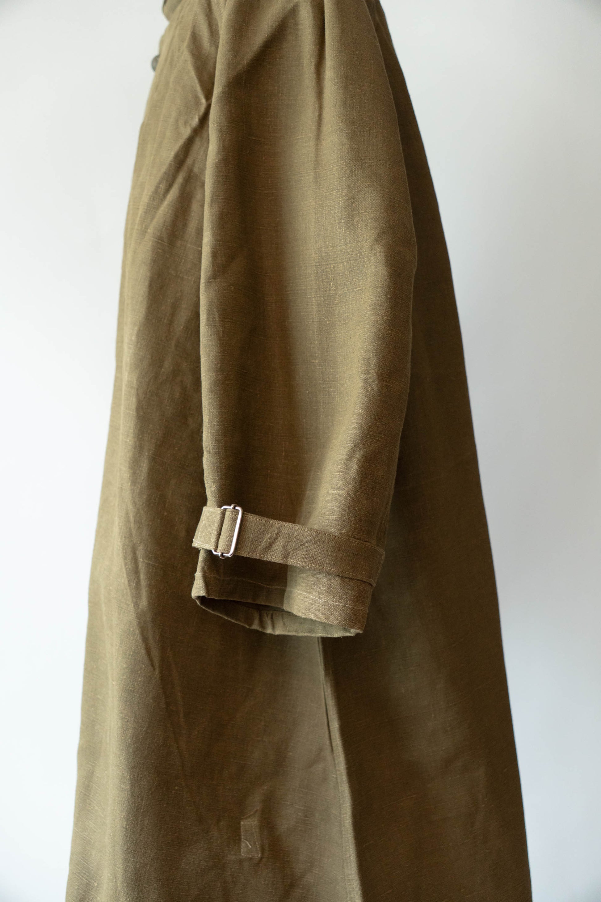 Der Stoff besteht aus dicht gewebtem französischem Leinen. Die für Leinen typischen groben Noppen und der ölreiche Glanz werden mit der Zeit weicher und entwickeln sich weiter, wodurch der für französisches Leinen charakteristische Fall entsteht. Seine Alterungseigenschaften unterscheiden sich deutlich von denen von Baumwollstoffen. Die Vorderseite ist doppelreihig mit fünf halbkugelförmigen khakifarbenen Metallknöpfen und verfügt über einen Kinnriemen zum Schutz vor Wind, wie es für diese Zeit üblich war. Der Kragen kann aufrecht als Stehkragen getragen werden und setzt so einen Akzent in Ihrem Outfit. Die Raglanärmel, die von den Schultern ausgehen, bieten viel Bewegungsfreiheit. In Kombination mit dem tiefen Schlitz in der Mitte des Rückens ermöglicht dieses Design die für das Reiten erforderliche nach vorne geneigte Haltung. Die Ärmellänge ist bewusst etwas kürzer gehalten, da die Jacke gemäß den Vorschriften der damaligen Zeit über langen Handschuhen getragen wurde, die bis über den Ellbogen reichten. So wurde sichergestellt, dass die Handschuhe vor Regenwasser schützten und gleichzeitig die Beweglichkeit der Handgelenke nicht einschränkten. Die Ärmelbündchen sind mit Schnallenverschlüssen versehen, mit denen die Passform individuell angepasst werden kann, sodass die Jacke auch ohne Handschuhe sicher sitzt. Zwei interne Beinriemen sind in das Futter des Saums eingenäht; wenn man sie im Schritt befestigt, wird das Flattern während der Bewegung reduziert. Ein passender Stoffgürtel ist an der Taille angenäht. Die Taillentasche ist als Durchgrifftasche gestaltet, um einen einfachen Zugriff auf die darunterliegenden Schichten zu ermöglichen. Jedes Detail dieses französischen Meisterwerks wurde mit Bedacht gestaltet.