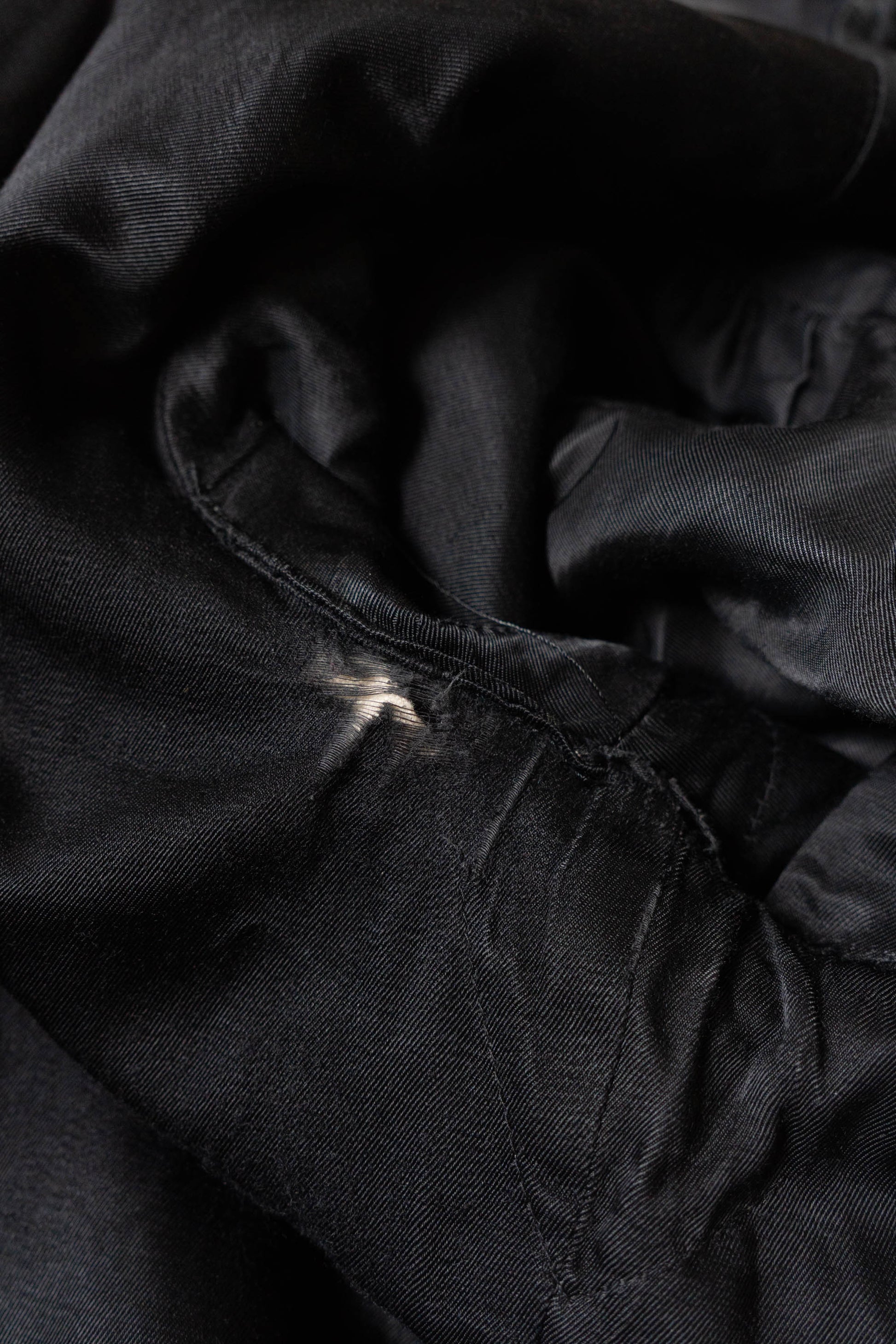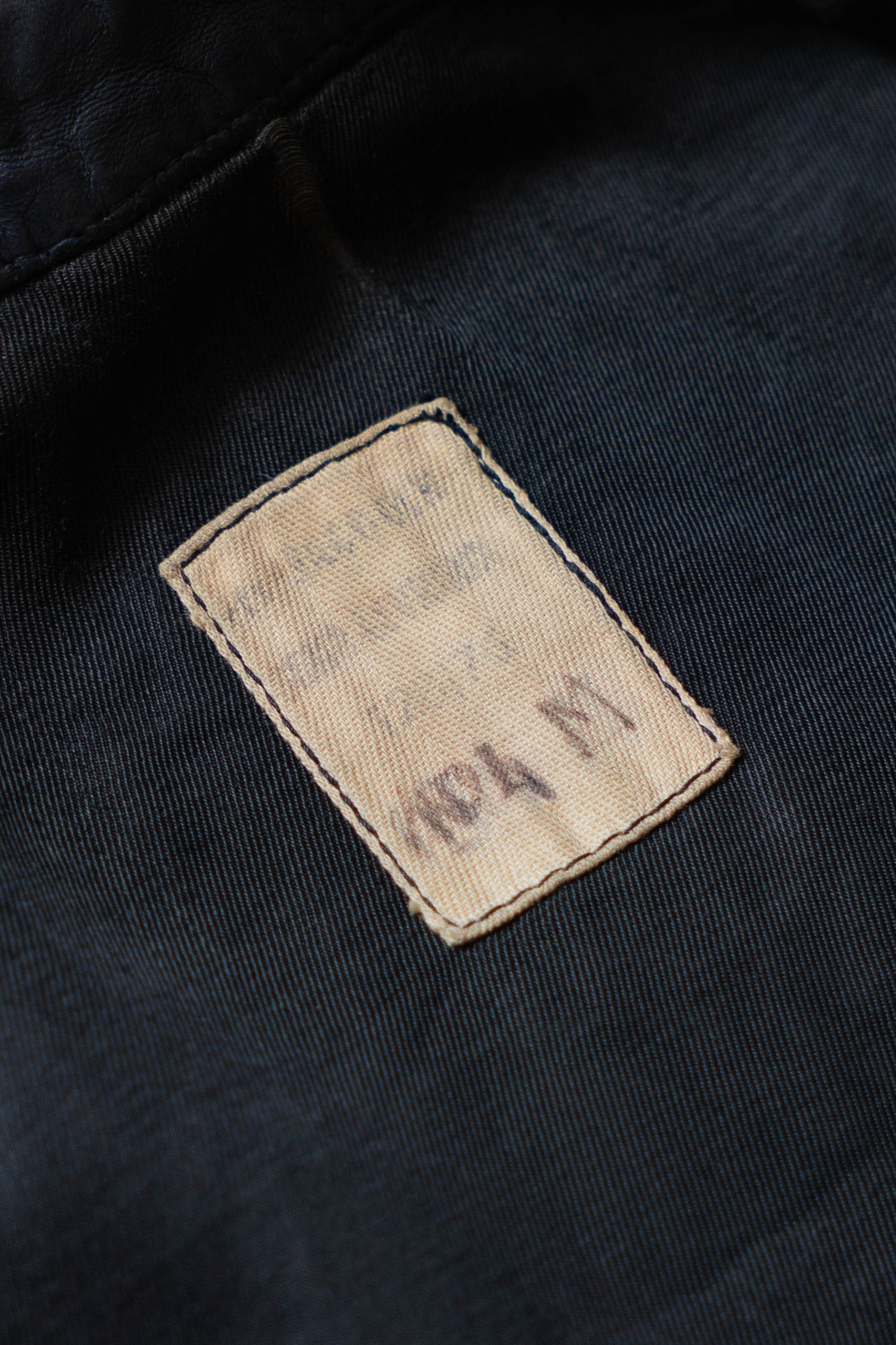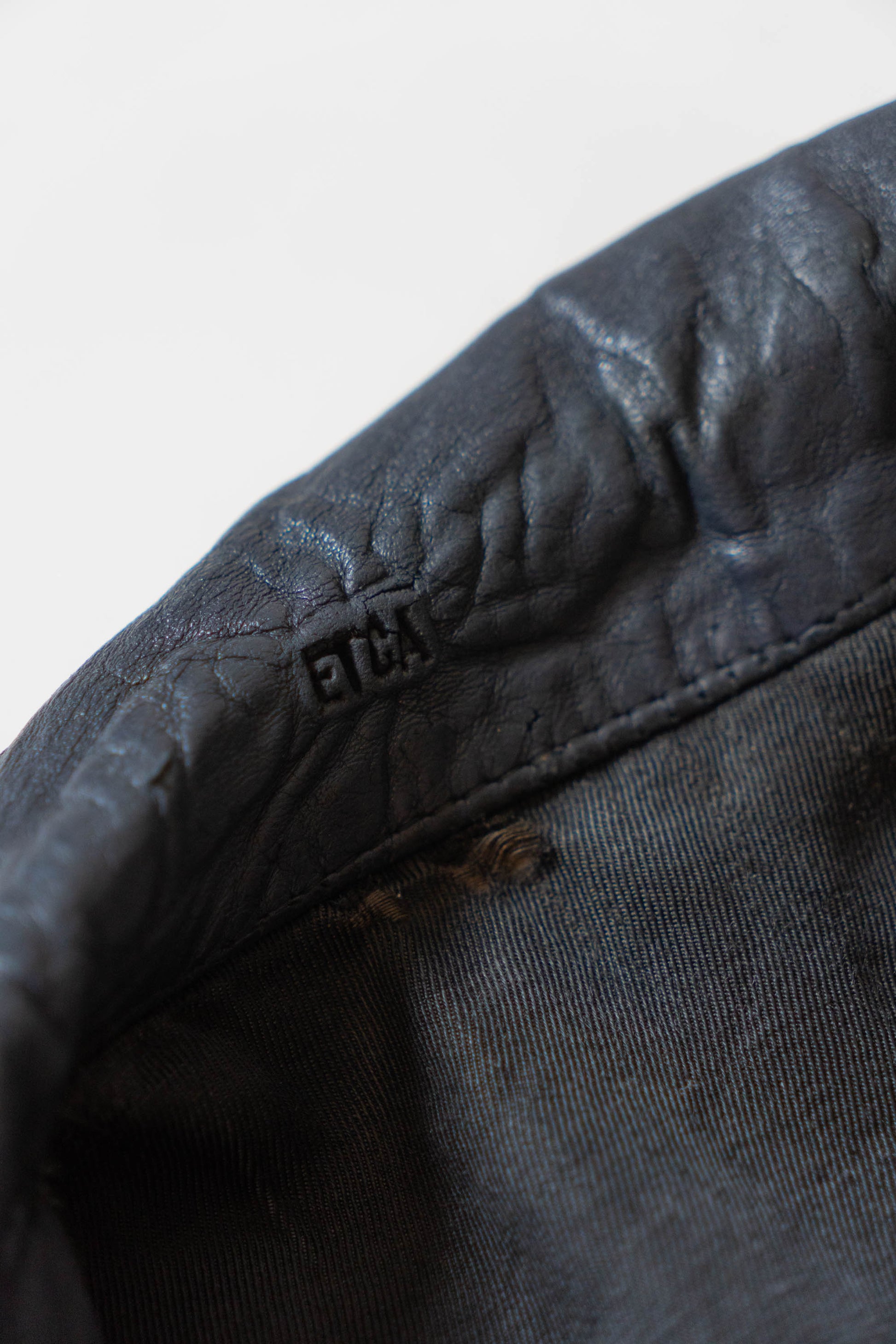Der Reißverschluss verfügt über einen Doppelschieber mit einer dreieckigen, ausgeschnittenen Zuglasche, wie sie häufig bei französischen Militärartikeln aus dieser Zeit zu finden ist. Diese Form wird auch häufig bei Éclair-Reißverschlüssen verwendet. Unmarkierte Typen wie dieser sind eine Variante, die bei in Frankreich hergestellten Lederjacken und einigen Militärartikeln aus derselben Zeit zu finden ist. Obwohl es Unterschiede in der Markierung und der Form des Schiebers gibt, sind die Funktionalität und die Benutzerfreundlichkeit gleichermaßen hervorragend. Der innere Kragen trägt den Stempel „ETCA”. Dieses Prüfzeichen zeigt die Zulassung durch die Bekleidungsbehörde der französischen Luftwaffe an und bedeutet, dass die offiziellen Ausrüstungsstandards erfüllt sind. Bei diesem Artikel handelt es sich um ein originales Vintage-Stück, das tatsächlich als offizielle Ausgabe an das französische Militär ausgegeben wurde. Es ist ein hervorragendes Exemplar, das die praktische funktionale Schönheit und den modischen Reiz von Militärbekleidung mit der Qualität von französischem Leder verbindet.