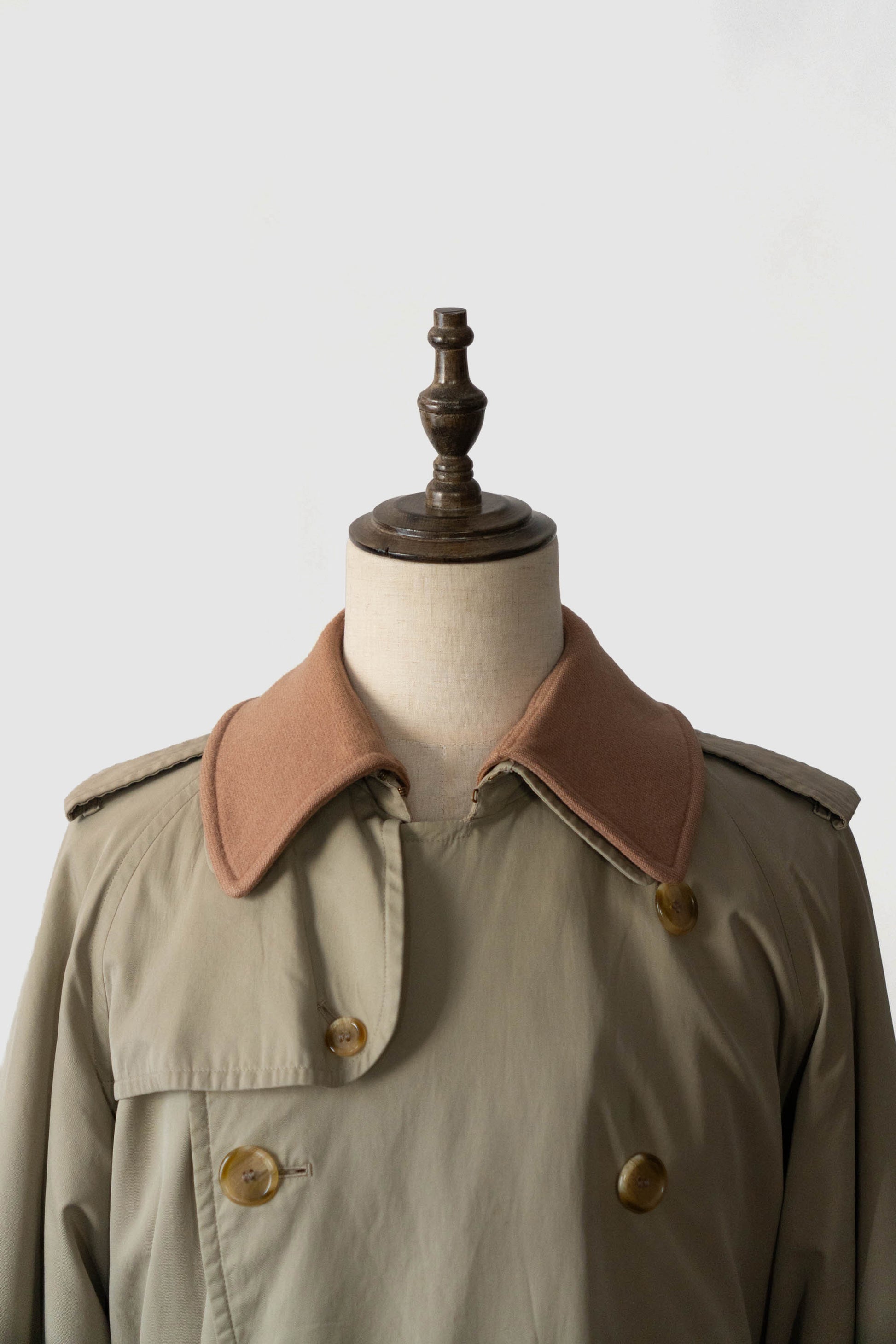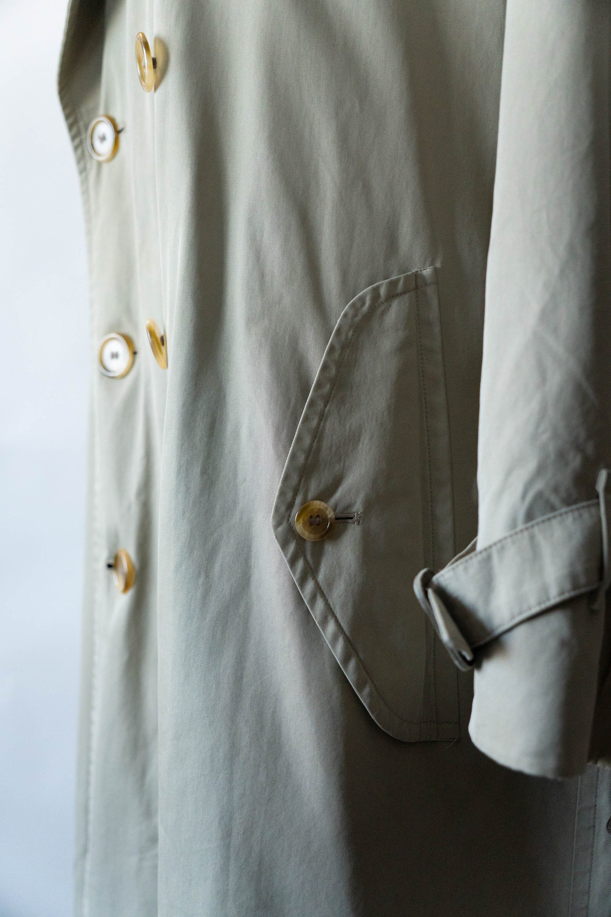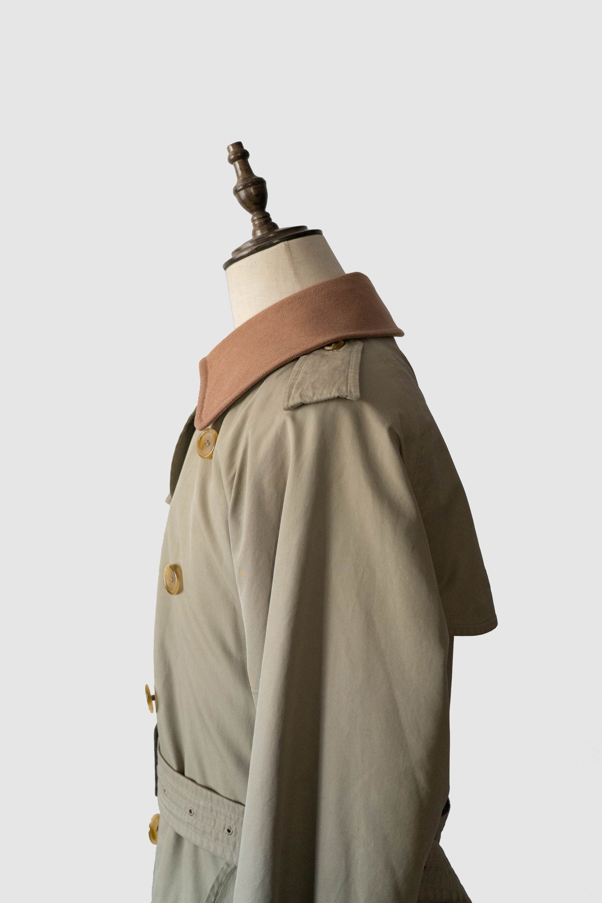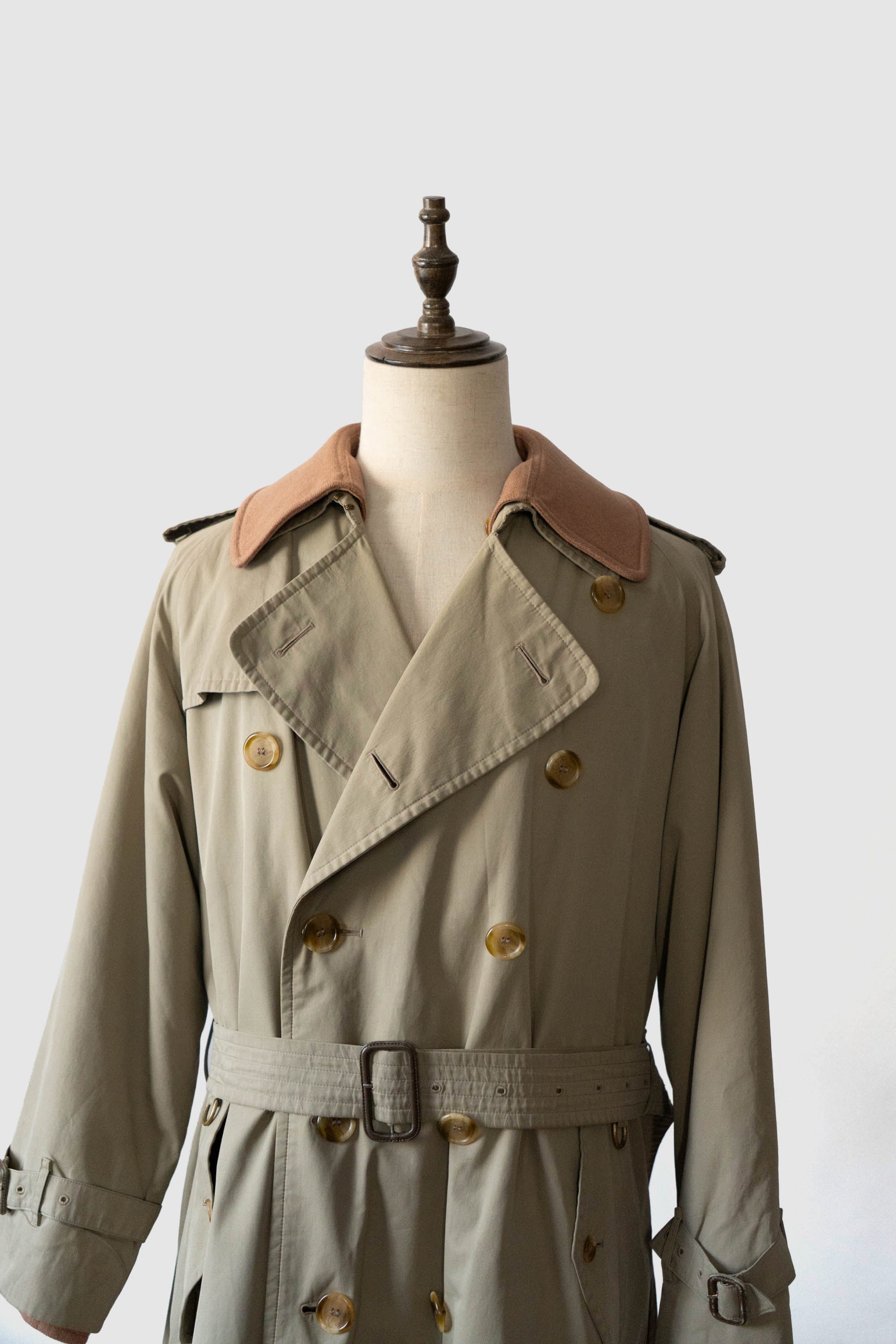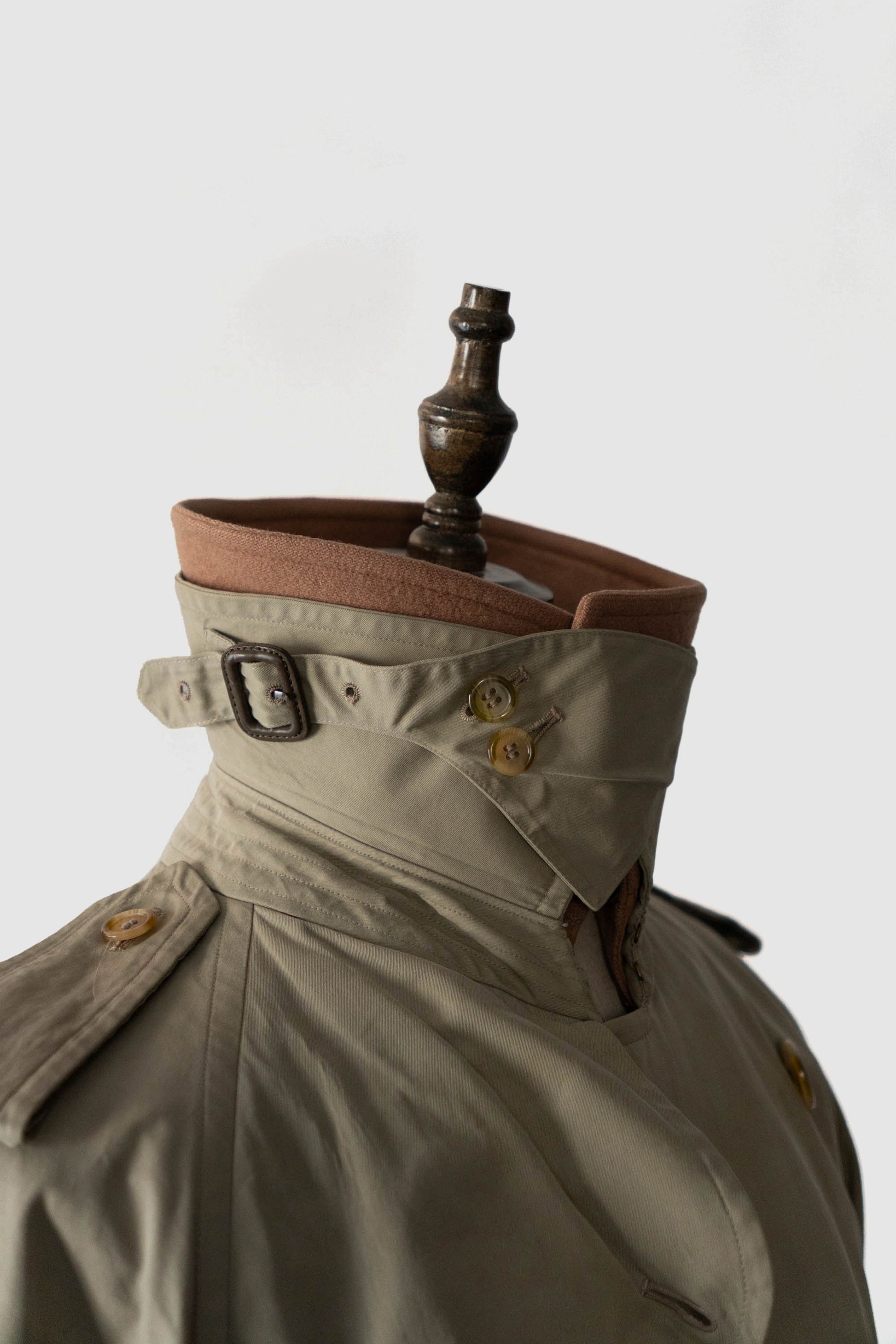 当個体はトレンチコートの王様である【trench21】上質なコットン100%のギャバジンに1枚袖仕様のフルセットです。生地はベージュに少しオリーブがかった非常に良いカラーです。 前立てのダブルブレスト、Dリング付きのウエストベルト、ガンフラップ、エポレット、チンストラップなど、トレンチを象徴する素晴らしいディテールの数々。軍由来の圧巻のデザインで英国らしい美しいデザインとなっています。サイズは50regとゆったりめのバランス。多くの方にフィットするサイズかと思います。 ミリタリー由来の佇まいを大切に保ちながら、ベルトで絞る。ラフに羽織るなど様々なスタイルで楽しめる、クラシックトレンチの魅力が詰まった一着です。