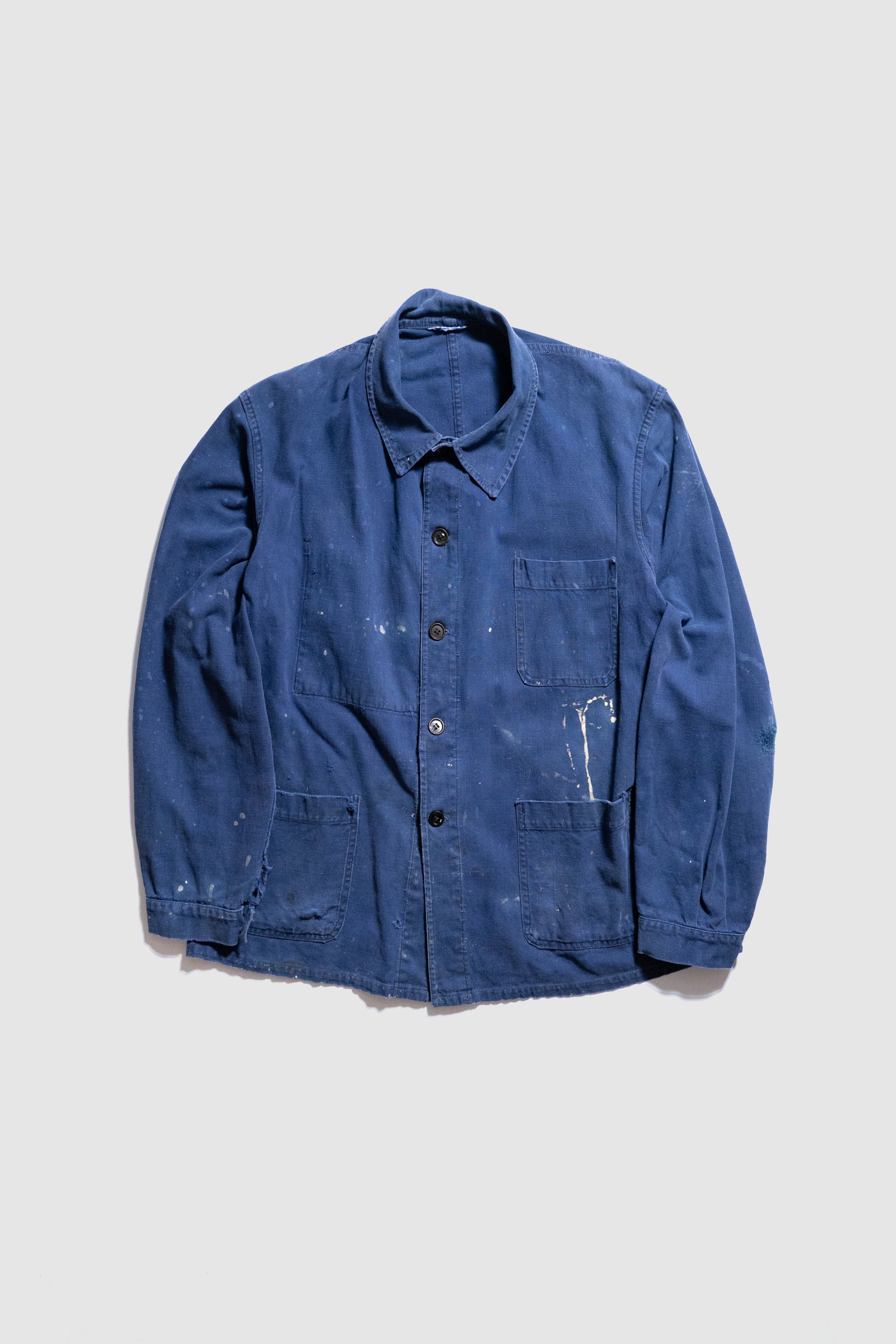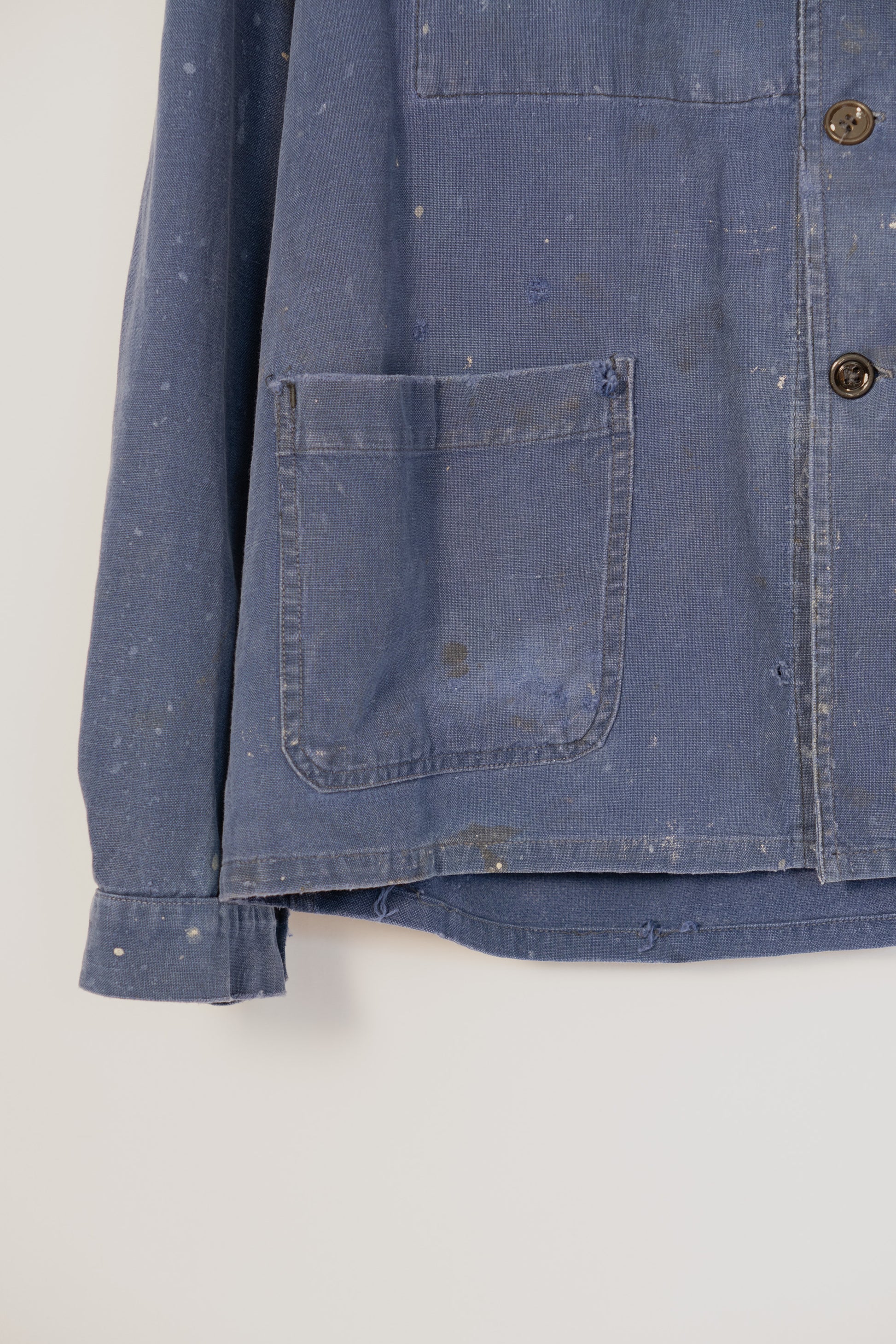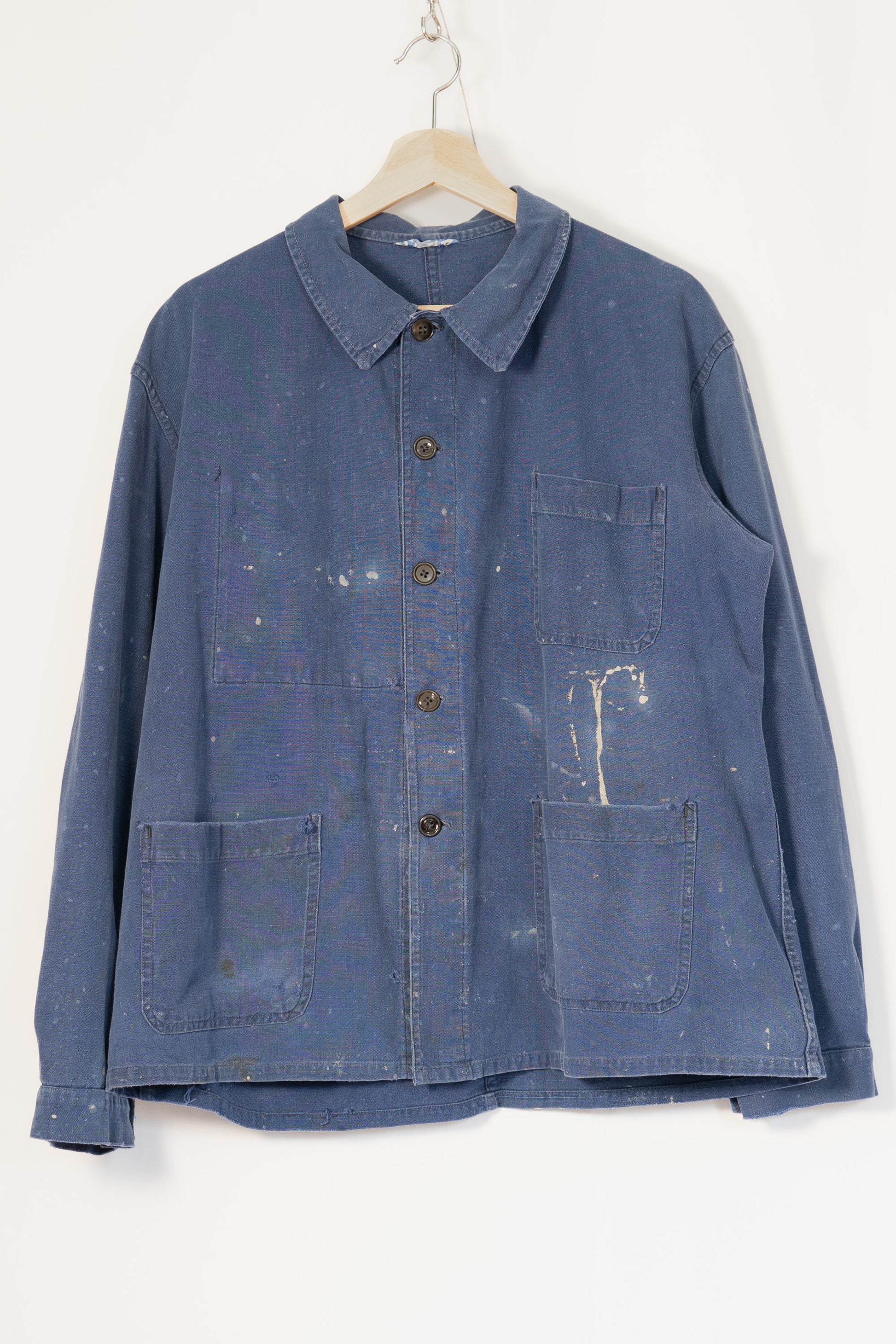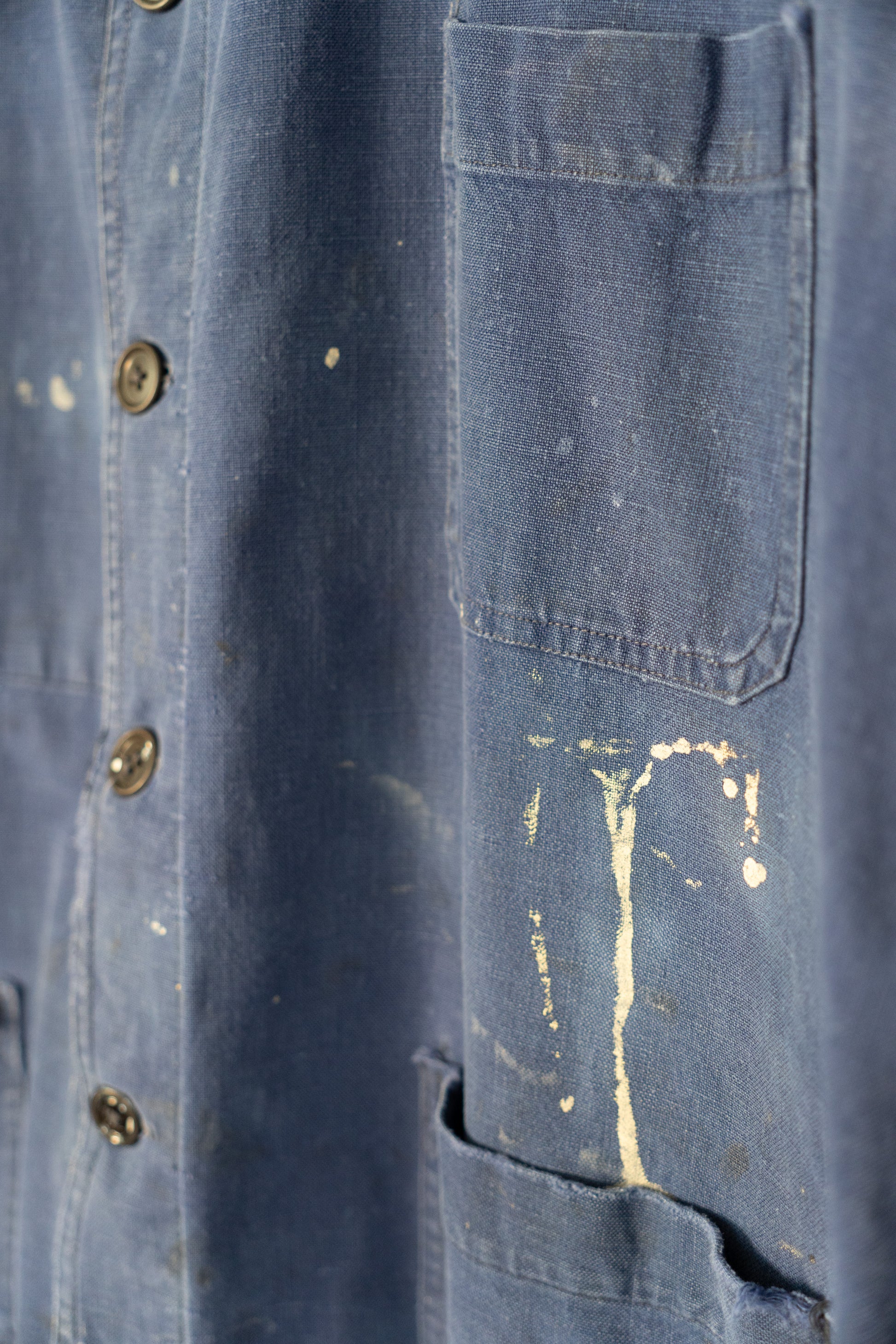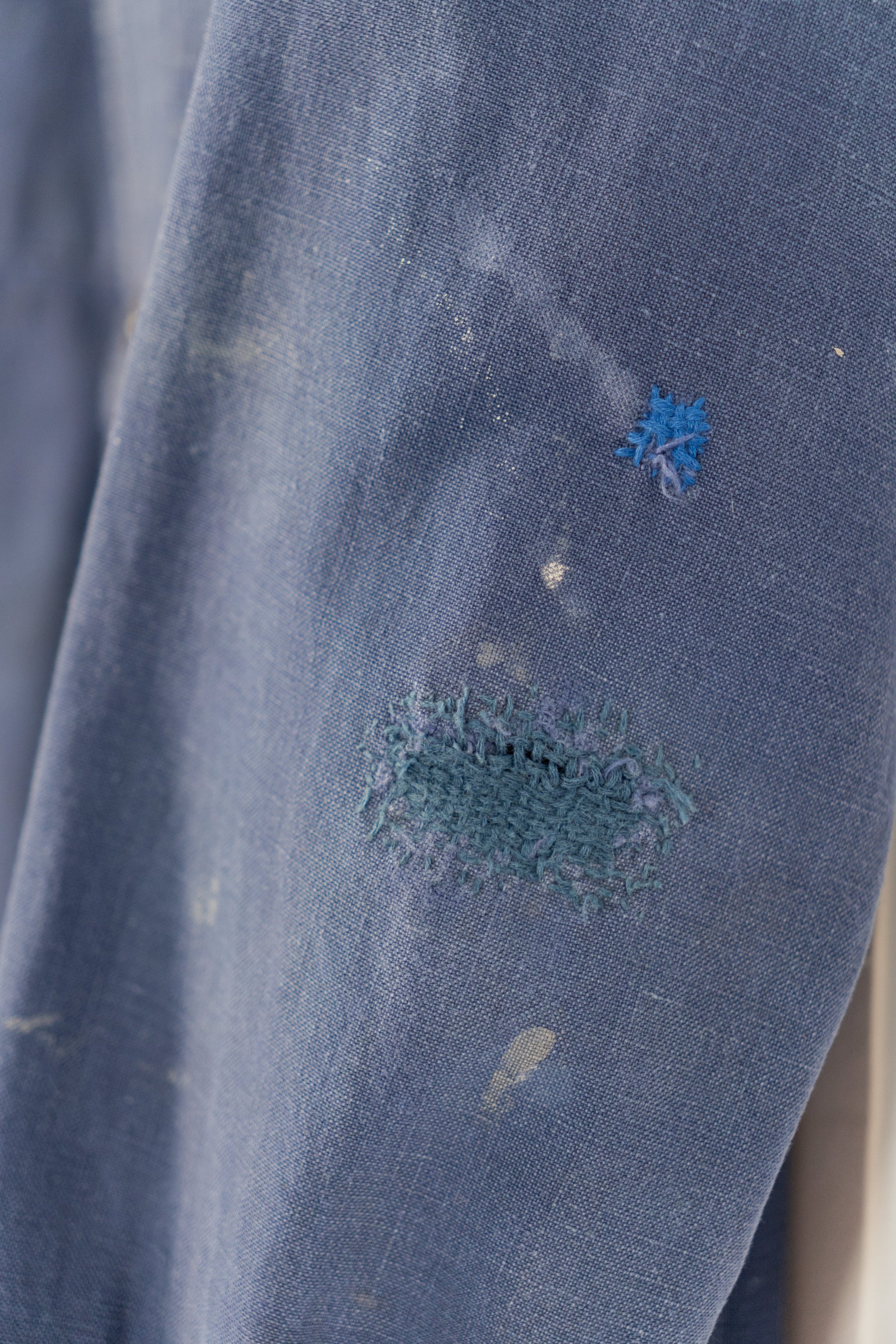 Elle présente des déchirures et des taches de peinture, ce qui laisse supposer qu'elle a probablement été portée par un artisan. Les parties très usées et déchirées ont été réparées, ce qui laisse penser que cette veste a été portée avec soin. Bien qu'elle soit en piteux état, elle dégage une beauté décadente.