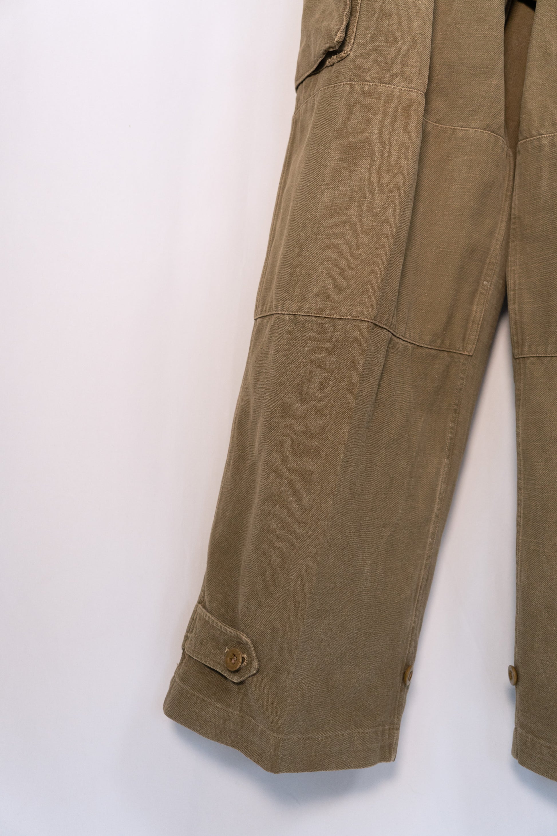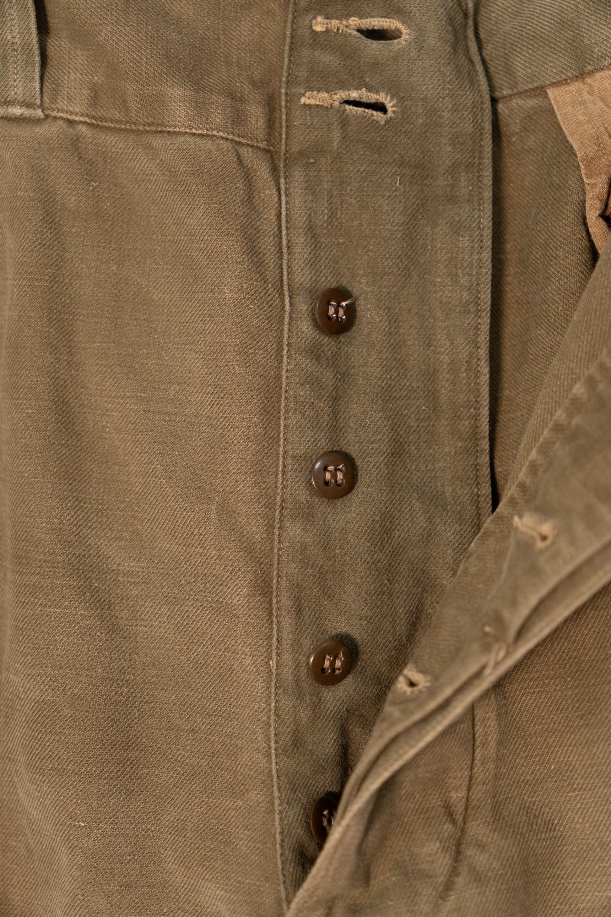 Il s'agit d'un modèle en twill de coton de la première période. Le bouton supérieur à la taille est de type à double boutonnage.