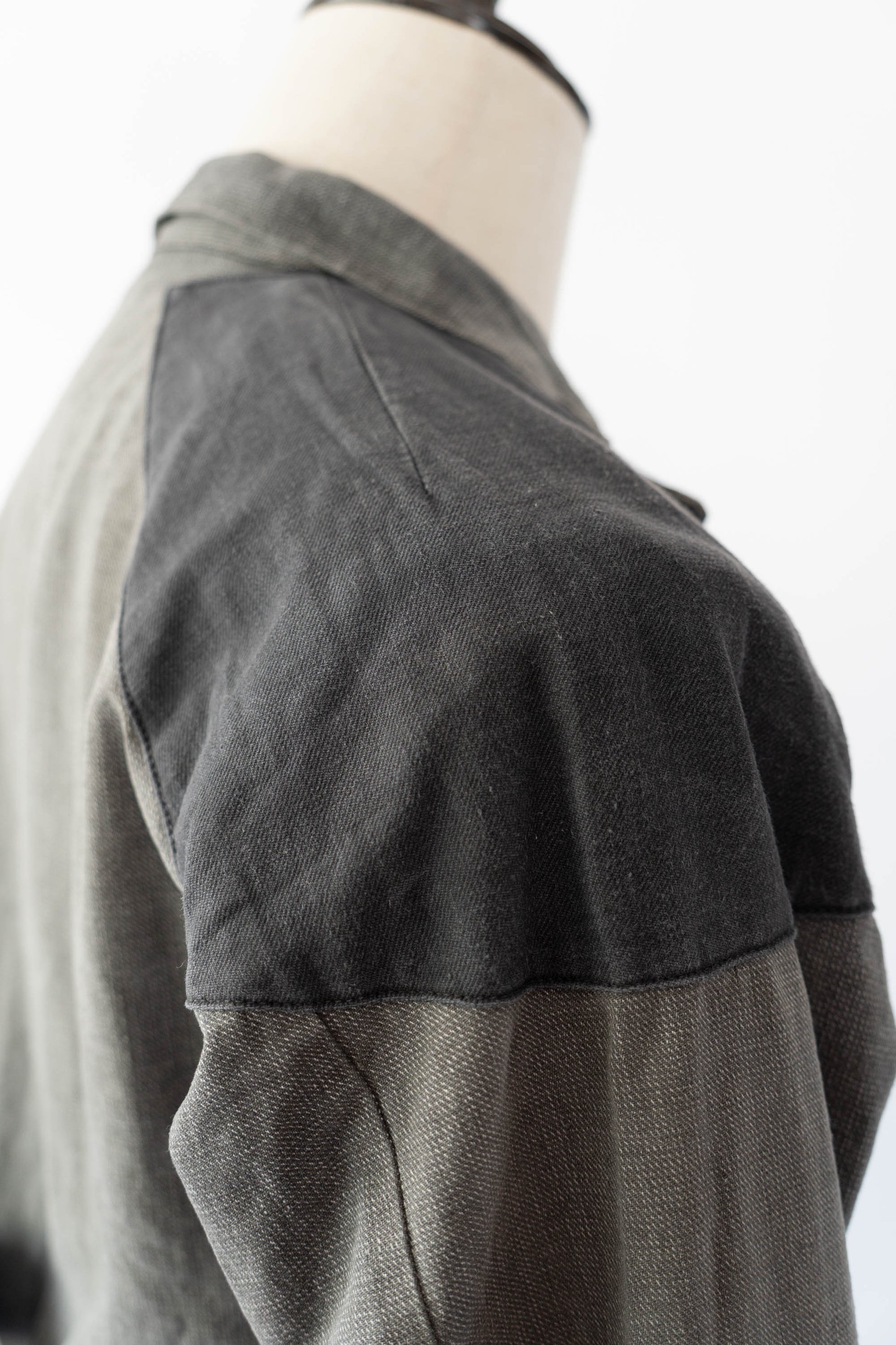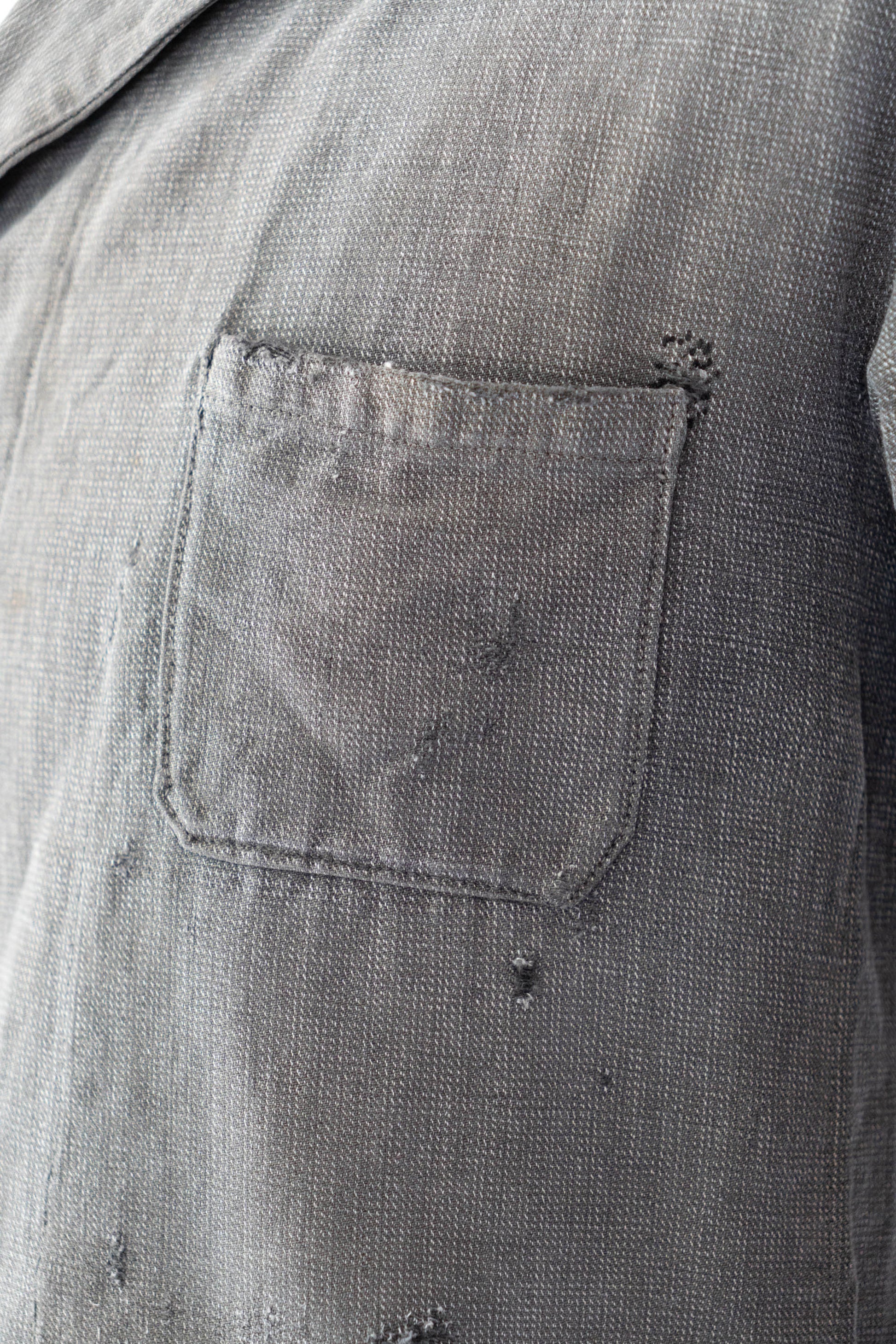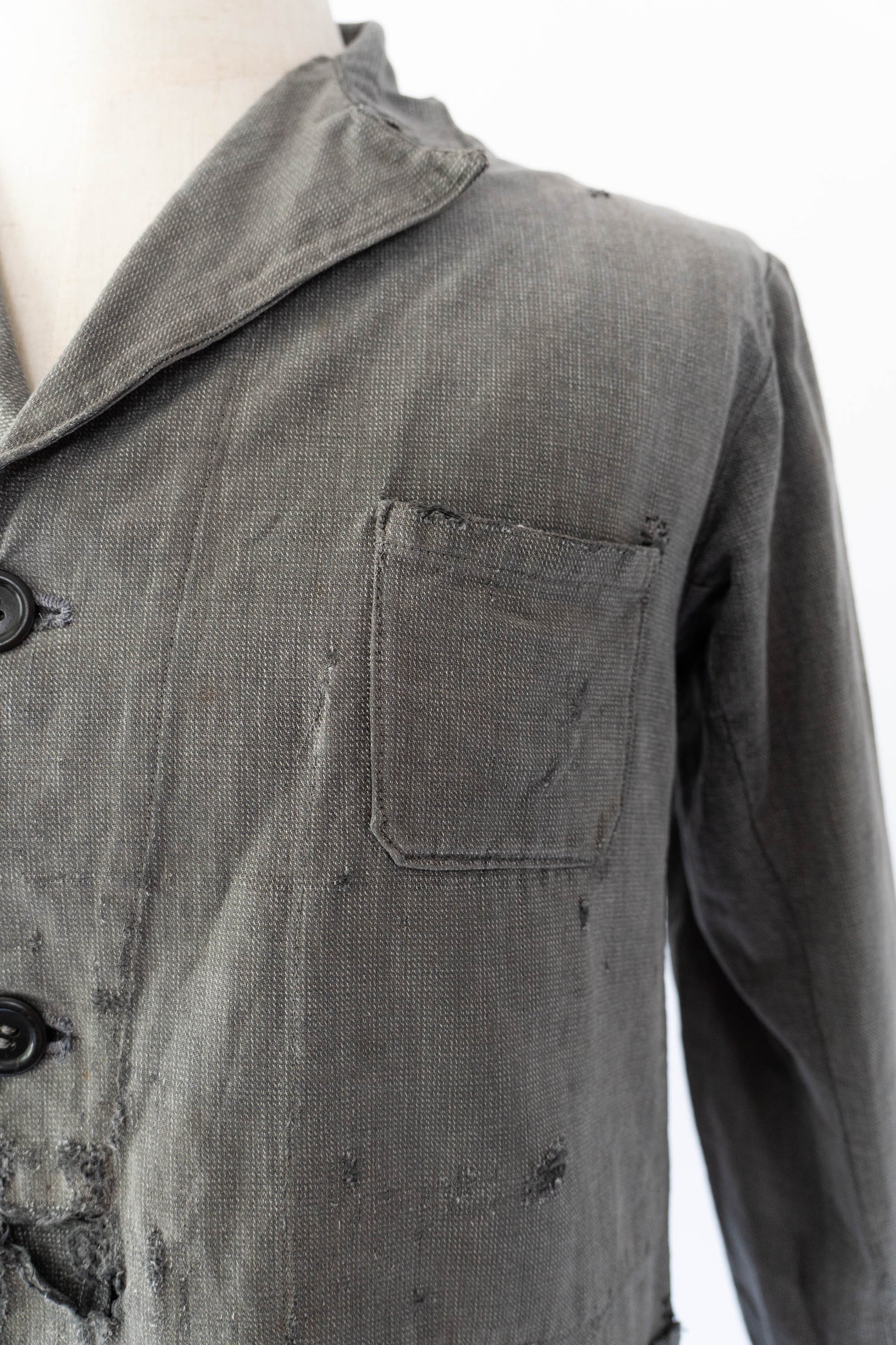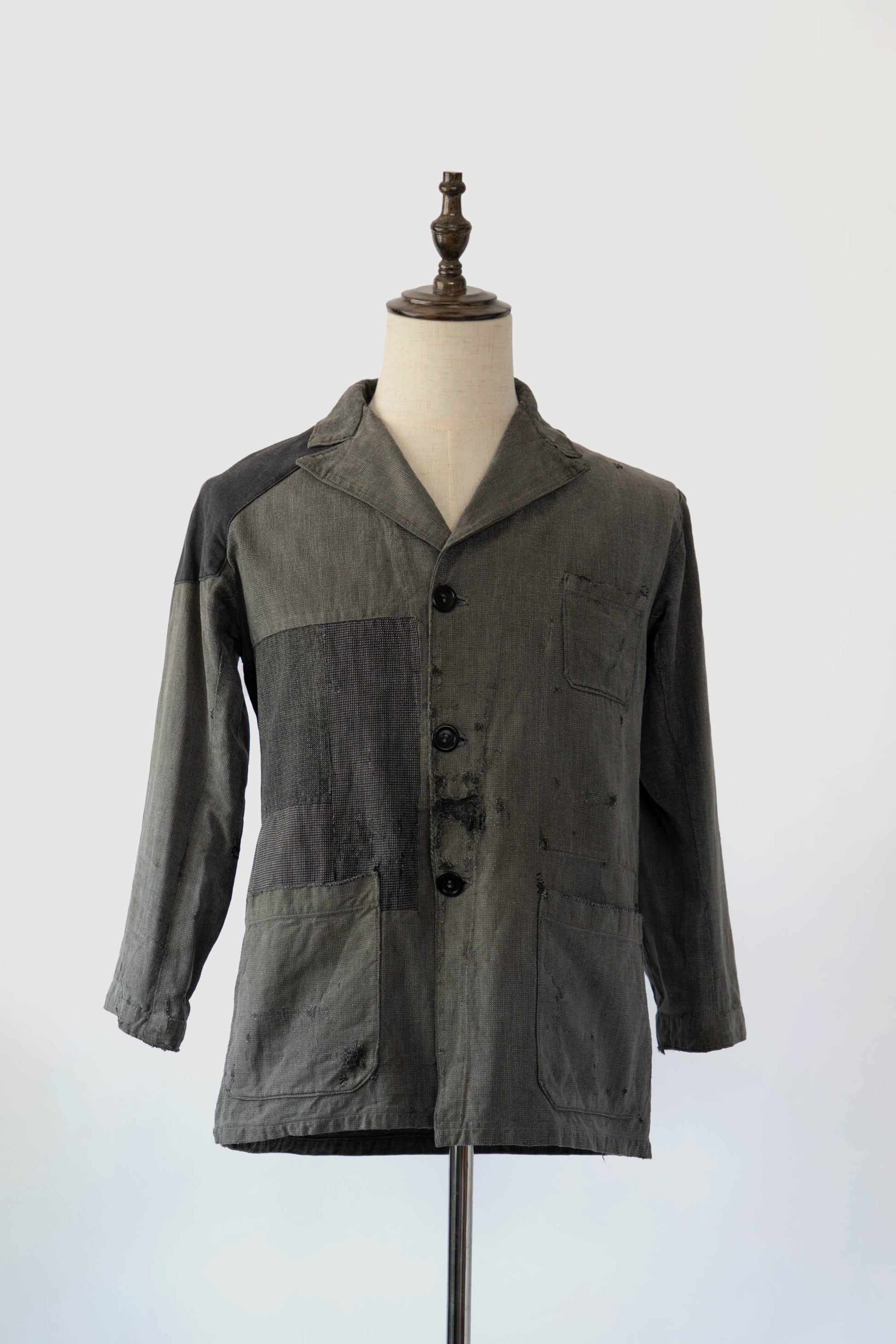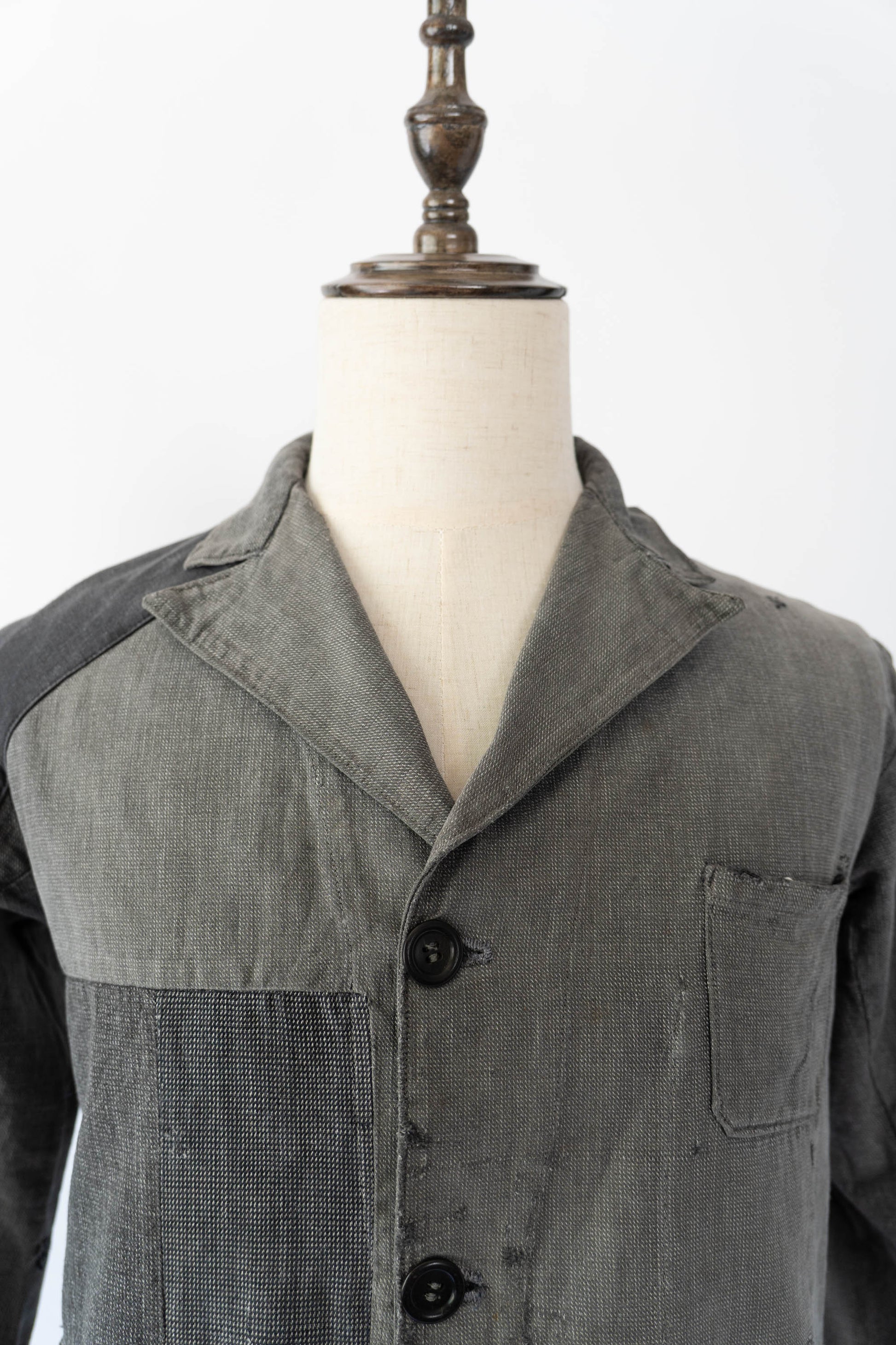 Pendant la Seconde Guerre mondiale, sous le contrôle des ressources, les ateliers et les usines de maintenance français ont principalement utilisé le tissu « Salt & Pepper » (twill marbré tissé en alternant des fils noirs et des fils écru) comme tissu de travail. Alors que l'indigo teint à l'indigo venait à manquer, ce tissu, qui permettait d'utiliser des fils mélangés de coton, était fabriqué pour des usages nécessitant une bonne résistance à l'usure et une faible visibilité des taches d'huile. Cet article est une veste d'atelier qui a probablement été utilisée dans la période de reconstruction après la guerre, à la fin des années 1940. Après avoir été portée, elle a été réparée à plusieurs reprises par son propriétaire à l'aide de patchwork et de reprissage, reflétant ainsi la culture « boro » transmise de génération en génération en France, c'est-à-dire l'esprit « réparer pour continuer à porter ».