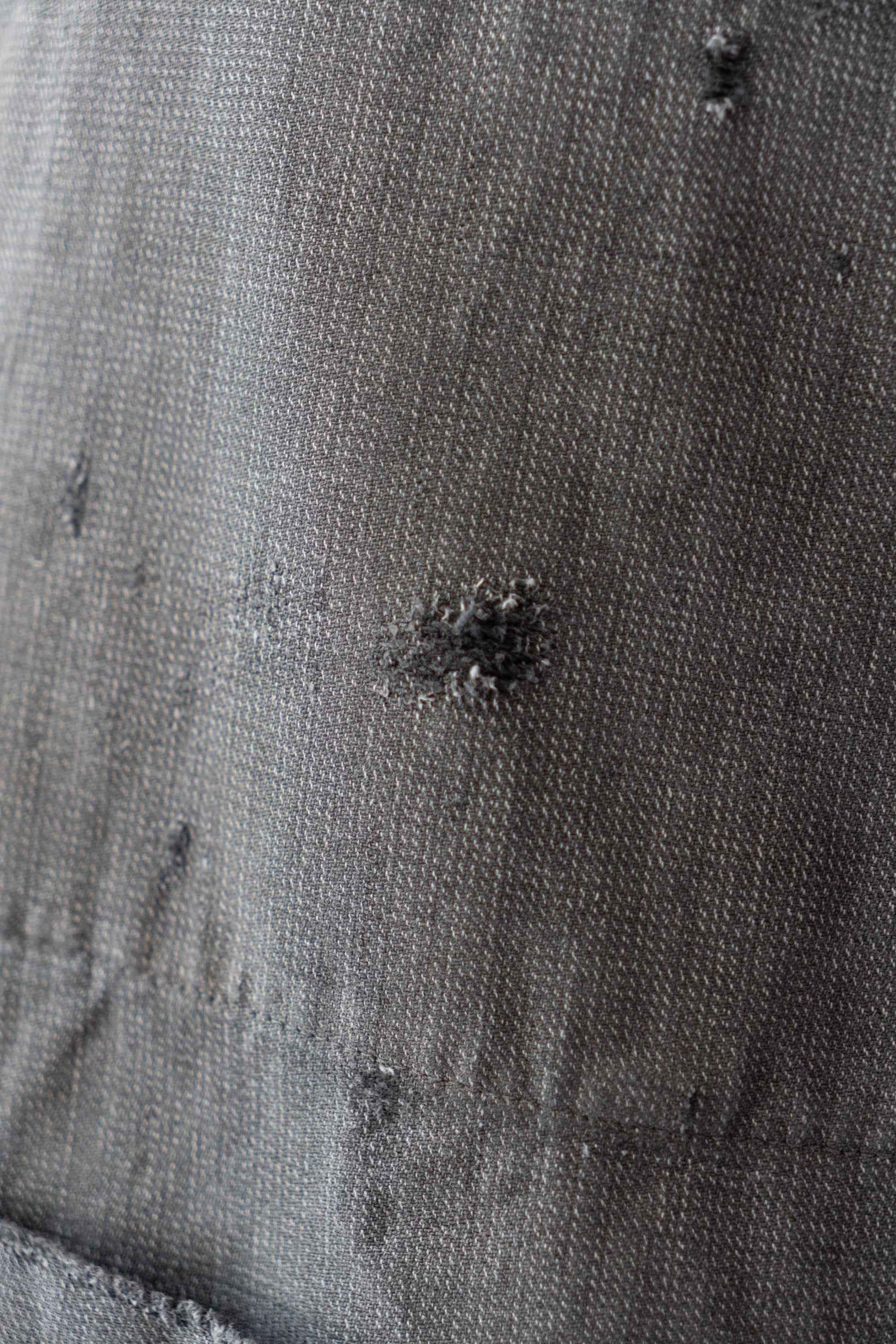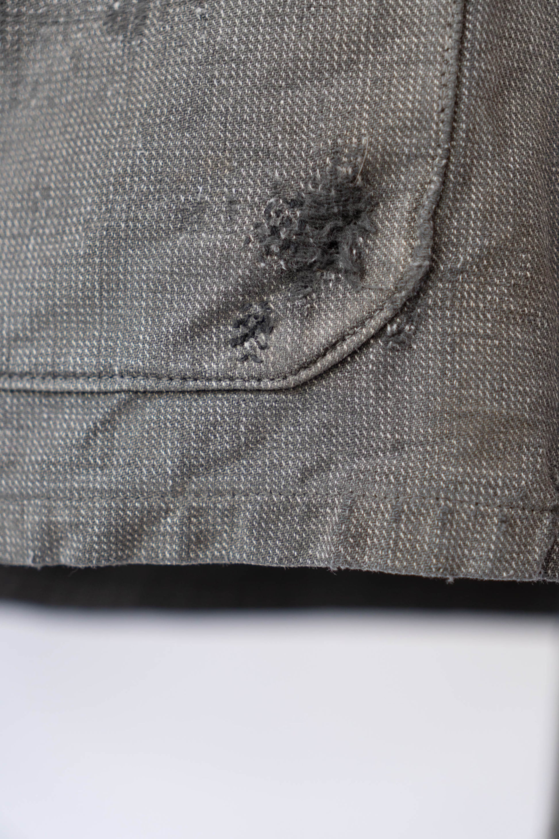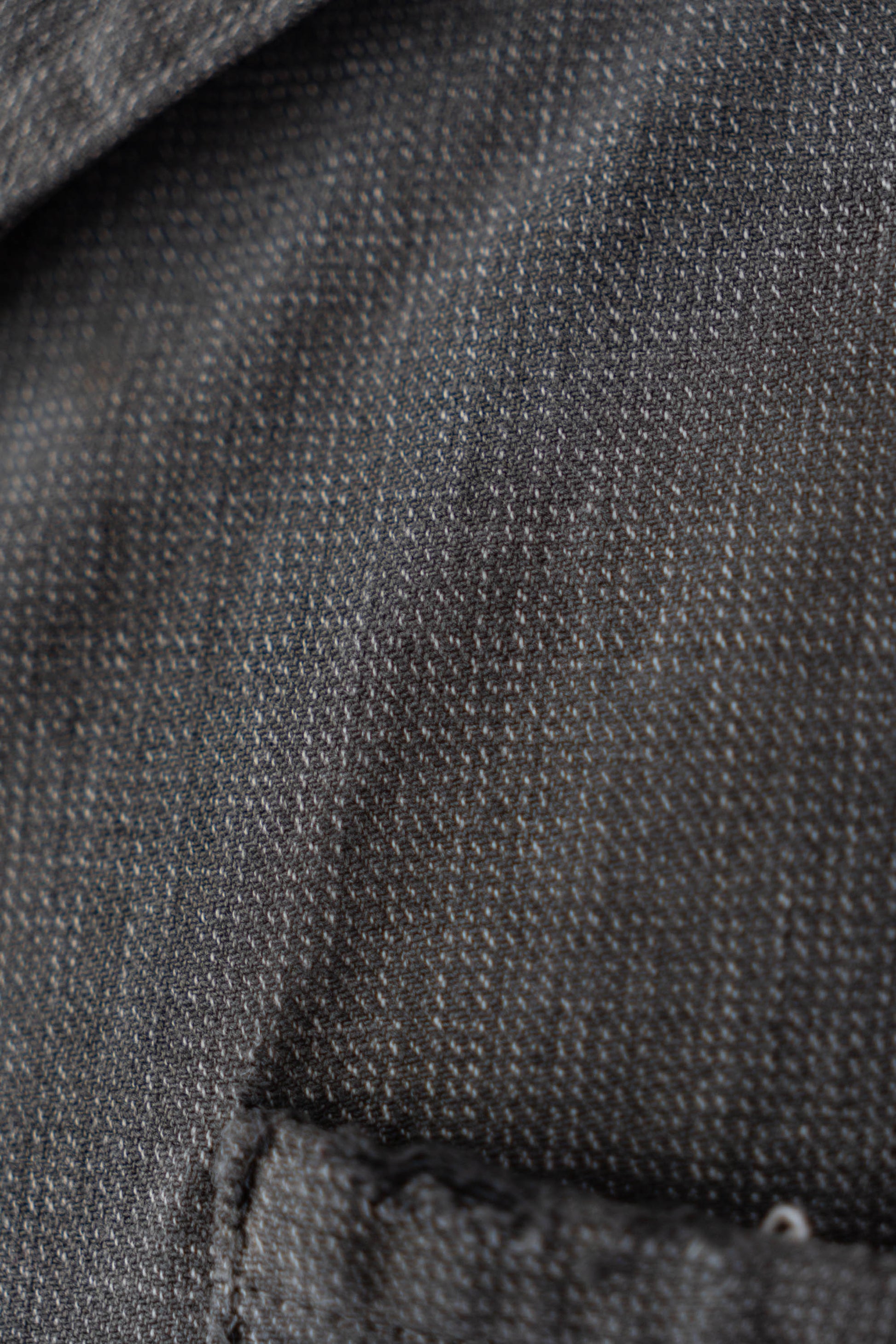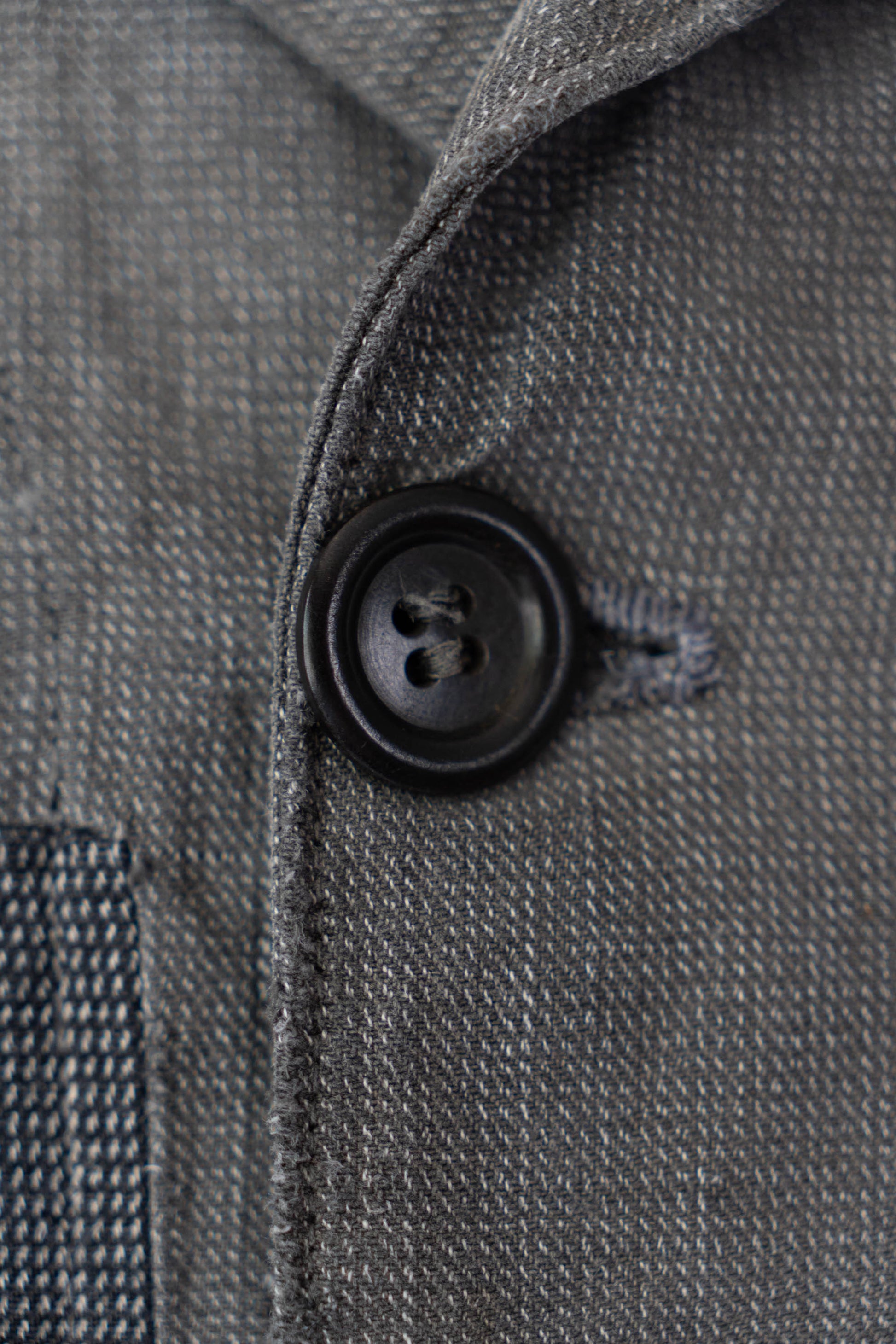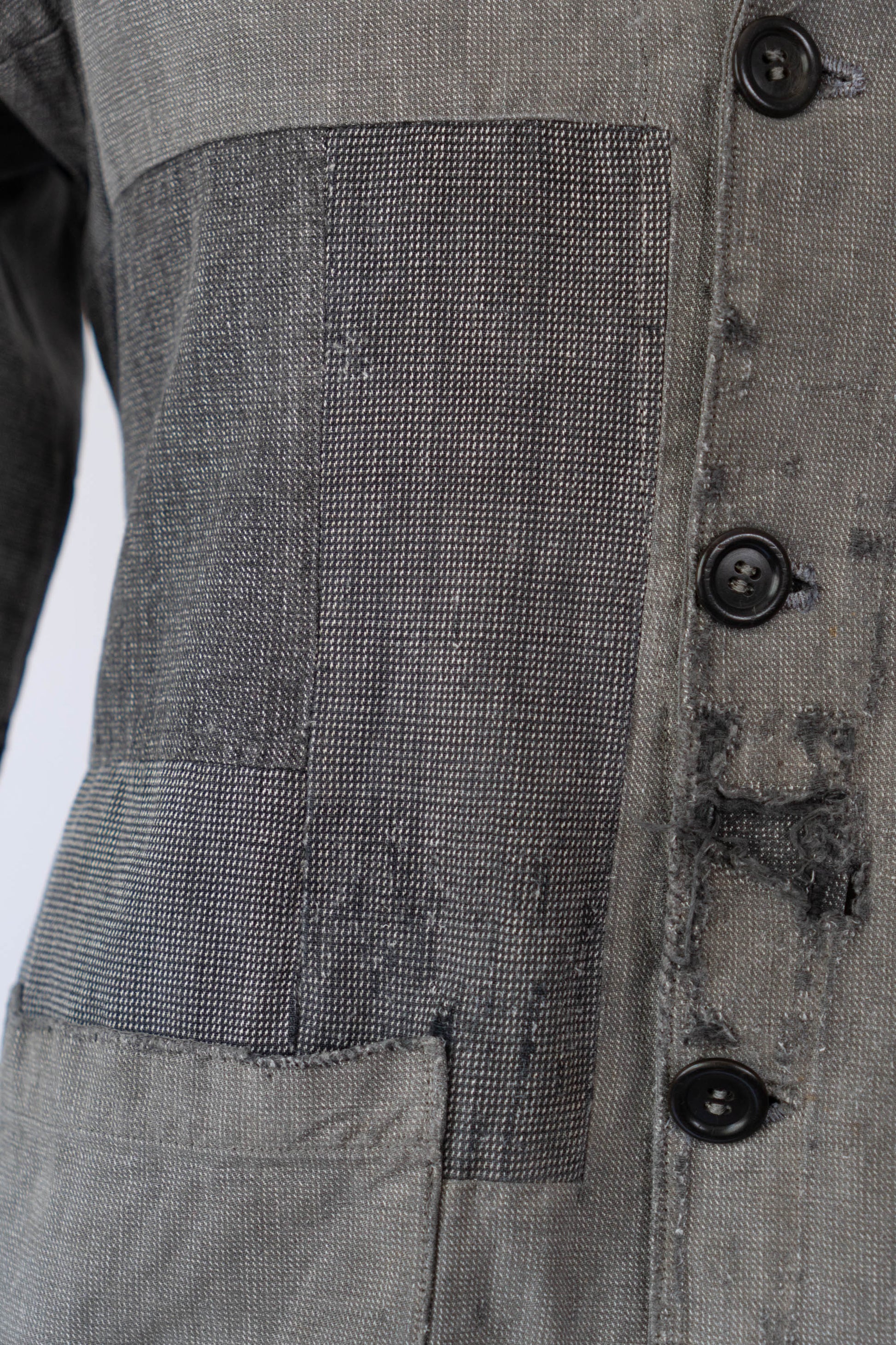 Pendant la Seconde Guerre mondiale, sous le contrôle des ressources, les ateliers et les usines de maintenance français ont principalement utilisé le tissu « Salt & Pepper » (twill marbré tissé en alternant des fils noirs et des fils écru) comme tissu de travail. Alors que l'indigo teint à l'indigo venait à manquer, ce tissu, qui permettait d'utiliser des fils mélangés de coton, était fabriqué pour des usages nécessitant une bonne résistance à l'usure et une faible visibilité des taches d'huile. Cet article est une veste d'atelier qui a probablement été utilisée dans la période de reconstruction après la guerre, à la fin des années 1940. Après avoir été portée, elle a été réparée à plusieurs reprises par son propriétaire à l'aide de patchwork et de reprissage, reflétant ainsi la culture « boro » transmise de génération en génération en France, c'est-à-dire l'esprit « réparer pour continuer à porter ».