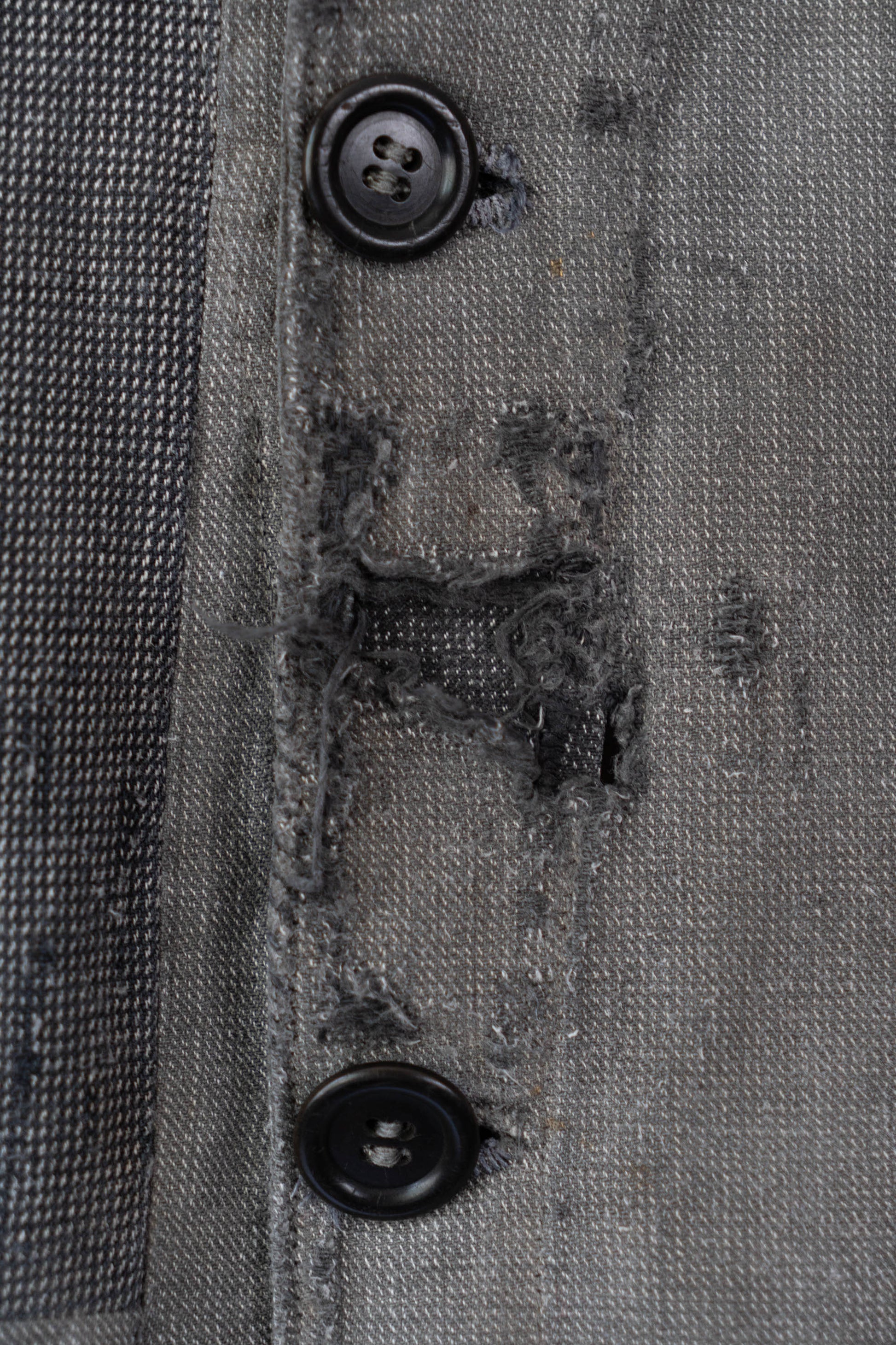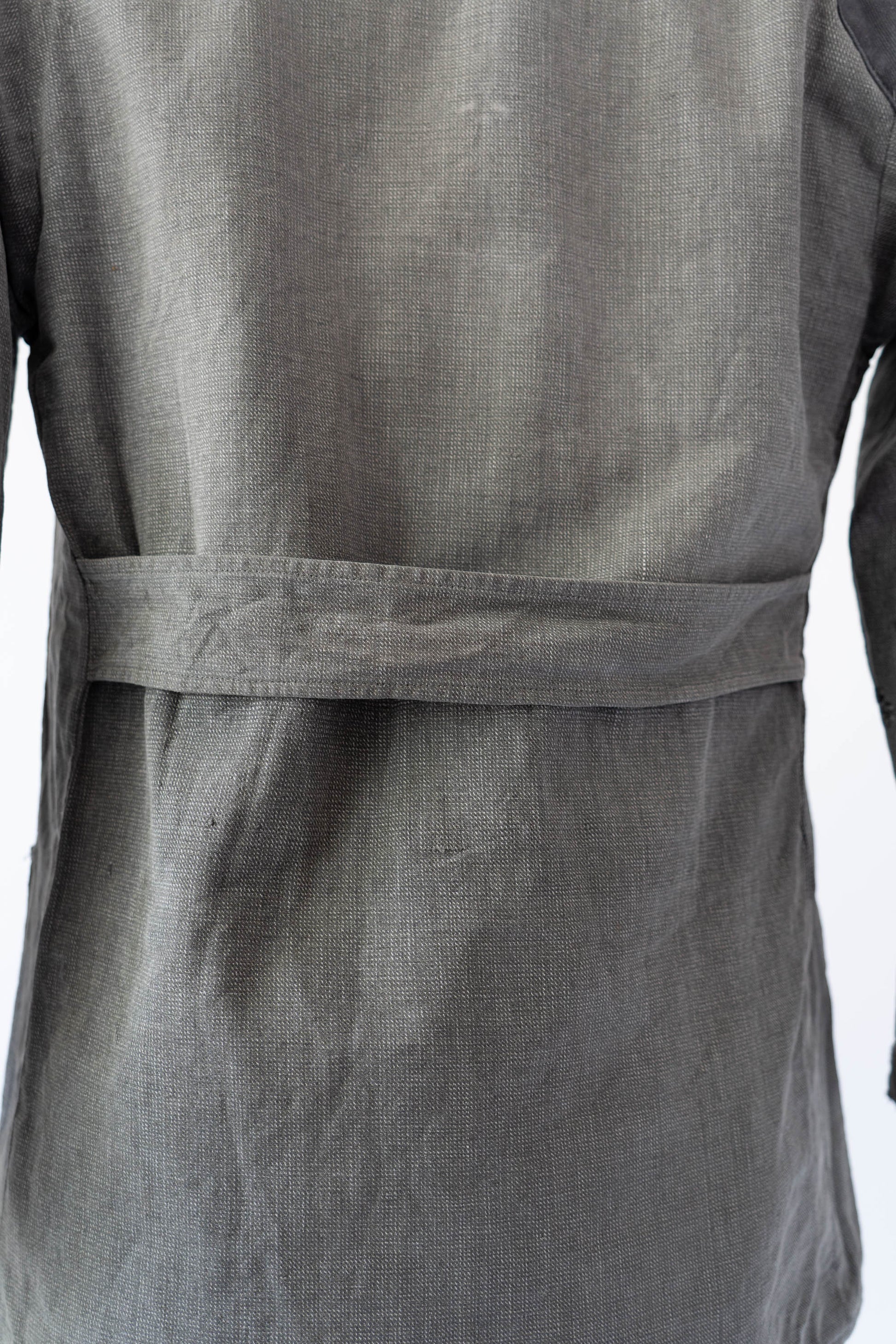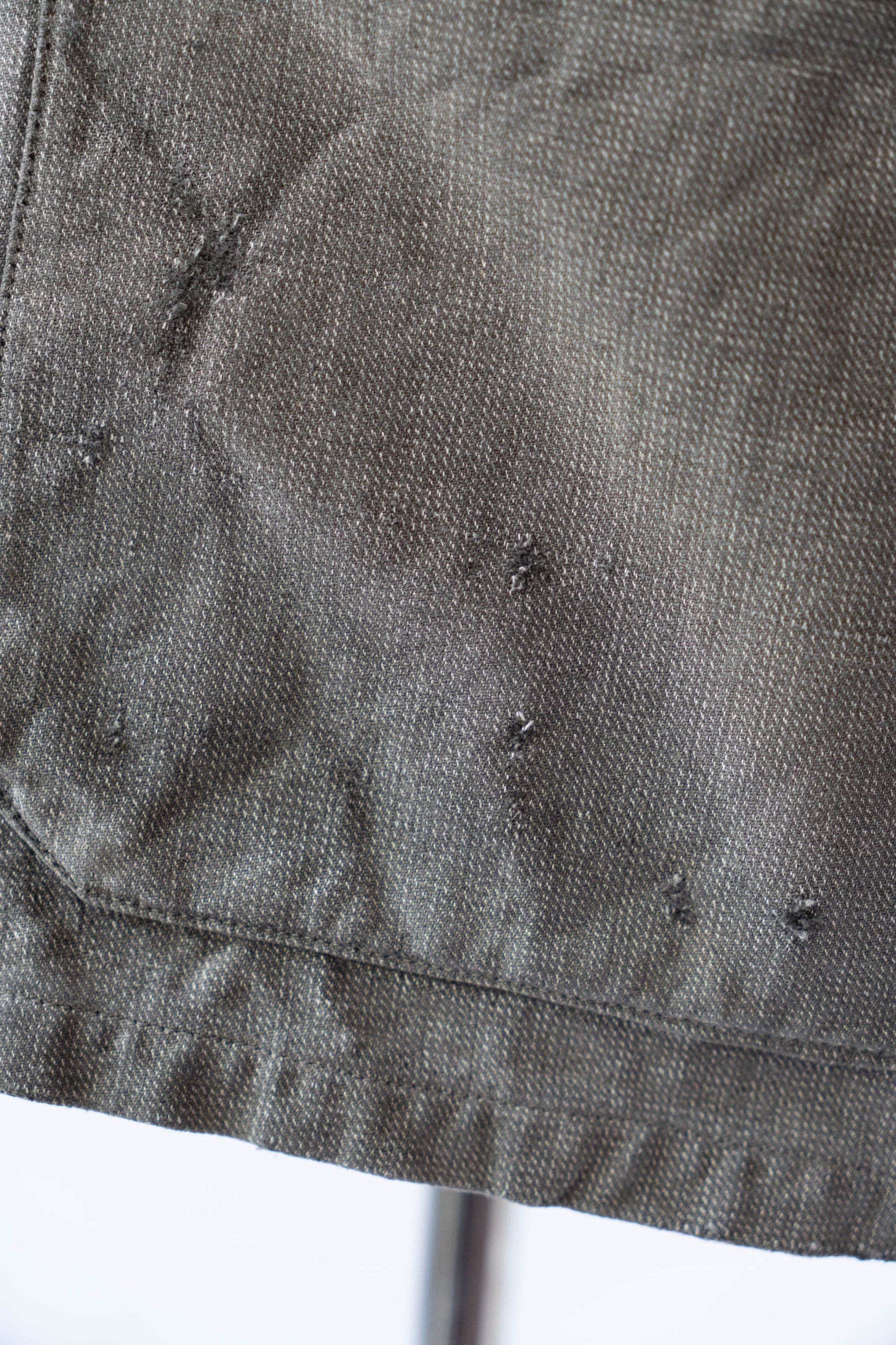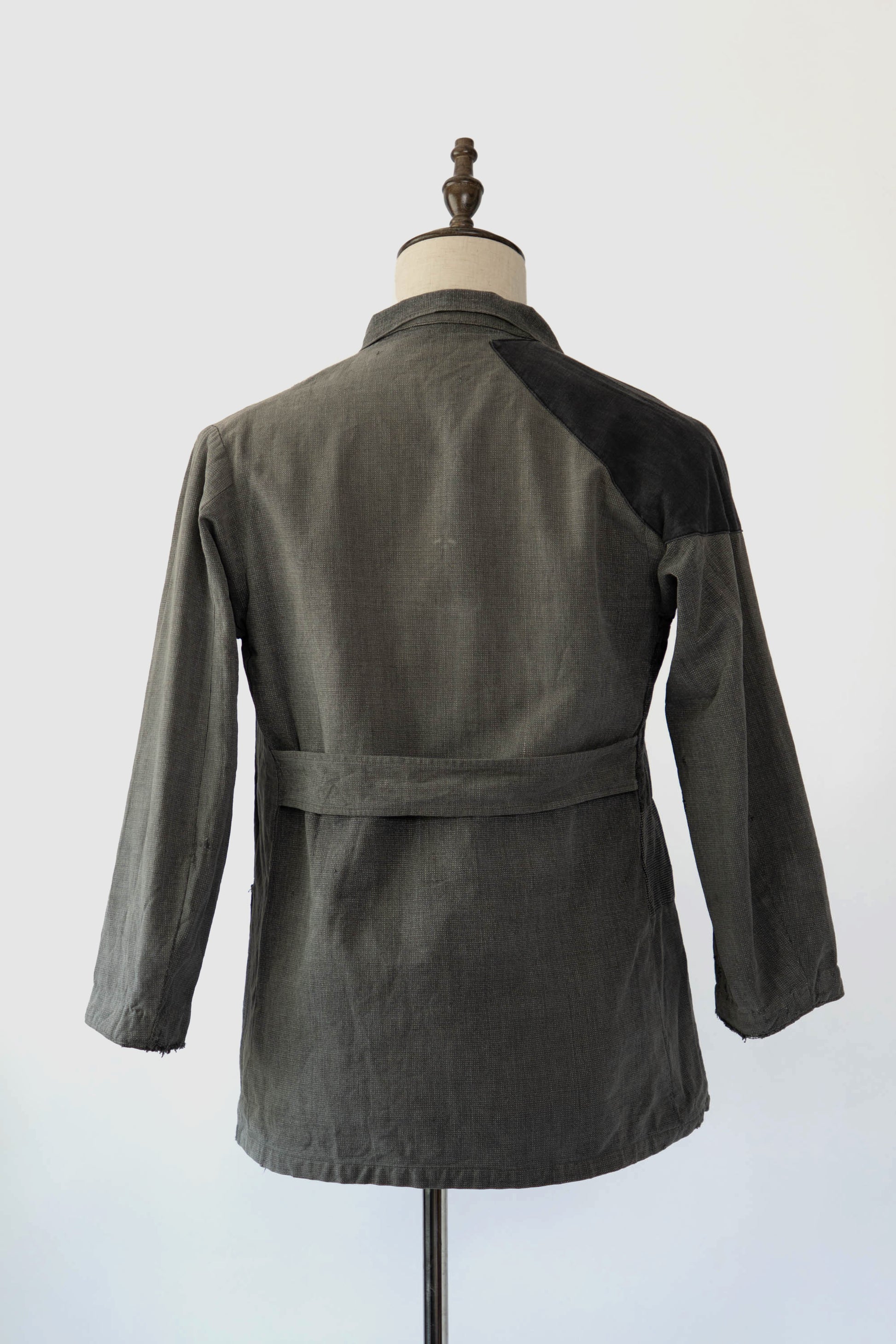 Les poignets ont été coupés et raccourcis à environ trois quarts. Il s'agit d'une modification pratique couramment effectuée à l'époque pour éviter les étincelles et les huiles de machine, ou pour améliorer le confort de travail en été. Le dos est doté d'une couture centrale et d'un marteau étroit. De plus, des pièces de renfort en twill noir uni ou à motif en chevrons ont été ajoutées aux endroits abîmés, et les boutonnières et les zones où le tissu s'est usé ont été renforcées à la main. Les réparations effectuées au fil des ans ont donné à ce vêtement un aspect unique.