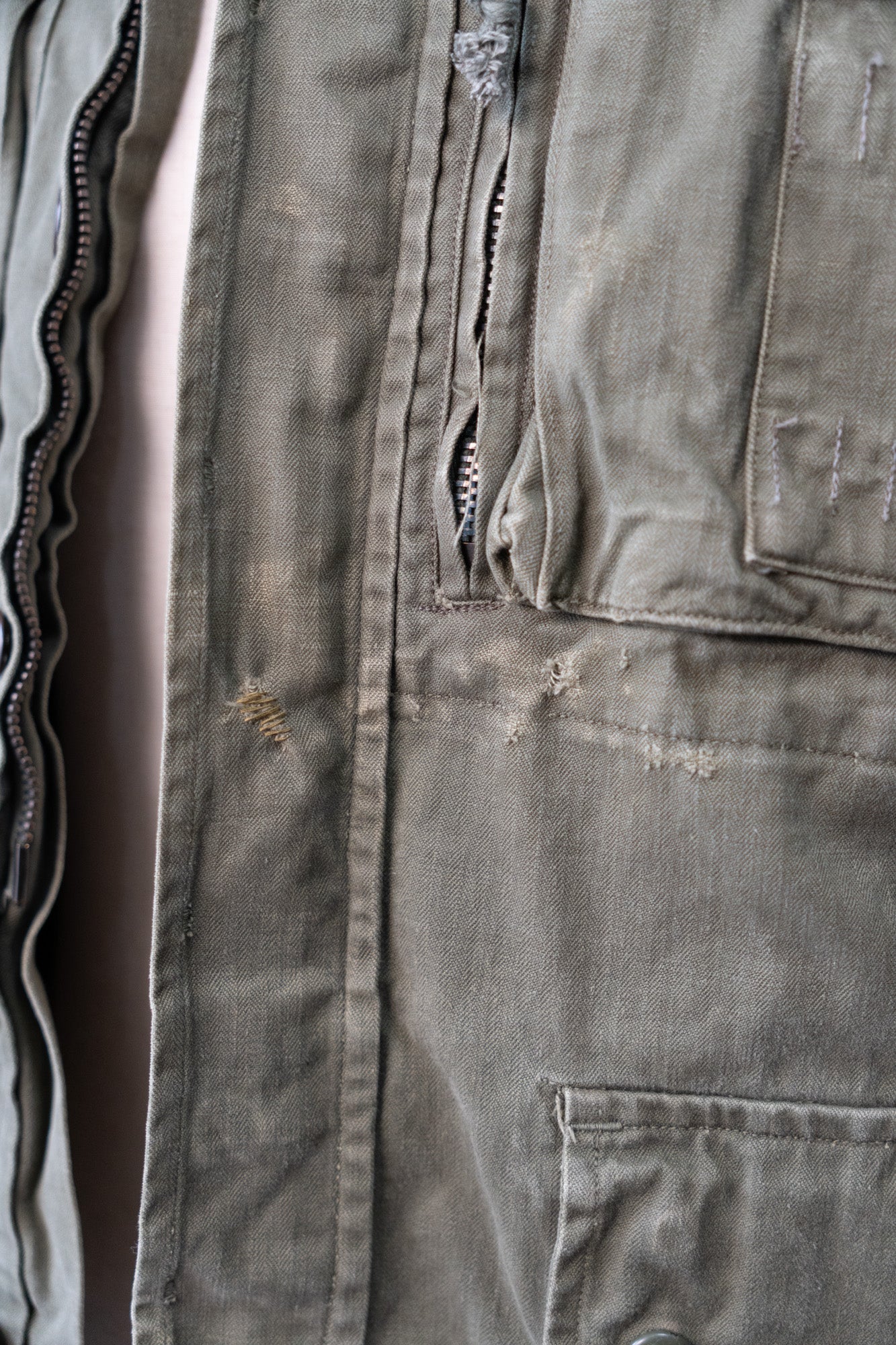 La couleur est olive foncé. Quatre grandes poches à rabat sont disposées sur le devant, avec trois boutons-pression. Bien que son design soit imposant, cette veste est un élément central de votre style lorsque vous la portez. Le patron est conçu avec une coupe tridimensionnelle qui tient compte de la mobilité des troupes aéroportées lors des sauts, avec une largeur de poitrine et une largeur d'épaules plus importantes. Le dos est en maille côtelée et des boutons-pression sont fixés à l'ourlet. Les manches et le devant présentent des dommages, ainsi que des boutons fissurés, mais aucun dommage important n'empêche de porter le vêtement.