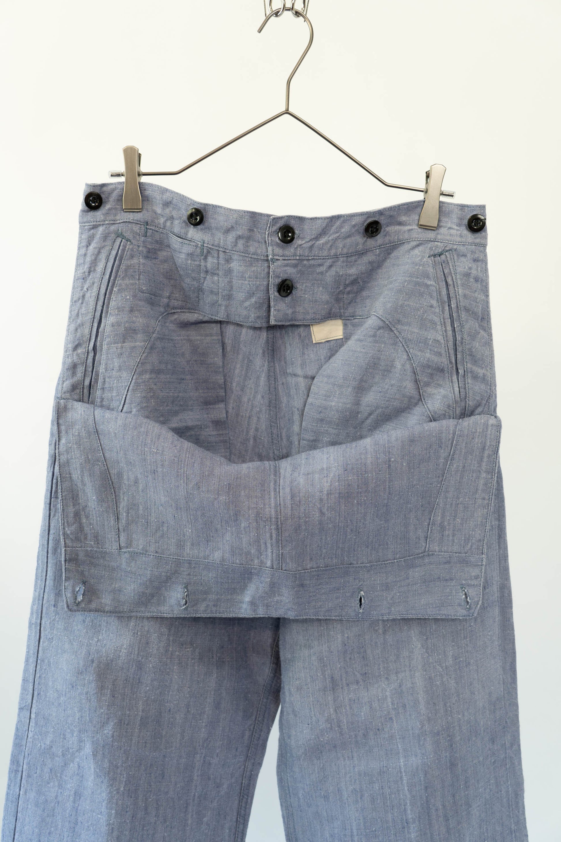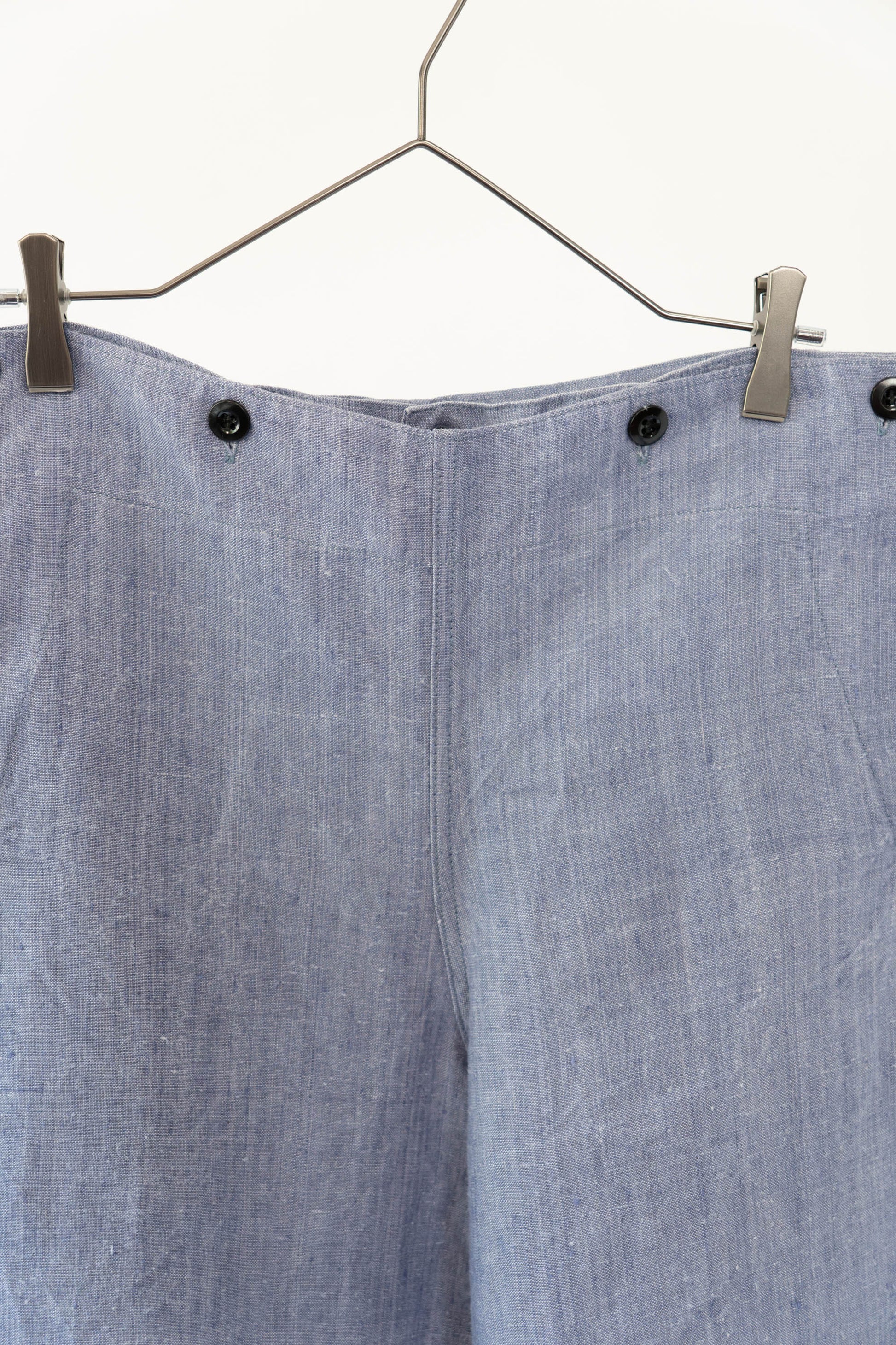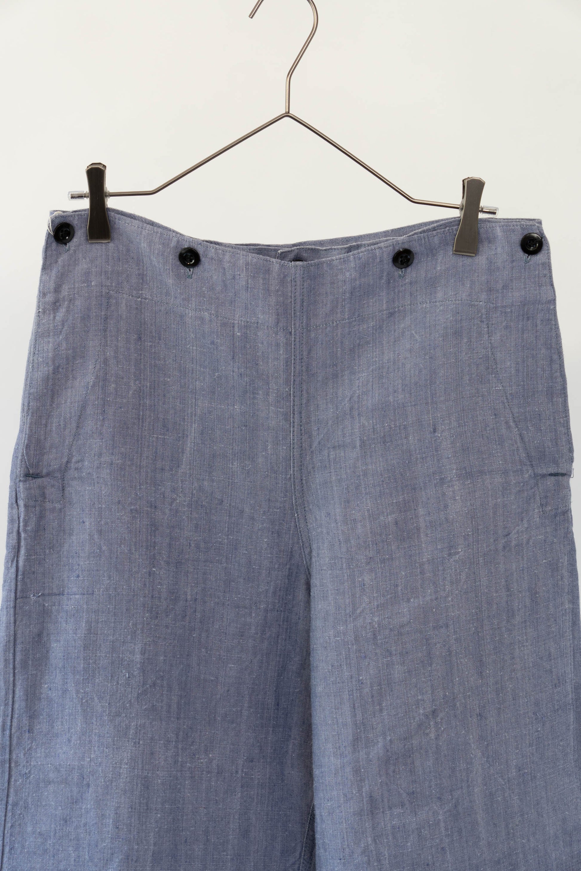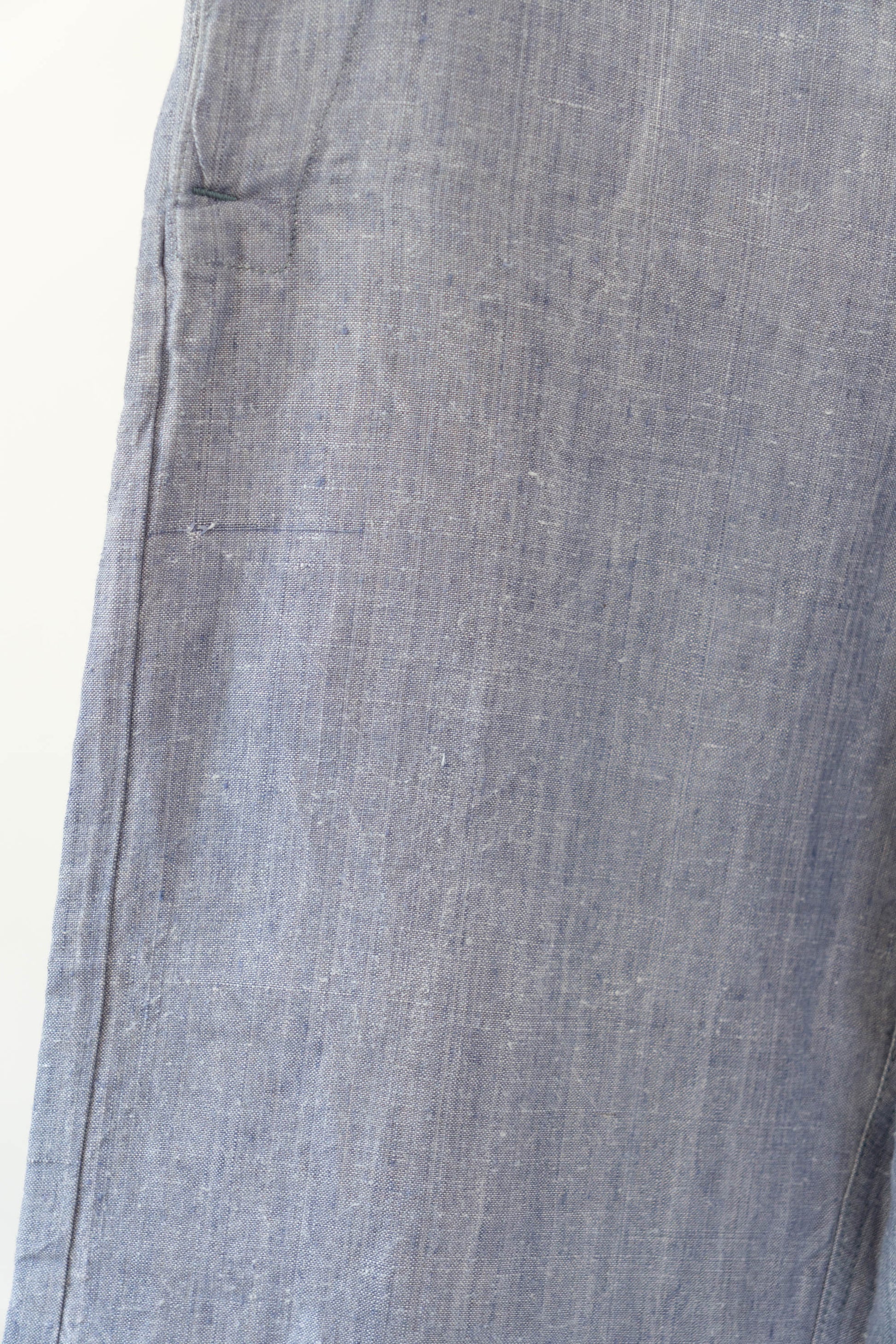 Sa principale caractéristique est l'utilisation de lin ramie, un tissu léger, qui sèche rapidement et résiste bien au sel. La taille est haute, les passants de ceinture sont placés uniquement à l'arrière et des boutons pour bretelles sont disposés autour de la taille pour un look épuré. La braguette à boutons, les poches latérales profondes et la silhouette droite et large tombant droit vers l'ourlet sont un design qui correspondait parfaitement à la fonctionnalité de l'époque et à la mode actuelle. Ce pantalon polyvalent s'accorde facilement avec des sandales en cuir, des vestes ou des t-shirts simples.