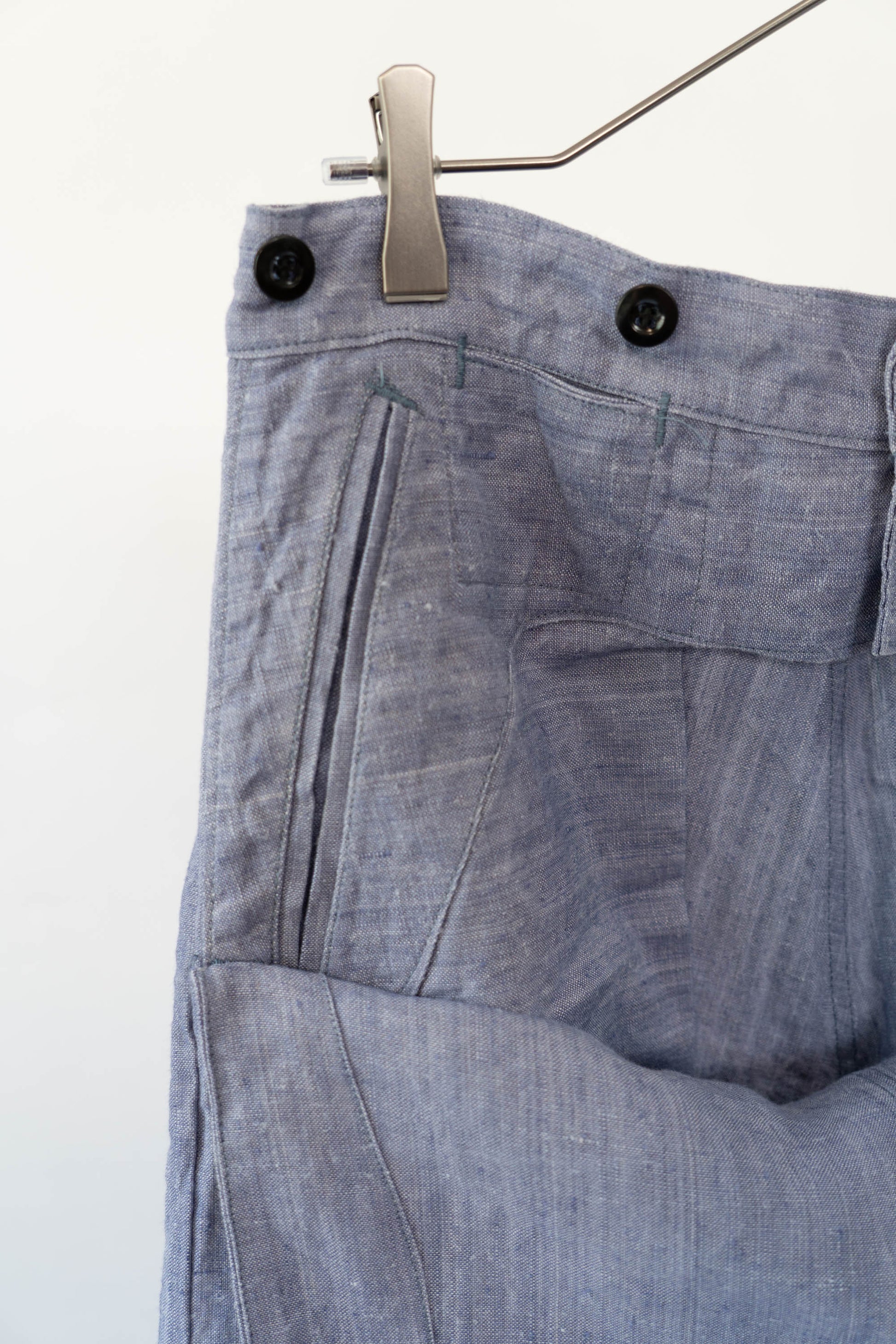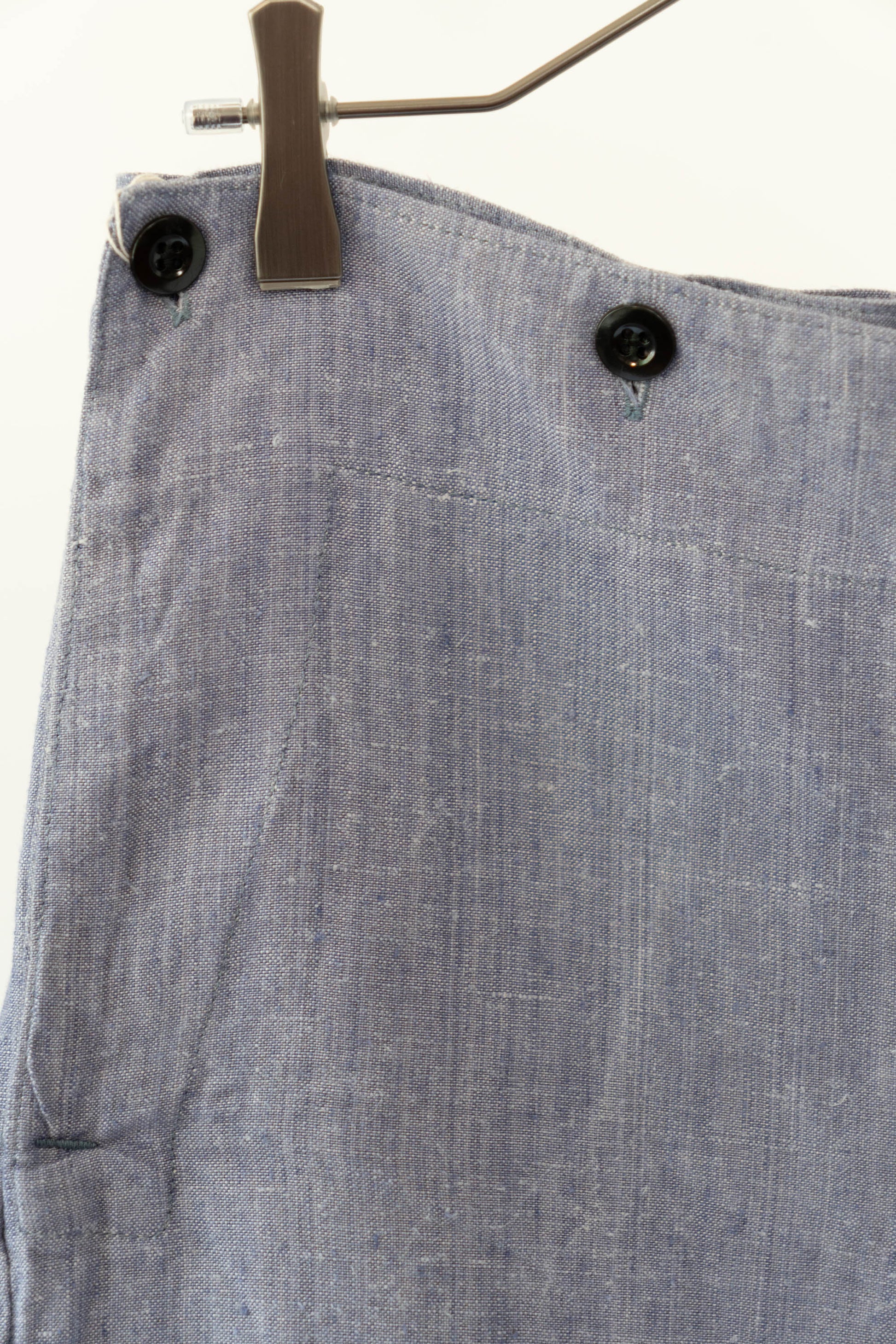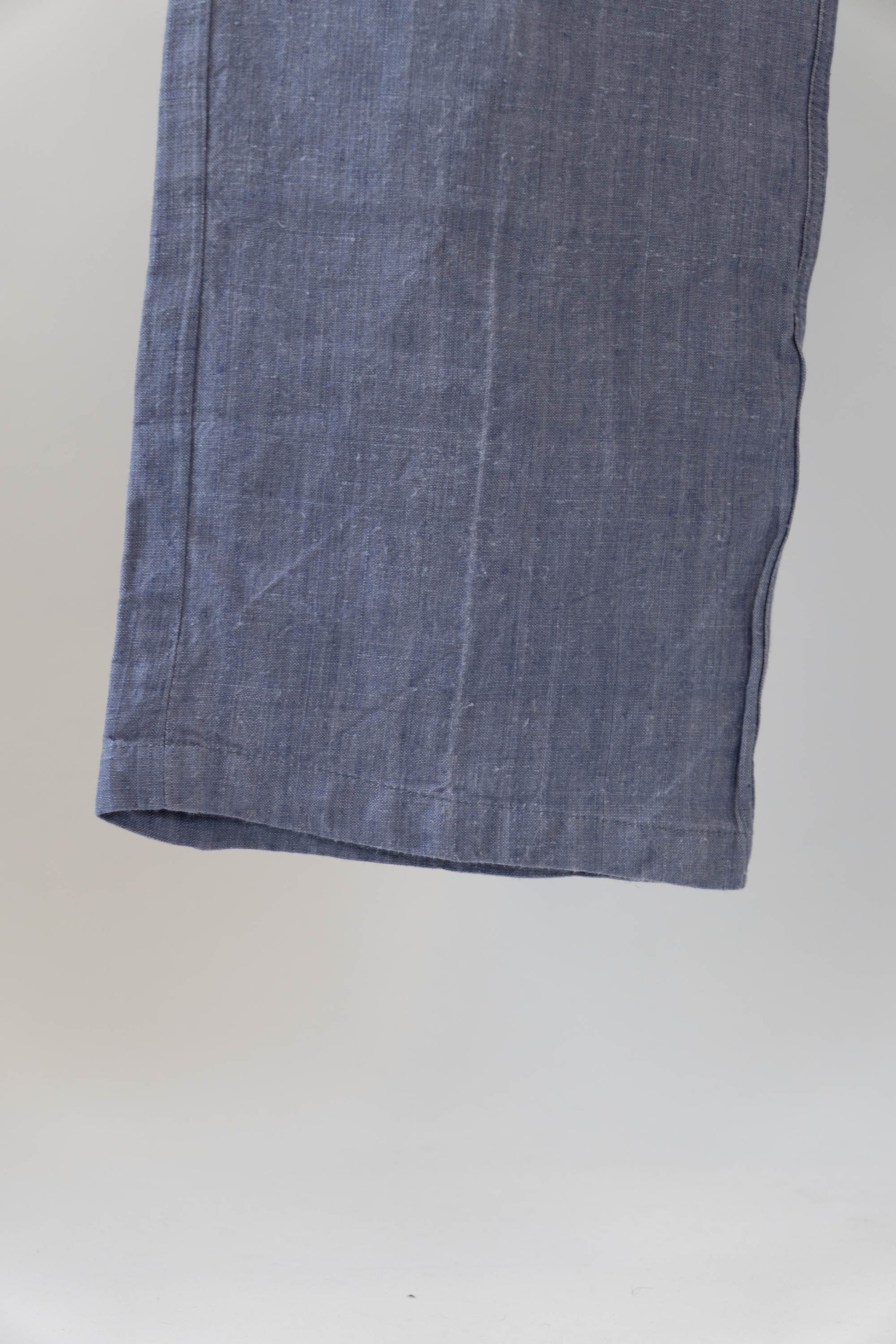 Sa principale caractéristique est l'utilisation de lin ramie, un tissu léger, qui sèche rapidement et résiste bien au sel. La taille est haute, les passants de ceinture sont placés uniquement à l'arrière et des boutons pour bretelles sont disposés autour de la taille pour un look épuré. La braguette à boutons, les poches latérales profondes et la silhouette droite et large tombant droit vers l'ourlet sont un design qui correspondait parfaitement à la fonctionnalité de l'époque et à la mode actuelle. Ce pantalon polyvalent s'accorde facilement avec des sandales en cuir, des vestes ou des t-shirts simples.