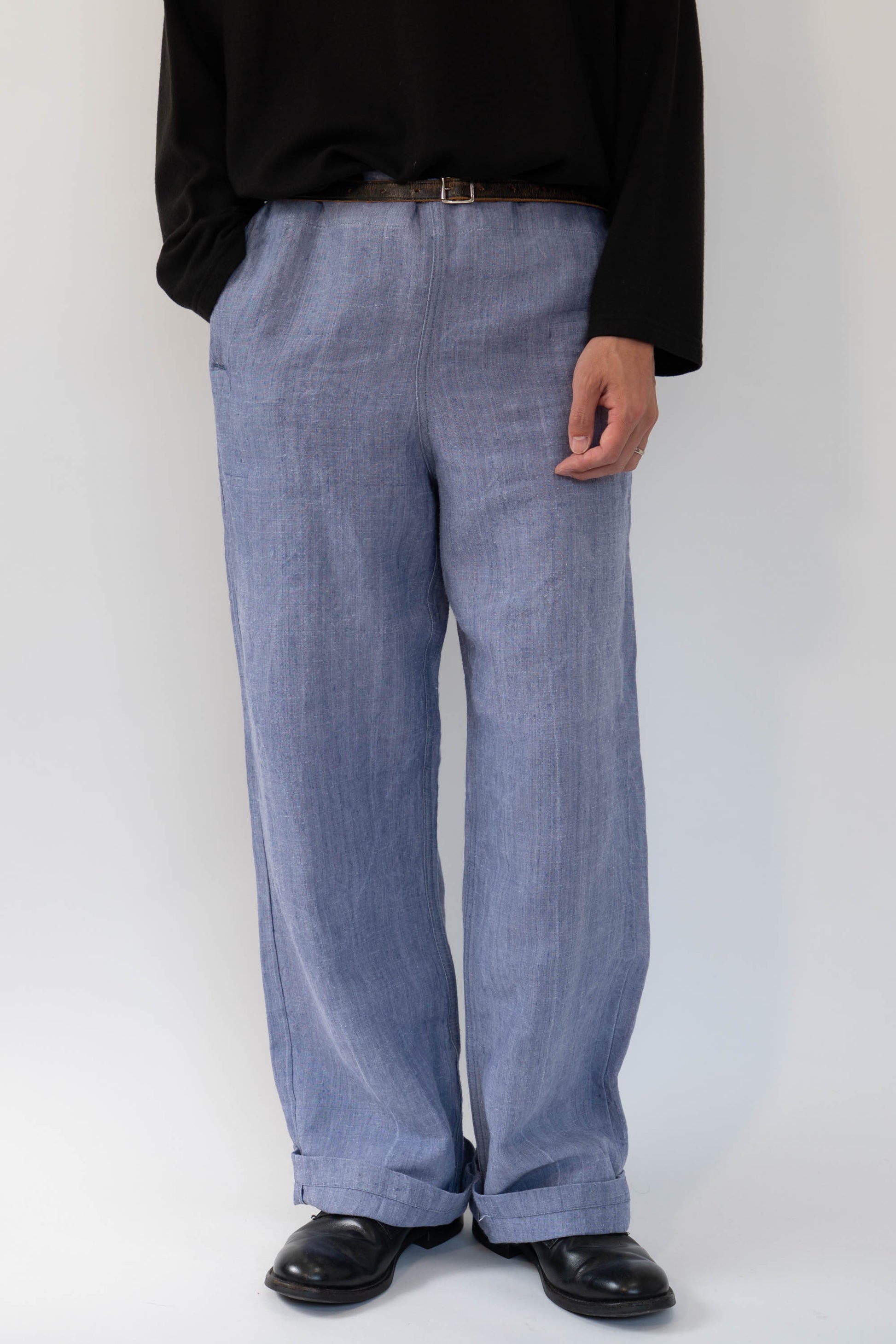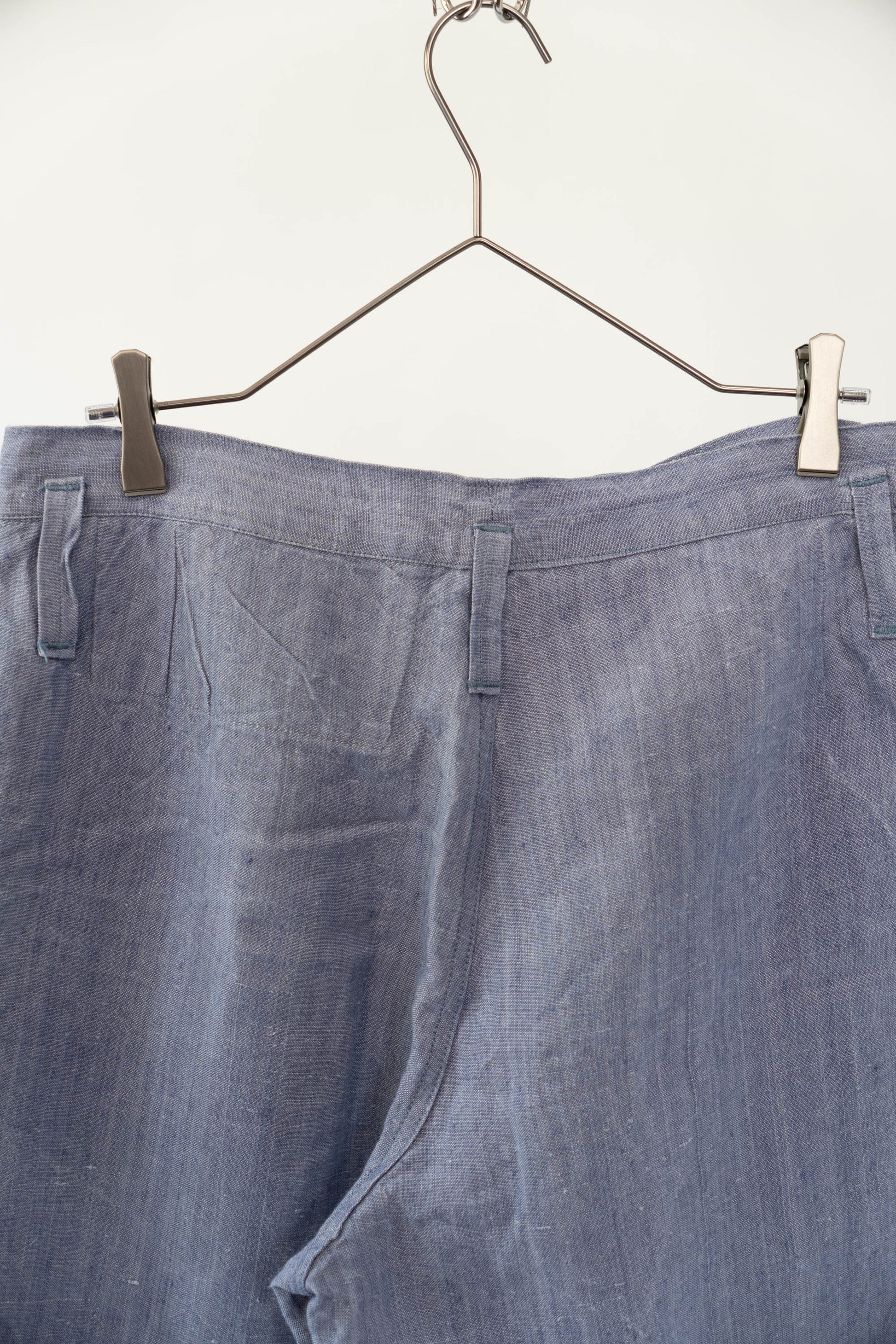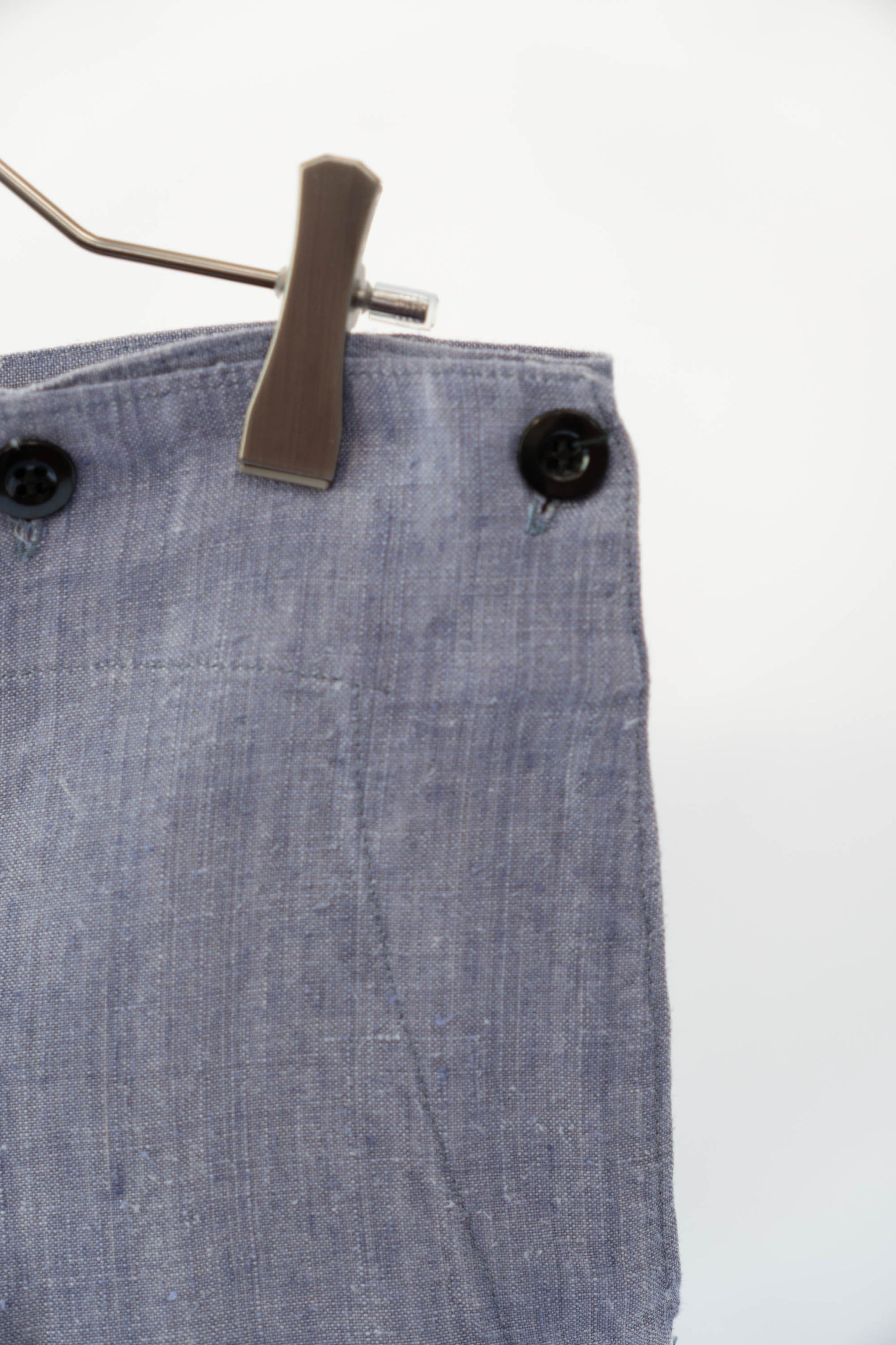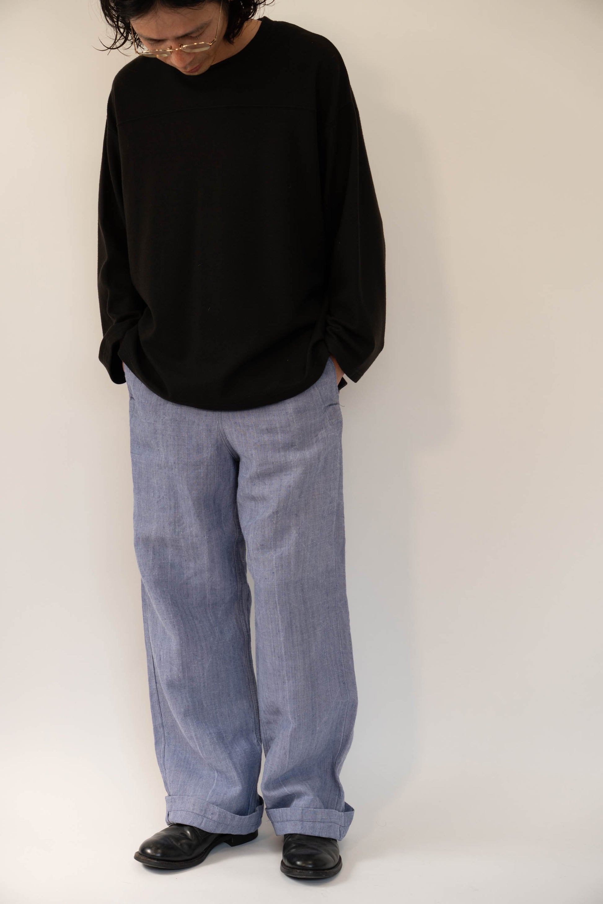 Sa principale caractéristique est l'utilisation de lin ramie, un tissu léger, qui sèche rapidement et résiste bien au sel. La taille est haute, les passants de ceinture sont placés uniquement à l'arrière et des boutons pour bretelles sont disposés autour de la taille pour un look épuré. La braguette à boutons, les poches latérales profondes et la silhouette droite et large tombant droit vers l'ourlet sont un design qui correspondait parfaitement à la fonctionnalité de l'époque et à la mode actuelle. Ce pantalon polyvalent s'accorde facilement avec des sandales en cuir, des vestes ou des t-shirts simples.