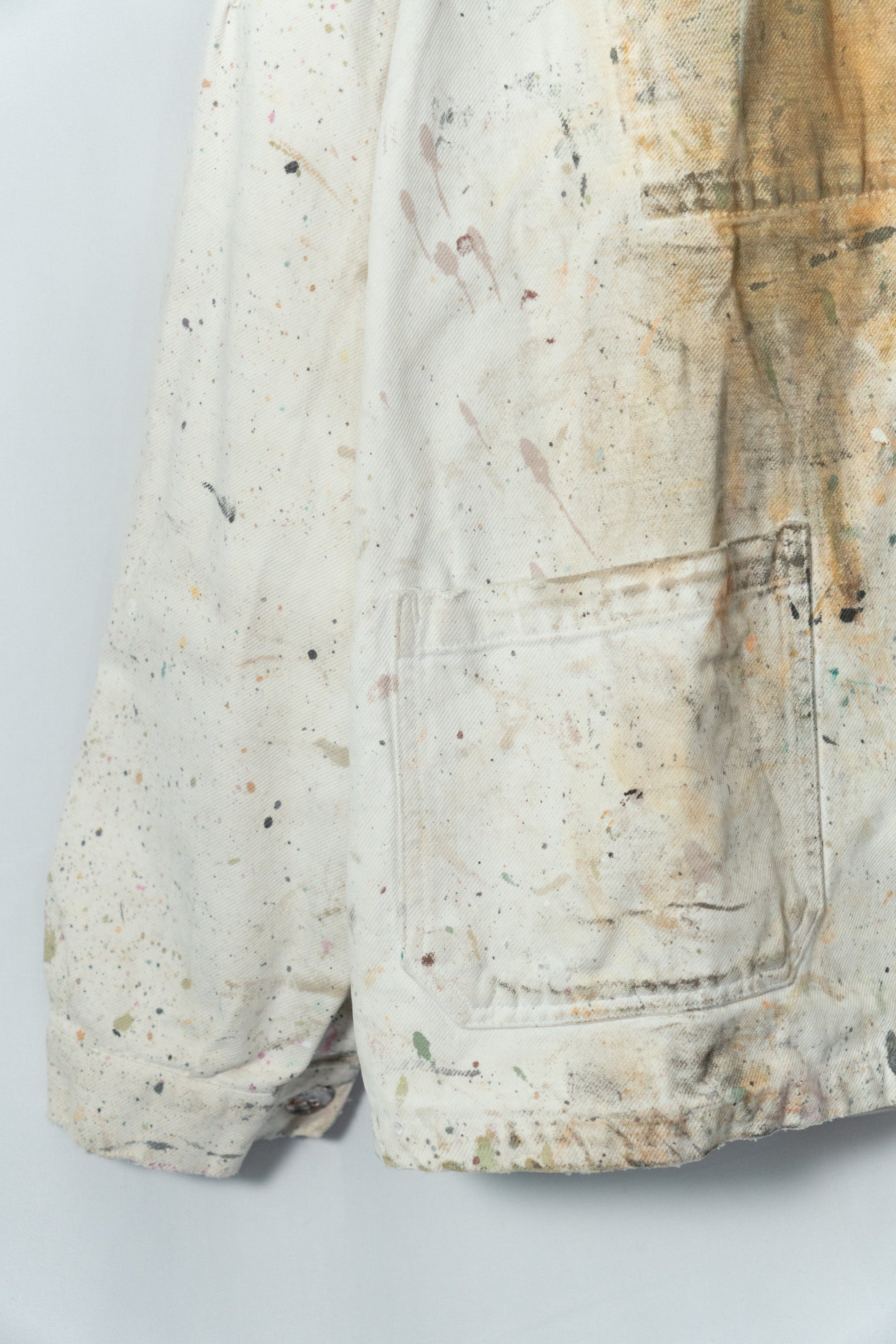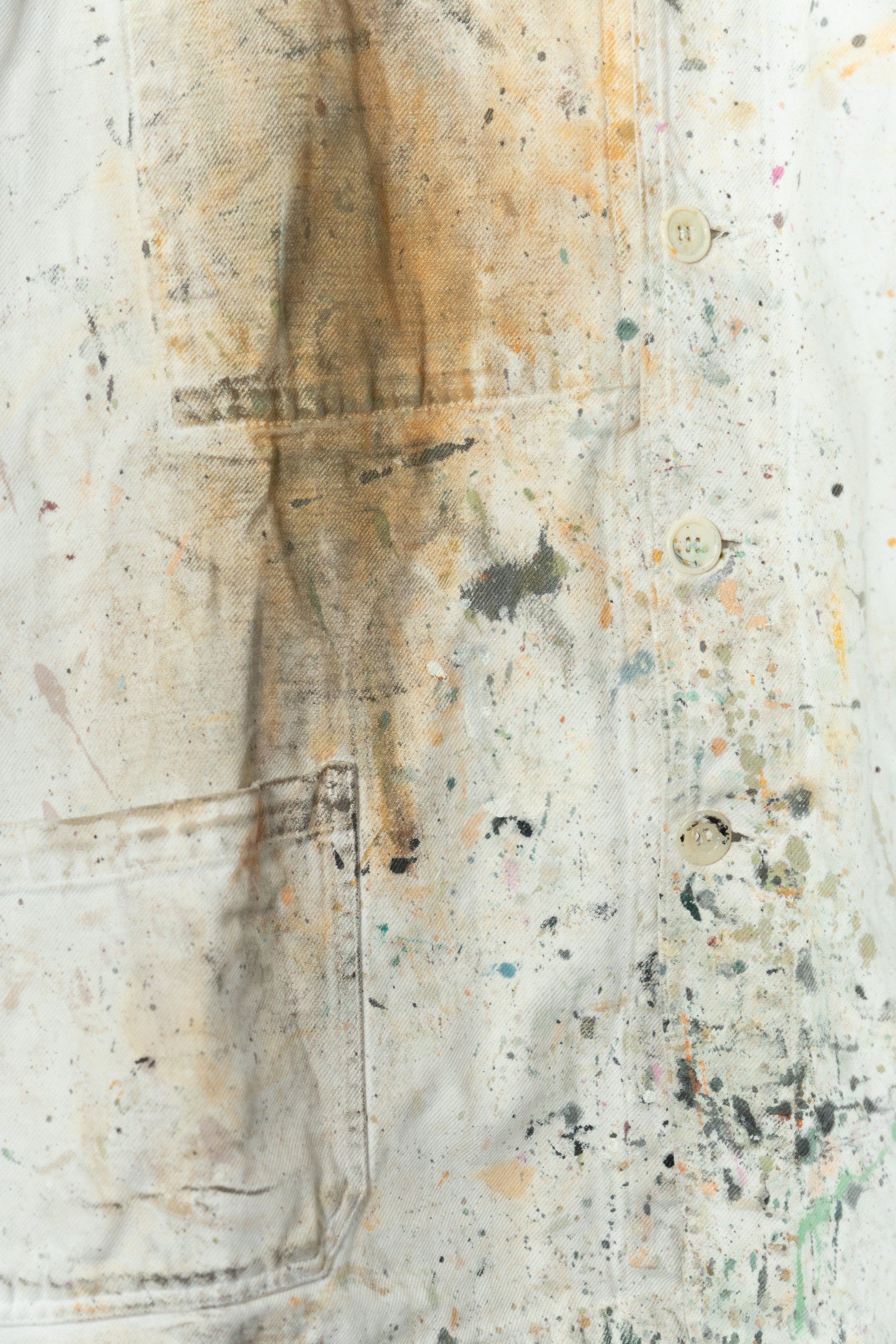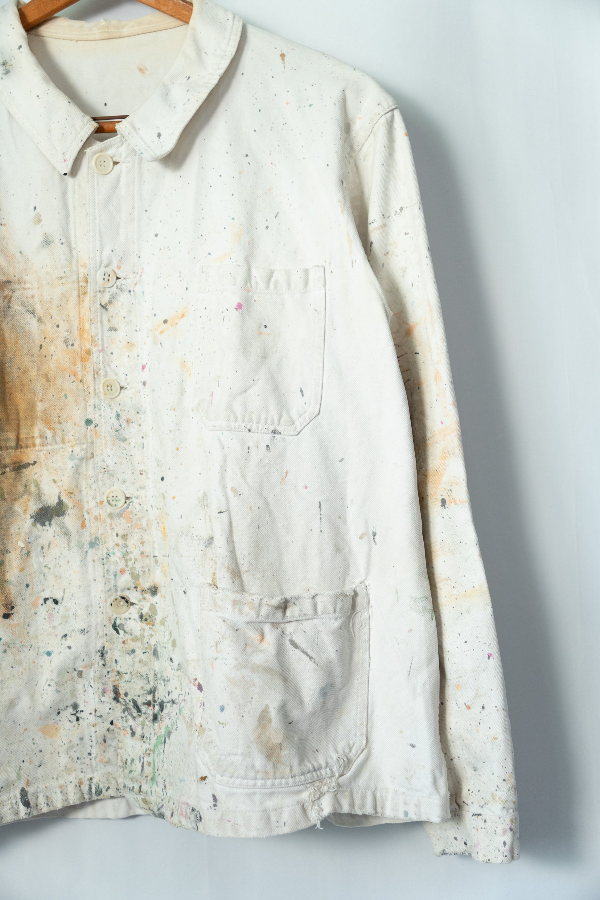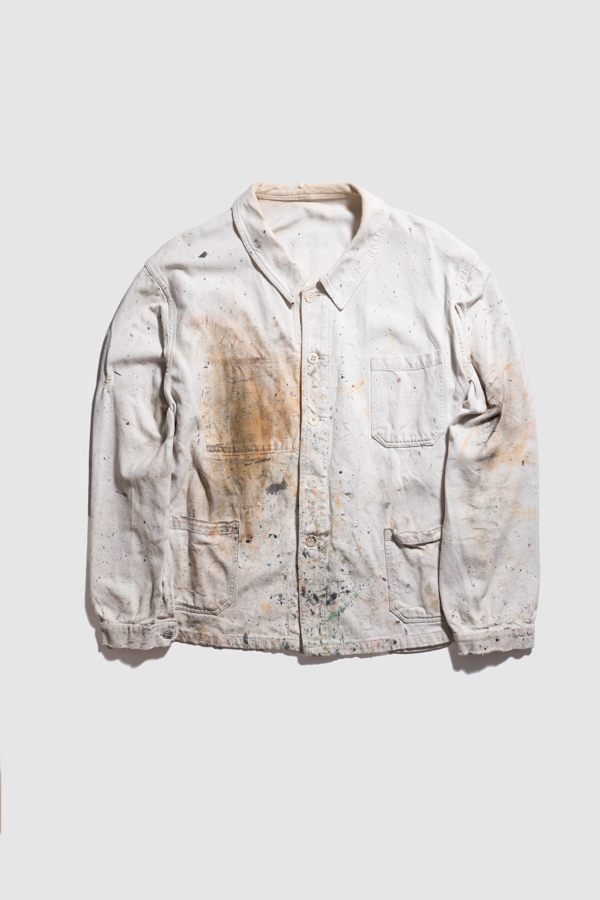 Ce n'est pas un article très ancien, mais son aspect peint est superbe. Il s'agit d'un vêtement de travail qui a probablement été porté par des peintres et des artisans français.Il dégage une aura indescriptible.