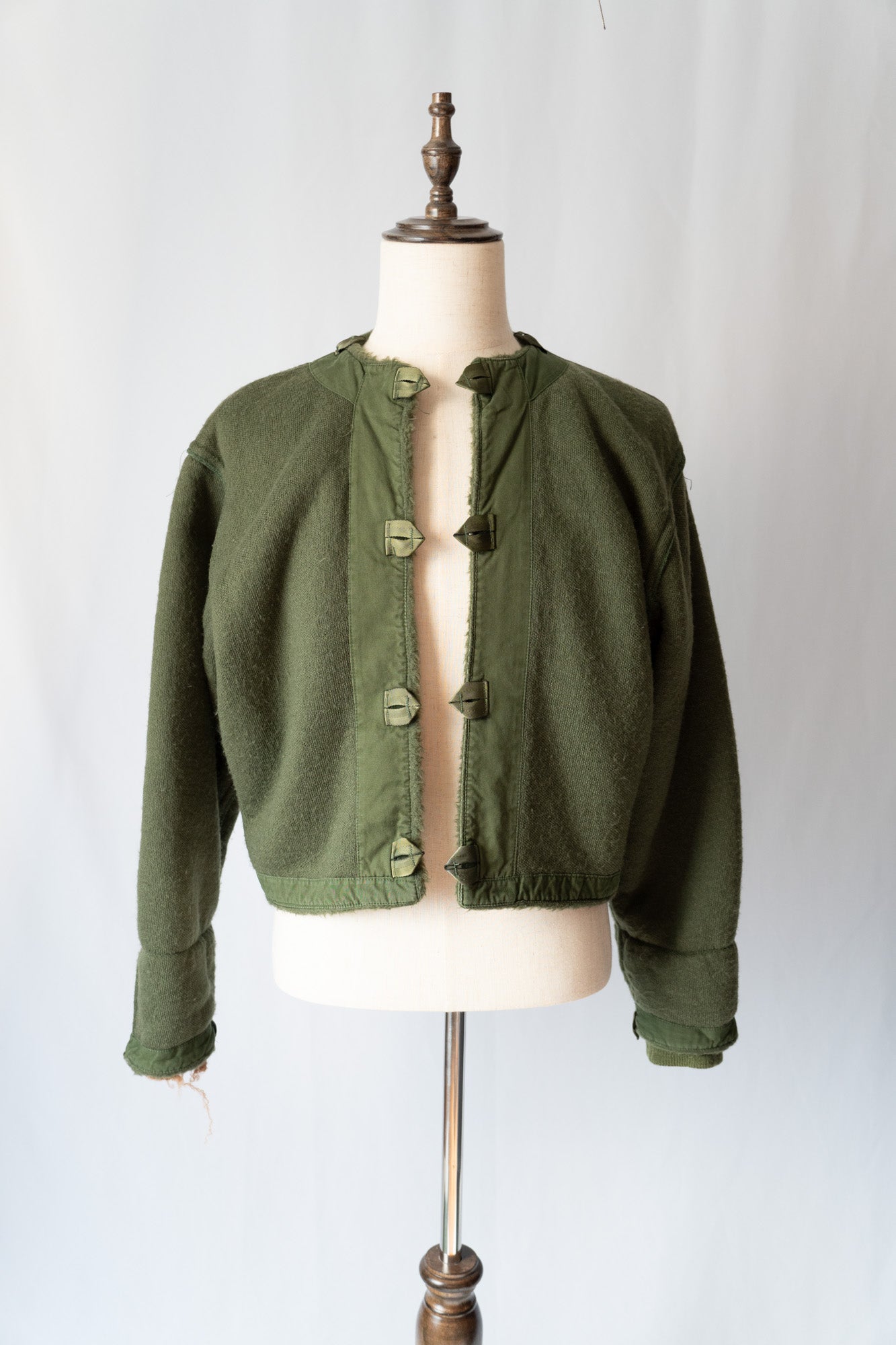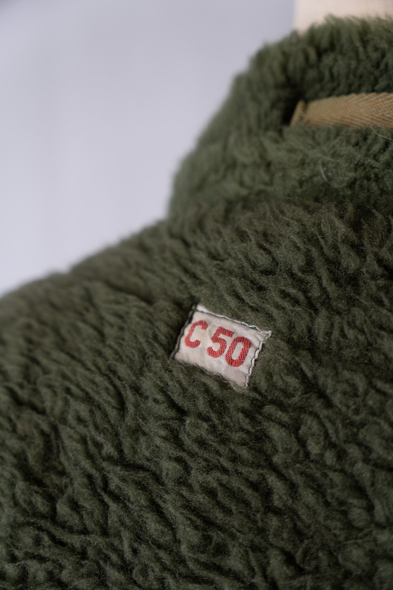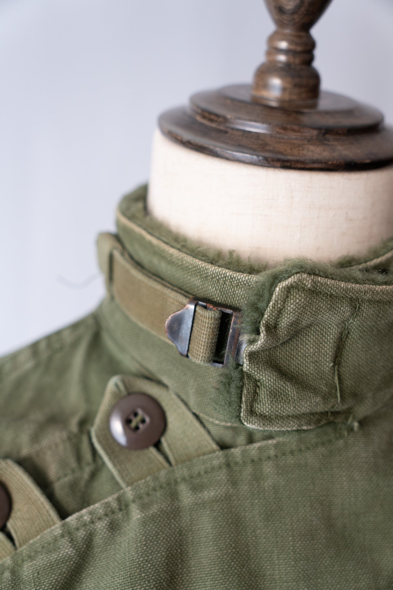 Le tissu est en toile de coton et comprend une doublure amovible en boa. L'une des côtes des manches est manquante, mais cela n'affecte en rien le port du vêtement. Conçue pour être utilisée dans les régions froides de Suède, elle offre d'excellentes propriétés thermiques. De plus, en retirant la doublure, elle peut être portée au printemps et à l'automne. Comparée au modèle en cuir précédent, elle peut être portée pendant une période beaucoup plus longue et est très pratique.