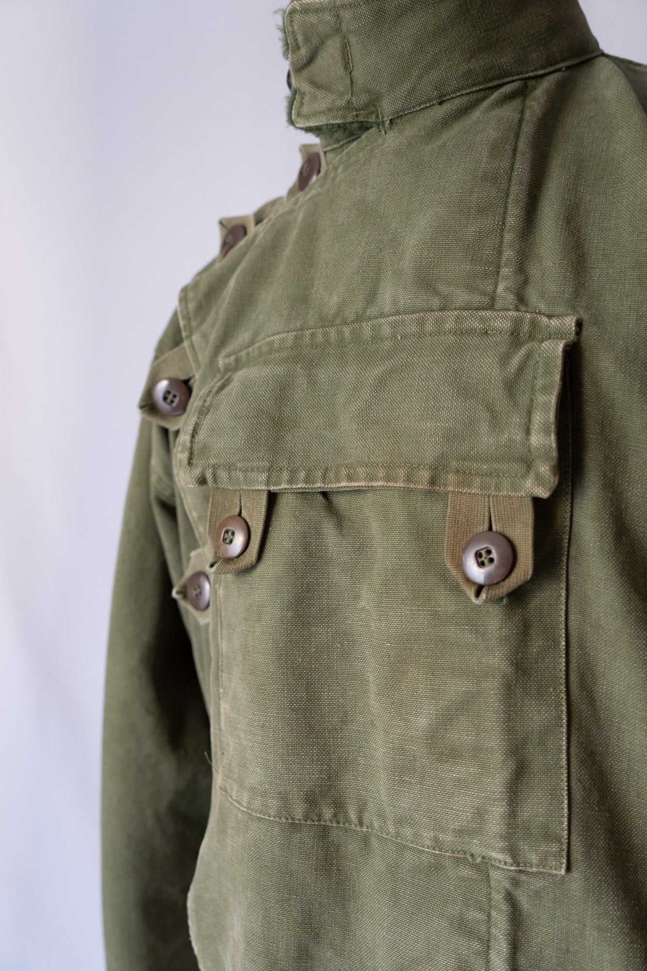 Il s'agit d'une veste historique emblématique qui aurait été portée par les unités motorisées de l'armée suédoise. Cette veste à double boutonnage avec boutons à boucle comporte de nombreux détails pratiques, tels qu'une poche cartographique à l'avant, une ceinture à la taille et une jugulaire.