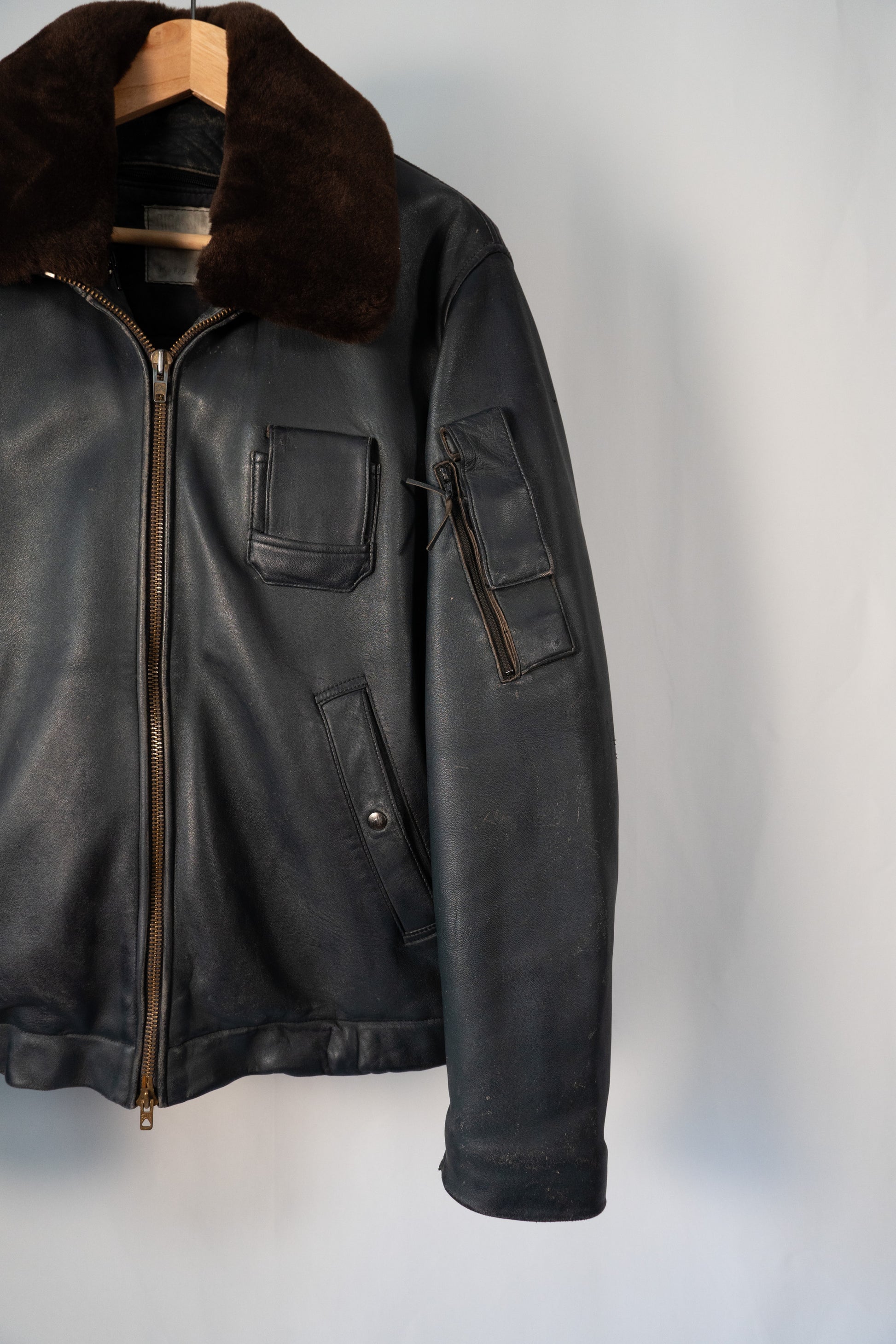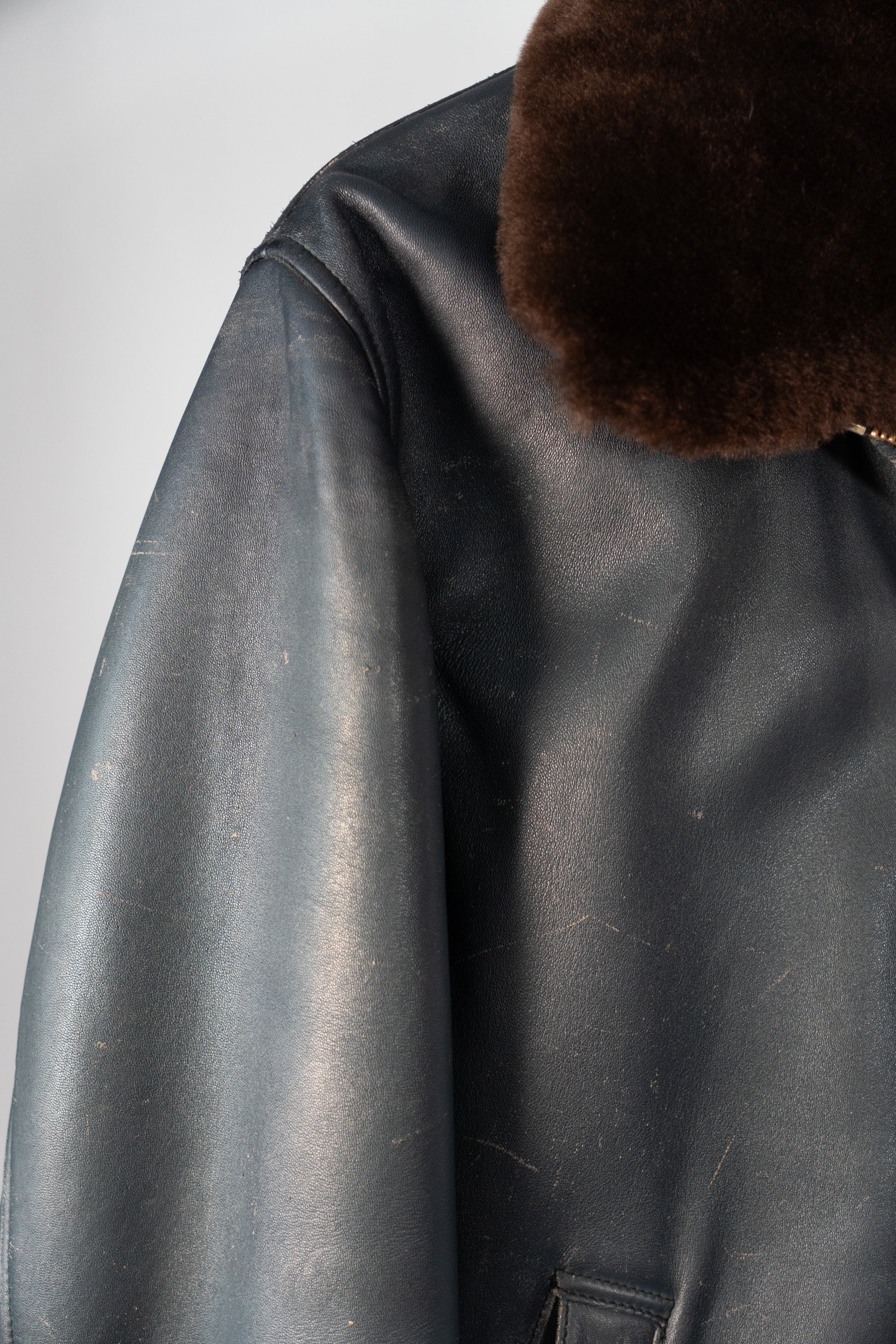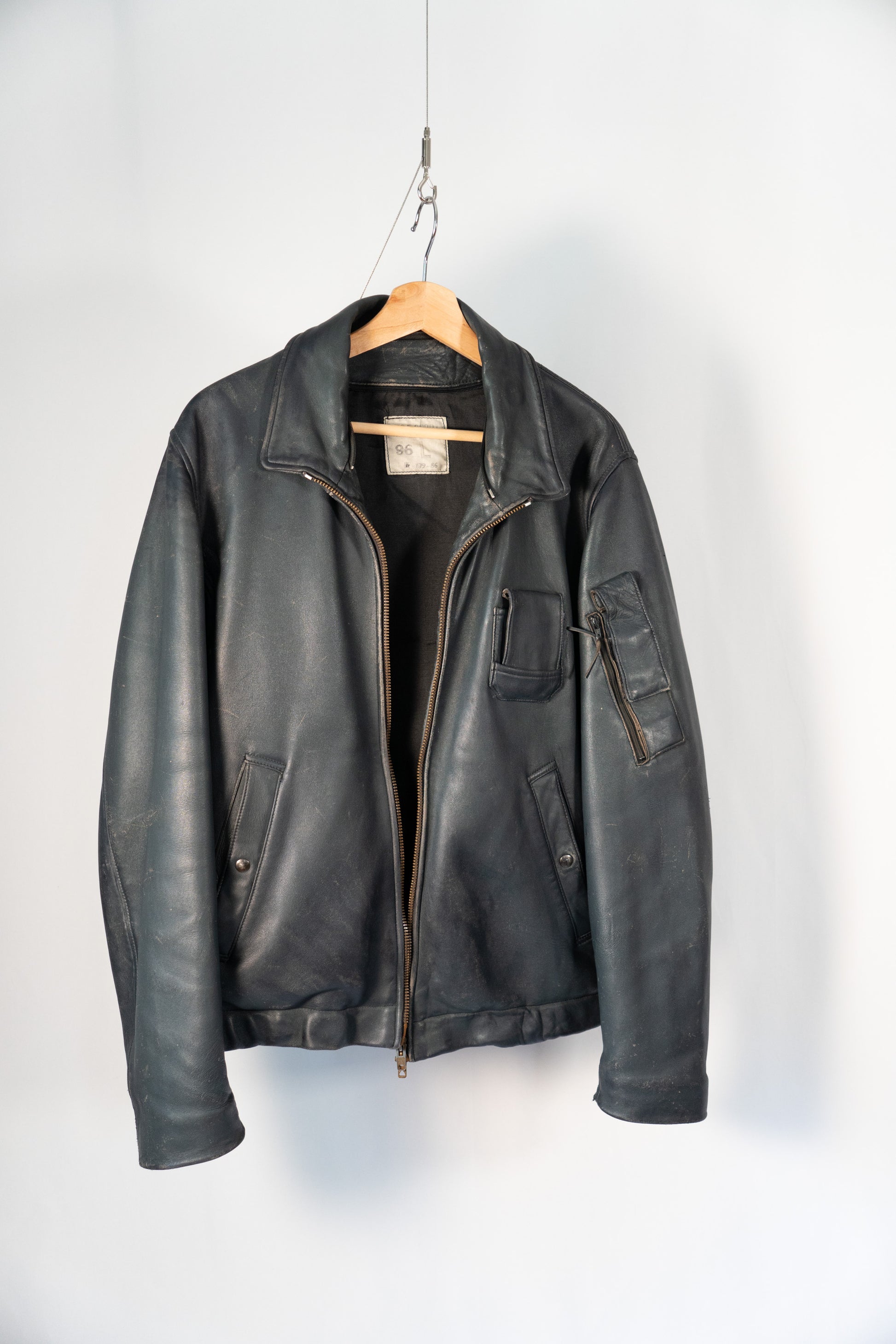 D'un bleu marine profond impressionnant, cette pièce est confectionnée en cuir de mouton souple et épais qui épouse parfaitement les formes du corps. Elle est dotée d'un rabat à velcro sur la poitrine gauche, conçu pour y apposer un insigne de grade.