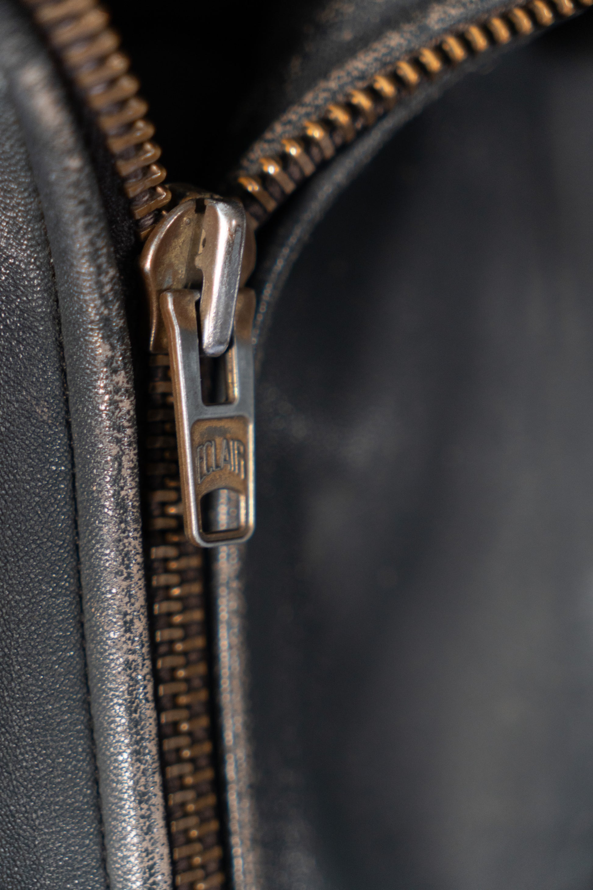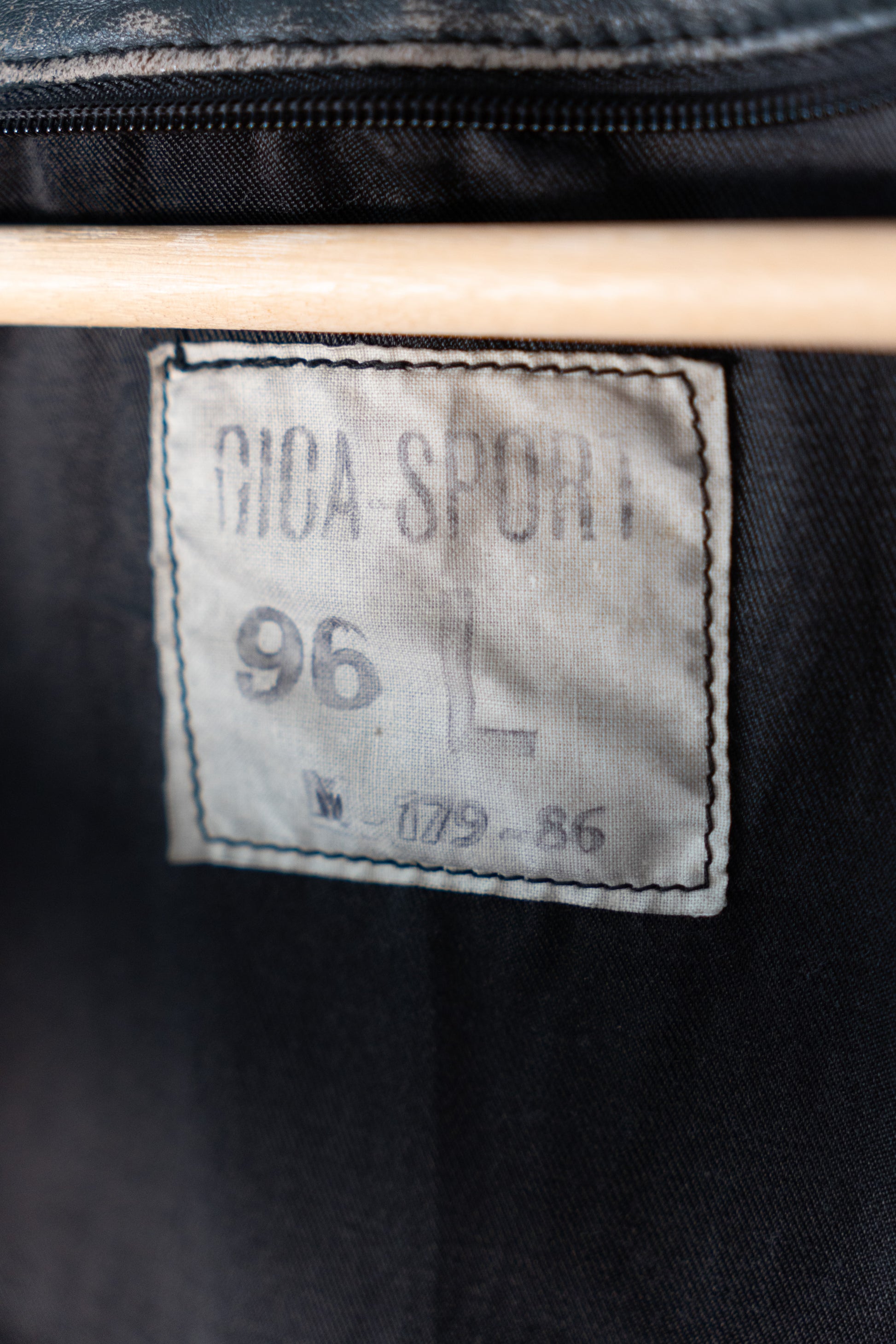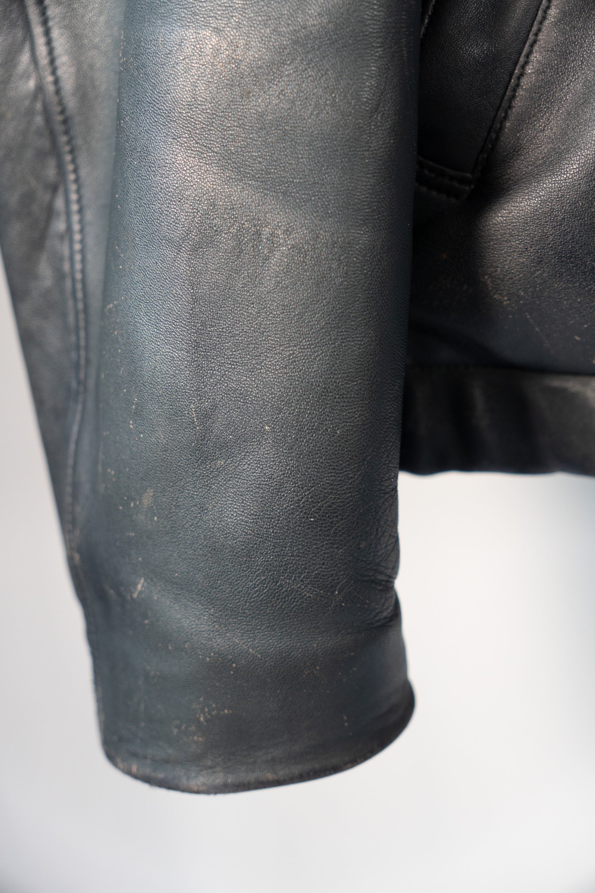 D'un bleu marine profond impressionnant, cette pièce est confectionnée en cuir de mouton souple et épais qui épouse parfaitement les formes du corps. Elle est dotée d'un rabat à velcro sur la poitrine gauche, conçu pour y apposer un insigne de grade.