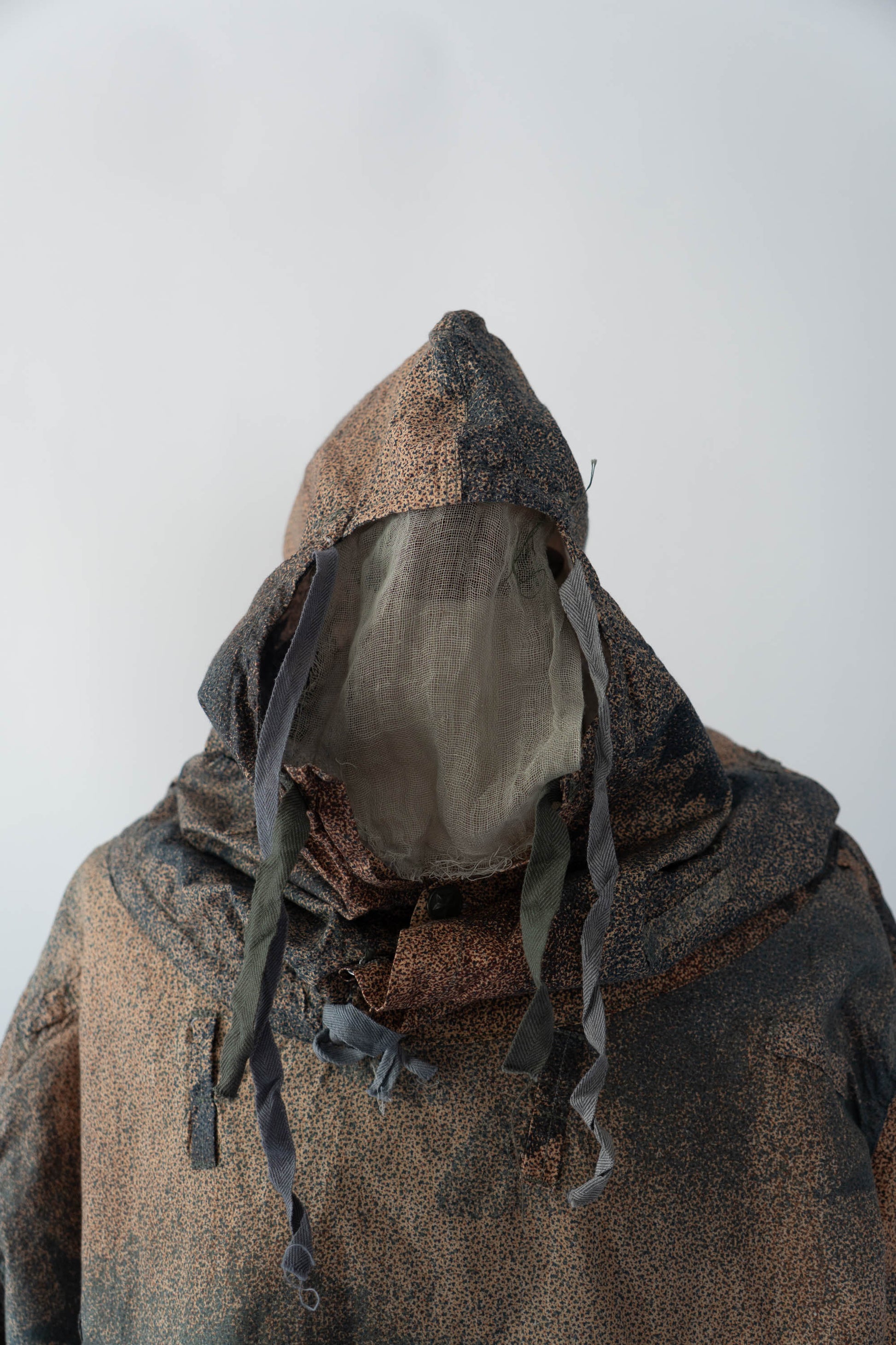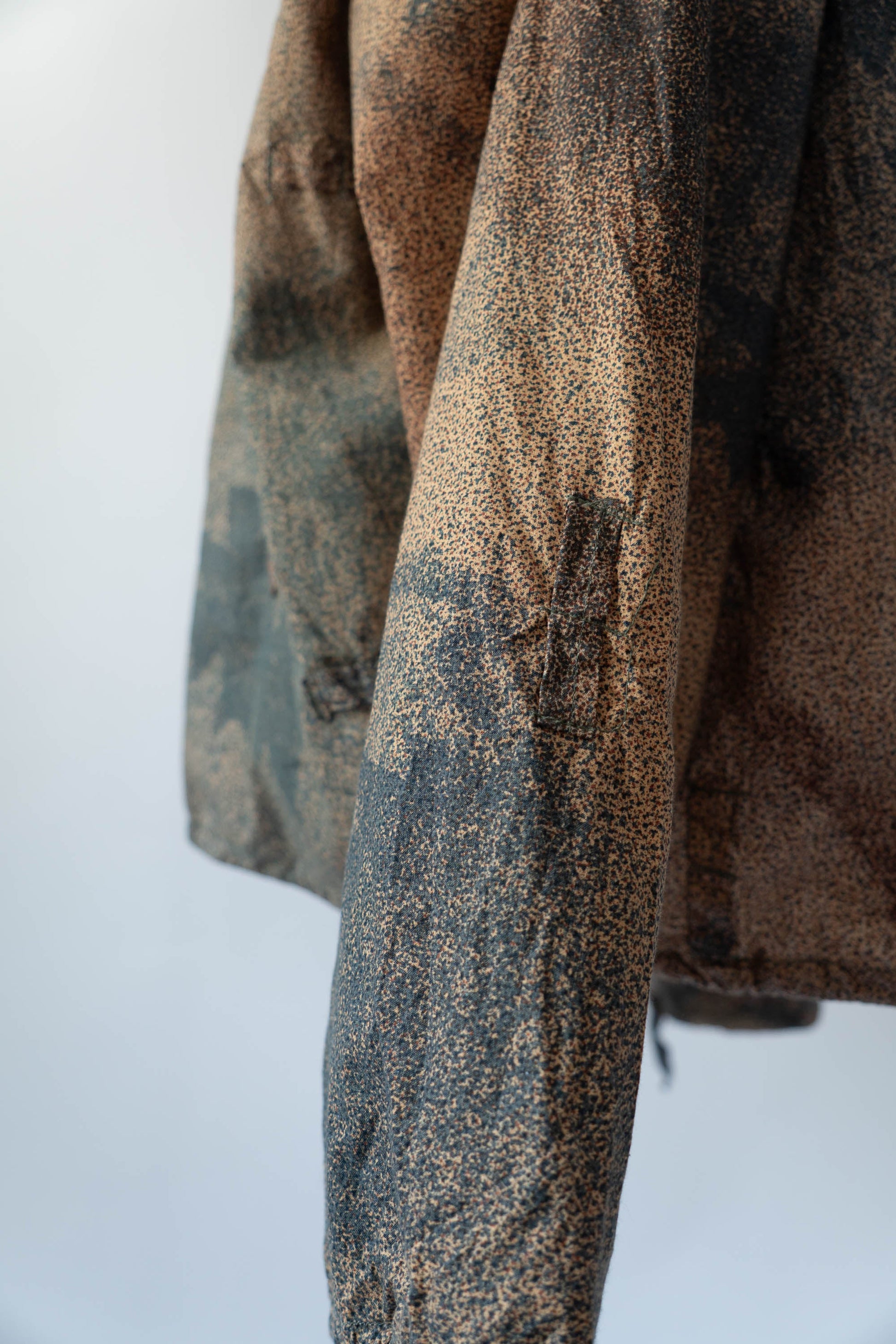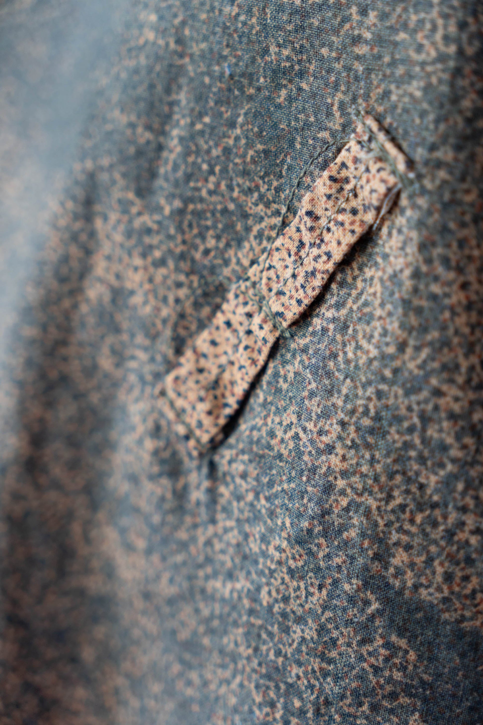 Son motif camouflage unique attire le regard, tout en se démarquant des motifs camouflage traditionnels. Il s'agit sans doute d'un camouflage très tendance à l'heure actuelle. Le tissu utilisé est une popeline de coton fine, ce qui rend cette veste légère et respirante. À l'origine, elle était conçue pour être portée par-dessus un uniforme de combat, d'où sa silhouette ample. Ce smock à capuche est doté de fentes au niveau de la poitrine et de la taille permettant d'accéder à l'équipement interne, ainsi que d'une fente au niveau de la capuche pour empêcher les bruits extérieurs de pénétrer. Afin de se fondre dans l'environnement naturel, il est doté de nombreux détails fonctionnels, tels que des sangles permettant d'attacher des branches coupées dans les buissons, qui témoignent de l'importance accordée à la praticité des vêtements militaires de l'époque.