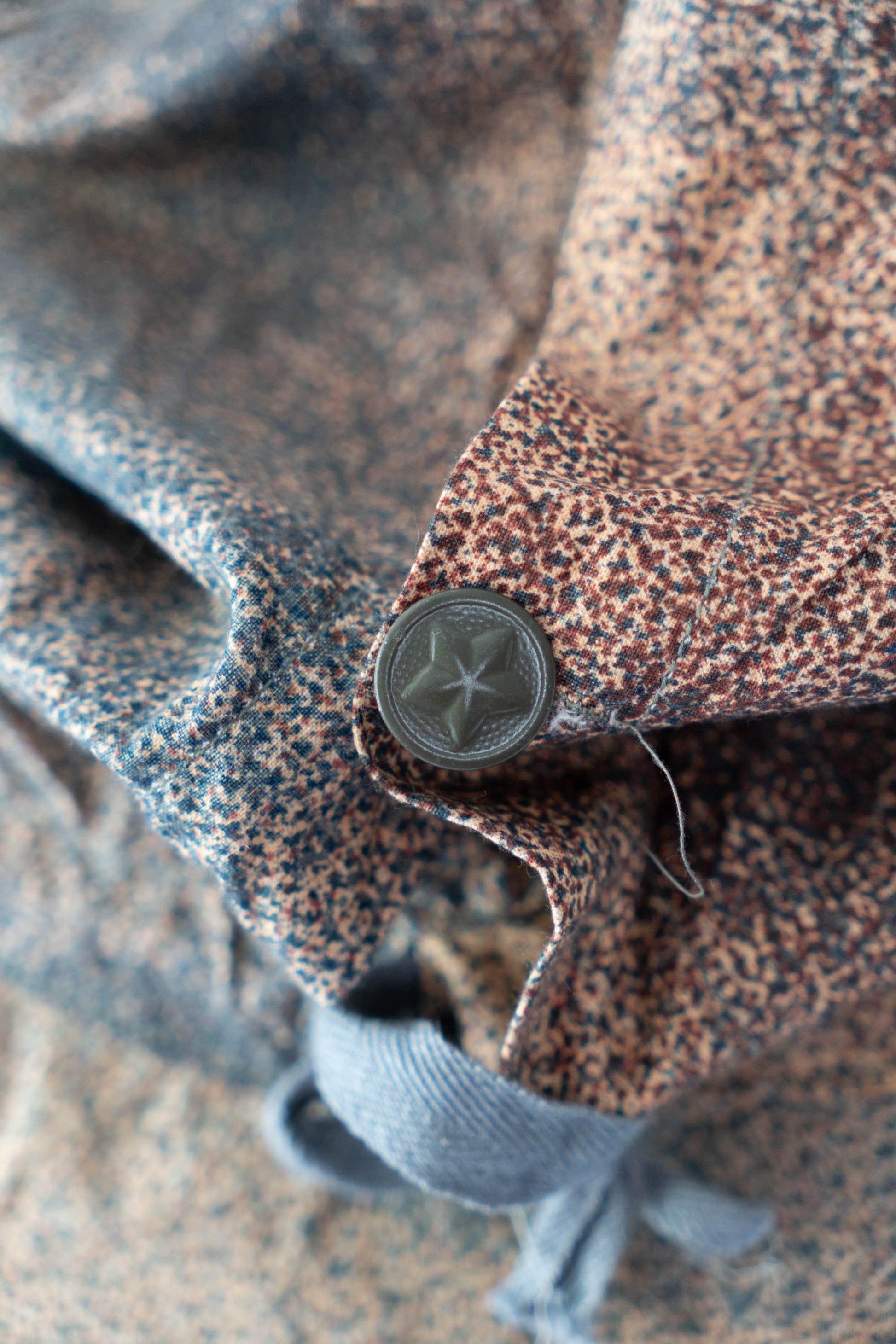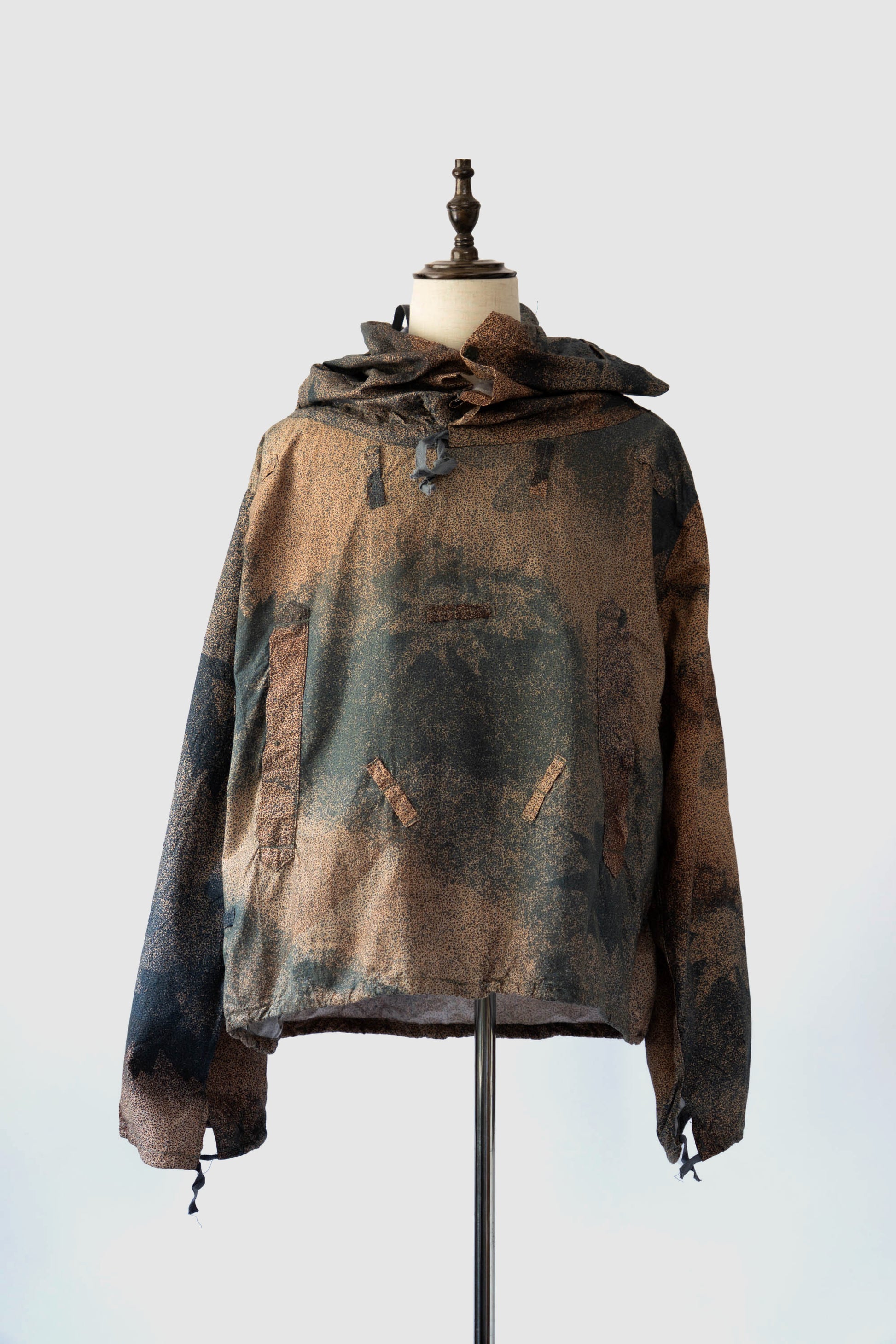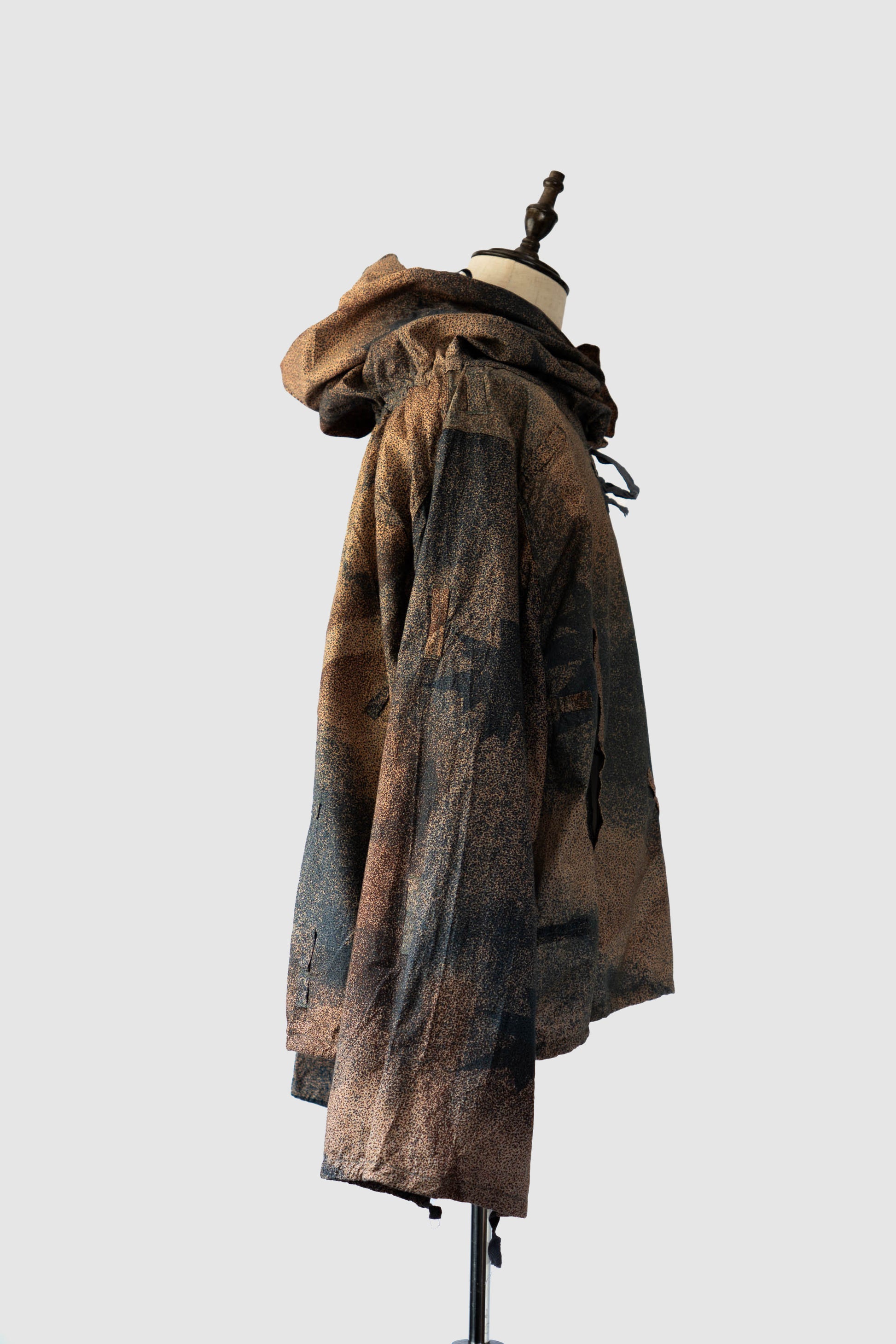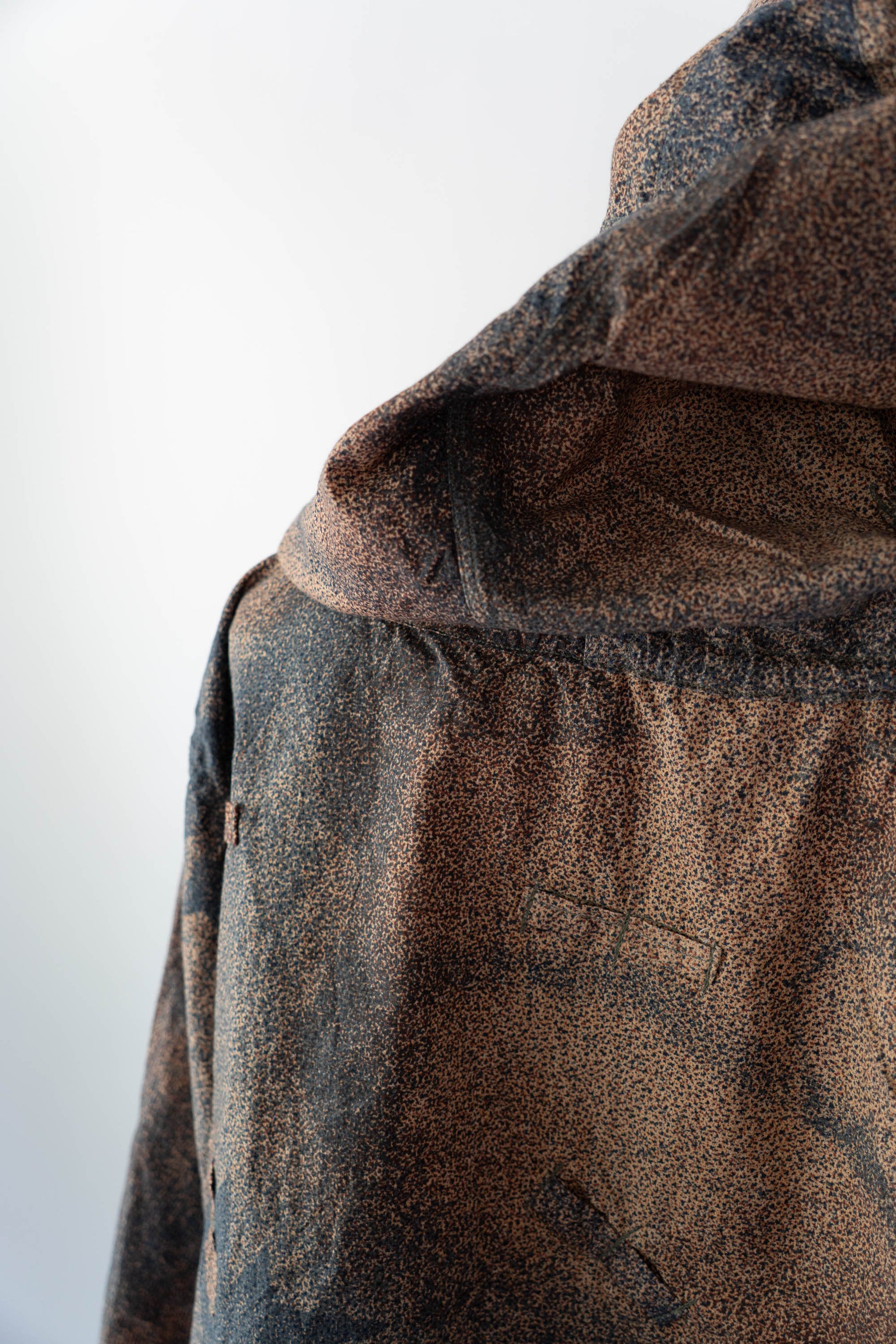 Son motif camouflage unique attire le regard, tout en se démarquant des motifs camouflage traditionnels. Il s'agit sans doute d'un camouflage très tendance à l'heure actuelle. Le tissu utilisé est une popeline de coton fine, ce qui rend cette veste légère et respirante. À l'origine, elle était conçue pour être portée par-dessus un uniforme de combat, d'où sa silhouette ample. Ce smock à capuche est doté de fentes au niveau de la poitrine et de la taille permettant d'accéder à l'équipement interne, ainsi que d'une fente au niveau de la capuche pour empêcher les bruits extérieurs de pénétrer. Afin de se fondre dans l'environnement naturel, il est doté de nombreux détails fonctionnels, tels que des sangles permettant d'attacher des branches coupées dans les buissons, qui témoignent de l'importance accordée à la praticité des vêtements militaires de l'époque.