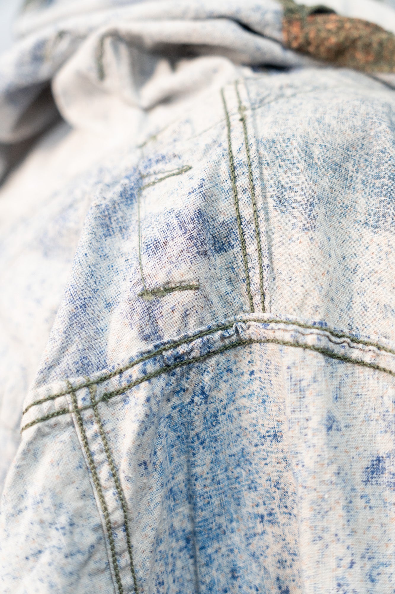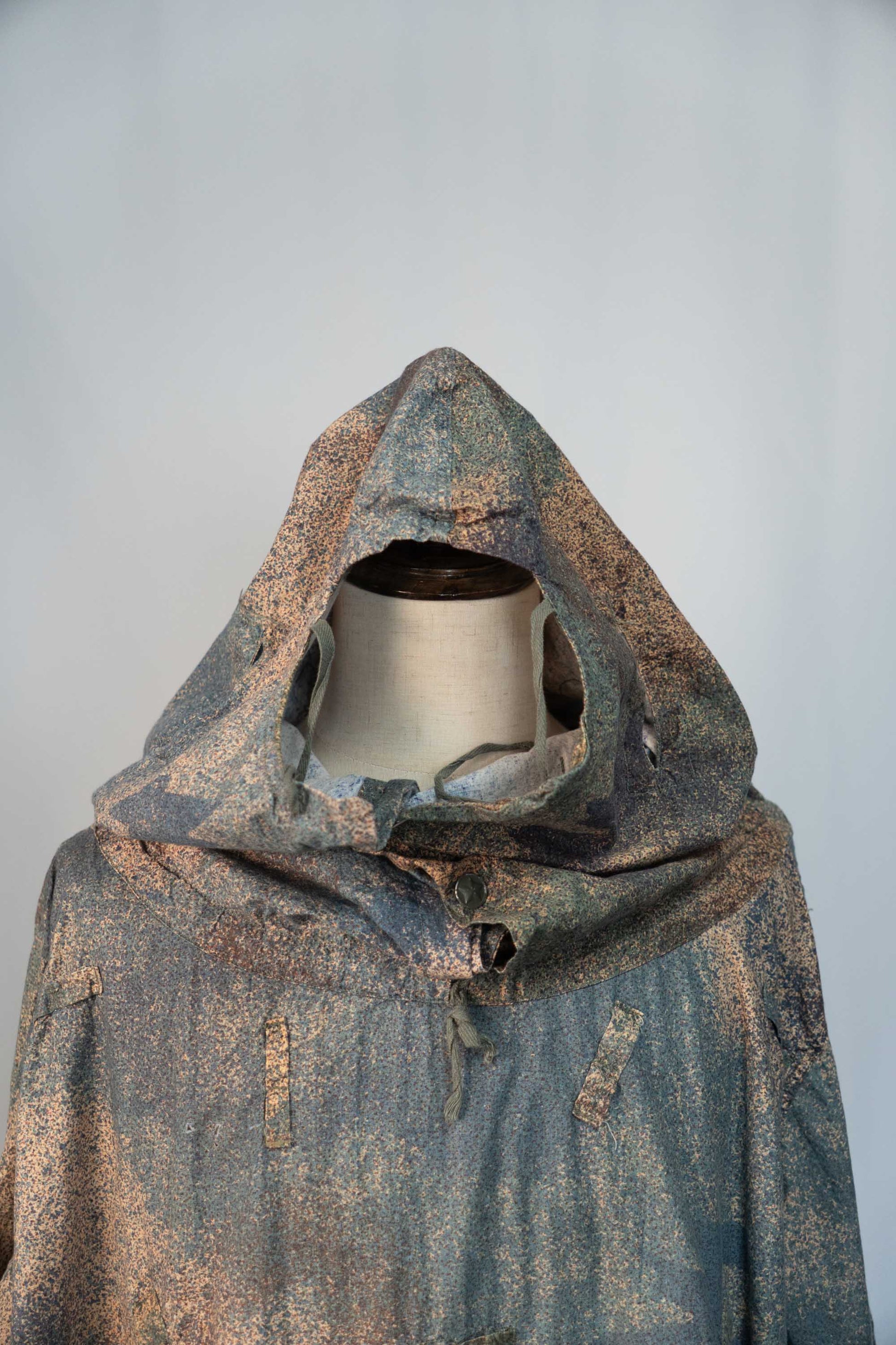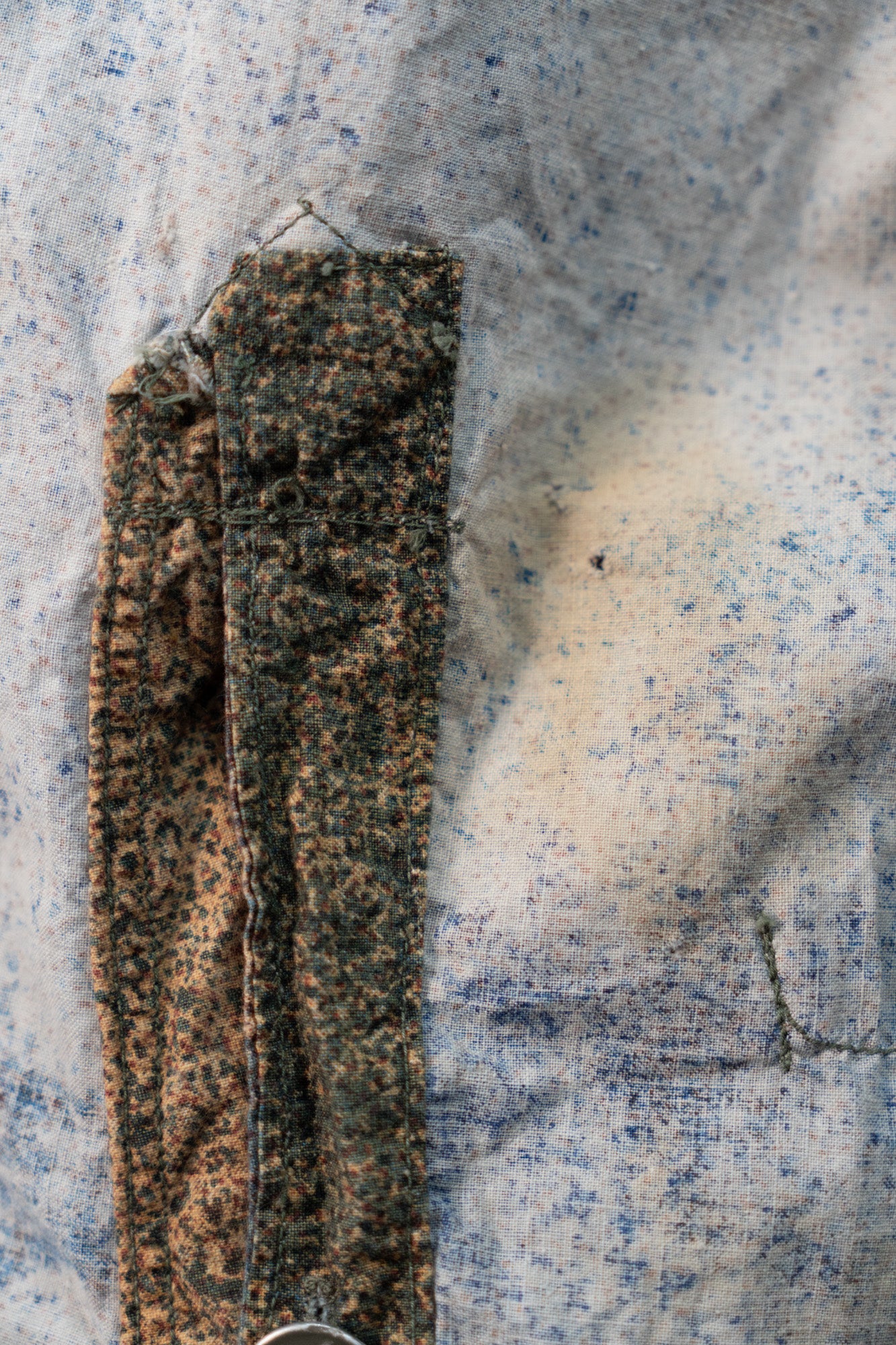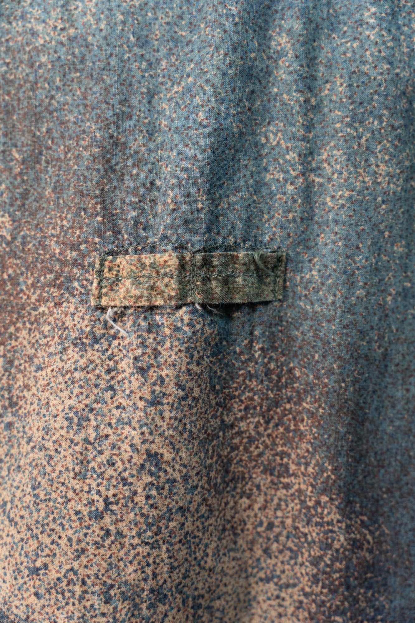 Le tissu utilisé est une popeline de coton fine, ce qui rend cette blouse légère et respirante. À l'origine, elle était conçue pour être portée par-dessus un uniforme de combat, ce qui explique sa silhouette ample et décontractée. Ce smock à capuche est doté de fentes au niveau de la poitrine et de la taille permettant d'accéder à l'équipement interne, ainsi que d'une fente au niveau de la capuche pour empêcher les bruits extérieurs de s'échapper. La partie visible comporte de nombreux détails fonctionnels, tels que des boucles pour attacher divers équipements, qui témoignent de l'importance accordée à la praticité dans les vêtements militaires de l'époque.