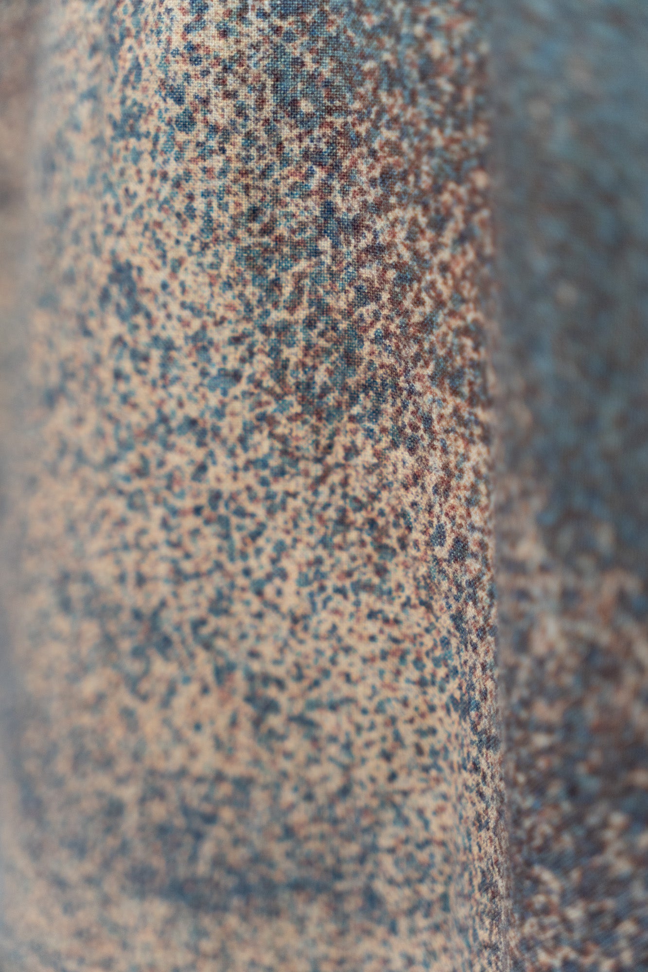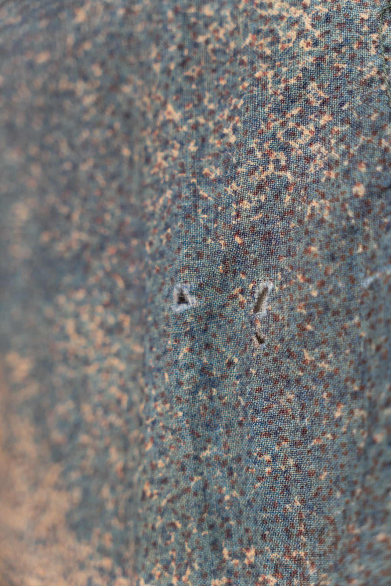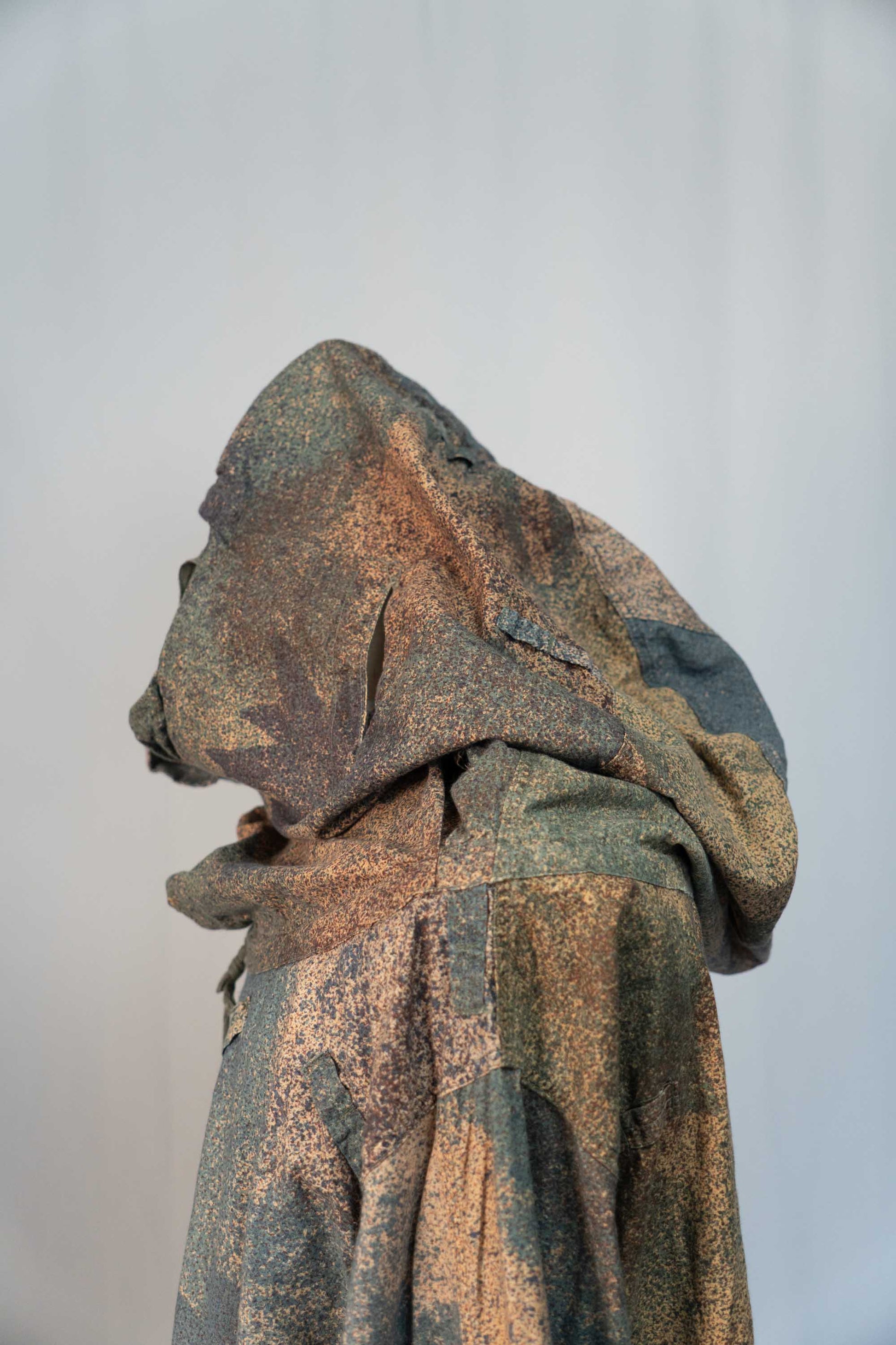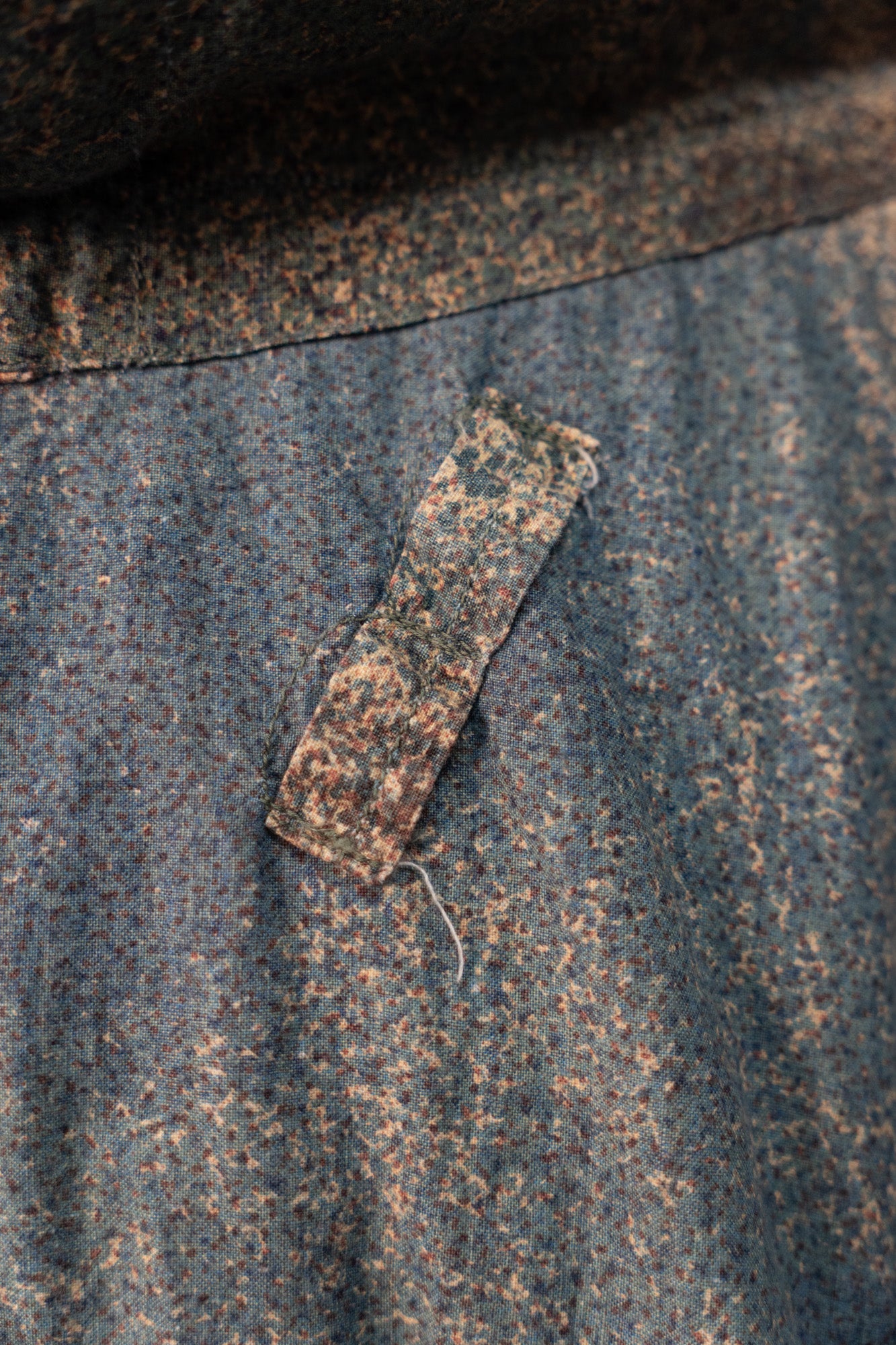 Le tissu utilisé est une popeline de coton fine, ce qui rend cette blouse légère et respirante. À l'origine, elle était conçue pour être portée par-dessus un uniforme de combat, ce qui explique sa silhouette ample et décontractée. Ce smock à capuche est doté de fentes au niveau de la poitrine et de la taille permettant d'accéder à l'équipement interne, ainsi que d'une fente au niveau de la capuche pour empêcher les bruits extérieurs de s'échapper. La partie visible comporte de nombreux détails fonctionnels, tels que des boucles pour attacher divers équipements, qui témoignent de l'importance accordée à la praticité dans les vêtements militaires de l'époque.