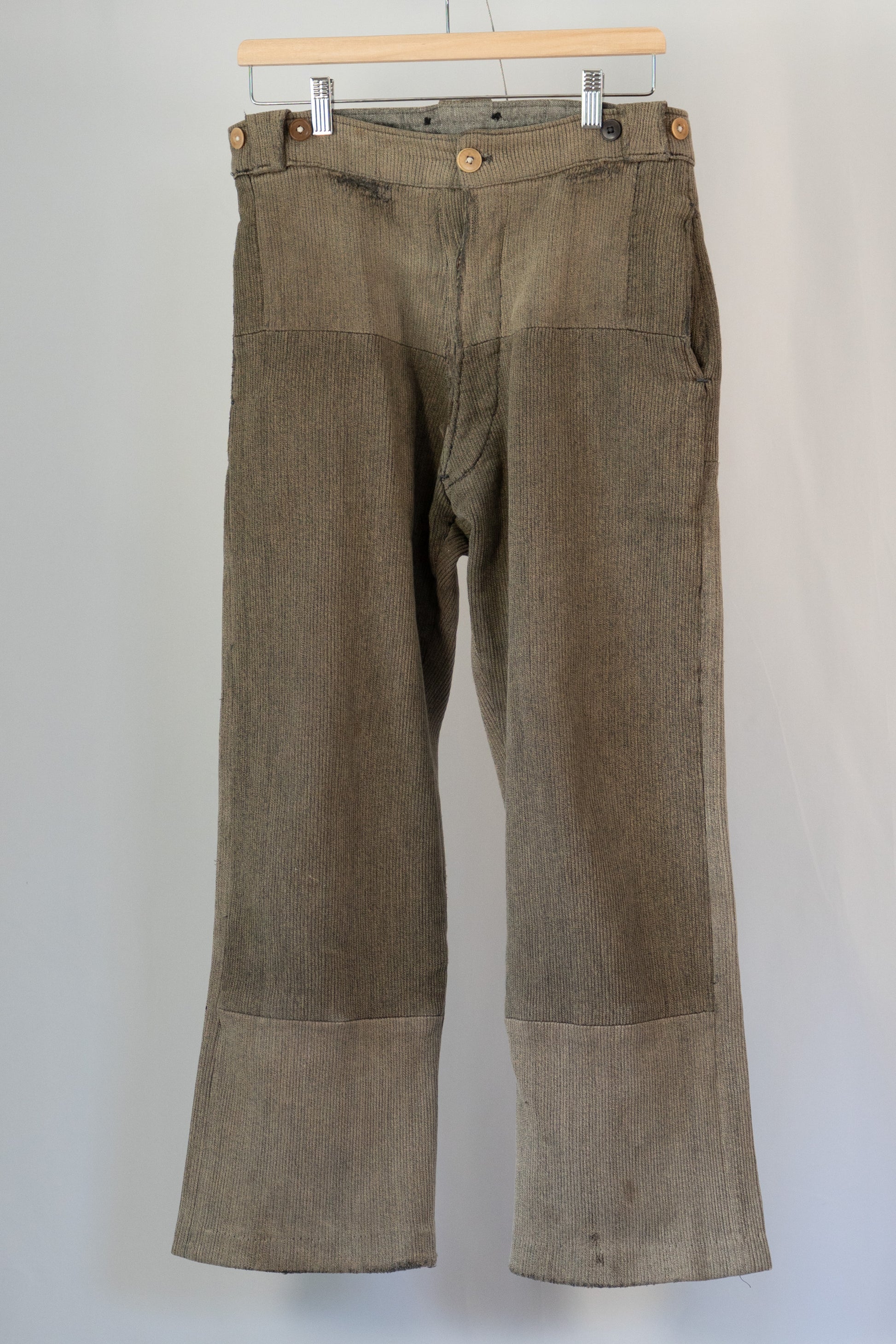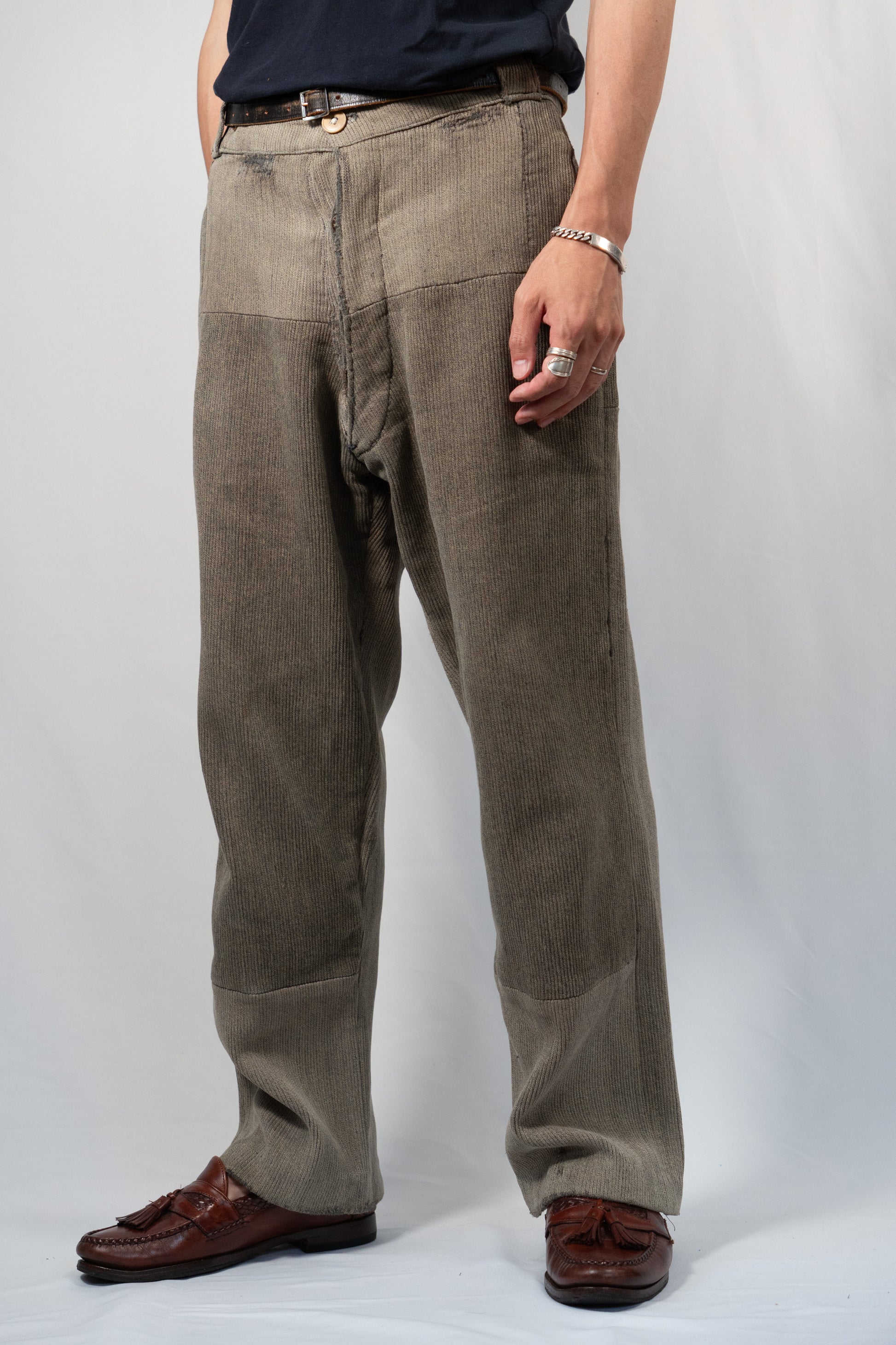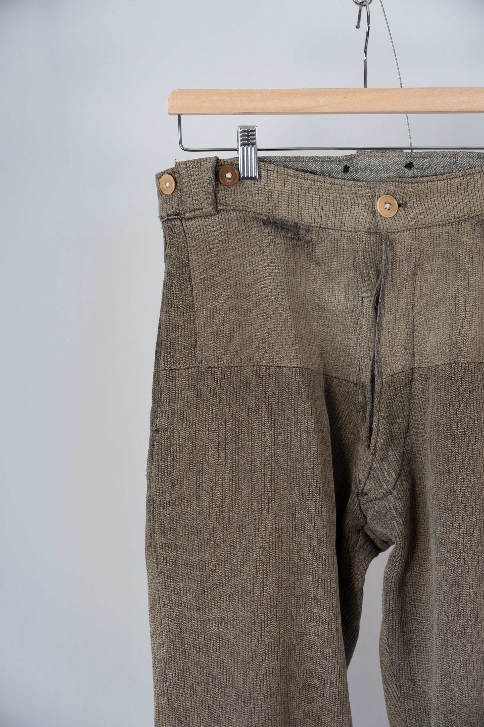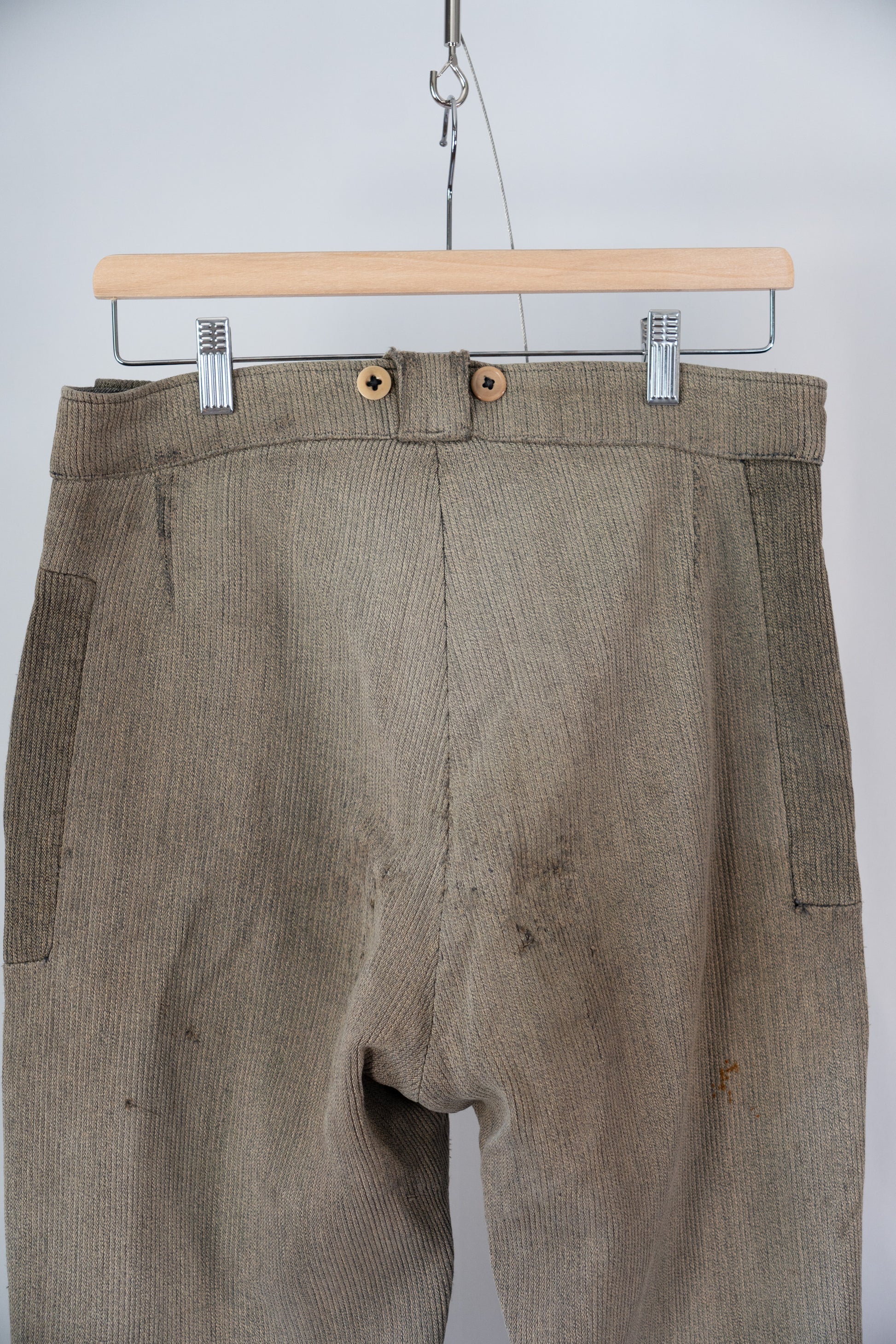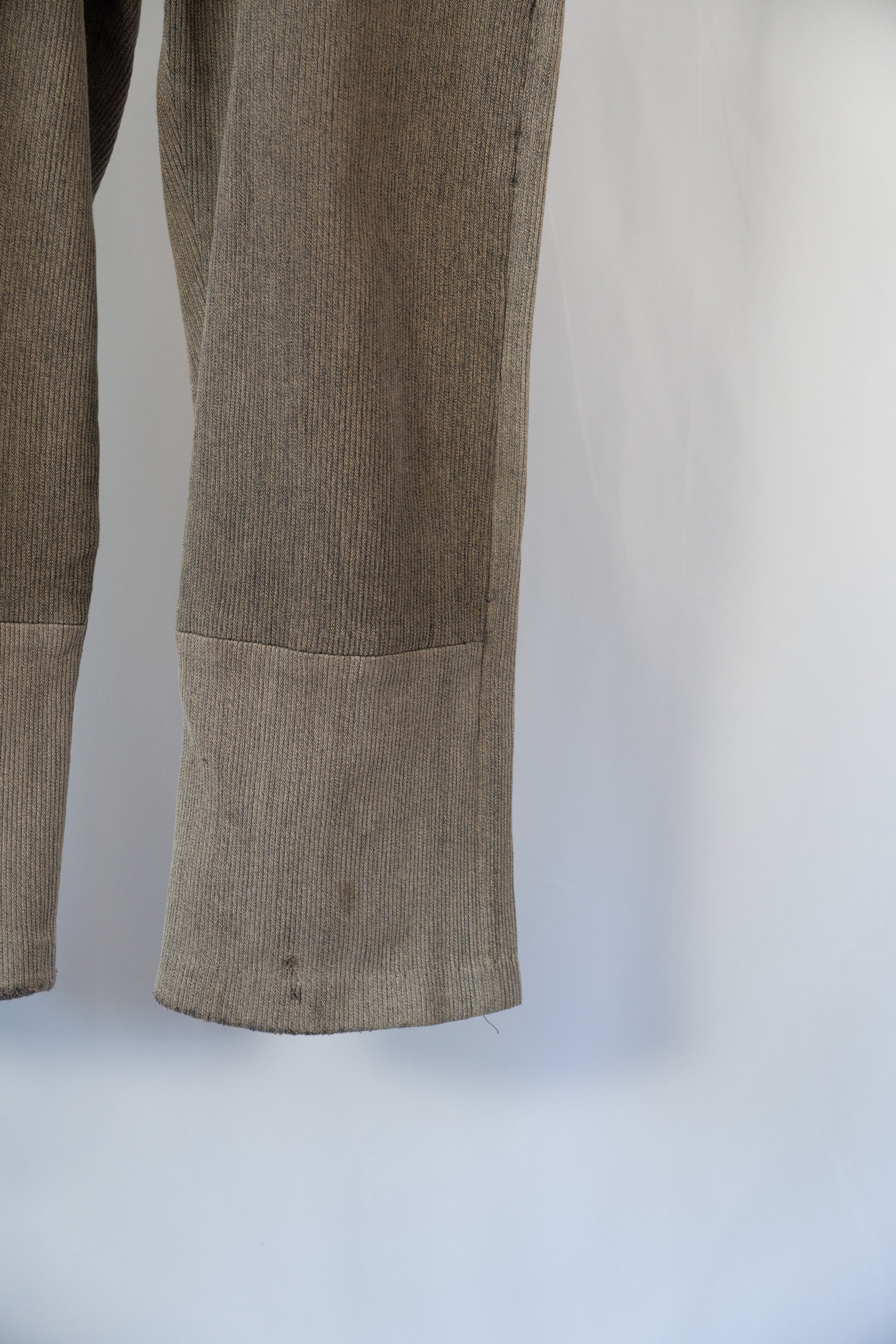 Le piqué de poids moyen est un tissu très résistant, utilisé notamment pour les vestes de chasse, et qui se caractérise par ses belles rayures verticales. Il s'agit d'un tissu représentatif de la France. Ce pantalon peut être porté au printemps, en automne et en hiver, et sa couleur s'est estompée. Le délavage est parfait et les patchs marron foncé sont du plus bel effet.