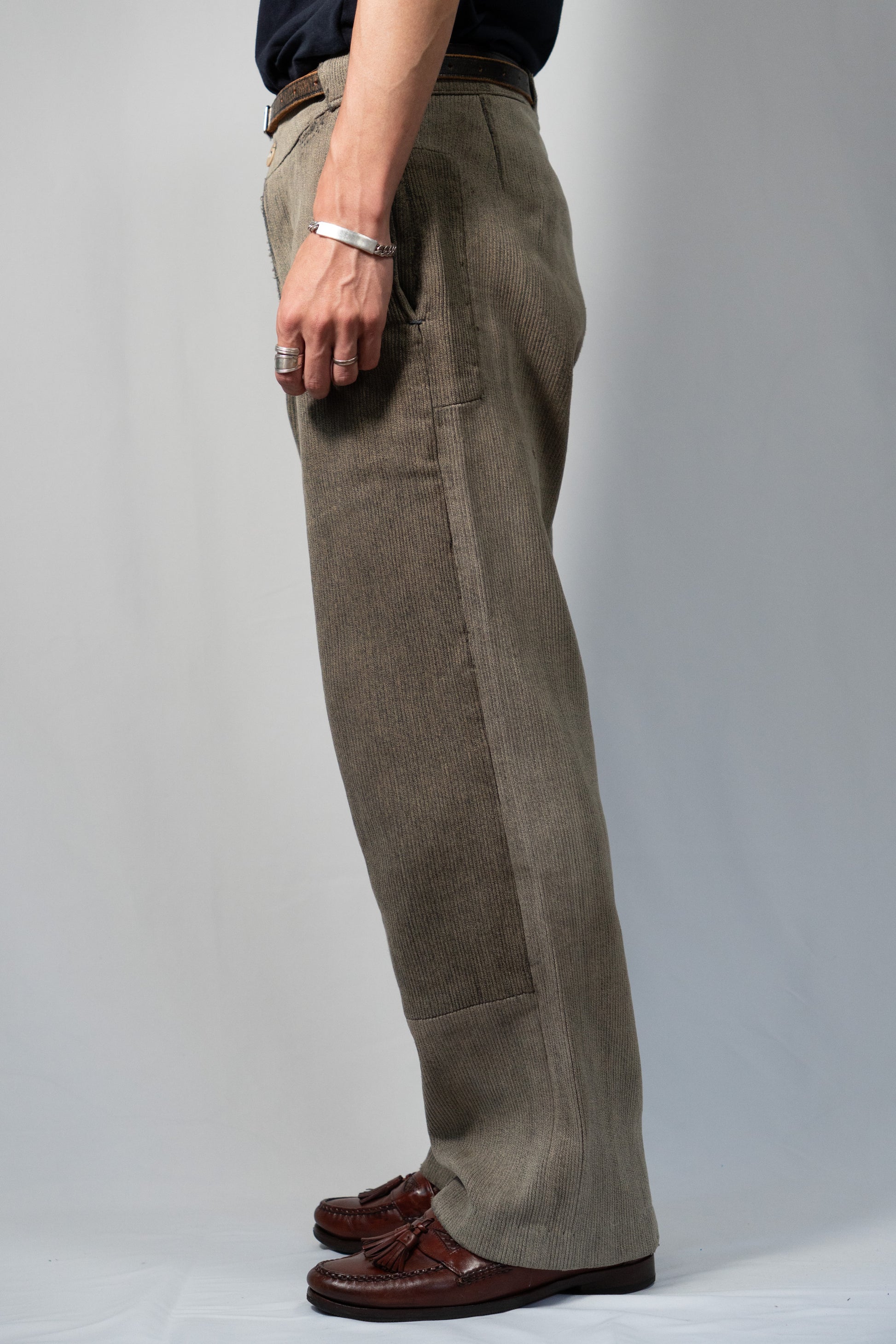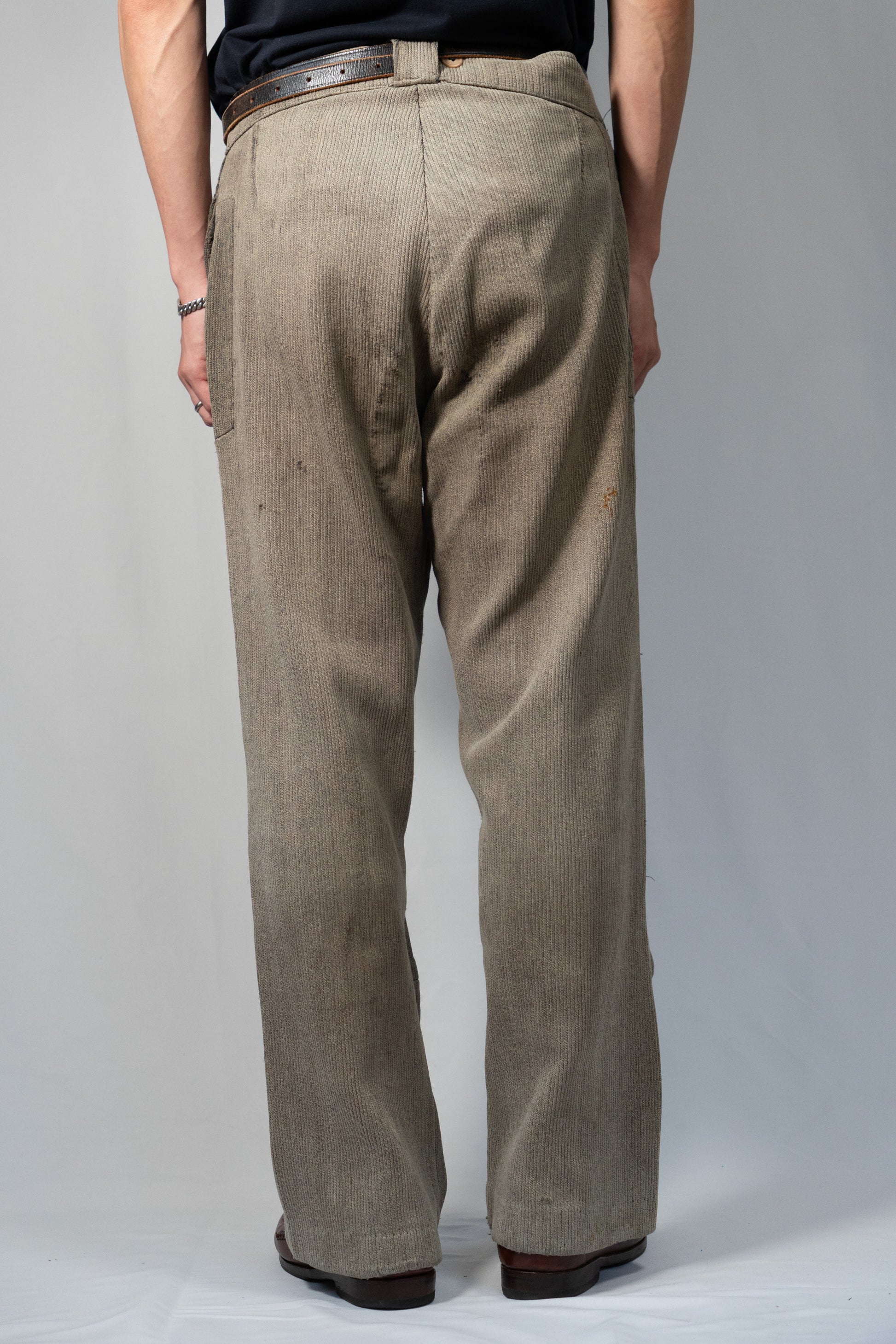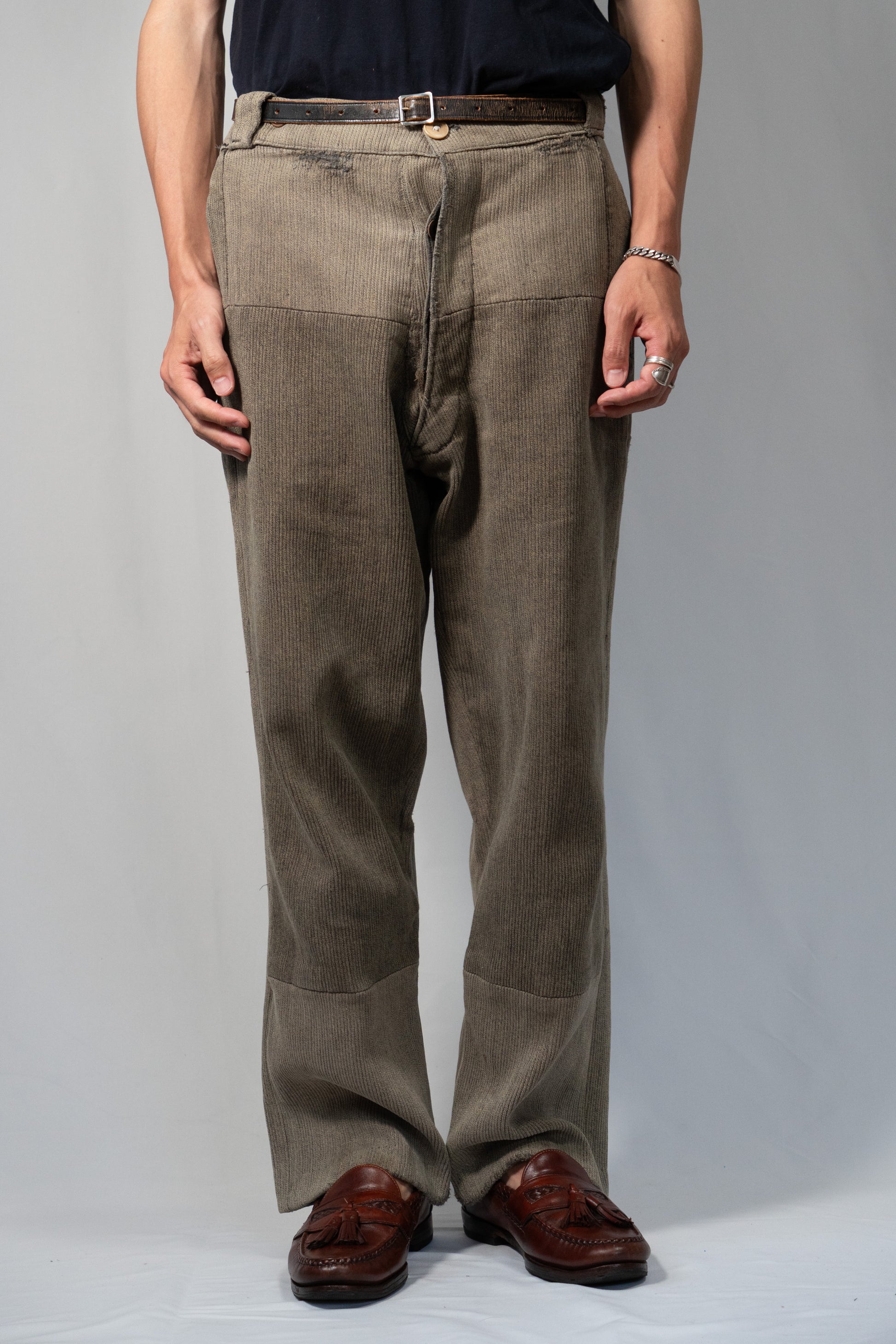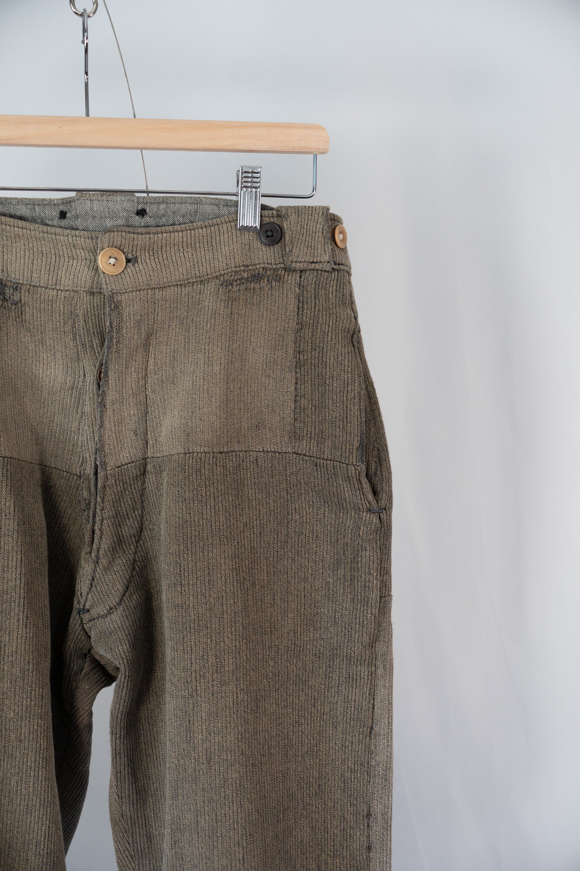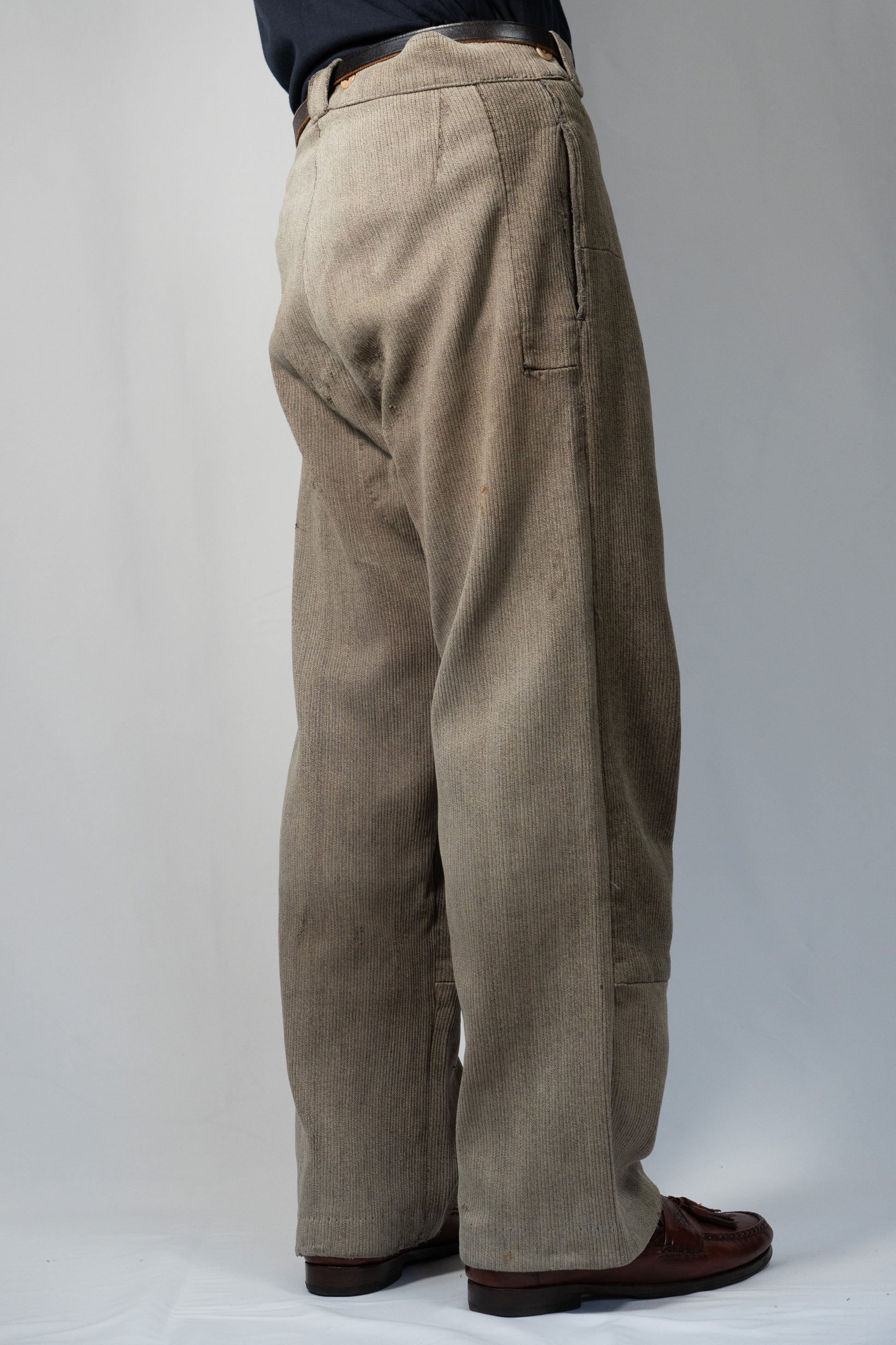 Le piqué de poids moyen est un tissu très résistant, utilisé notamment pour les vestes de chasse, et qui se caractérise par ses belles rayures verticales. Il s'agit d'un tissu représentatif de la France. Ce pantalon peut être porté au printemps, en automne et en hiver, et sa couleur s'est estompée. Le délavage est parfait et les patchs marron foncé sont du plus bel effet.