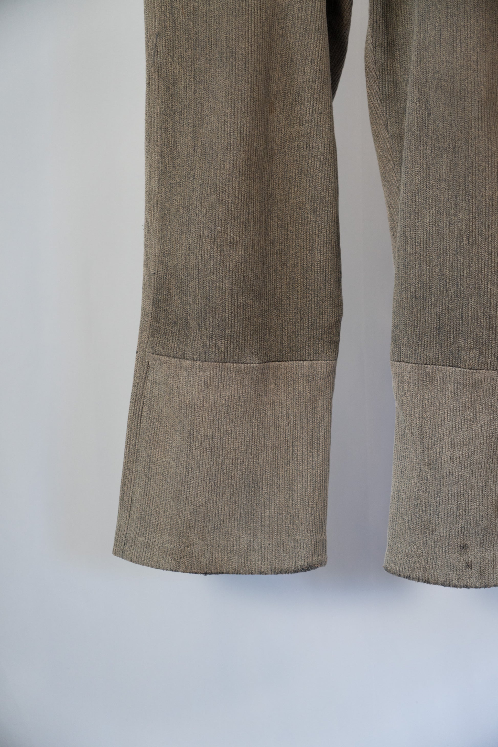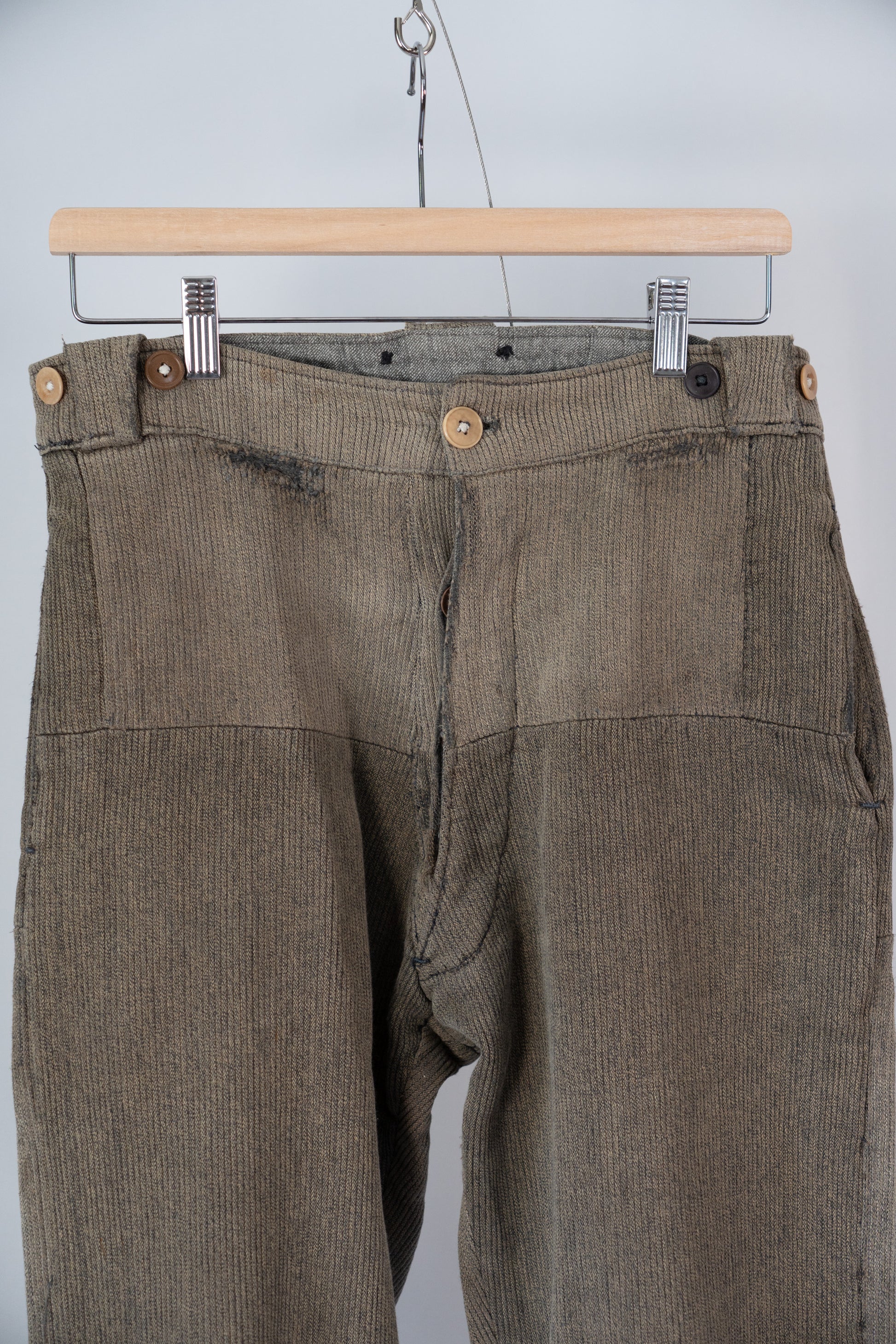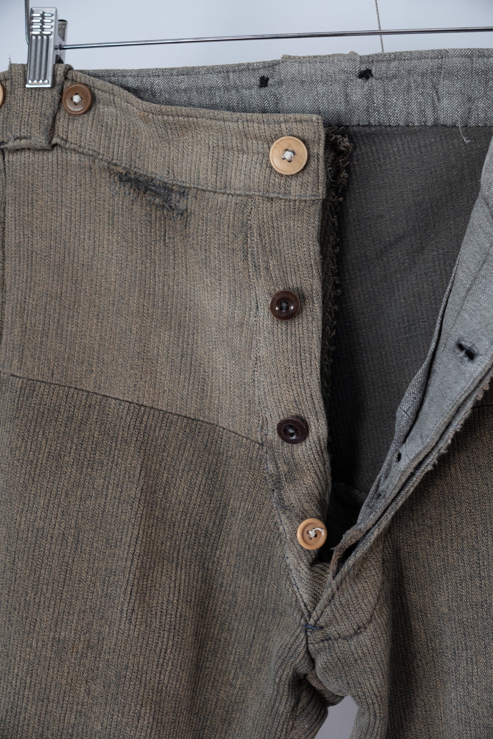 Les boutons à la taille ont été remplacés et la poche à monnaie a été cousue à la main. L'entrejambe a été renforcé par un renfort, ce qui laisse deviner que ce pantalon a été porté avec soin par un ouvrier de l'époque.