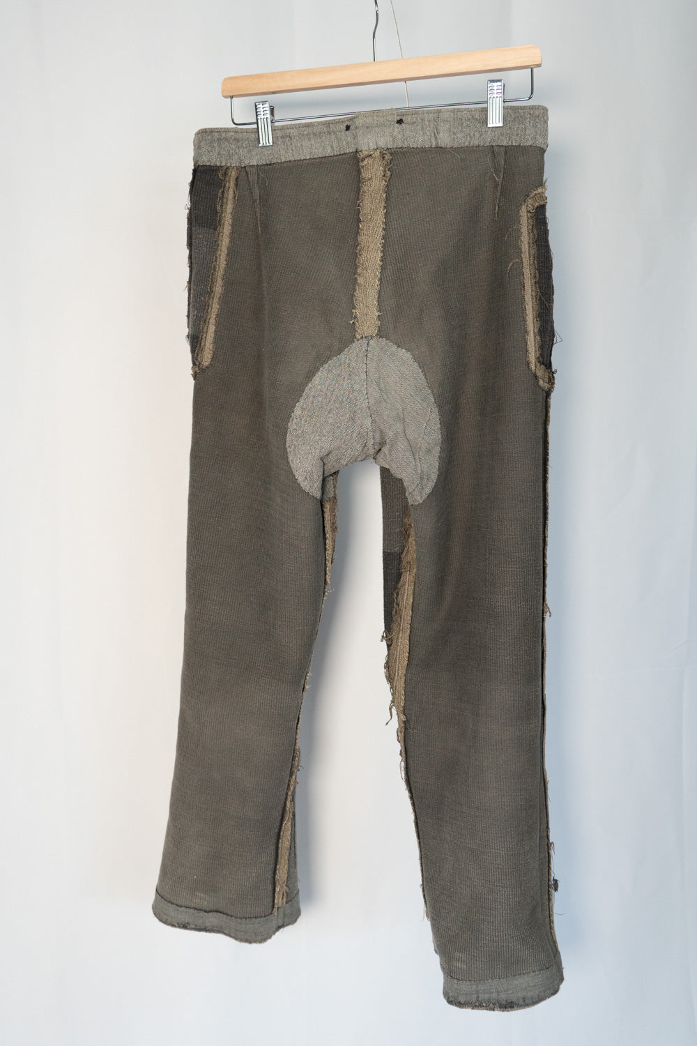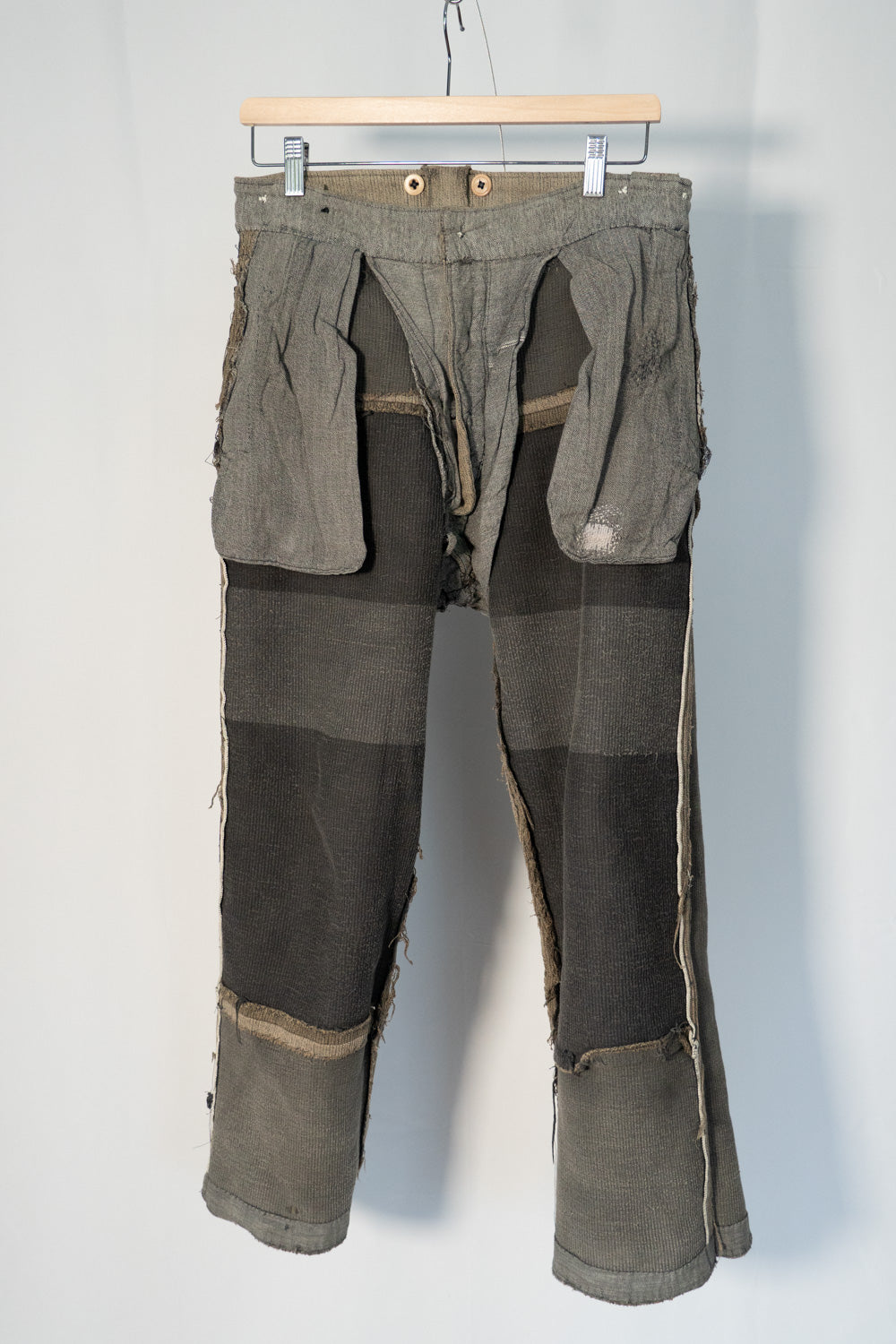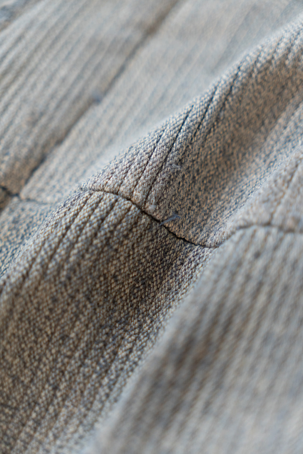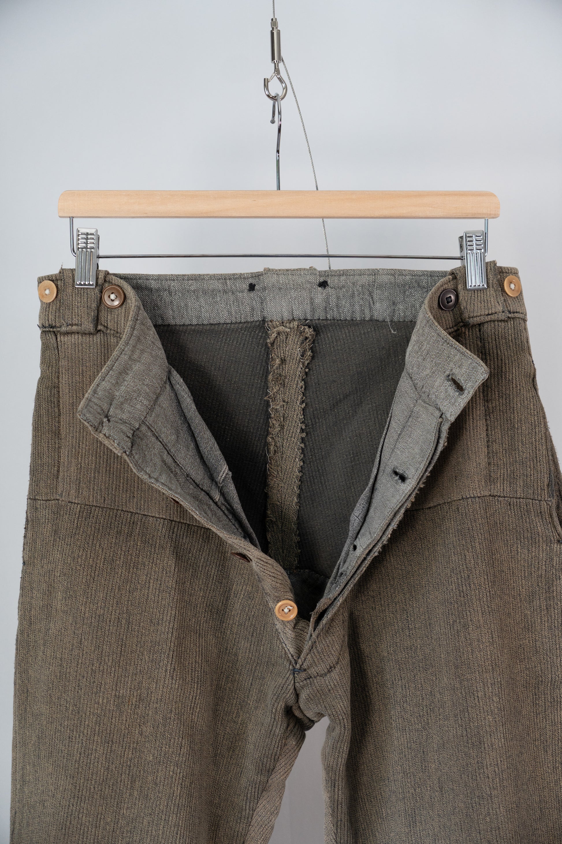 Les boutons à la taille ont été remplacés et la poche à monnaie a été cousue à la main. L'entrejambe a été renforcé par un renfort, ce qui laisse deviner que ce pantalon a été porté avec soin par un ouvrier de l'époque.