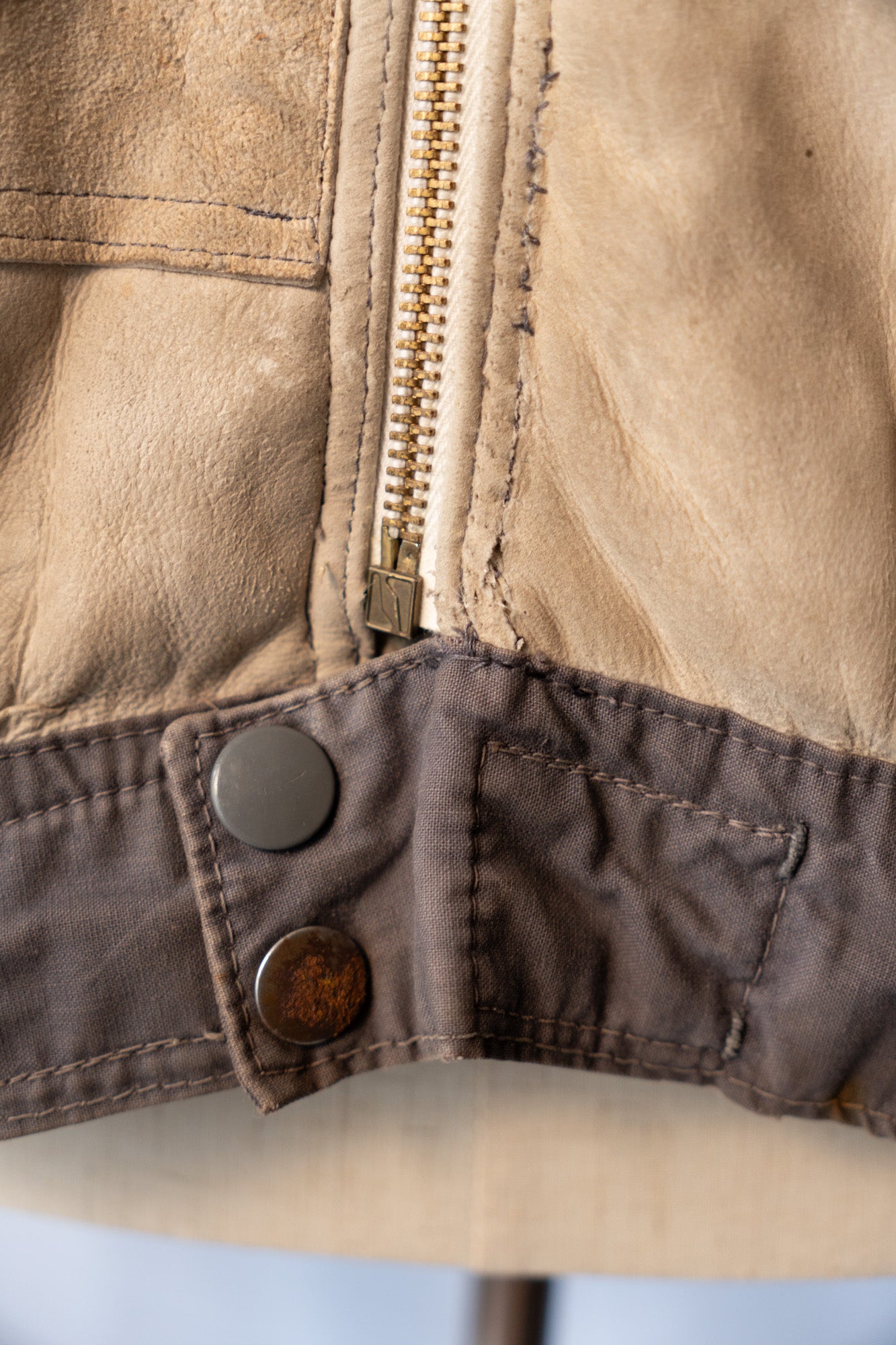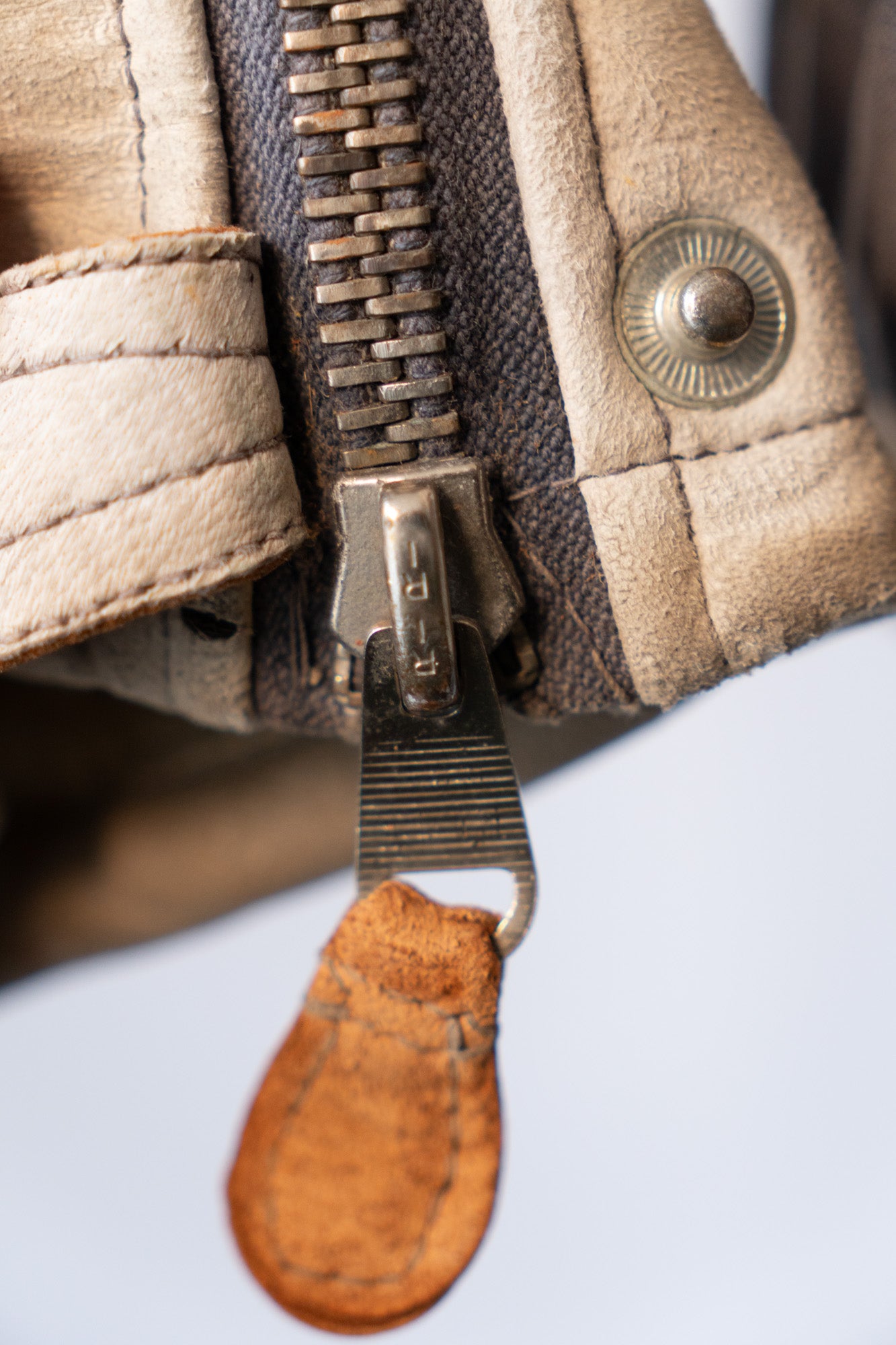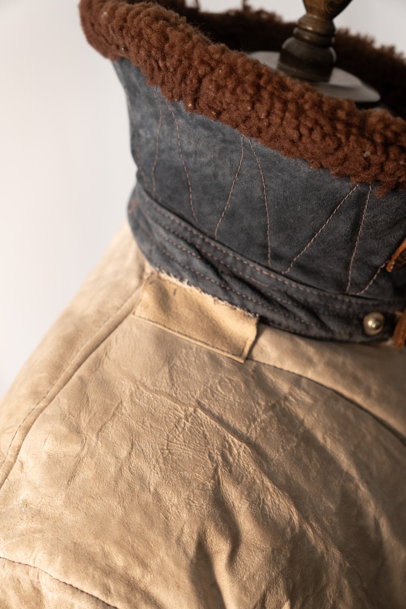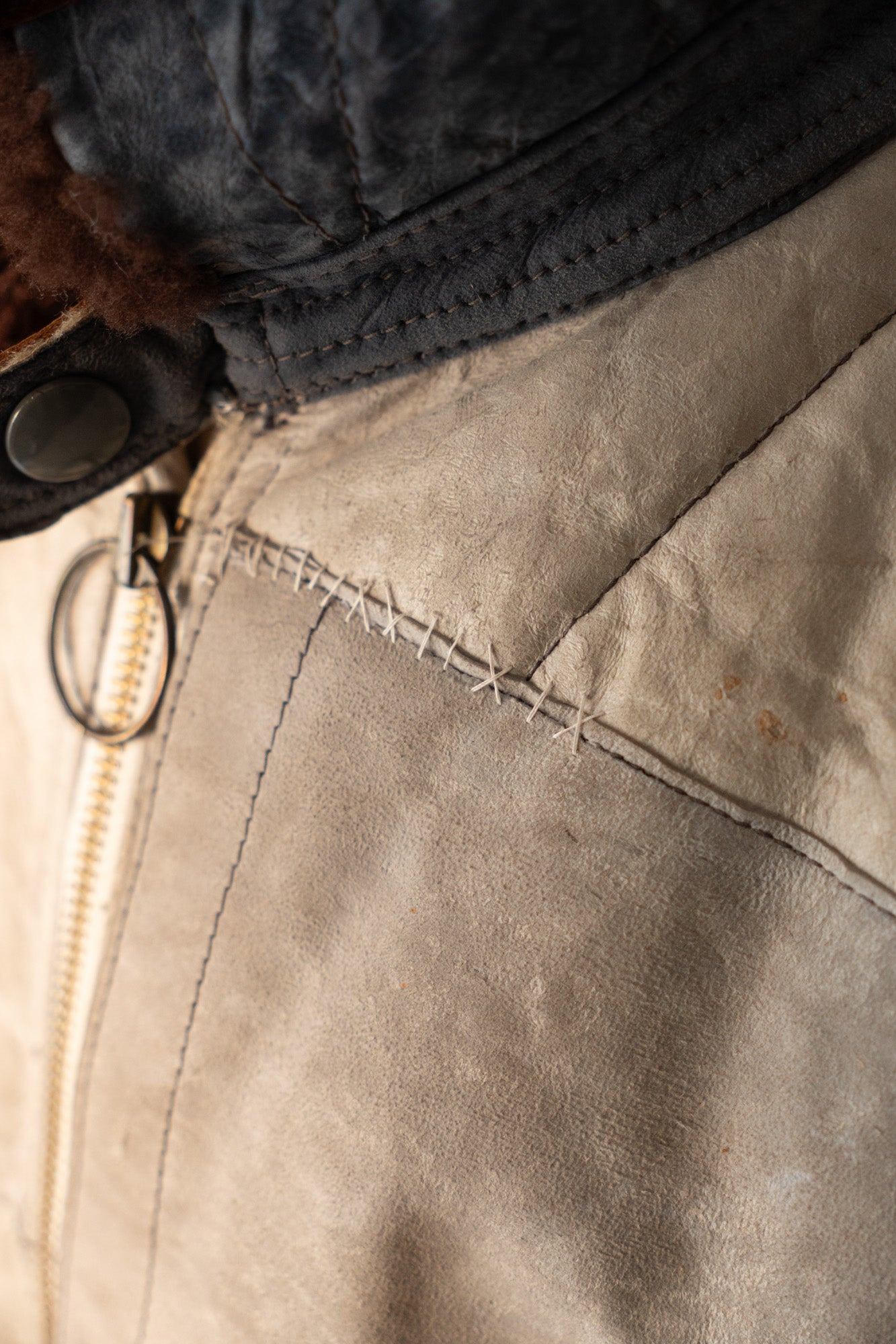 Comme le montrent les photos, la fourrure présente quelques poils manquants et des dommages, mais elle a été réparée. Le cuir n'est pas durci et la fermeture éclair n'est pas abîmée, ce qui permet de continuer à porter ce vêtement. Si vous recherchez un article de valeur historique, nous vous invitons à saisir cette occasion.