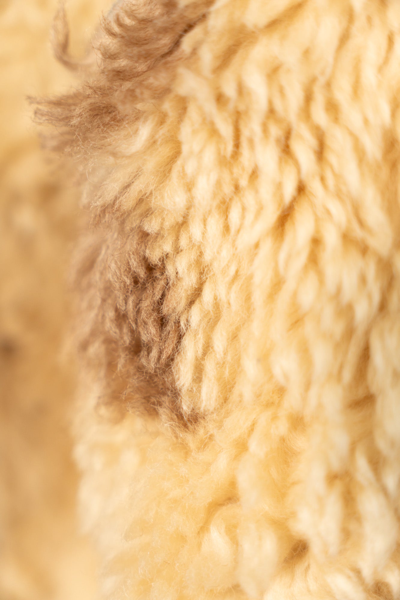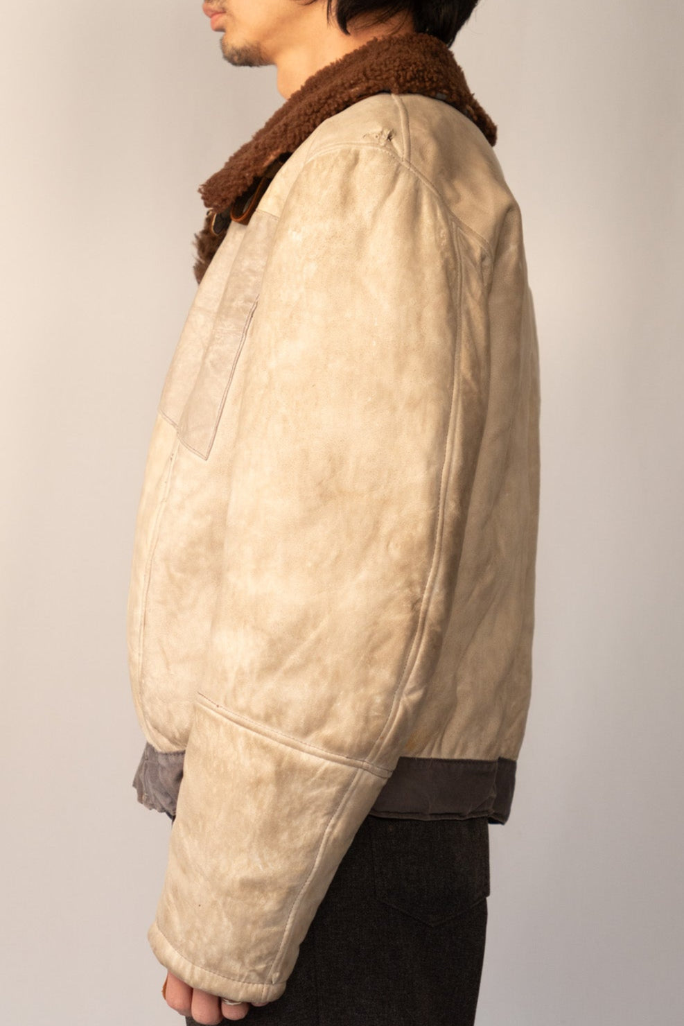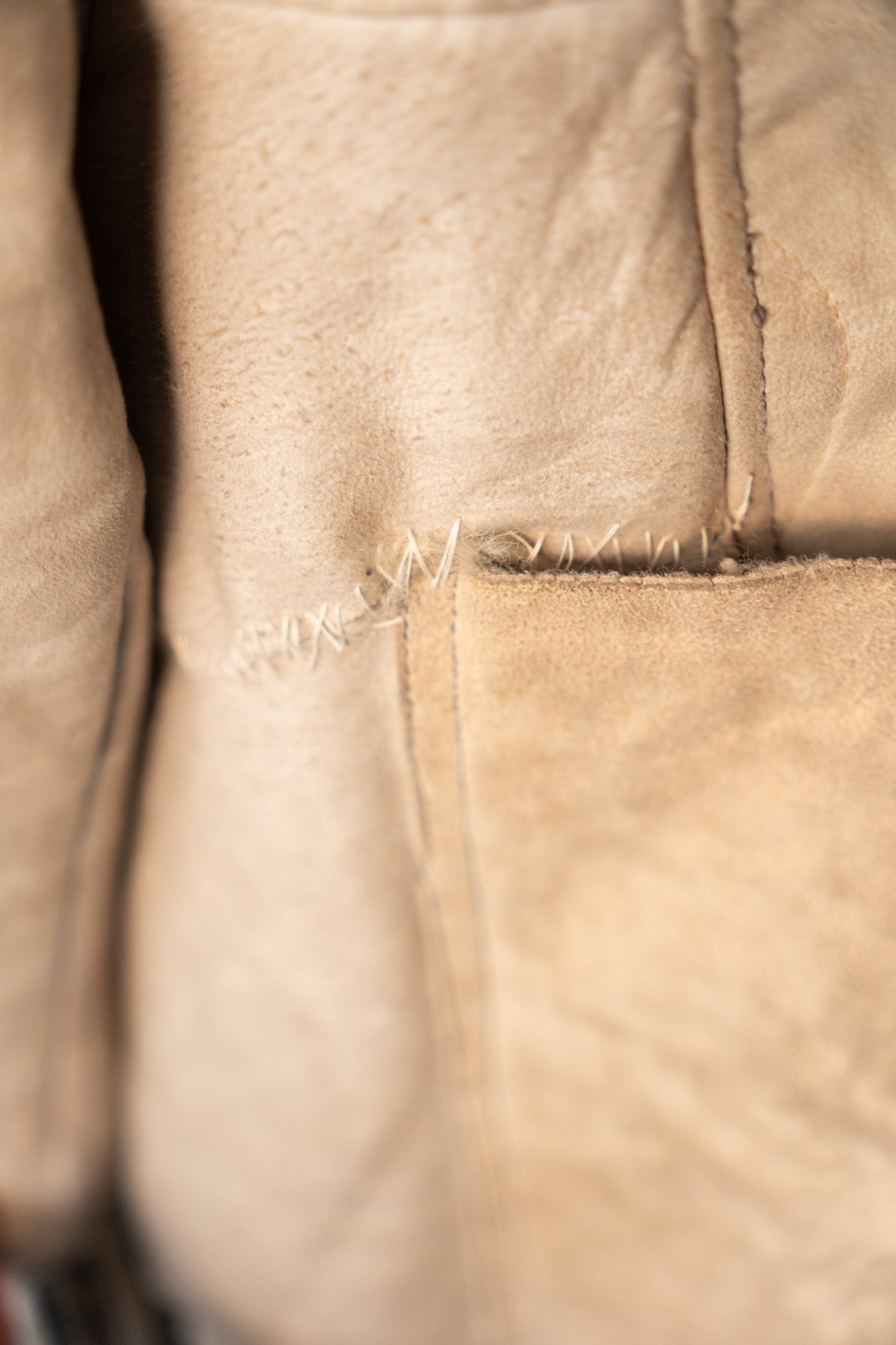 Elle est confectionnée en peau de mouton souple, très douce, qui ne perd pas ses poils et offre une excellente isolation thermique. Elle existe en trois couleurs : noir, bleu et gris blanc. Ce modèle est particulièrement rare, car il est de couleur gris blanc et doté d'une fermeture éclair RIRI d'origine. Elle est très légère et offre un confort similaire à celui d'une doudoune moderne.