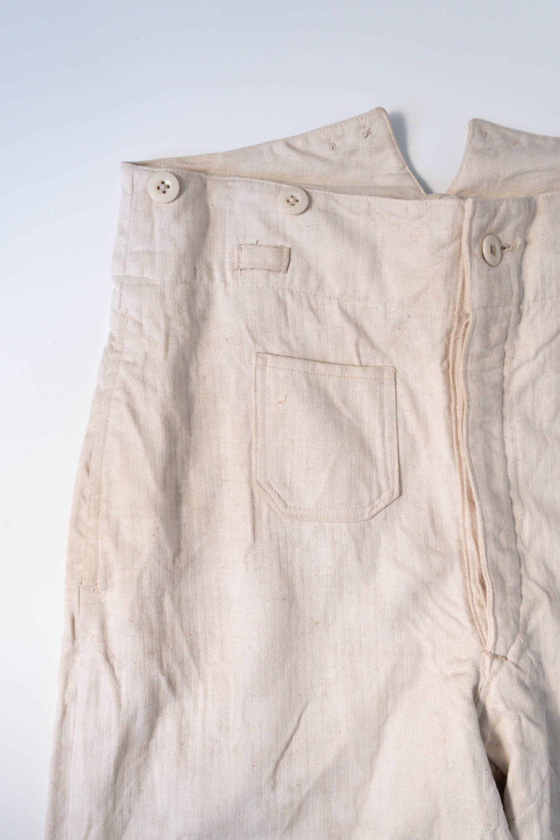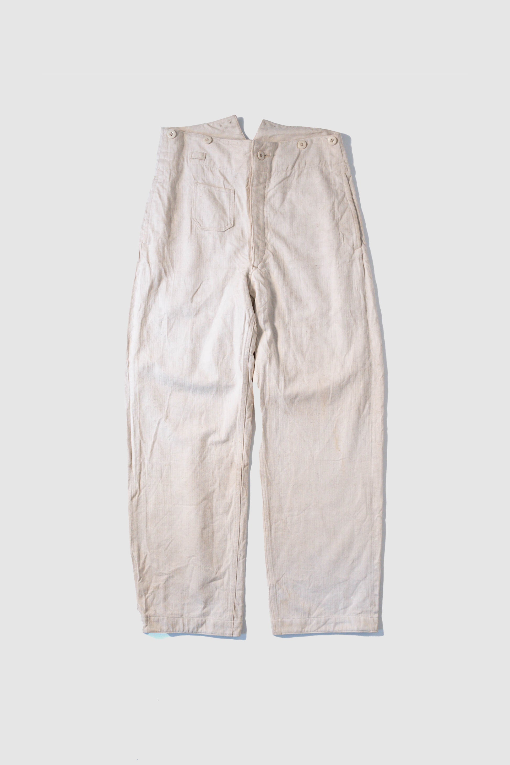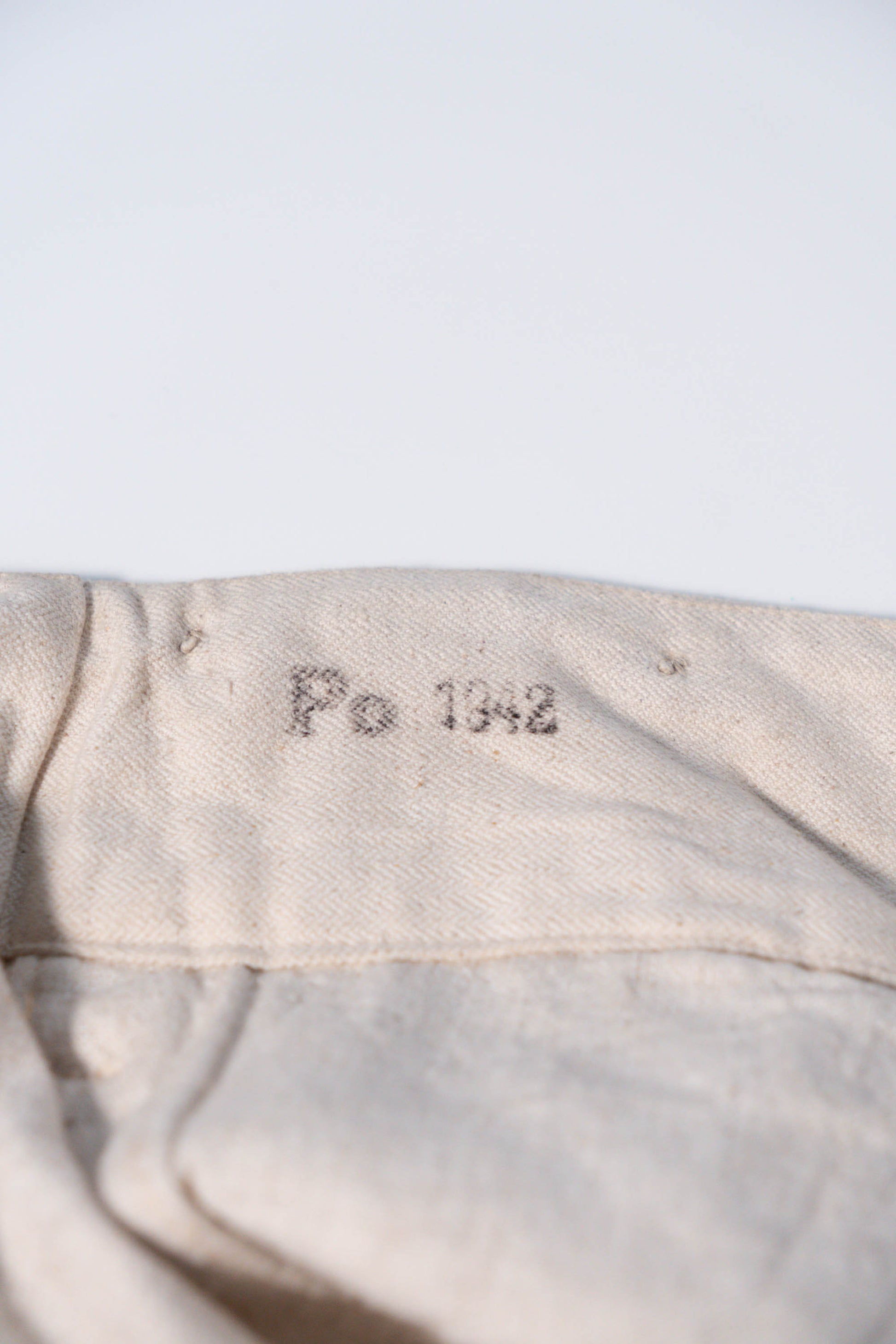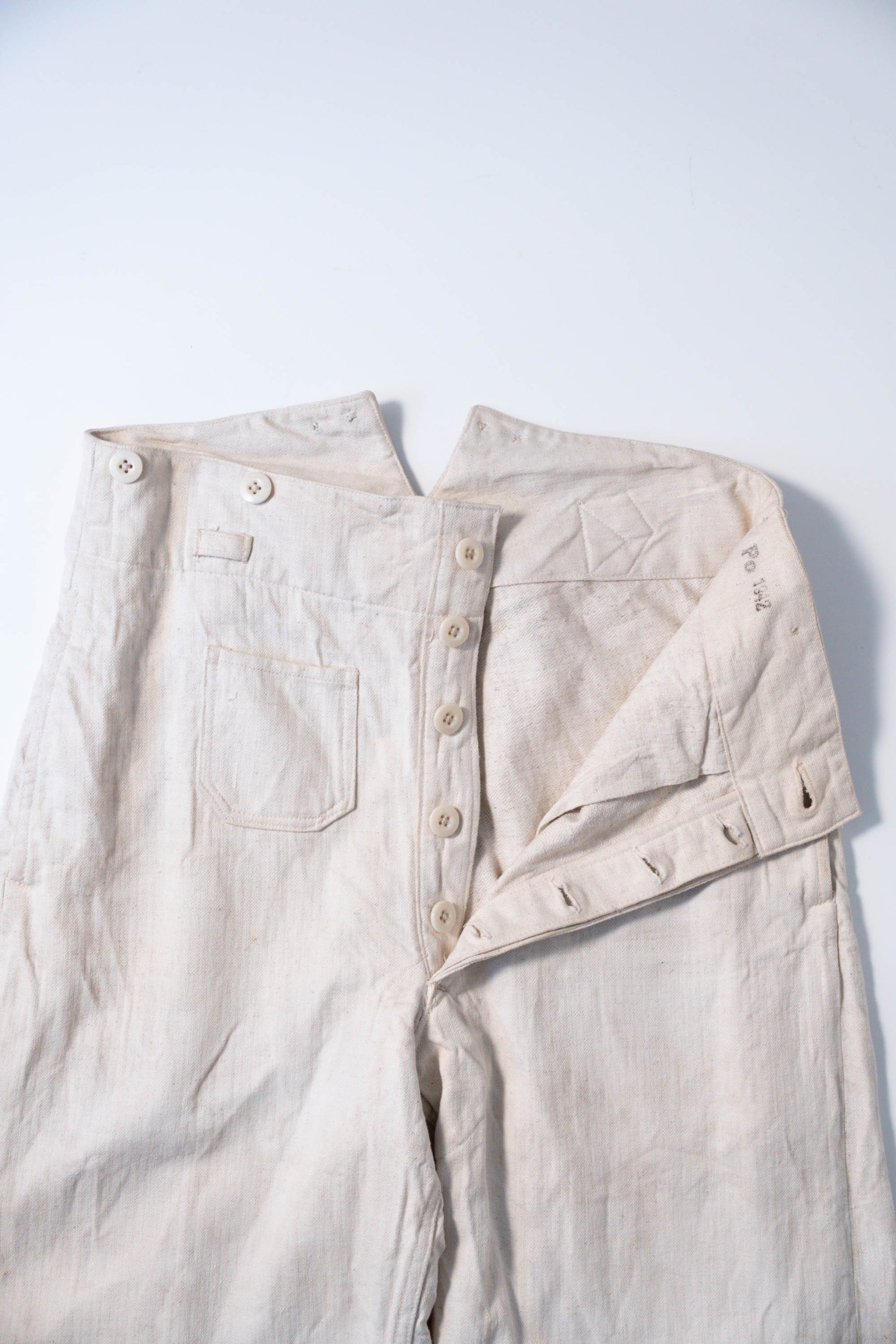 - Avec le début de la guerre en 1939, les importations de coton depuis l'étranger ont pratiquement cessé, et l'Allemagne a encouragé la culture du lin (flax) dans le cadre de sa politique d'autarcie (Autarkie) afin de remplacer le coton. Suite à ce changement de matière première, au début de l'année 1940, les pantalons en lin (flax) à chevrons (HBT) ont été officiellement adoptés à la place des pantalons traditionnels en coton brut. Le tissage HBT, avec ses chevrons qui resserrent le tissu tout en le rendant léger, et sa capacité à sécher rapidement même lorsqu'il est exposé à l'air marin et aux huiles, a été jugé idéal pour le travail sur le pont. Comme l'indique le tampon « Po 1942 », cet article a été fabriqué en 1942. Il s'agit d'un modèle de spécification moyenne à tardive, fabriqué pendant la période de transition entre la refonte et le passage à la production de masse. Le lin HBT tissé à haute densité possède un toucher unique et est un matériau pratique qui sèche rapidement et ne colle pas à la peau, même lorsqu'il est imprégné de sueur ou d'air marin.