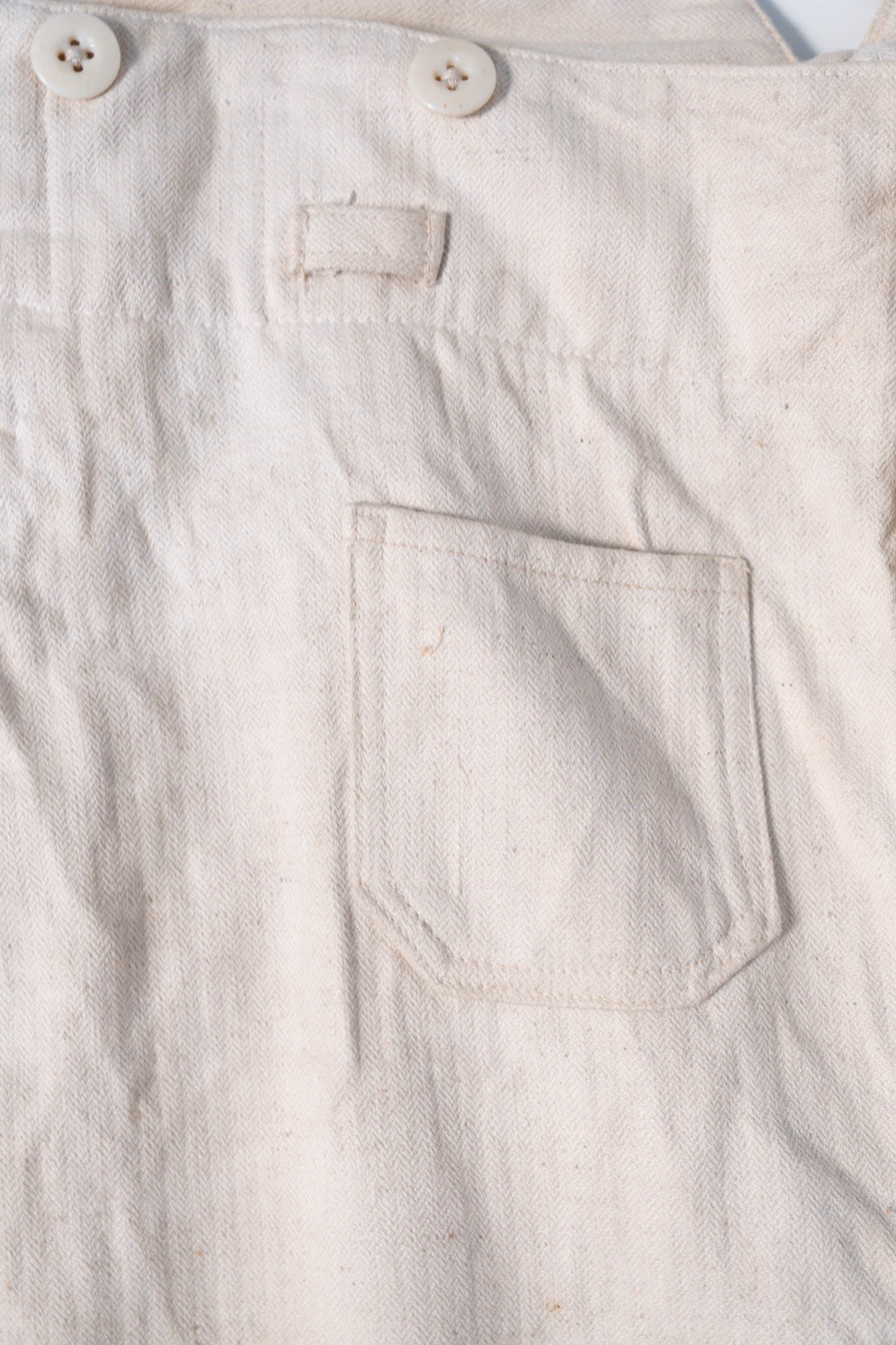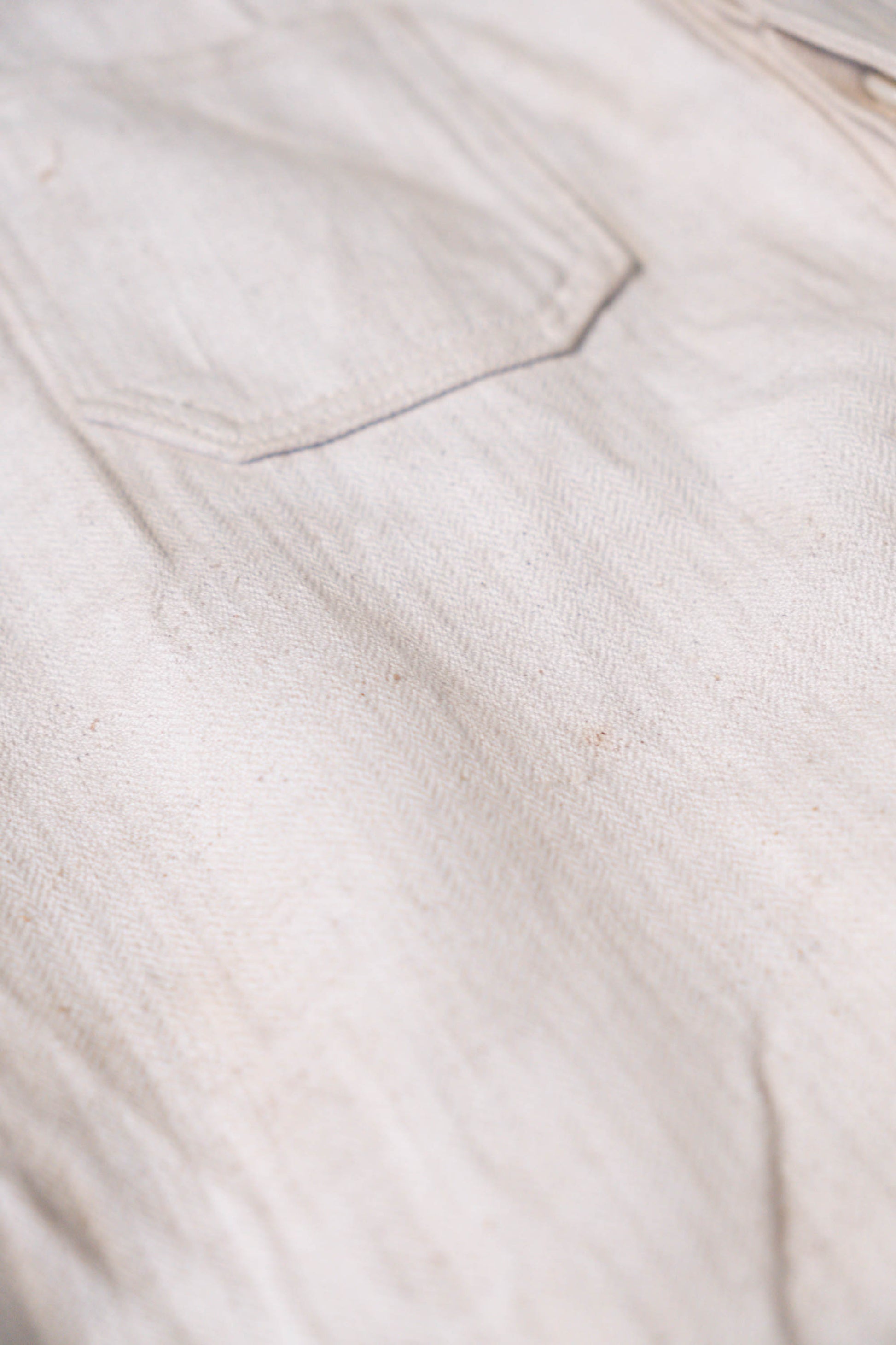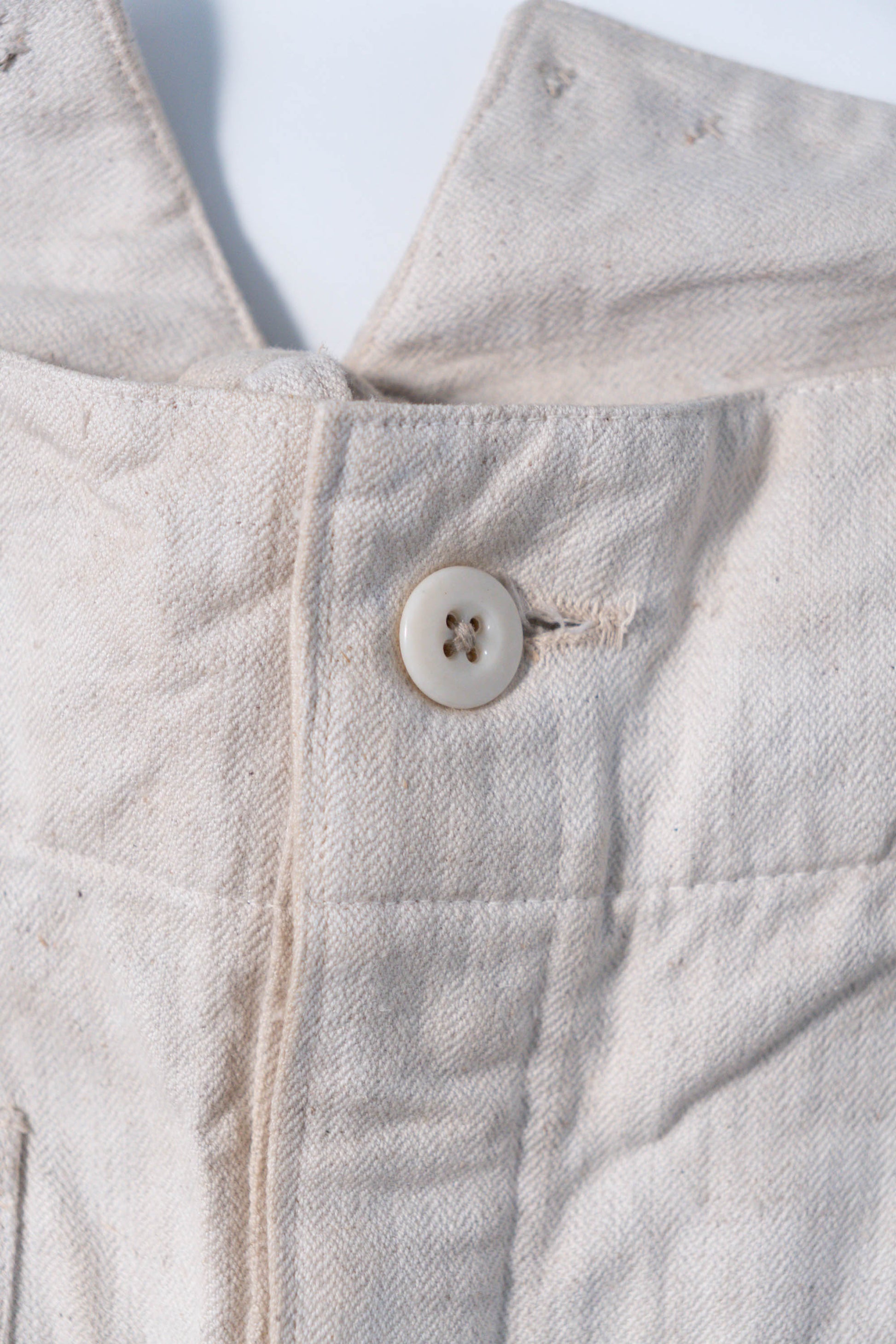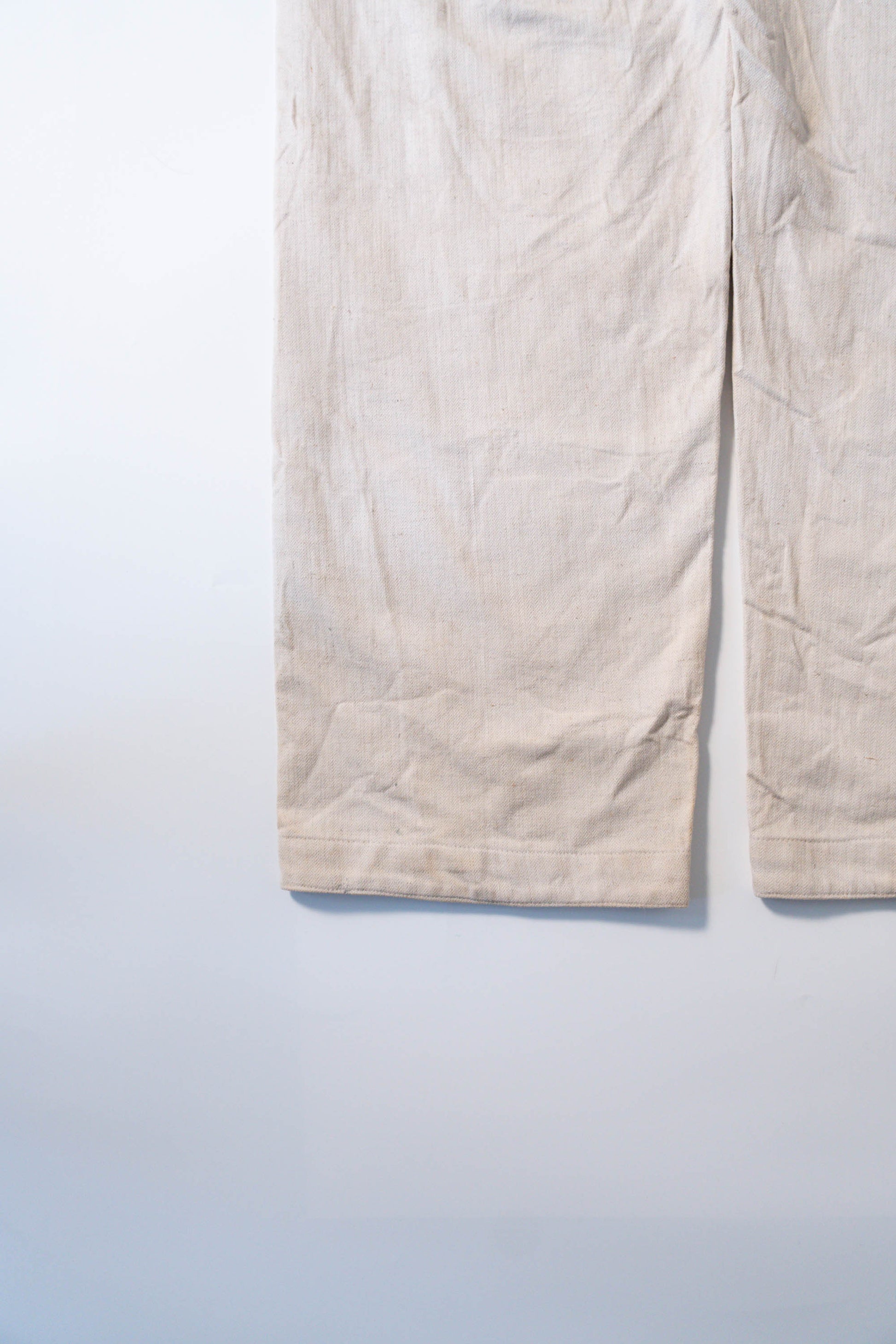 - Avec le début de la guerre en 1939, les importations de coton depuis l'étranger ont pratiquement cessé, et l'Allemagne a encouragé la culture du lin (flax) dans le cadre de sa politique d'autarcie (Autarkie) afin de remplacer le coton. Suite à ce changement de matière première, au début de l'année 1940, les pantalons en lin (flax) à chevrons (HBT) ont été officiellement adoptés à la place des pantalons traditionnels en coton brut. Le tissage HBT, avec ses chevrons qui resserrent le tissu tout en le rendant léger, et sa capacité à sécher rapidement même lorsqu'il est exposé à l'air marin et aux huiles, a été jugé idéal pour le travail sur le pont. Comme l'indique le tampon « Po 1942 », cet article a été fabriqué en 1942. Il s'agit d'un modèle de spécification moyenne à tardive, fabriqué pendant la période de transition entre la refonte et le passage à la production de masse. Le lin HBT tissé à haute densité possède un toucher unique et est un matériau pratique qui sèche rapidement et ne colle pas à la peau, même lorsqu'il est imprégné de sueur ou d'air marin.