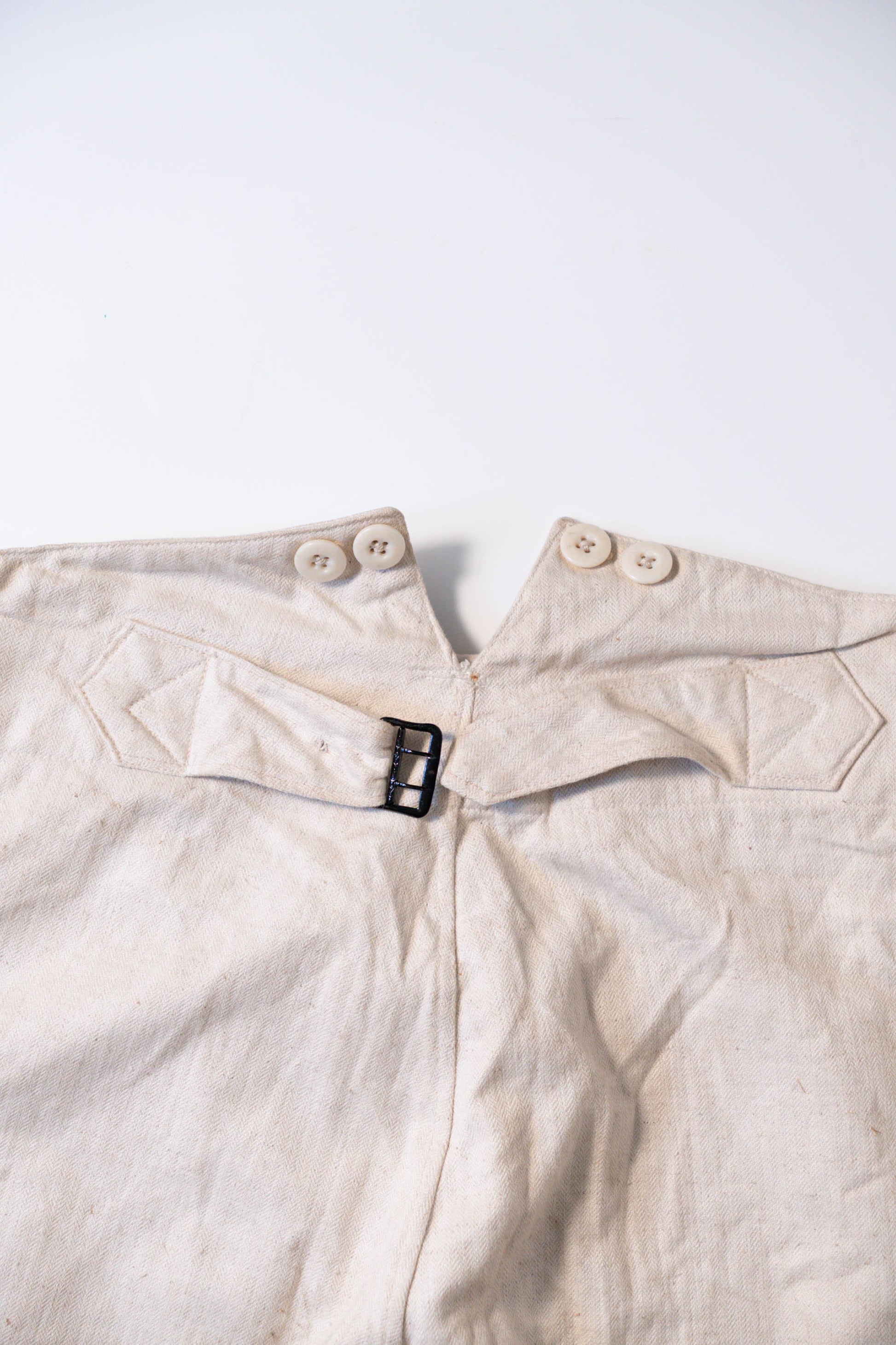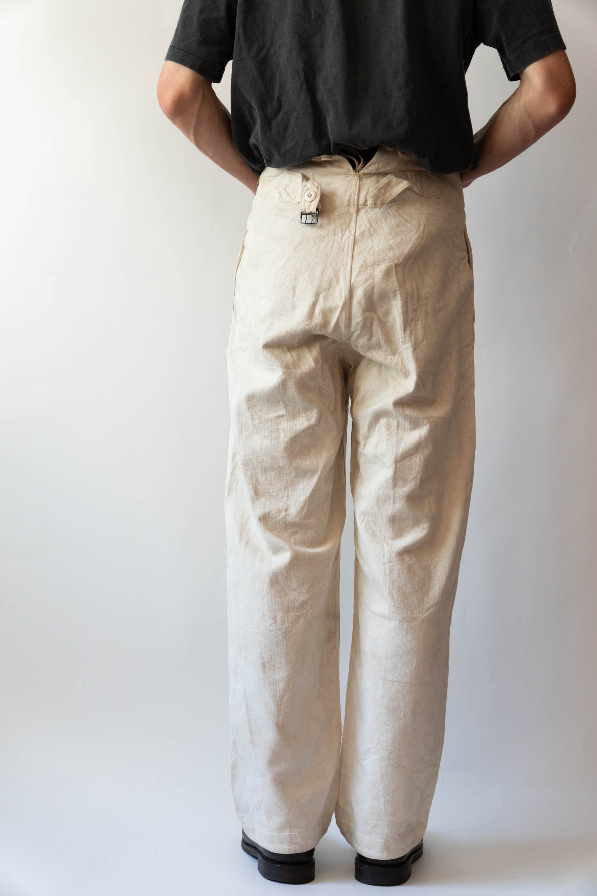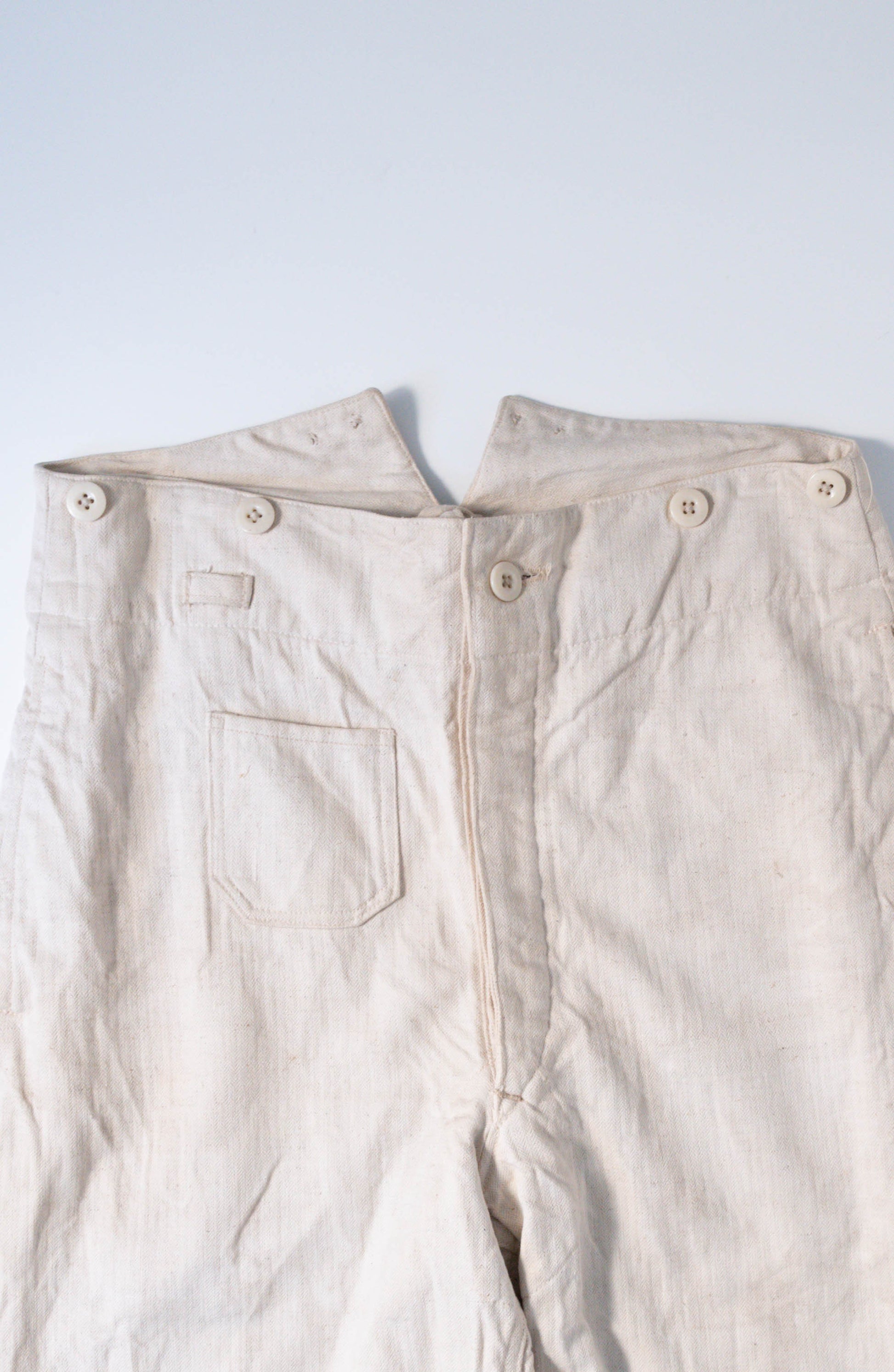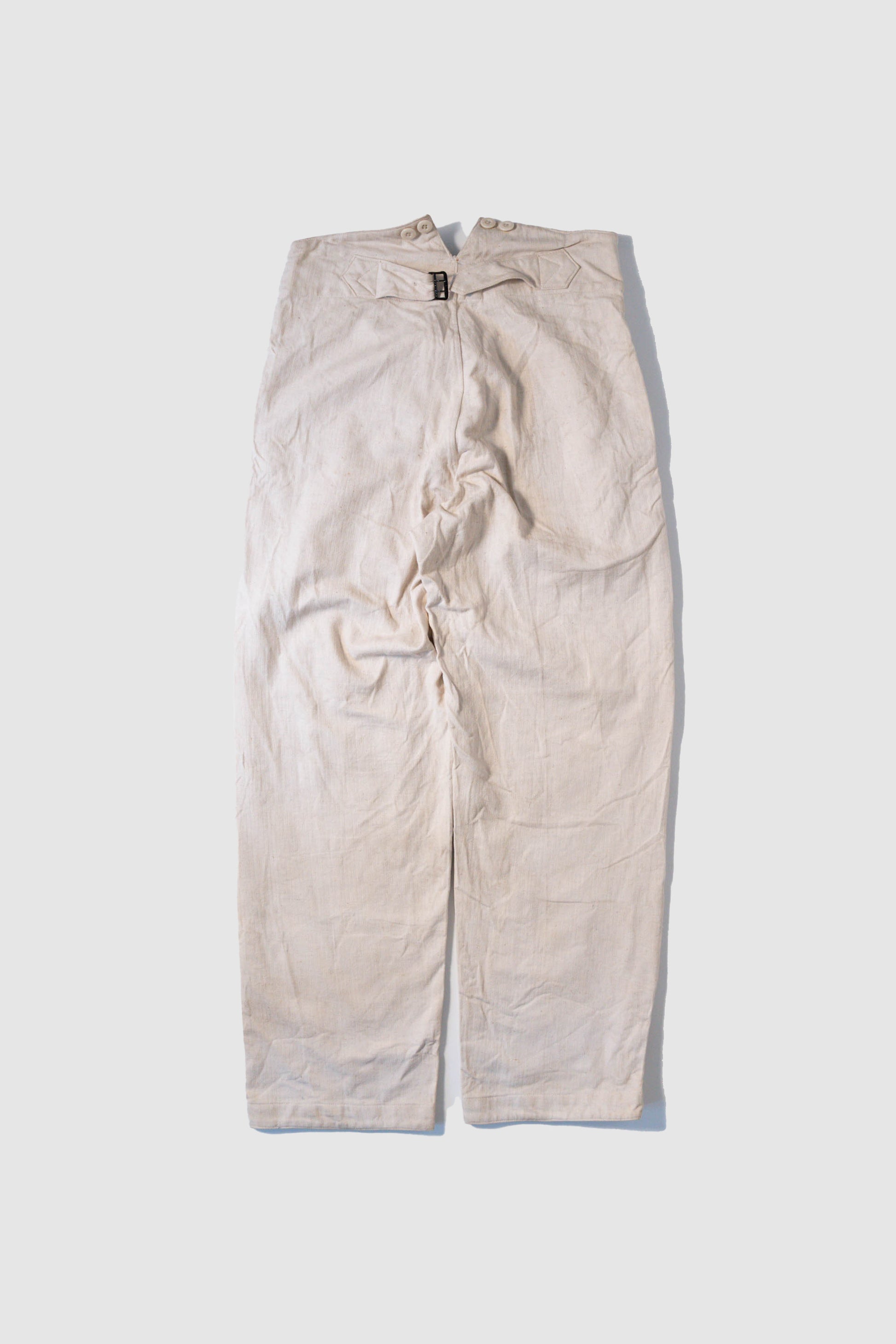 - Avec le début de la guerre en 1939, les importations de coton depuis l'étranger ont pratiquement cessé, et l'Allemagne a encouragé la culture du lin (flax) dans le cadre de sa politique d'autarcie (Autarkie) afin de remplacer le coton. Suite à ce changement de matière première, au début de l'année 1940, les pantalons en lin (flax) à chevrons (HBT) ont été officiellement adoptés à la place des pantalons traditionnels en coton brut. Le tissage HBT, avec ses chevrons qui resserrent le tissu tout en le rendant léger, et sa capacité à sécher rapidement même lorsqu'il est exposé à l'air marin et aux huiles, a été jugé idéal pour le travail sur le pont. Comme l'indique le tampon « Po 1942 », cet article a été fabriqué en 1942. Il s'agit d'un modèle de spécification moyenne à tardive, fabriqué pendant la période de transition entre la refonte et le passage à la production de masse. Le lin HBT tissé à haute densité possède un toucher unique et est un matériau pratique qui sèche rapidement et ne colle pas à la peau, même lorsqu'il est imprégné de sueur ou d'air marin.