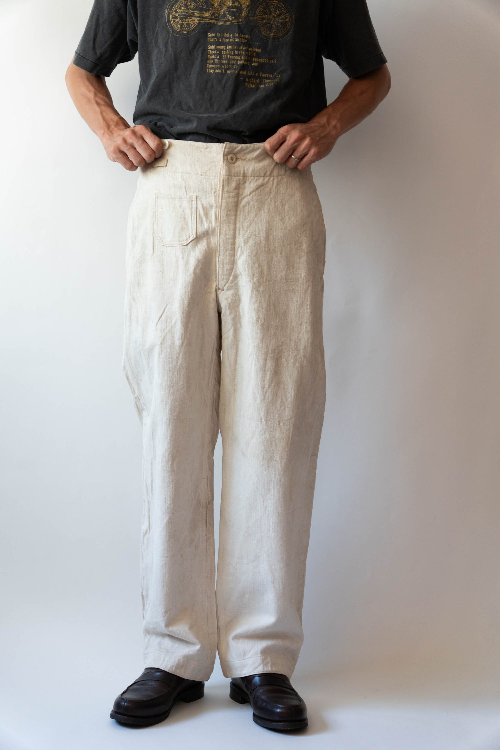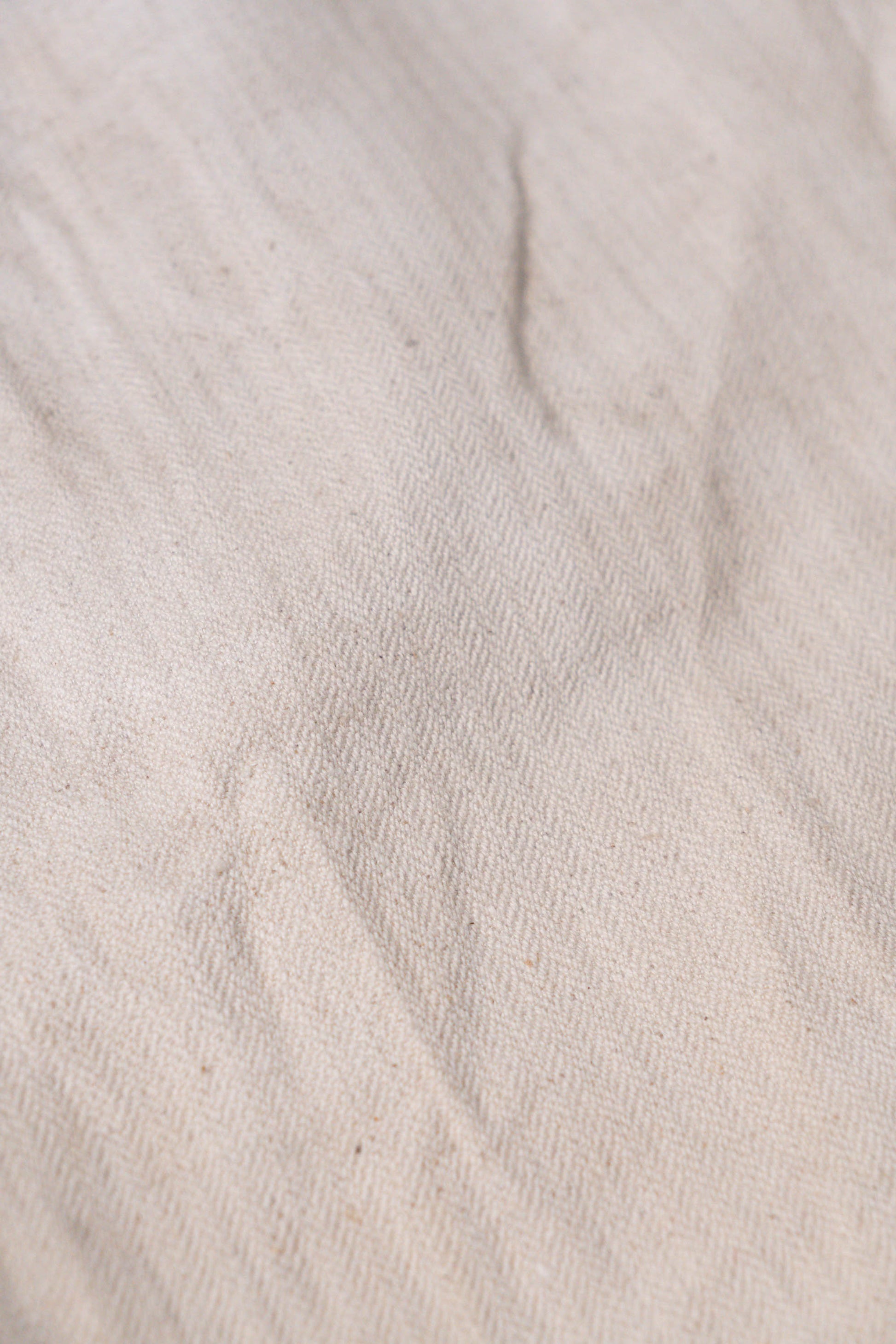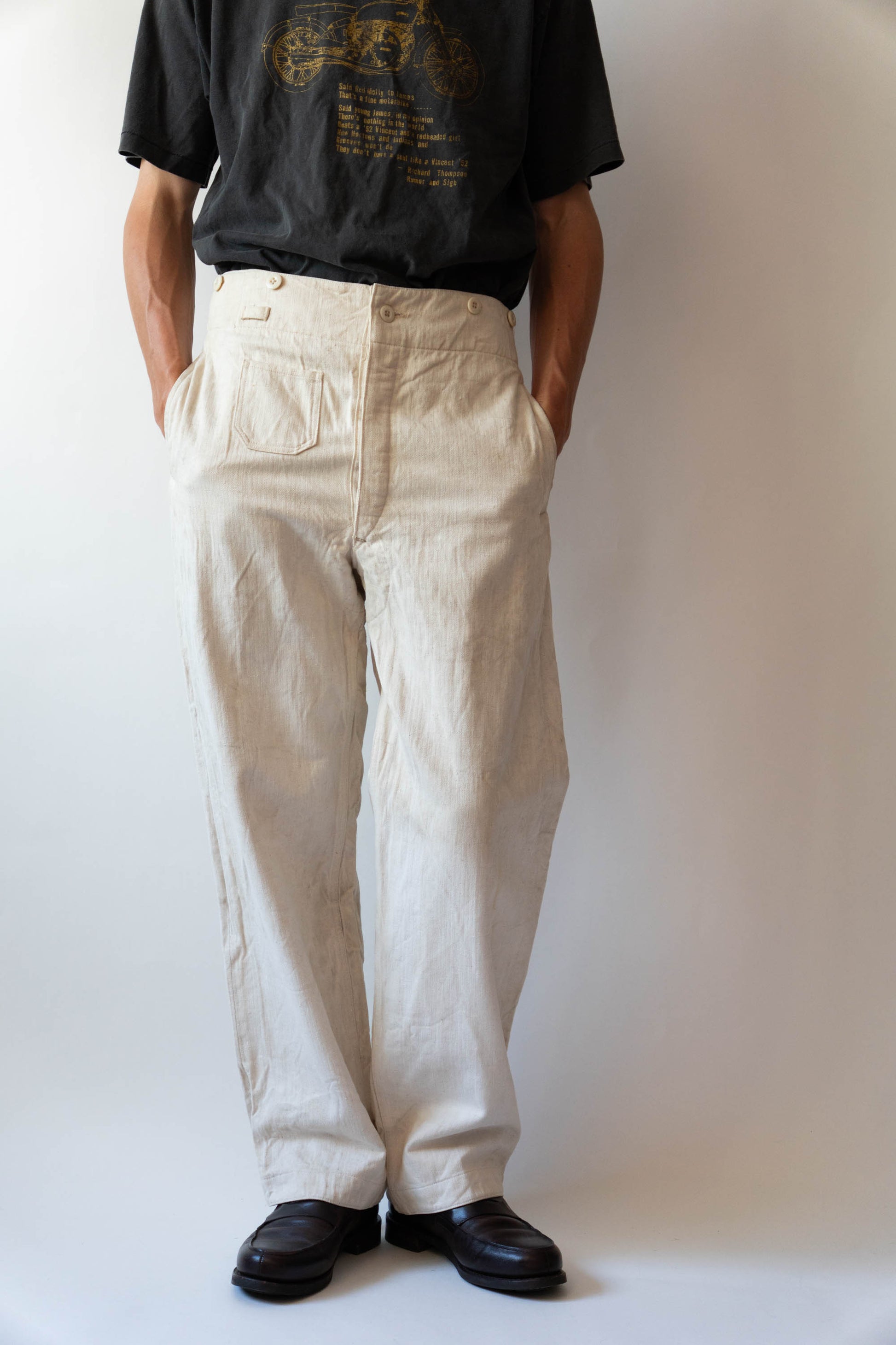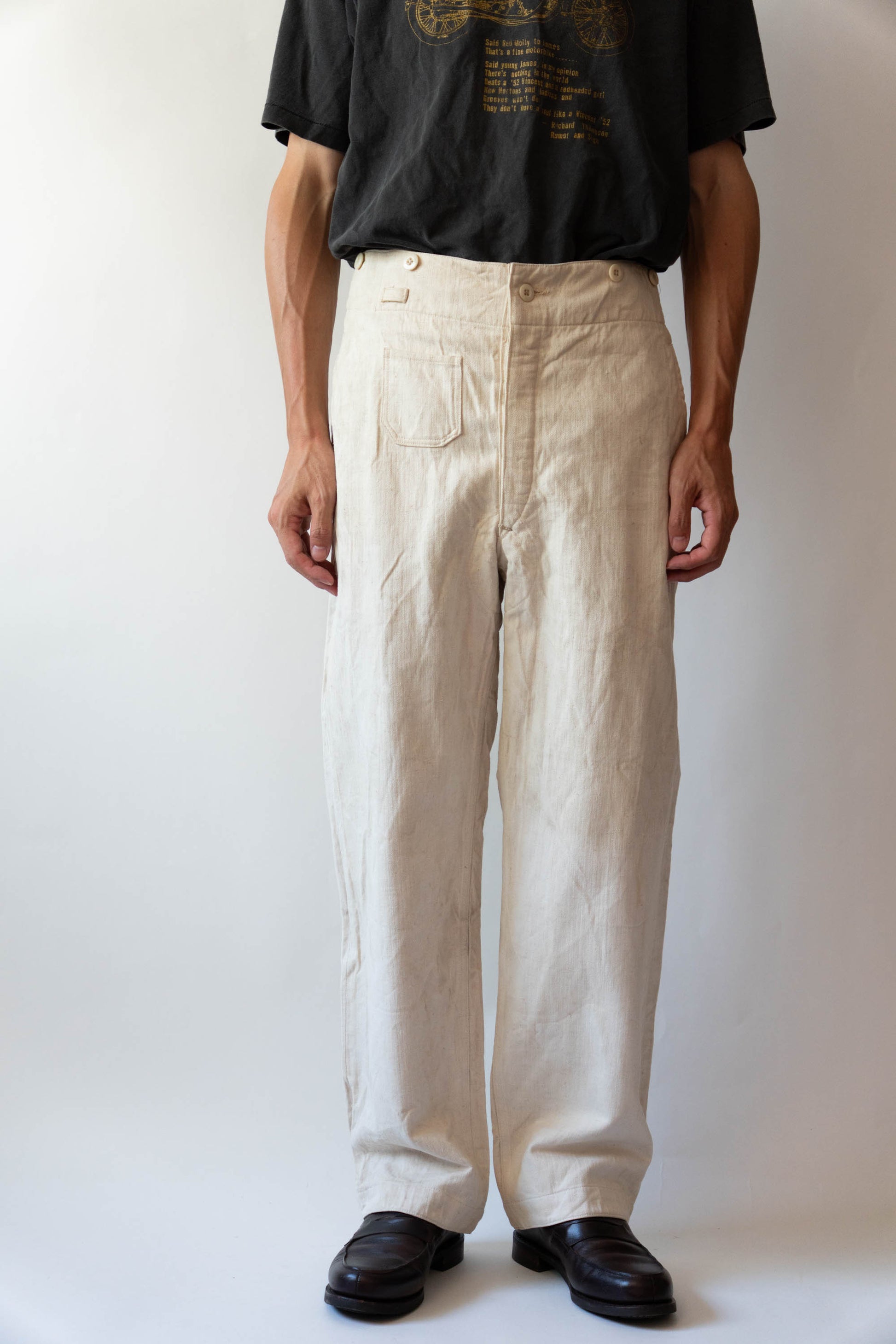 - Avec le début de la guerre en 1939, les importations de coton depuis l'étranger ont pratiquement cessé, et l'Allemagne a encouragé la culture du lin (flax) dans le cadre de sa politique d'autarcie (Autarkie) afin de remplacer le coton. Suite à ce changement de matière première, au début de l'année 1940, les pantalons en lin (flax) à chevrons (HBT) ont été officiellement adoptés à la place des pantalons traditionnels en coton brut. Le tissage HBT, avec ses chevrons qui resserrent le tissu tout en le rendant léger, et sa capacité à sécher rapidement même lorsqu'il est exposé à l'air marin et aux huiles, a été jugé idéal pour le travail sur le pont. Comme l'indique le tampon « Po 1942 », cet article a été fabriqué en 1942. Il s'agit d'un modèle de spécification moyenne à tardive, fabriqué pendant la période de transition entre la refonte et le passage à la production de masse. Le lin HBT tissé à haute densité possède un toucher unique et est un matériau pratique qui sèche rapidement et ne colle pas à la peau, même lorsqu'il est imprégné de sueur ou d'air marin.