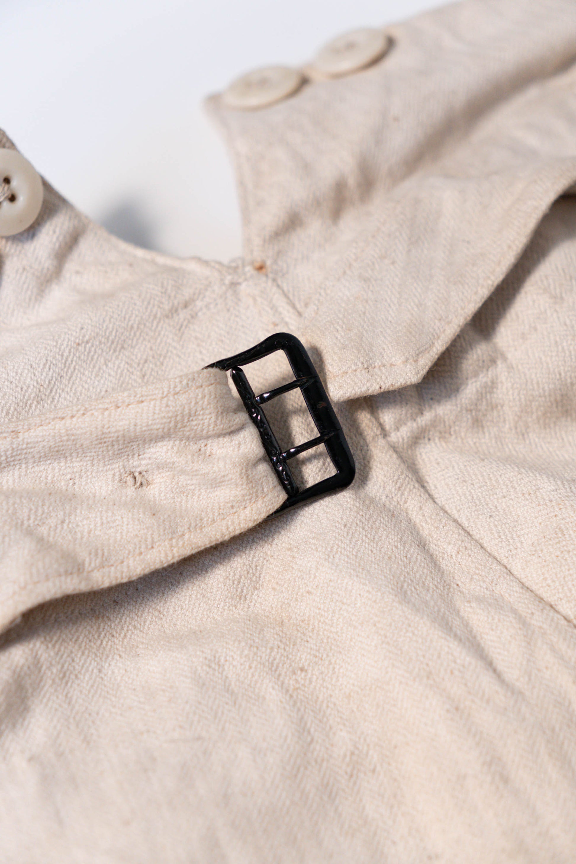 - Le tissu utilisé est un lin twill à chevrons (HBT) tissé à haute densité. Il s'agit d'un tissu d'épaisseur moyenne, confortable à porter pendant trois saisons, sauf en hiver. Les boutons sont en bakélite militaire mat. Le devant est équipé d'une poche à montre et d'un support pour chaîne de montre, caractéristiques de ce modèle. Le dos est doté d'une boucle à sangles, ce qui lui confère un design simple mais pratique, typiquement allemand.
