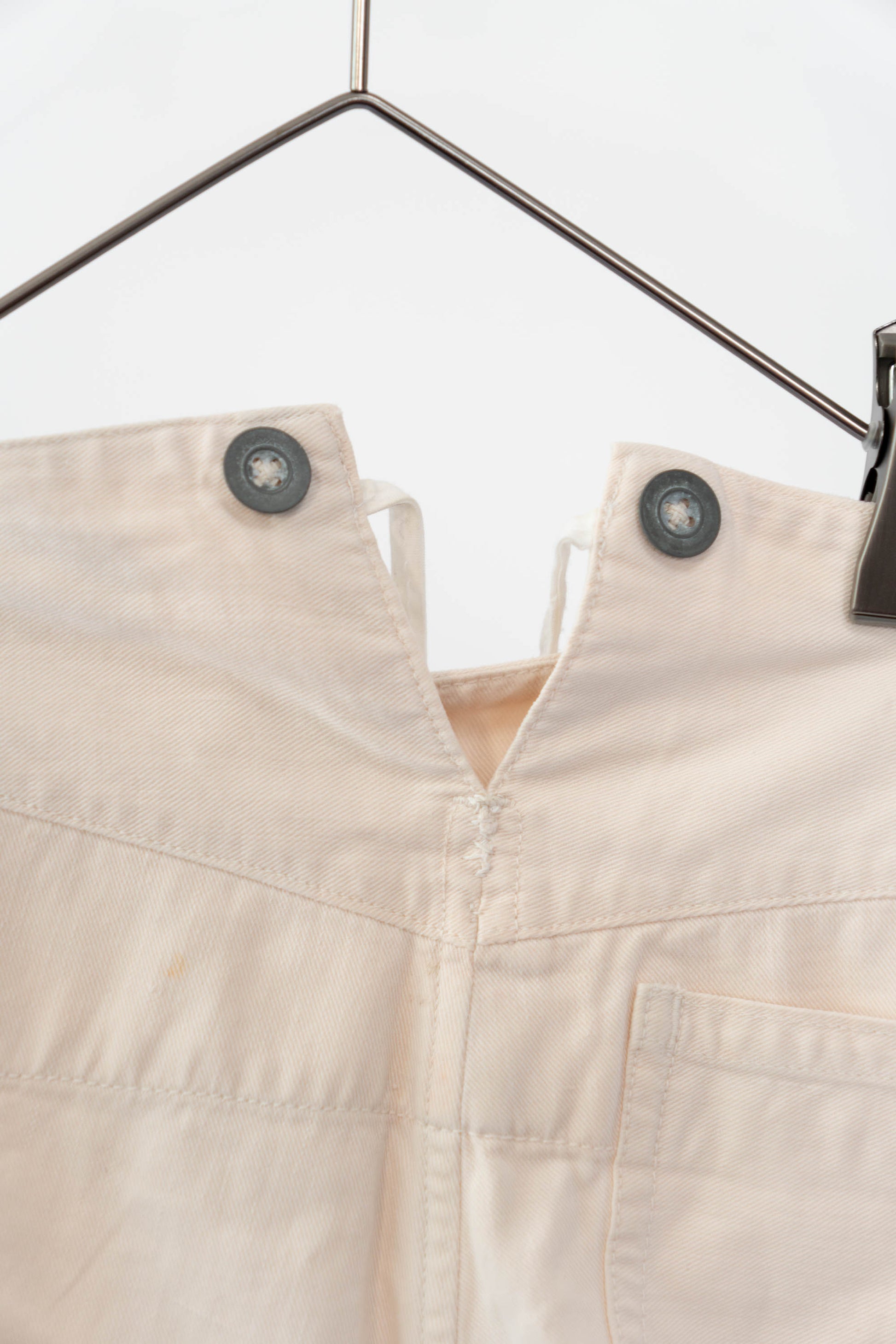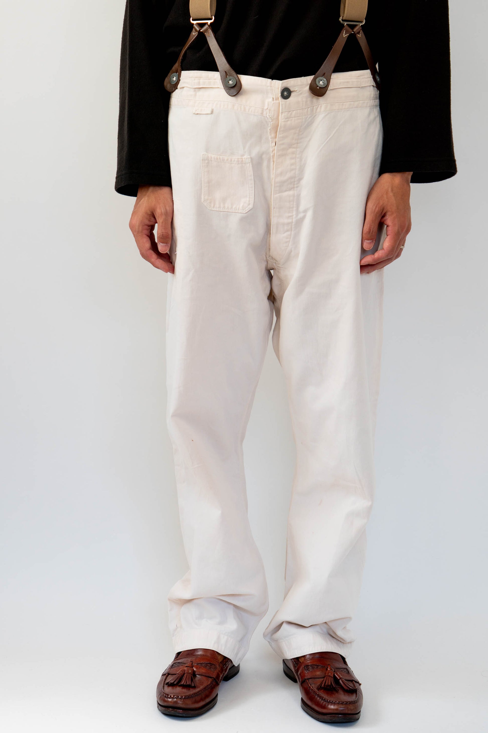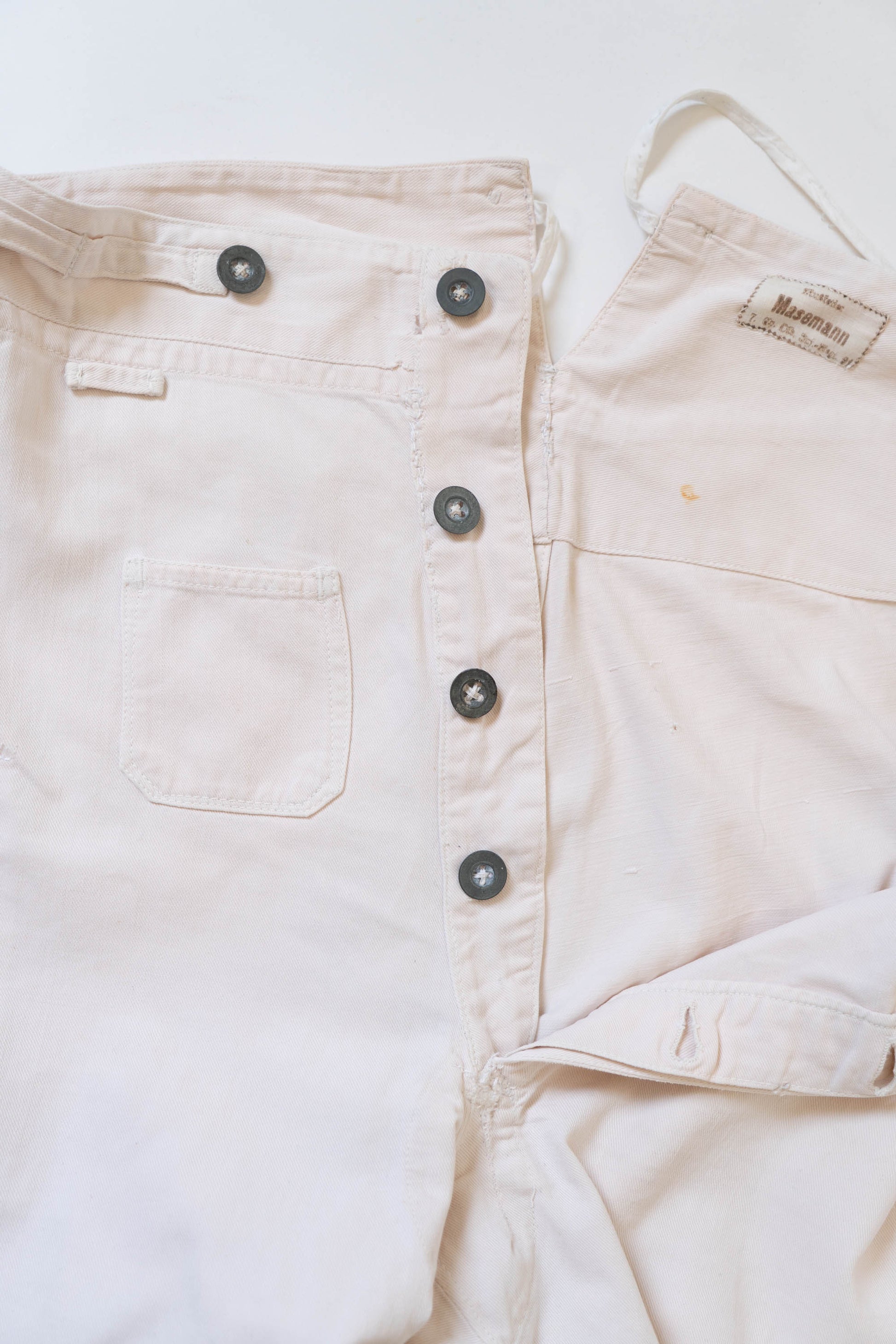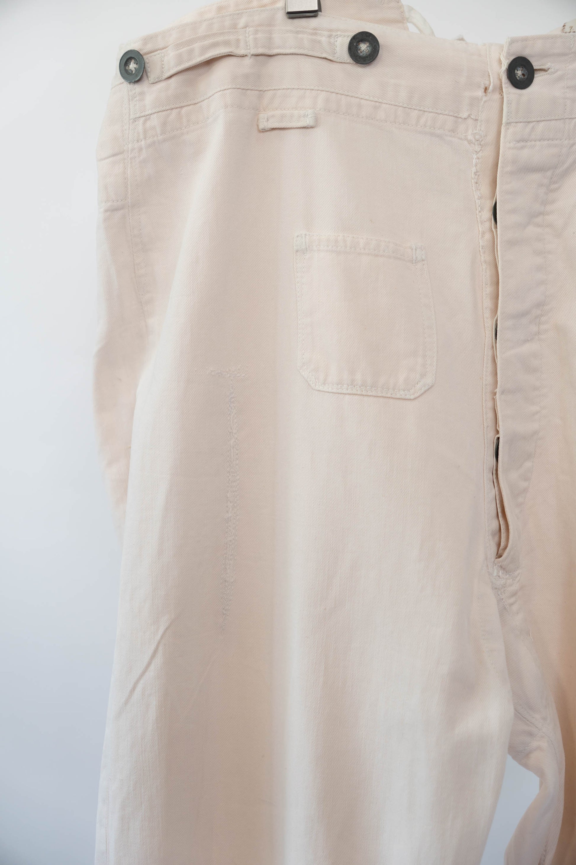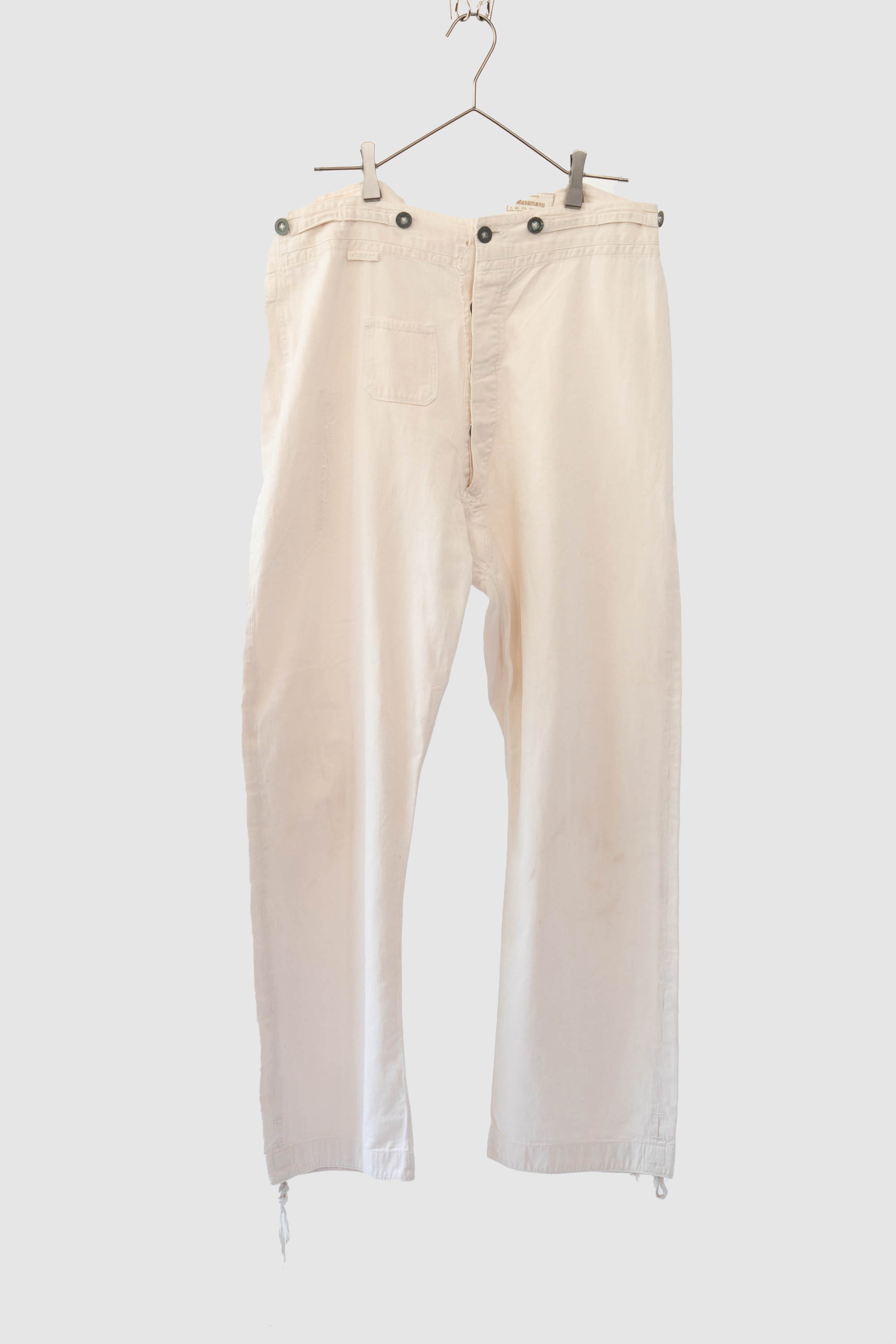Le devant droit, la braguette et l'entrejambe ont été réparés. Les boutons en métal blanc d'origine sont tous présents, le tampon et l'étiquette à l'intérieur de la taille sont encore légèrement imprimés, et le cordon de serrage à l'ourlet et à la taille est encore en bon état.