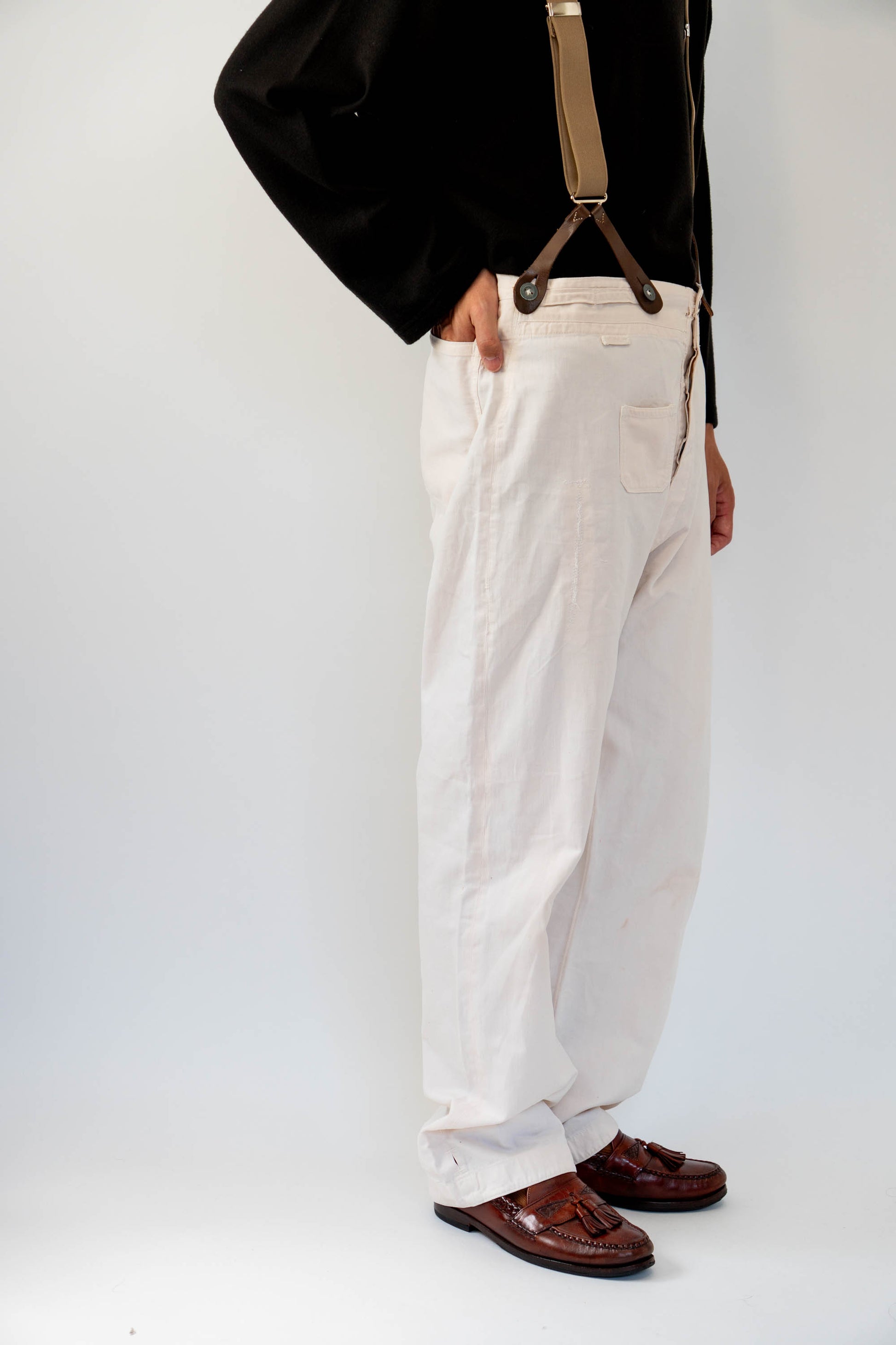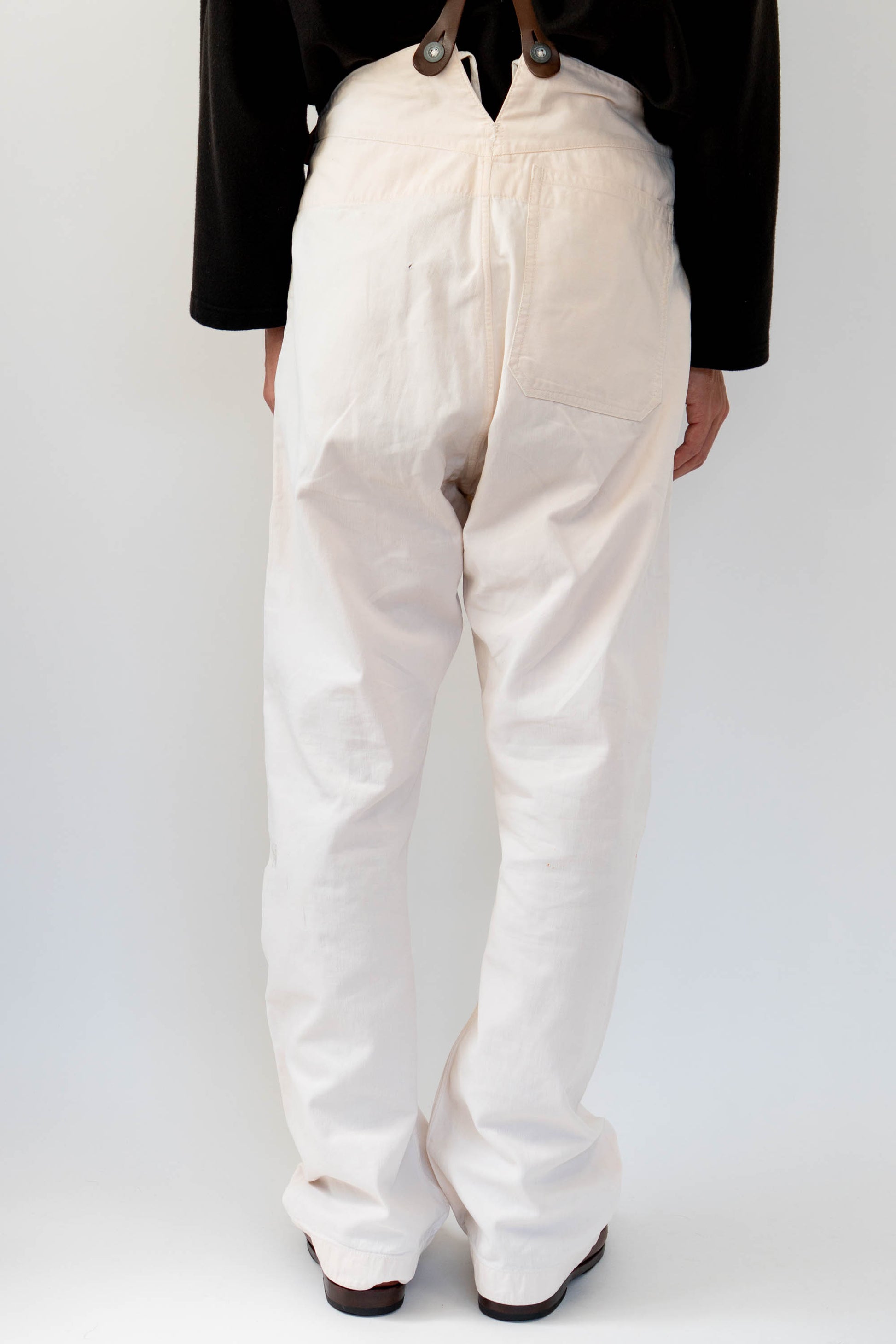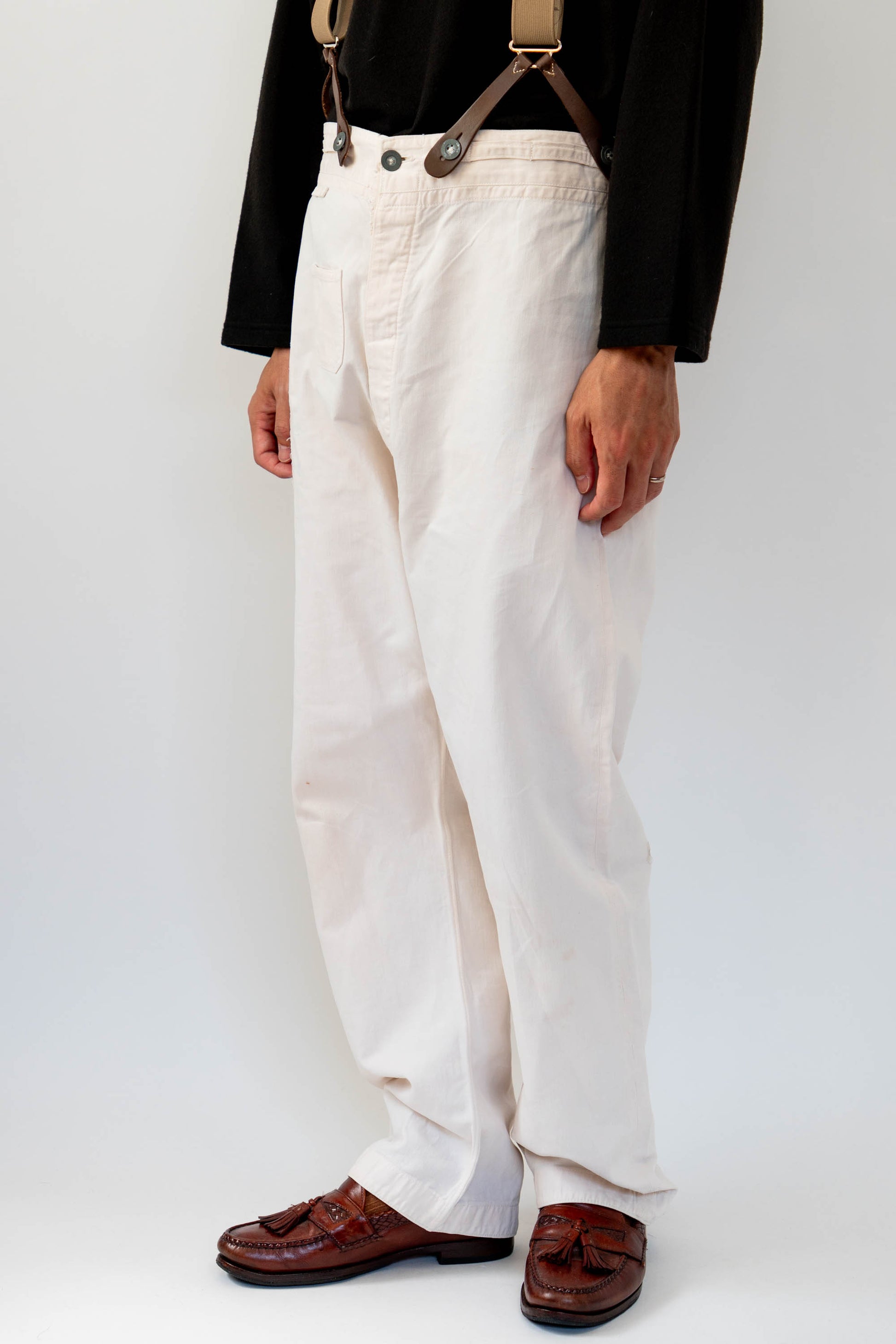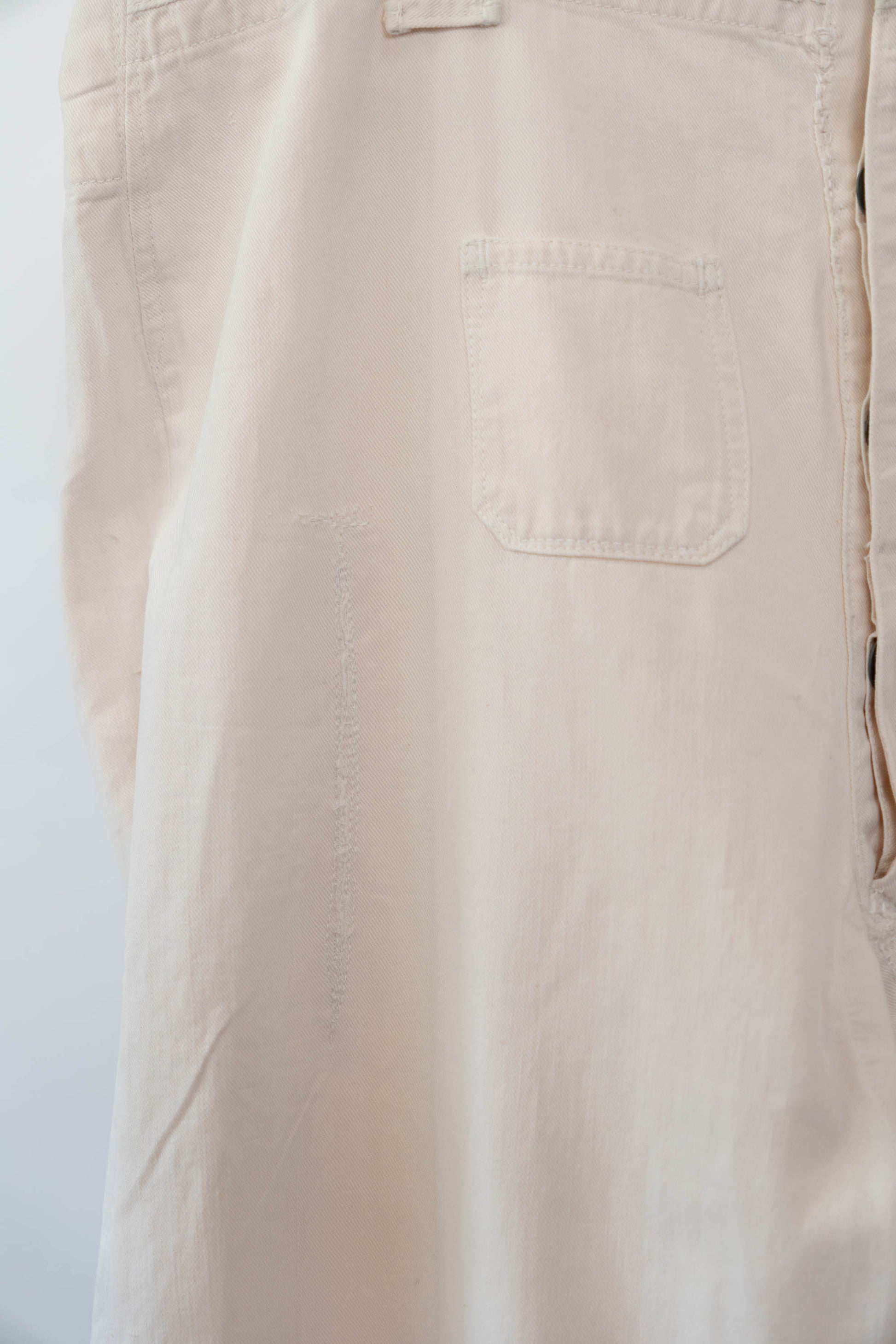 Le devant droit, la braguette et l'entrejambe ont été réparés. Les boutons en métal blanc d'origine sont tous présents, le tampon et l'étiquette à l'intérieur de la taille sont encore légèrement imprimés, et le cordon de serrage à l'ourlet et à la taille est encore en bon état.