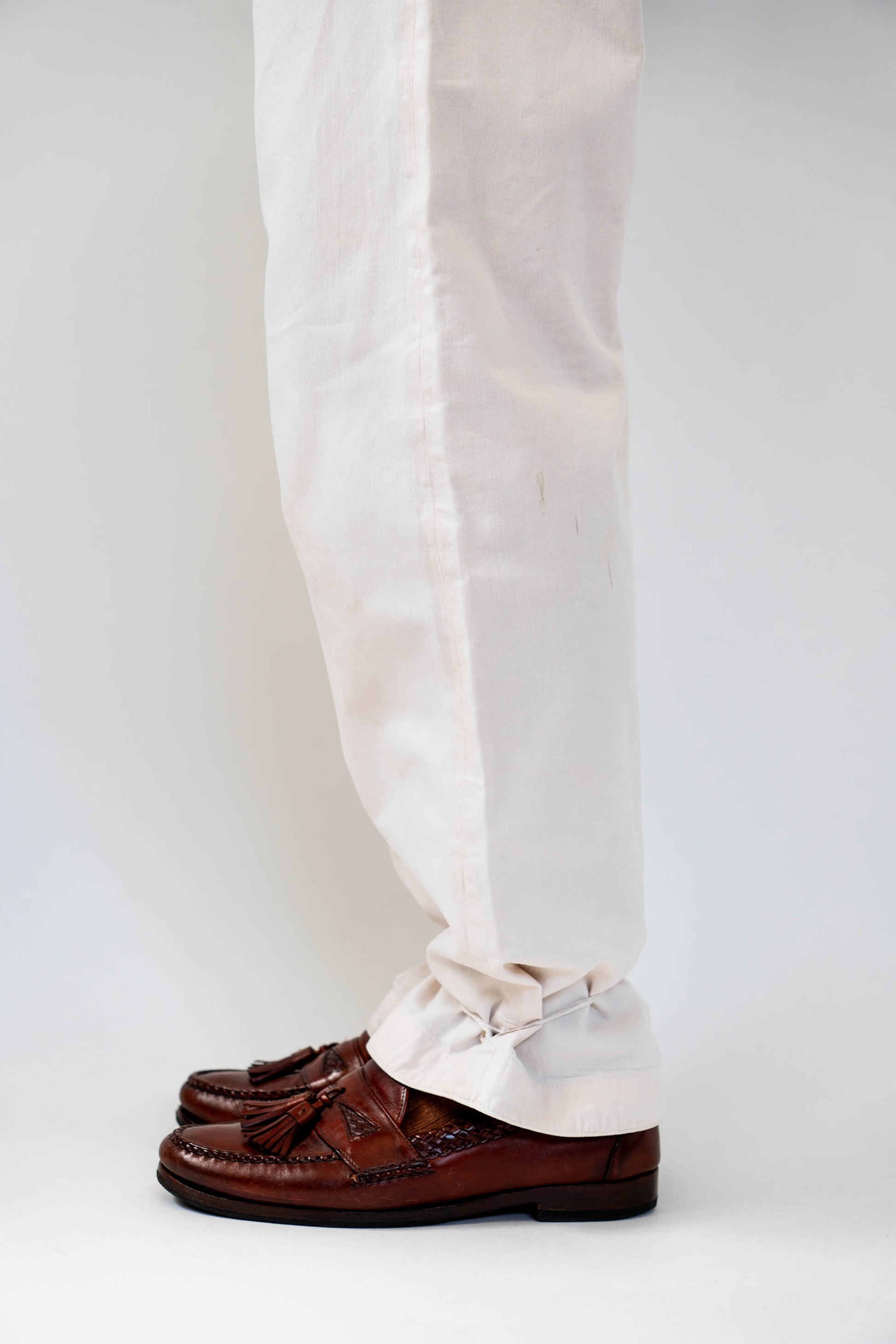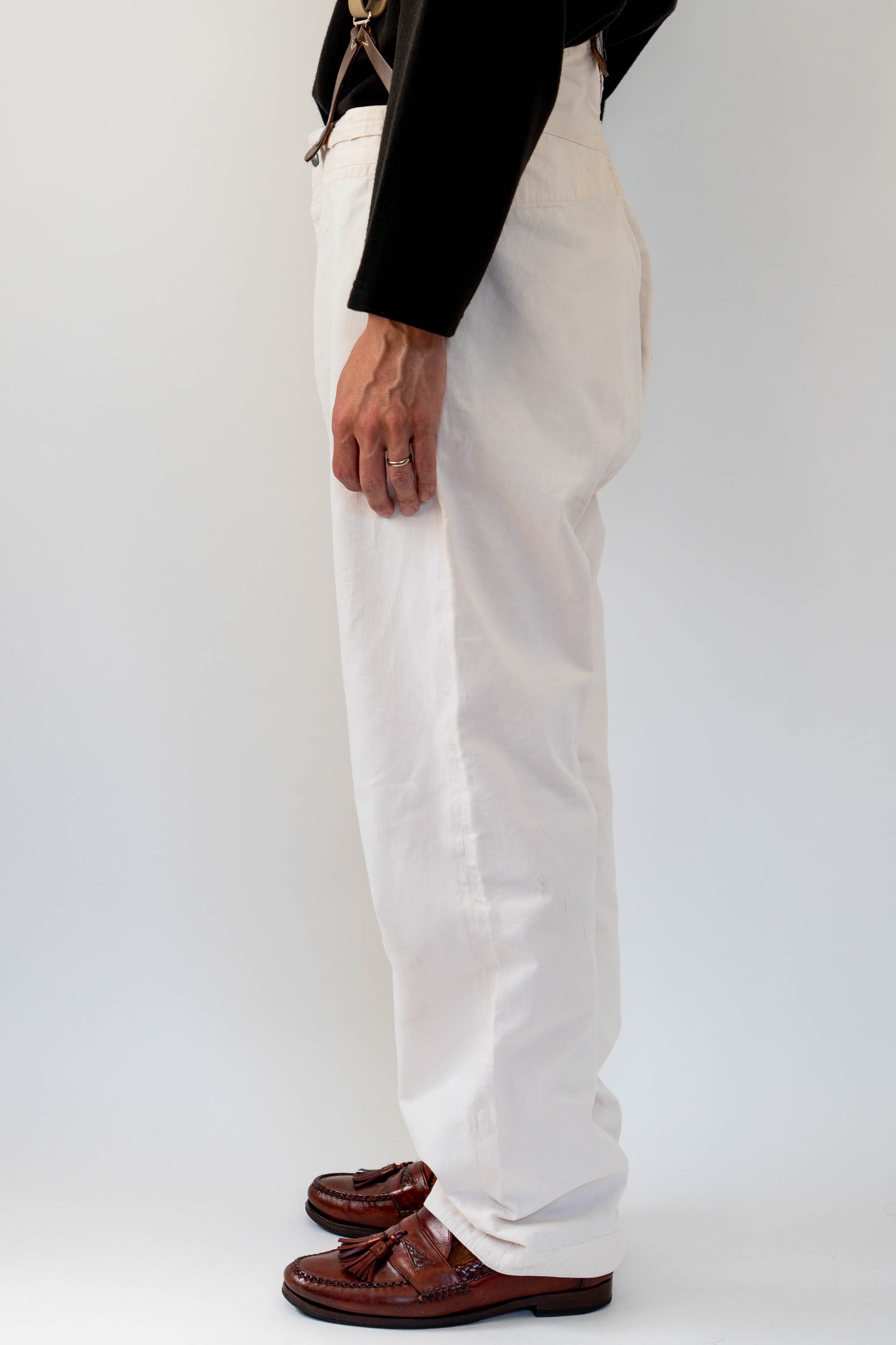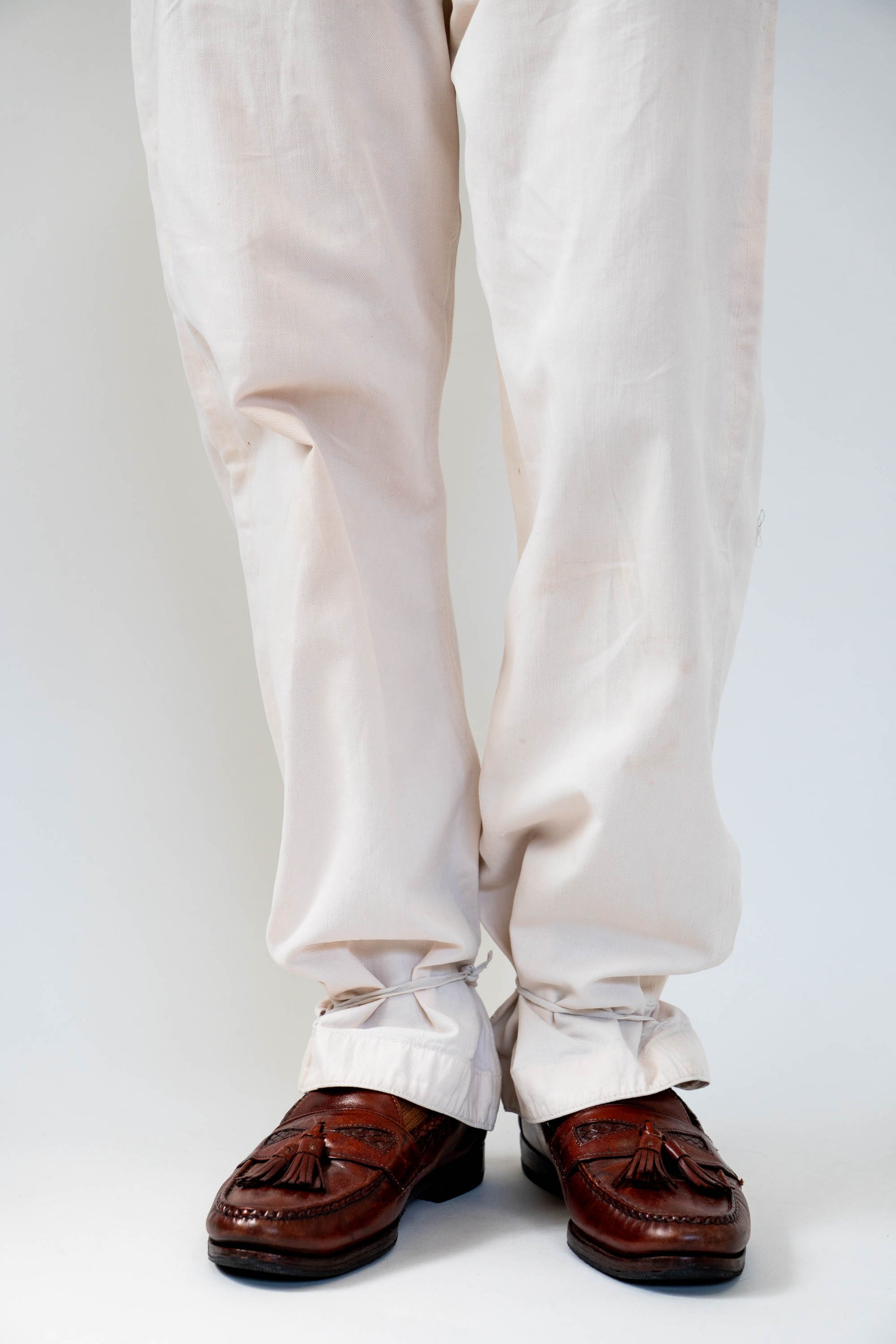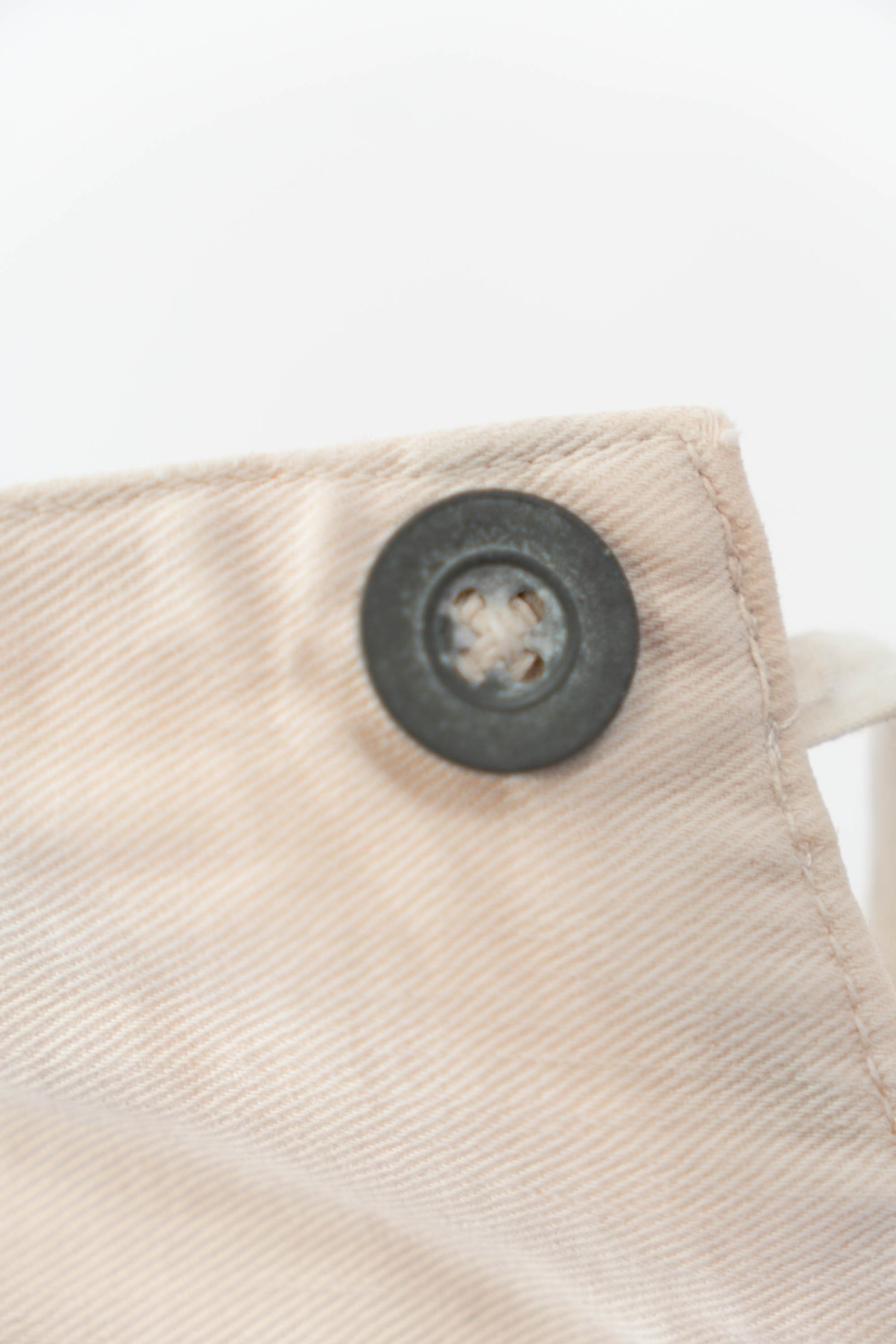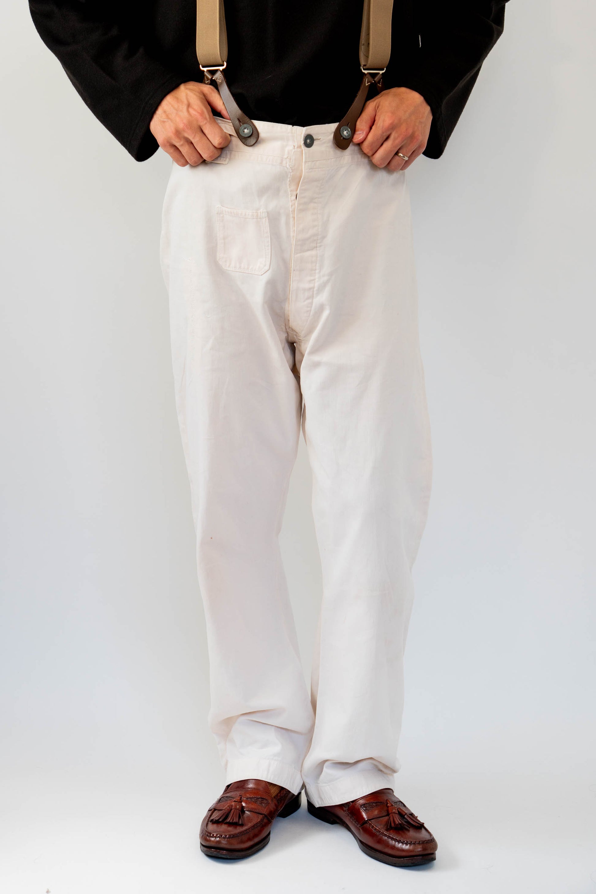 Le devant droit, la braguette et l'entrejambe ont été réparés. Les boutons en métal blanc d'origine sont tous présents, le tampon et l'étiquette à l'intérieur de la taille sont encore légèrement imprimés, et le cordon de serrage à l'ourlet et à la taille est encore en bon état.
