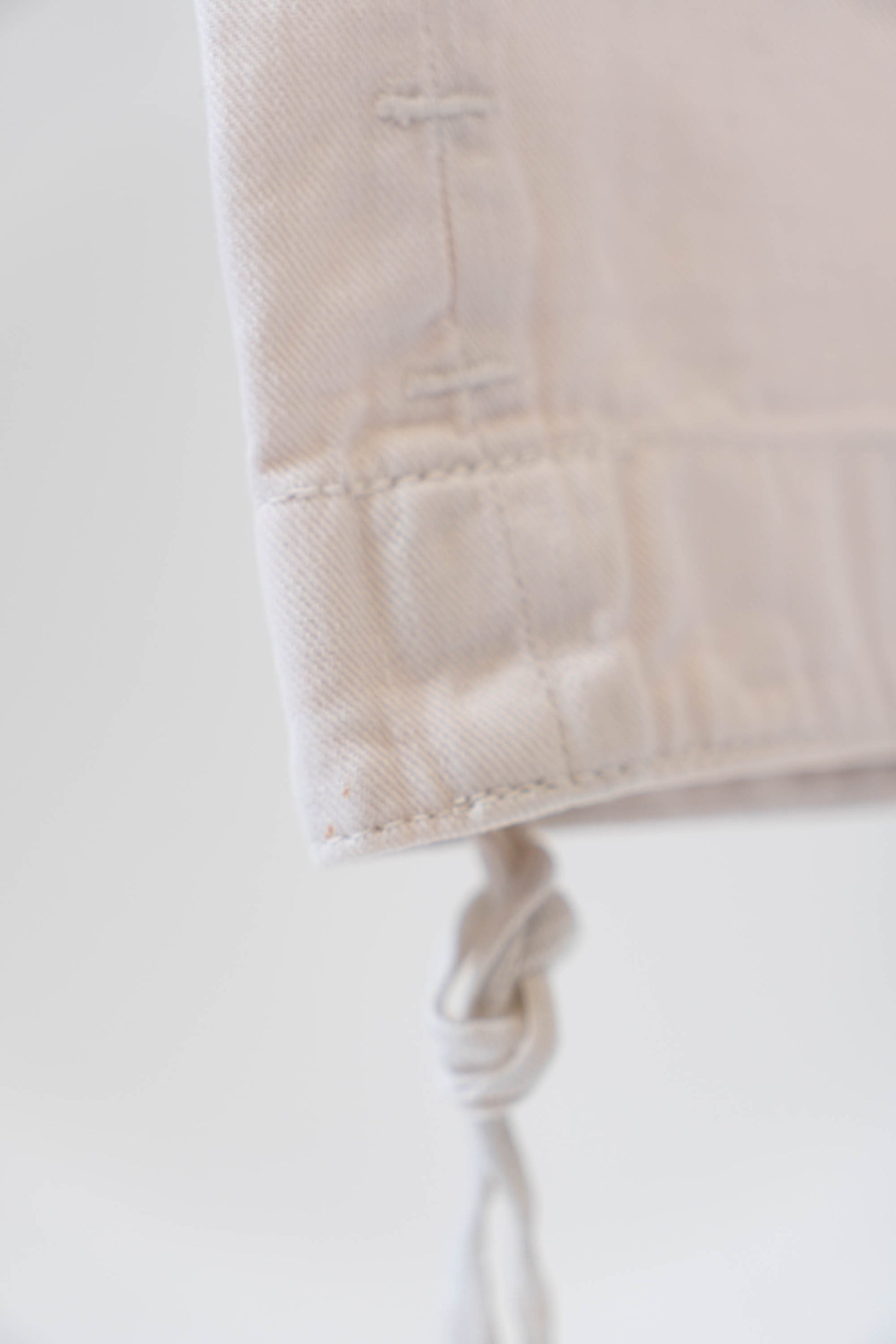La ceinture haute et profonde est dotée de six boutons métalliques et d'une braguette à boutons. Le devant est orné d'une poche gousset et le dos d'une poche plaquée, ce qui lui confère un design simple mais raffiné, avec des détails militaires. Un cordon de serrage est intégré à l'ourlet, un détail pratique qui empêche l'eau et le vent de s'infiltrer lors des travaux difficiles en mer.