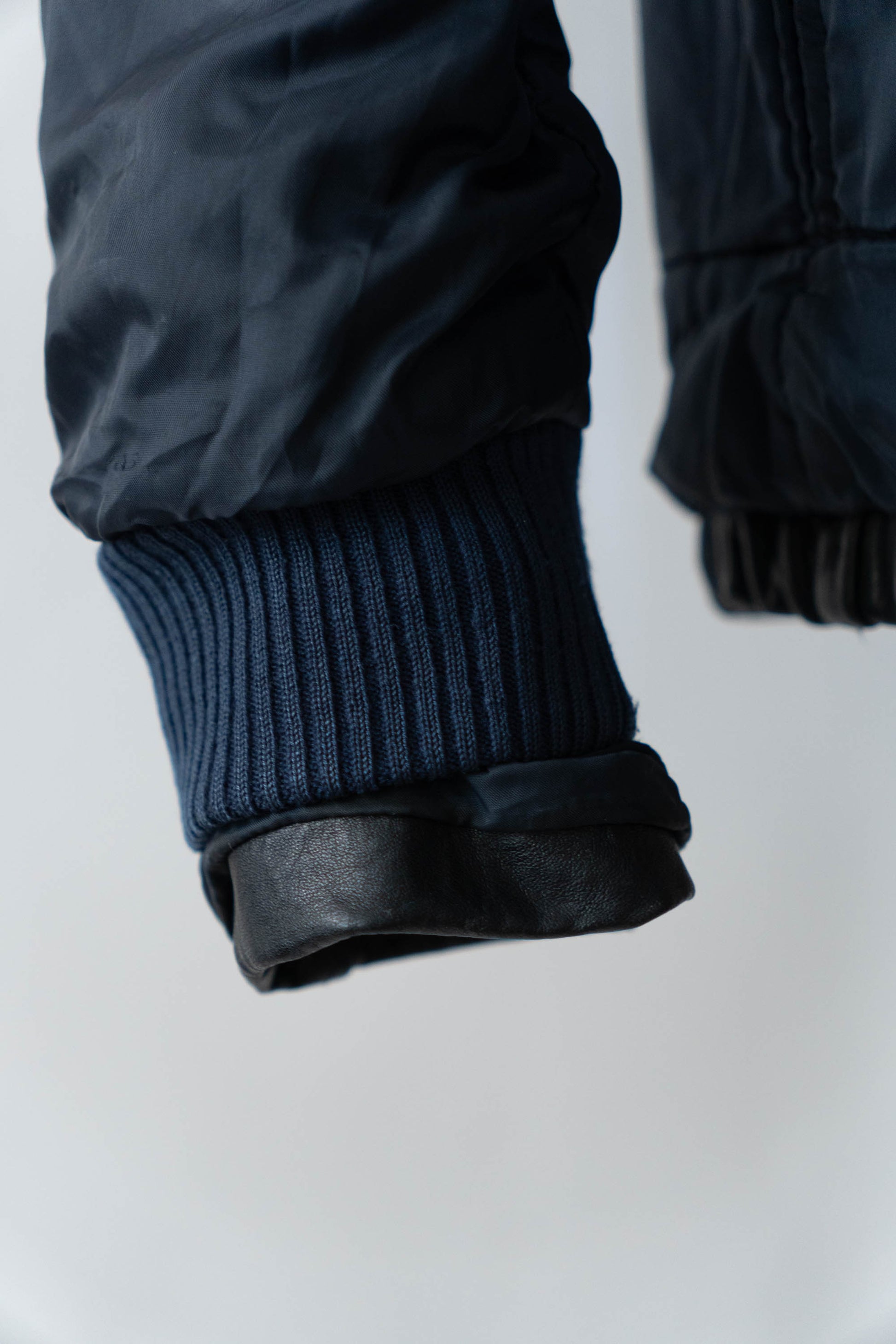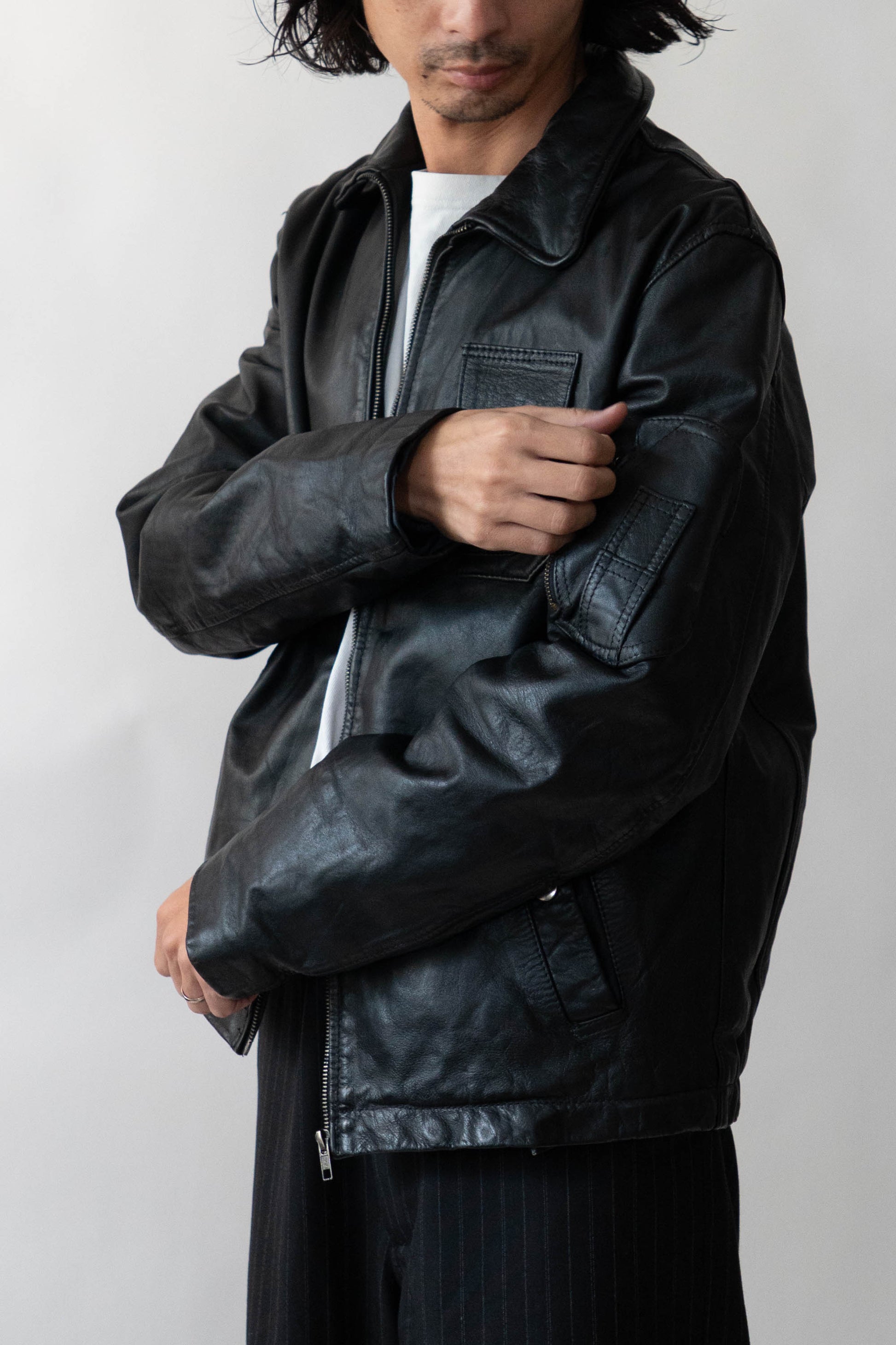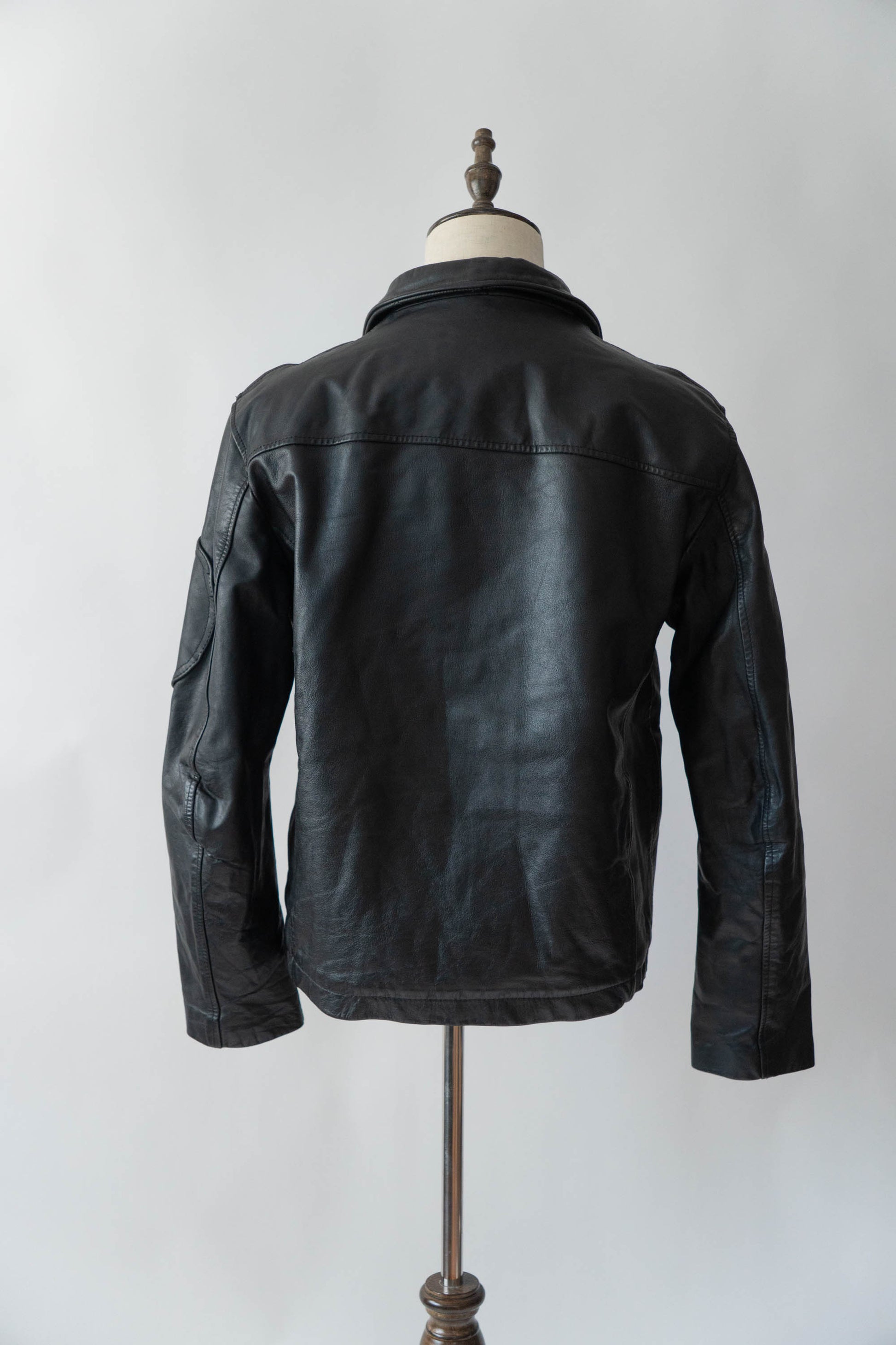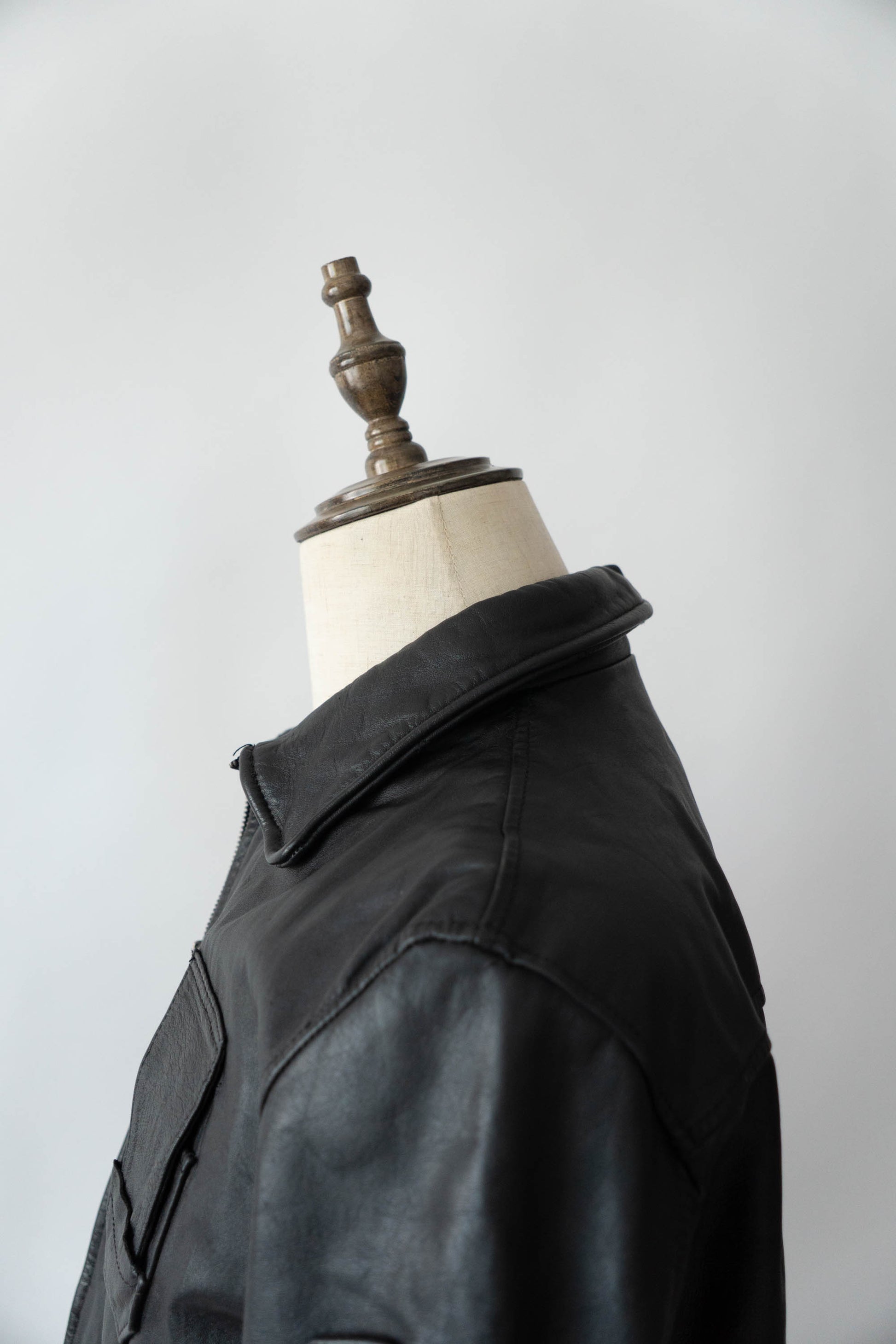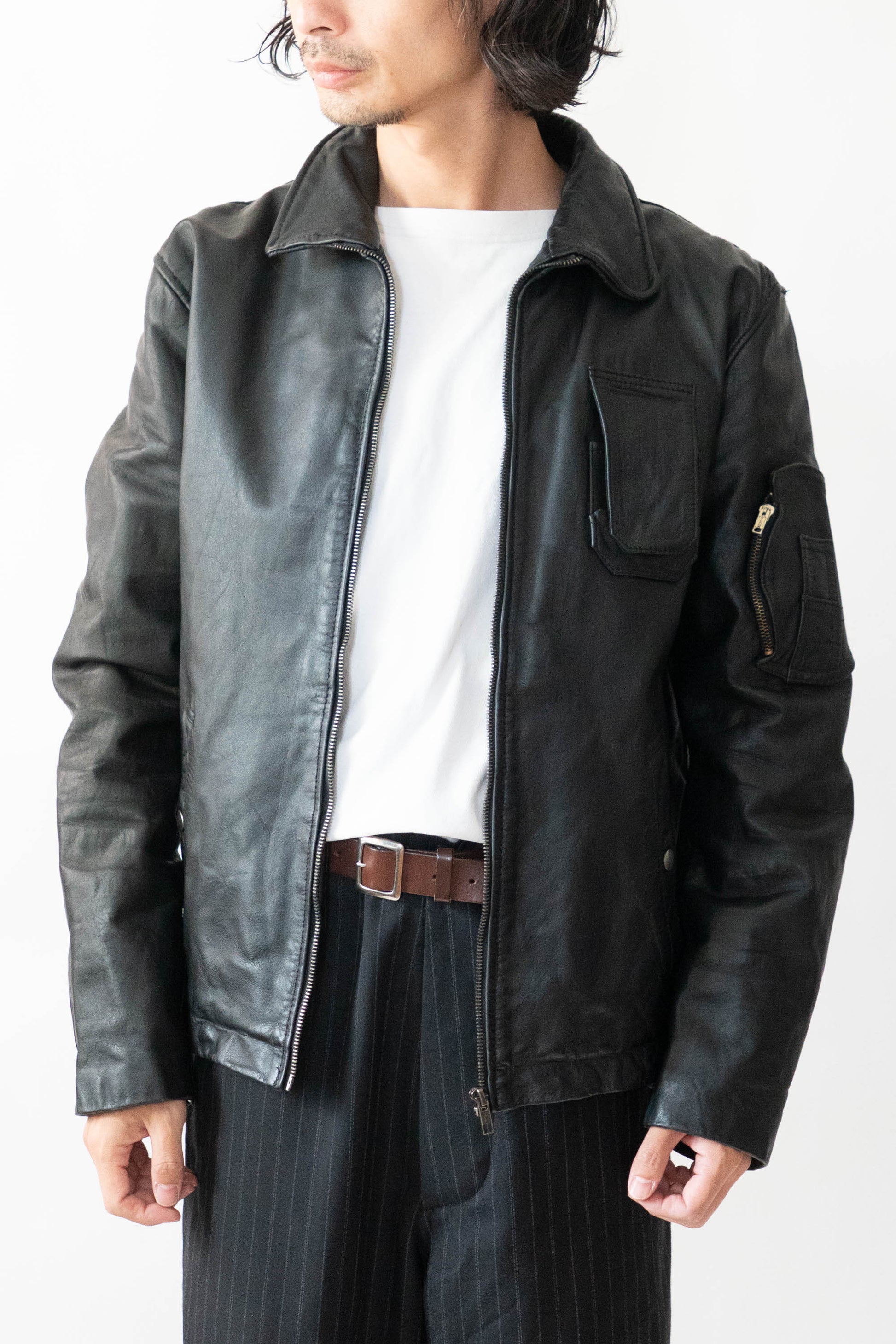 当個体は民間ブランドが製造したモデルです。素材はシープスキンが使用されています。色はブラック。ジップはシングルジップです。ミリタリーウェアとしての実用的な機能美とミニマルに着用できる唯一無二のパイロットレザージャケットです。
