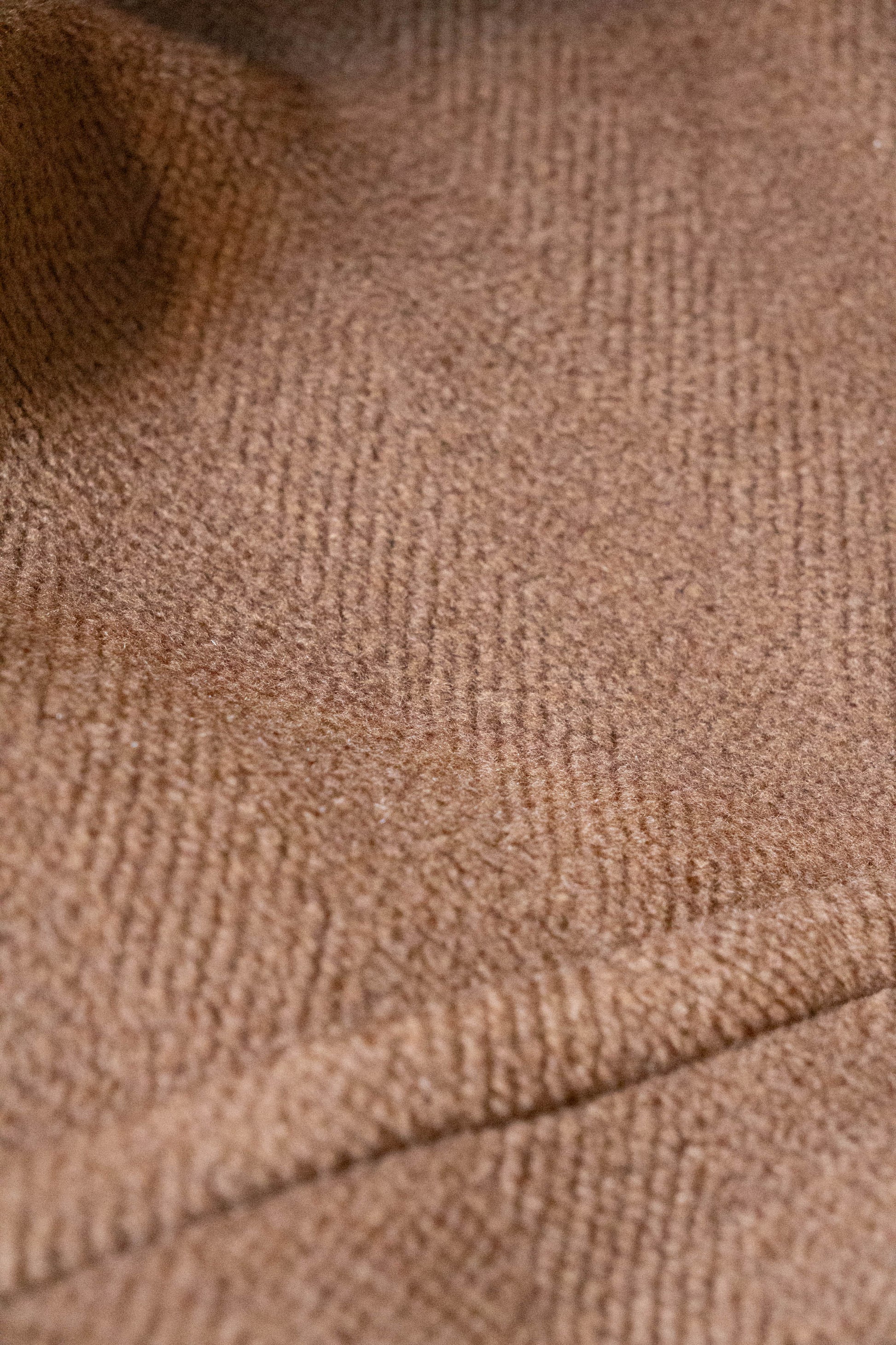 特筆すべきは素材。現在は存在しない<Moorbrook(ムーアブルック)社>が、世界に4台しかなかった旧式織機で織り上げたヘリンボーンウールを使用しています。不況と効率の悪さから同社は廃業しましたが、その希少な織機は現在、英国の名門 Joshua Ellis に引き継がれています。かつてはエルメスがその素材に惚れ込み採用していたという逸話も頷けるほどの極上生地、太畝のヘリンボーンは圧倒的な存在感が魅力です。